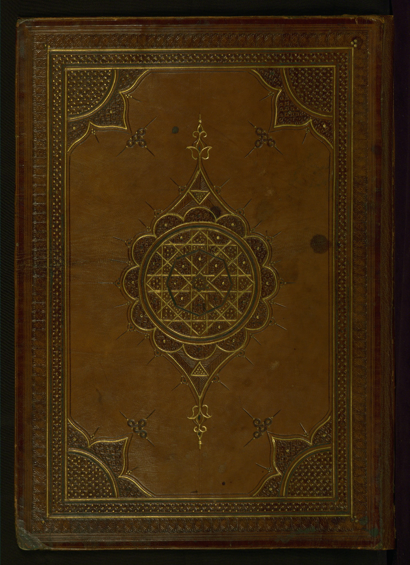 Light brown goatskin (with flap); blind- and gold-tooled geometric designs, including a central lobed oval and cornerpieces; doublures of very thin, light brown leather stamped in relief with large arabesque patterns; traces of blue pigment present