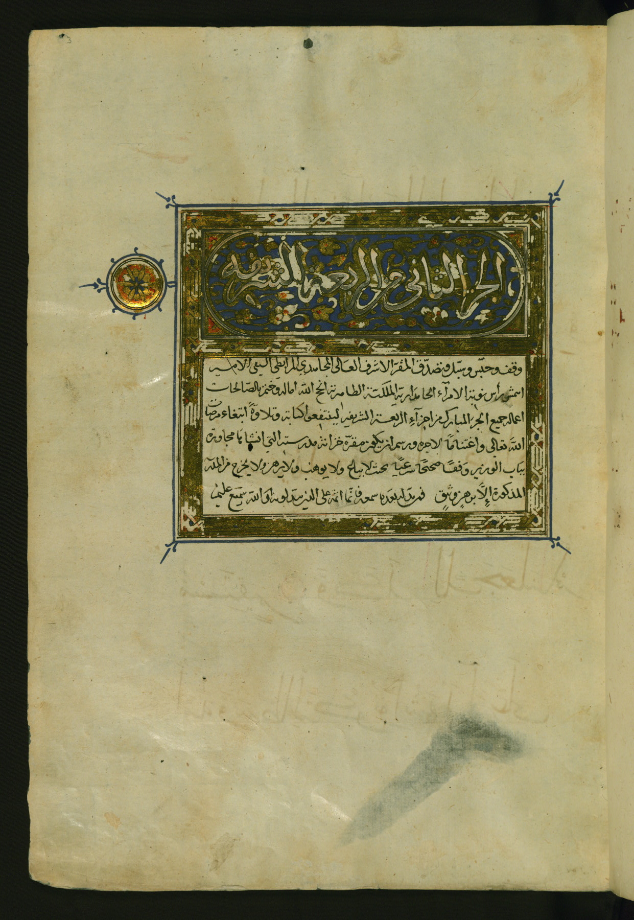 - Label: This illuminated titlepiece in its rectangular panel is inscribed al-juzʾ al-thānī min al-rabʿah al-sharīfah on a blue background with gold arabesques. Below is a bequest (waqf) statement in the name of the Mamluk Amīr Aytimish (also Aytmish) [al-Bajāsī] (d. 802 AH / 1400 CE) for the library of the Madrasah (later known as al-Madrasah al-Aytimishīyah), which he established at Cairo's Bāb al-Wazīr.