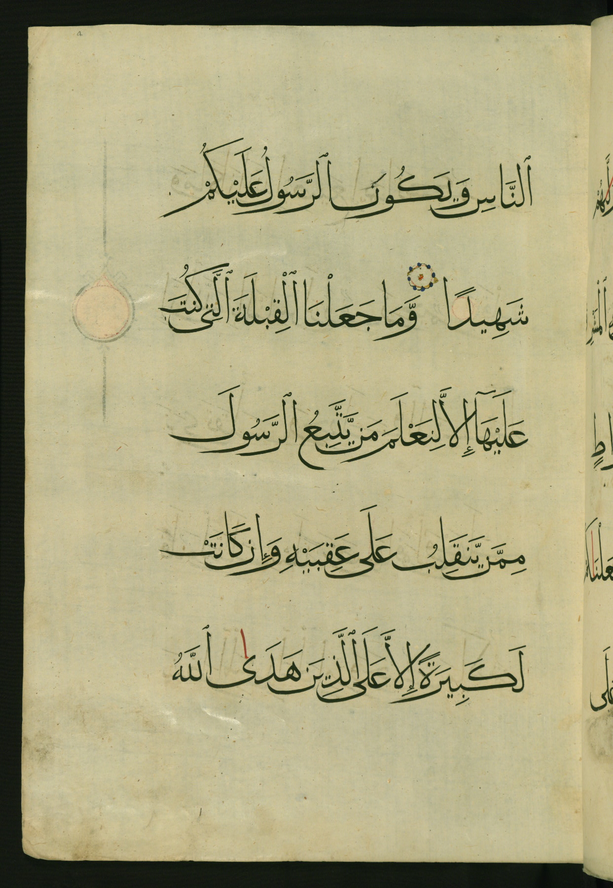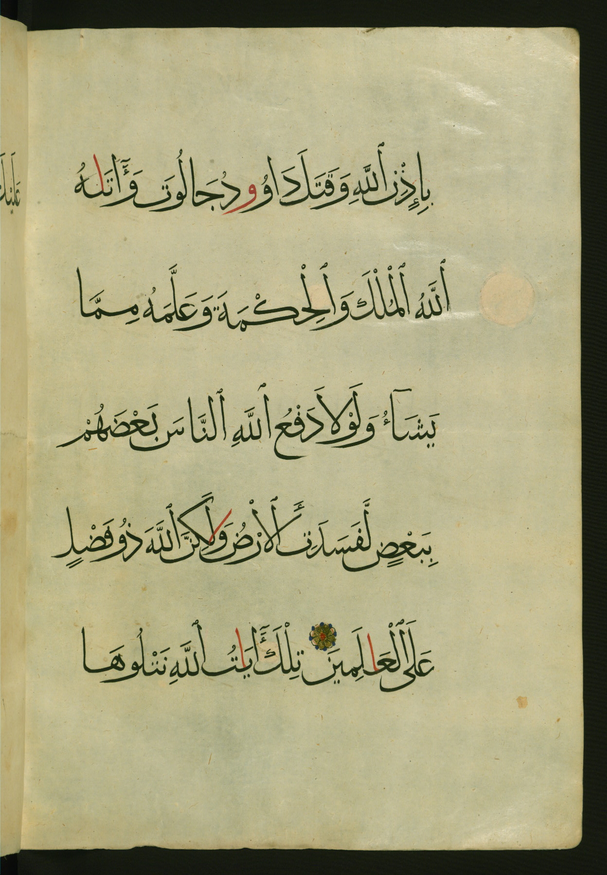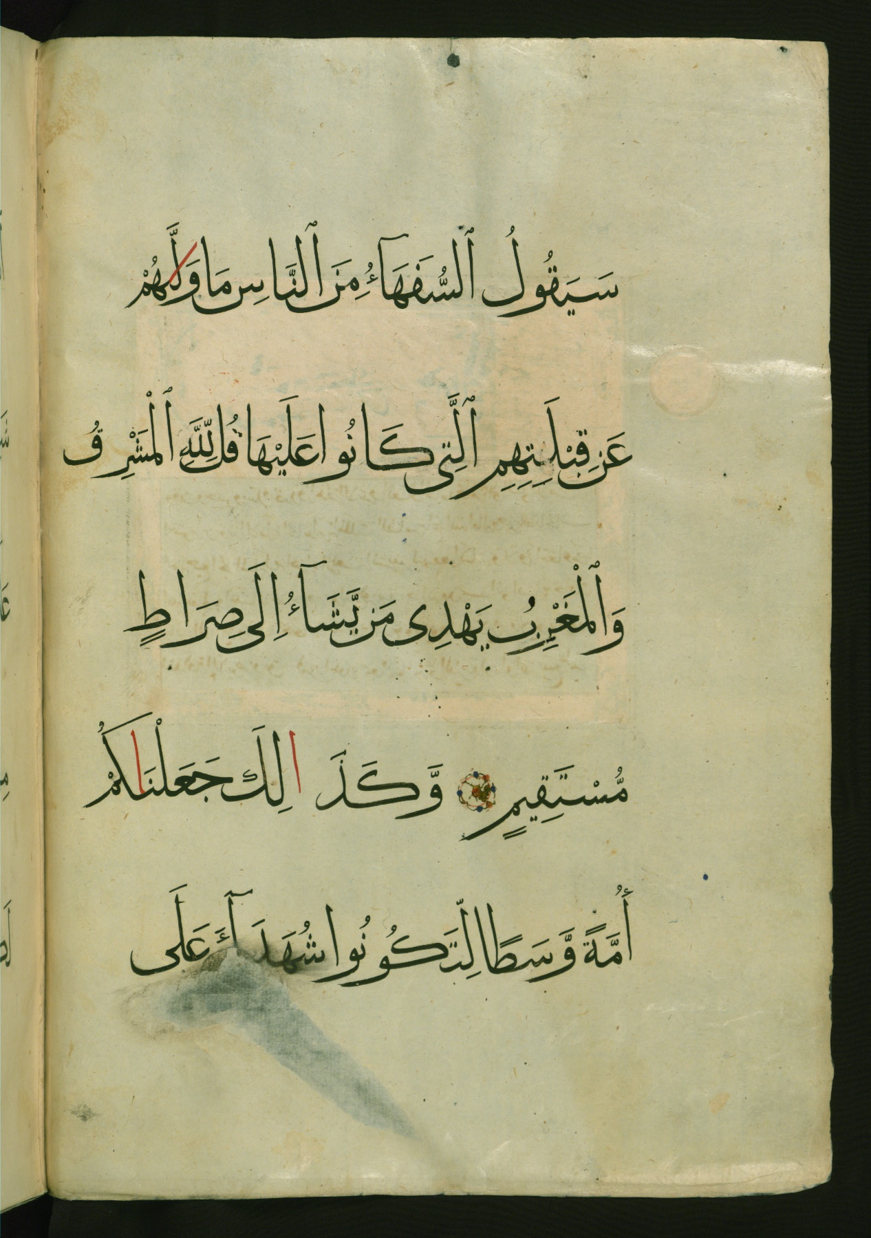 - Label: The text is written in a large, vocalized muḥaqqaq script in black ink with the alifs of prolongation superscripted in red. An illuminated rosette with red and blue dots separates the verses.