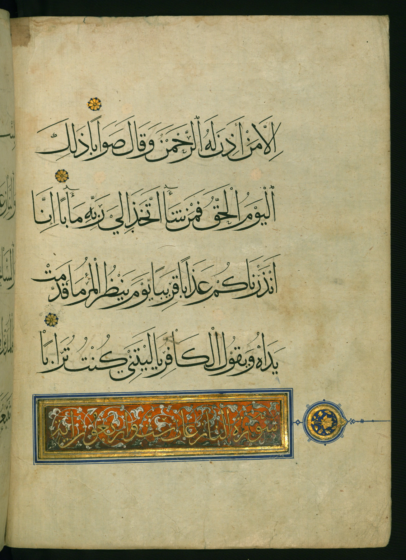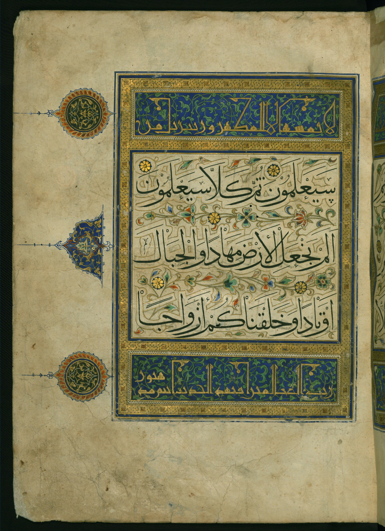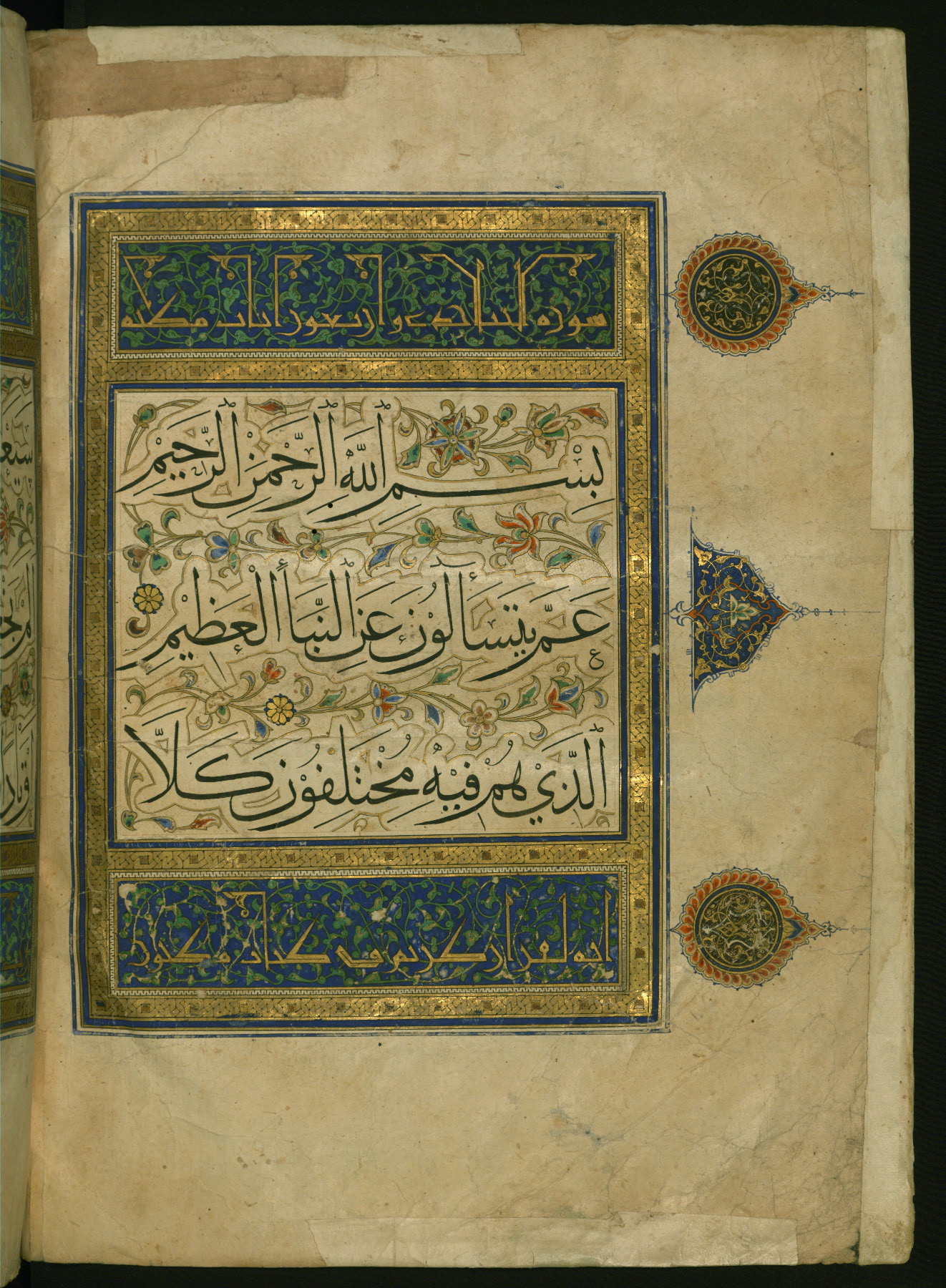 - Label: This is the left side of a double-page illuminated incipit for chapter 78 (Sūrat al-nabāʾ). The inscription in the illuminated panels is verses 79-81 of chapter 56 (Sūrat al-wāqiʿah). The panel inscription is written in the New Abbasid (broken cursive) style in gold on a blue ground with green arabesques.