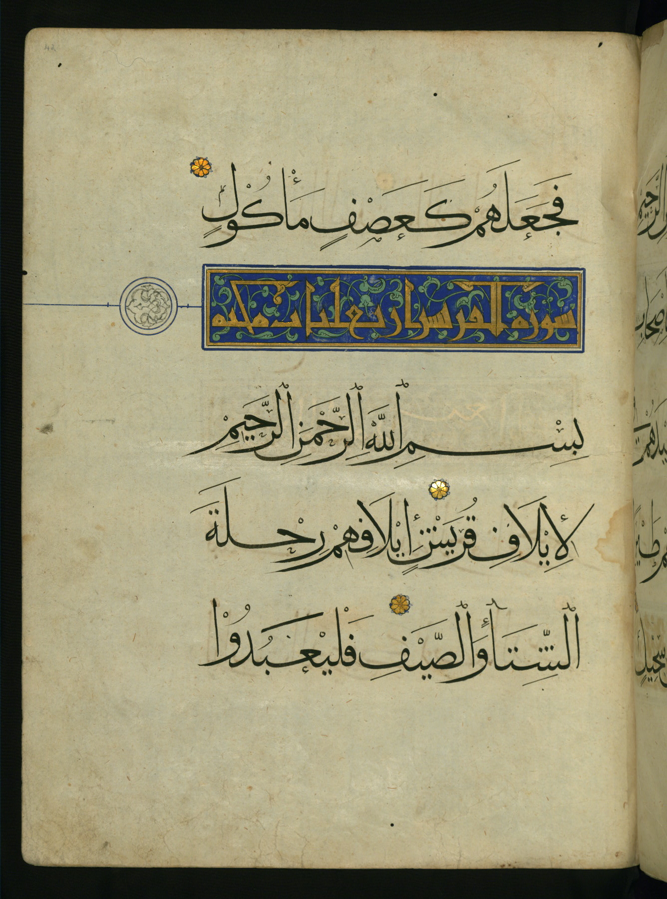 - Label: This is a text page with an illuminated chapter heading for chapter 106 (Sūrat Quraysh). The title is written in the New Abbasid (broken cursive) style in gold ink on a blue ground with green arabesques.
