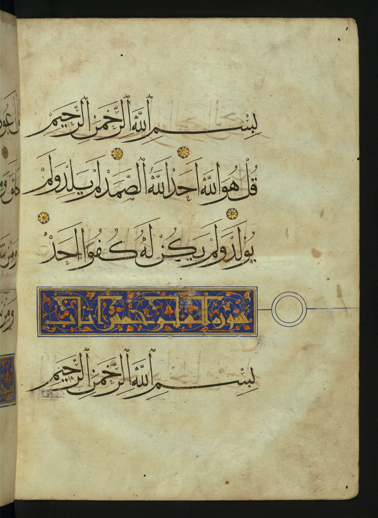 - Label: This text page has lines of vocalized muḥaqqaq script with an illuminated chapter heading for chapter 113 (Sūrat al-falaq). The chapter heading is written in New Abbasid (broken cursive) style in gold ink on a blue ground with red arabesques.