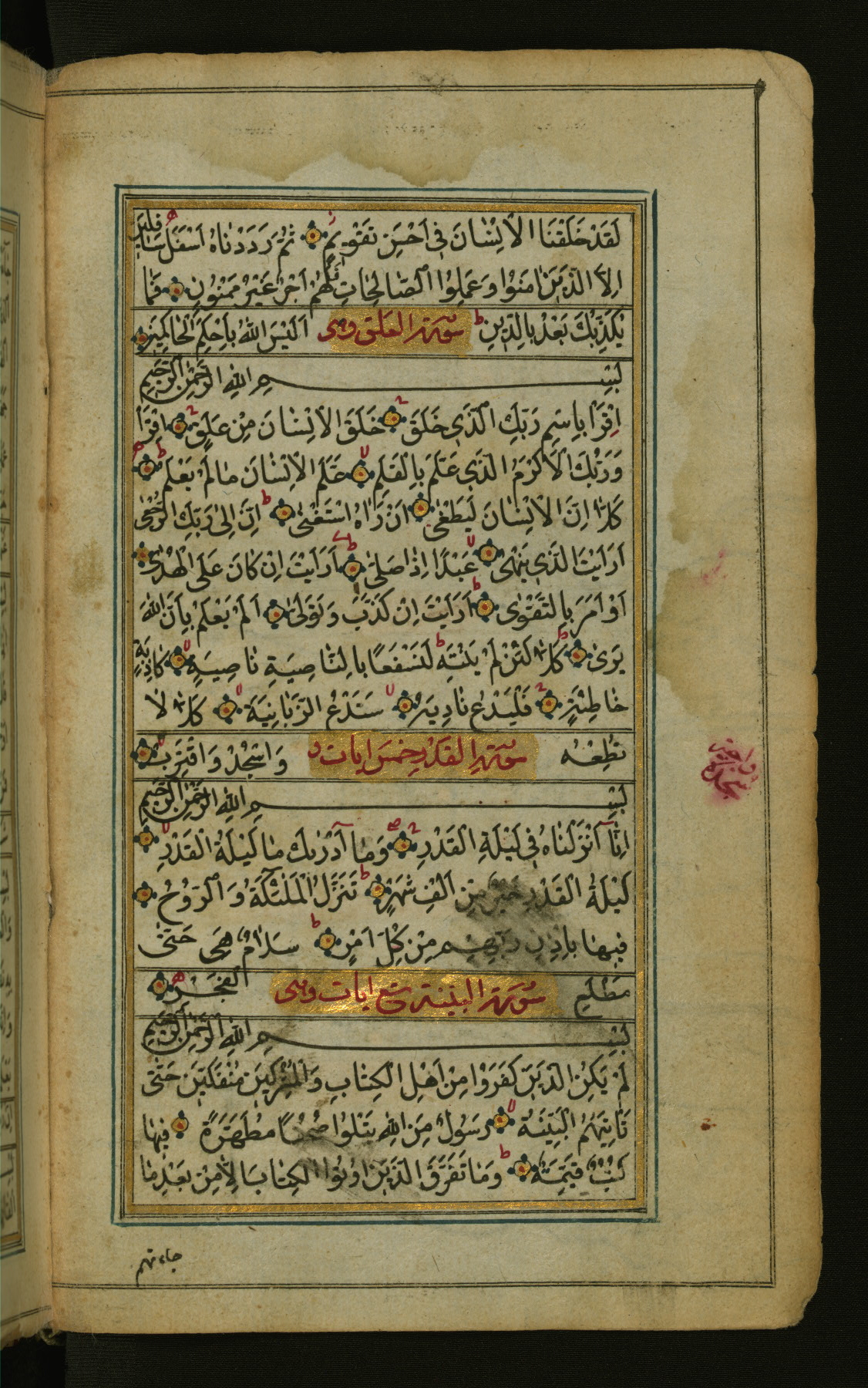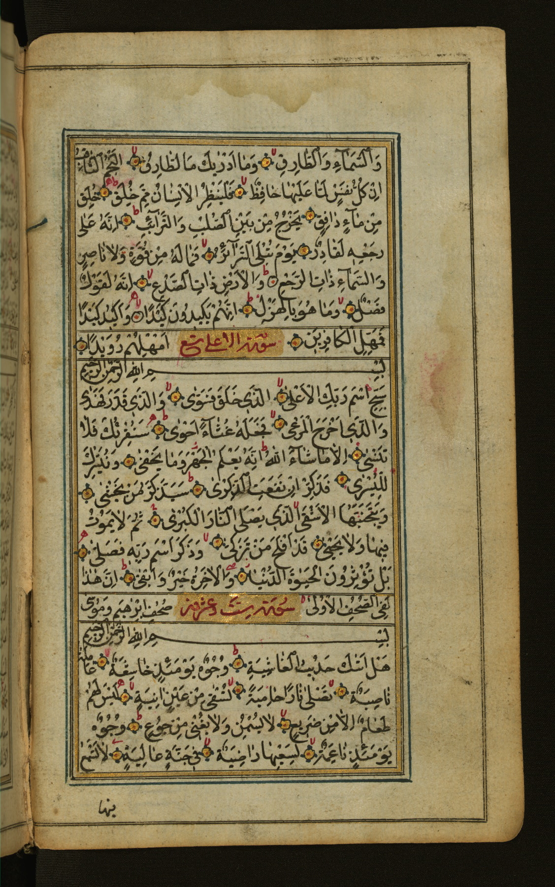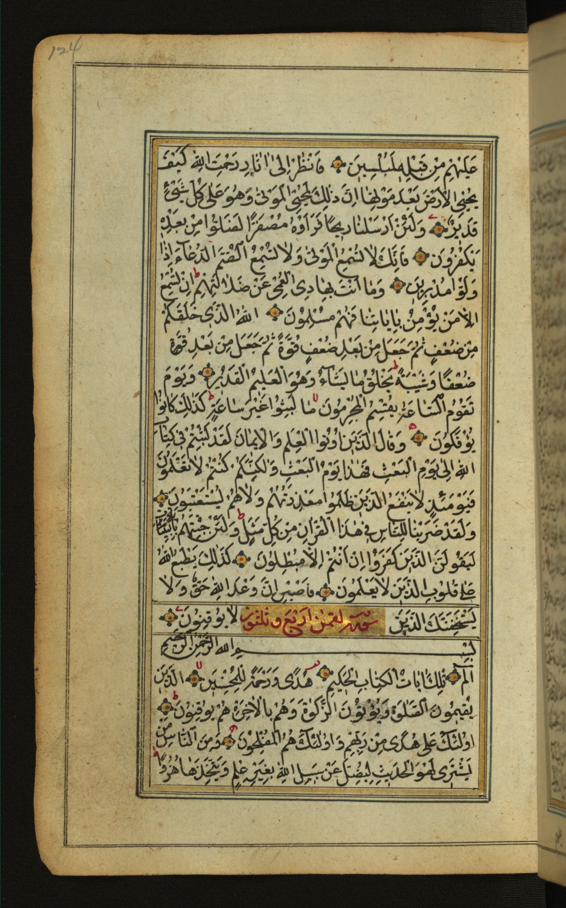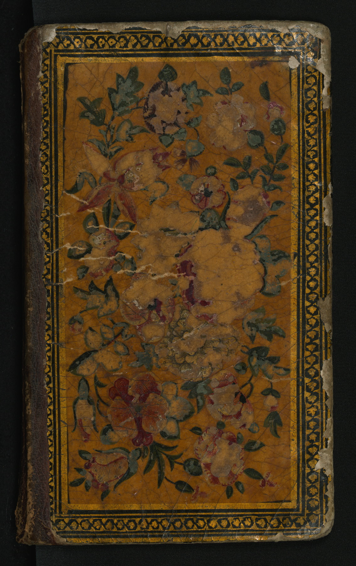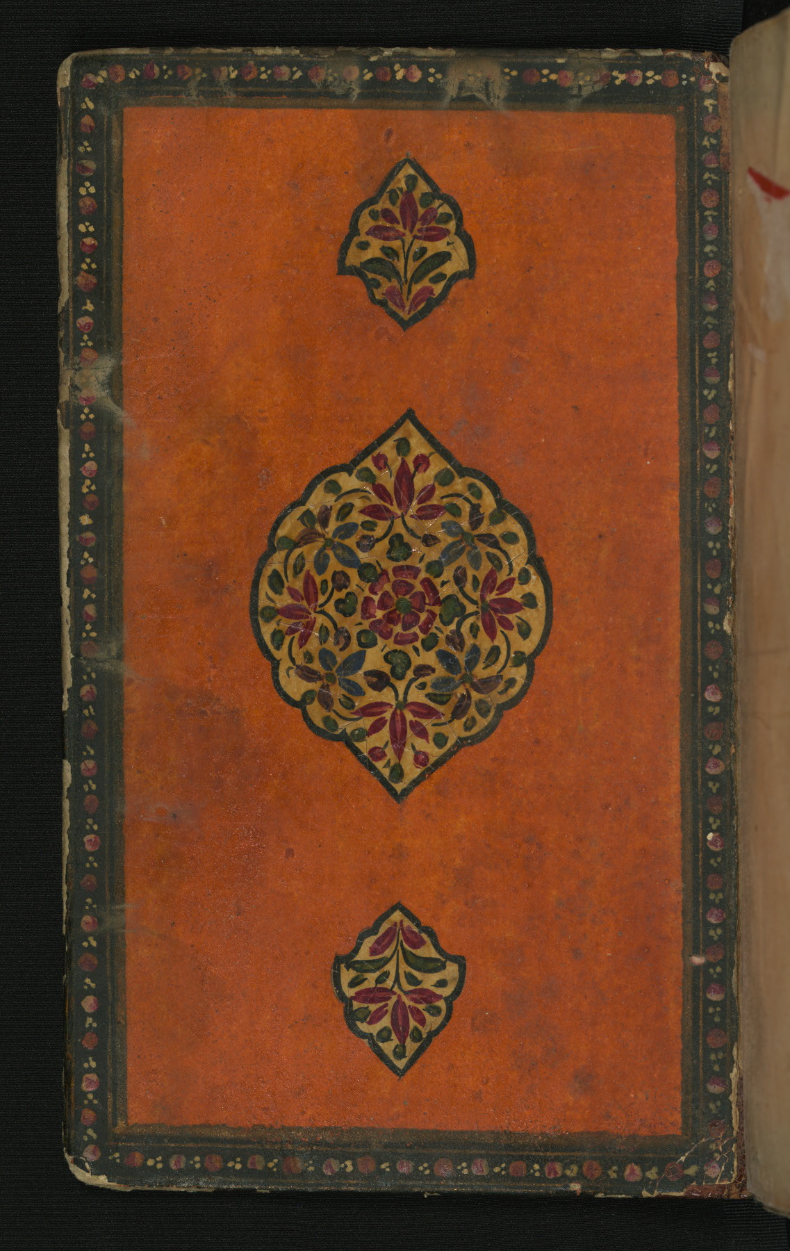 This manuscript is a small illuminated single-volume copy of the Qurʾan, likely produced in Iran. A date is inscribed on the final page, which is interpreted as 1230 AH / 1814-5 CE (fol. 186b). The manuscript opens with an illuminated double-page incipit with the verses of chapter 1 (Sūrat al-fātiḥah) and the initial verses of chapter 2 (Sūrat al-baqarah), decorated with interlinear illumination (fols. 1b-2a). The text is in vocalized naskh script in black ink with reading marks in red and text divisions, such as thirty verses (juzʾ) or sixty verses (ḥizb), in the margins. Illuminated discs with colored dots separate the verses. Chapter headings are in riqāʿ script in red ink on a gold ground. The nineteenth-century lacquer binding with a floral composition on a gold field on the upper and lower boards seems to be contemporary with the manuscript. The insides of both boards are painted with a lobed yellow central medallion and pendants on an orange field.