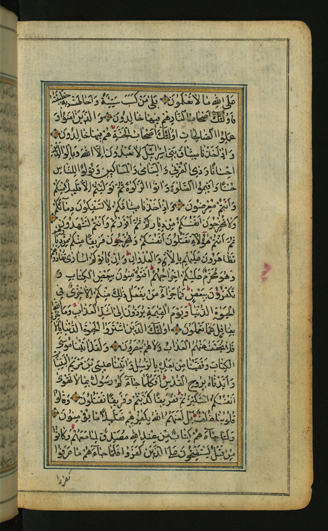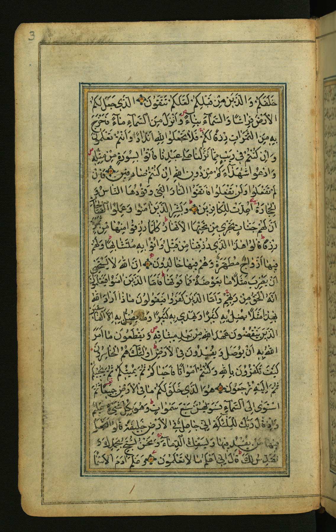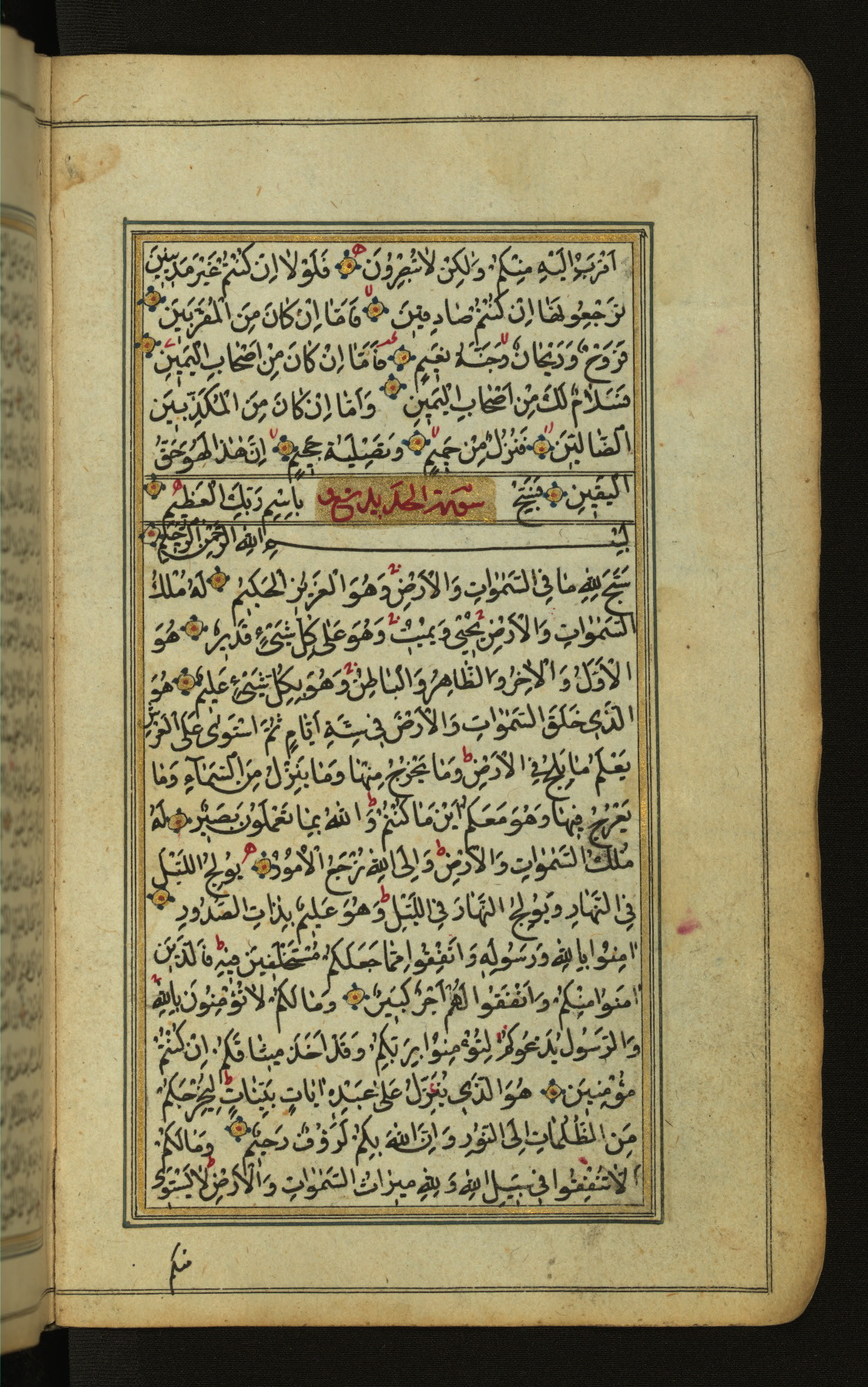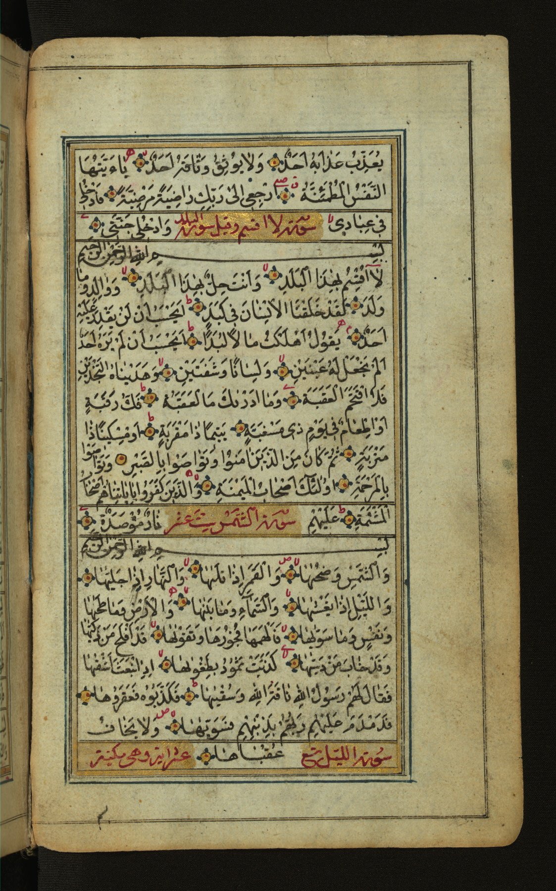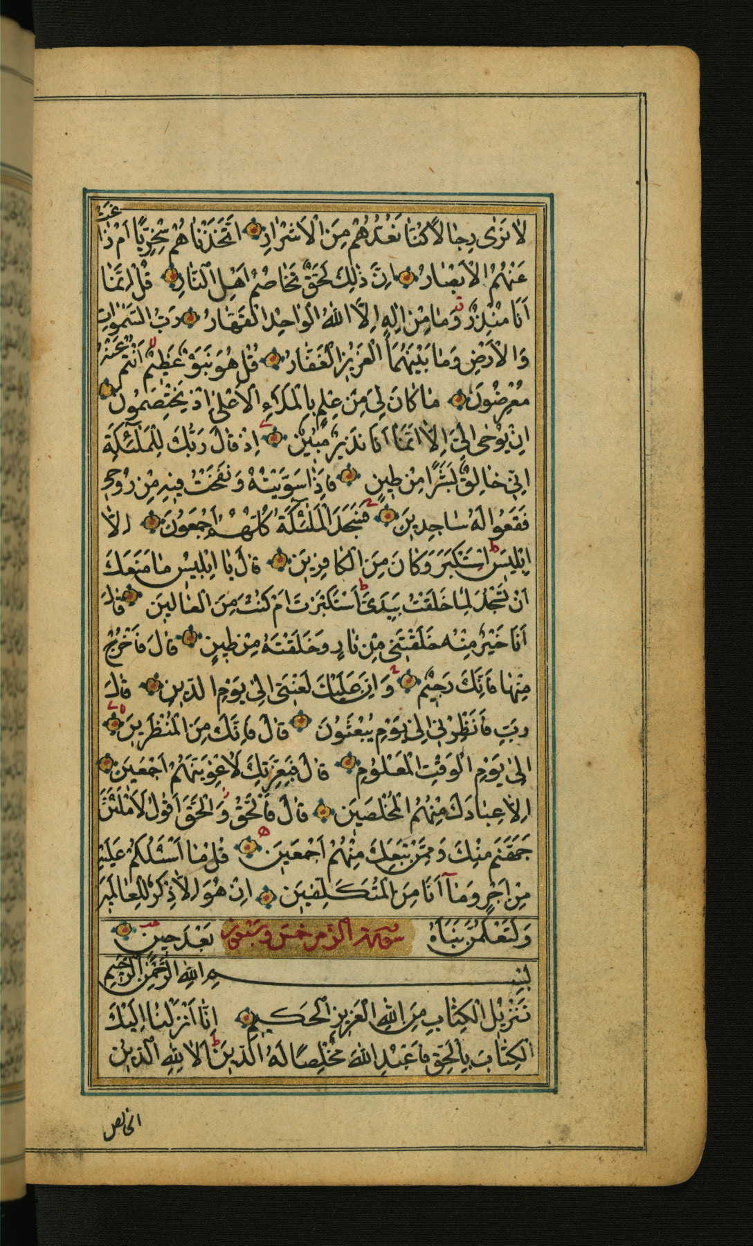 This manuscript is a small illuminated single-volume copy of the Qurʾan, likely produced in Iran. A date is inscribed on the final page, which is interpreted as 1230 AH / 1814-5 CE (fol. 186b). The manuscript opens with an illuminated double-page incipit with the verses of chapter 1 (Sūrat al-fātiḥah) and the initial verses of chapter 2 (Sūrat al-baqarah), decorated with interlinear illumination (fols. 1b-2a). The text is in vocalized naskh script in black ink with reading marks in red and text divisions, such as thirty verses (juzʾ) or sixty verses (ḥizb), in the margins. Illuminated discs with colored dots separate the verses. Chapter headings are in riqāʿ script in red ink on a gold ground. The nineteenth-century lacquer binding with a floral composition on a gold field on the upper and lower boards seems to be contemporary with the manuscript. The insides of both boards are painted with a lobed yellow central medallion and pendants on an orange field.