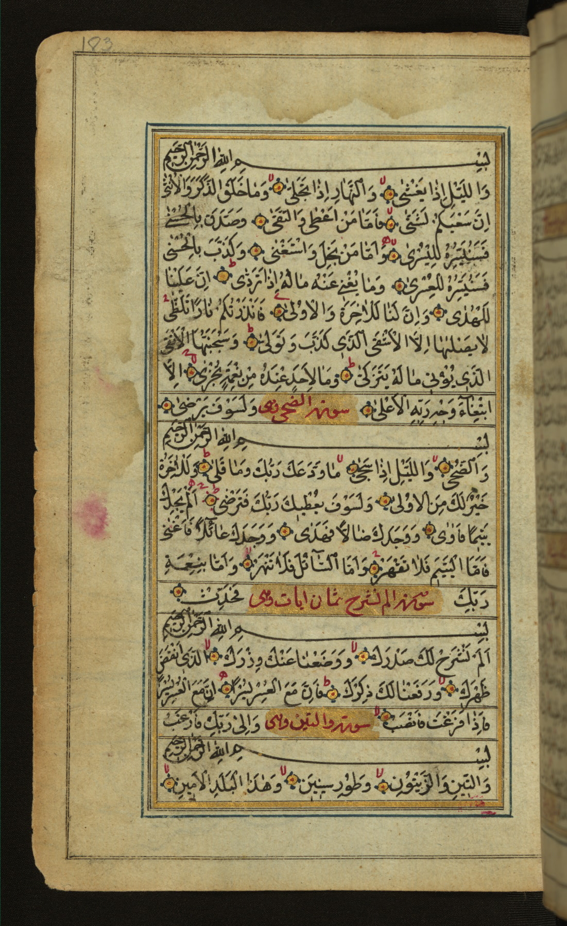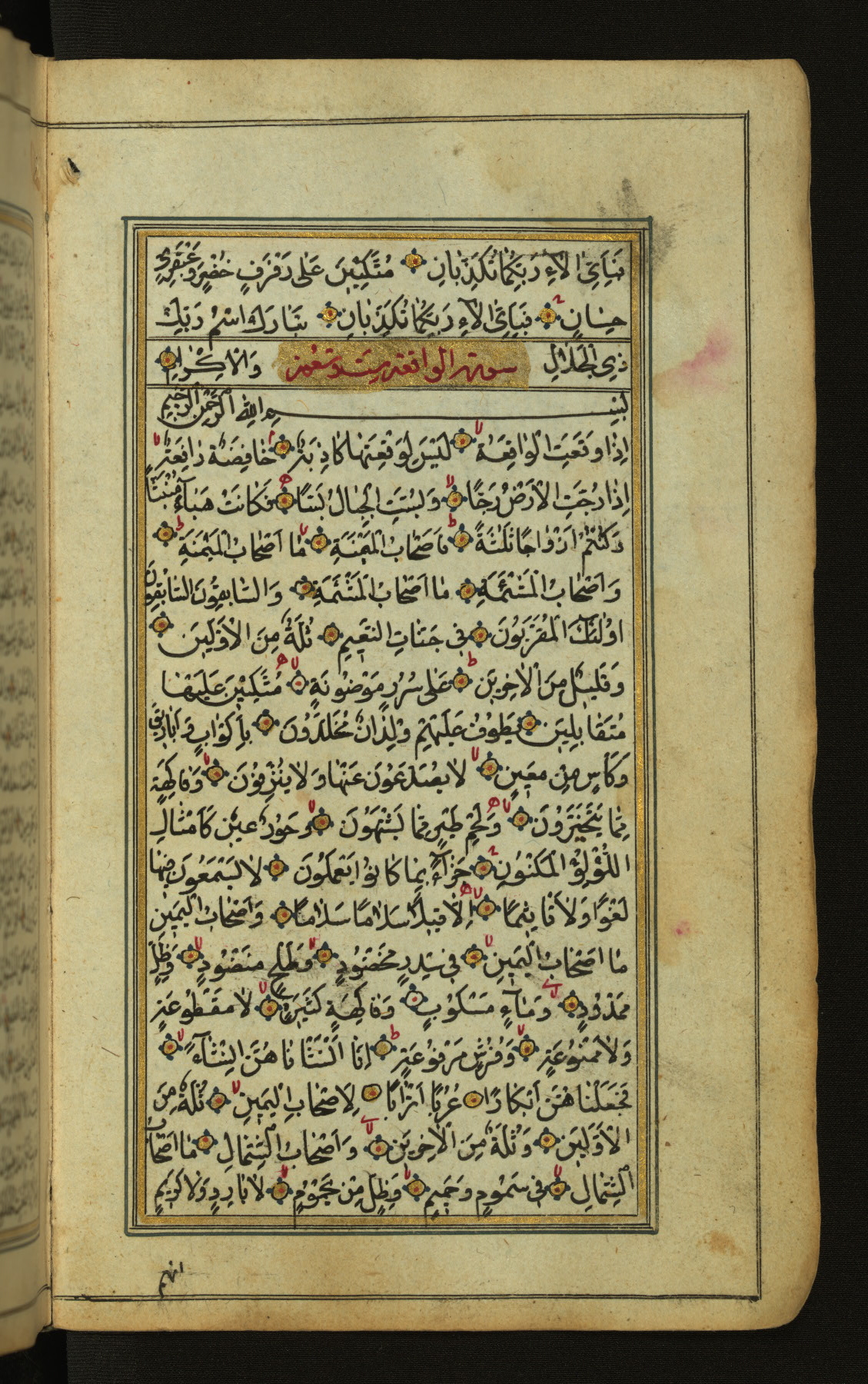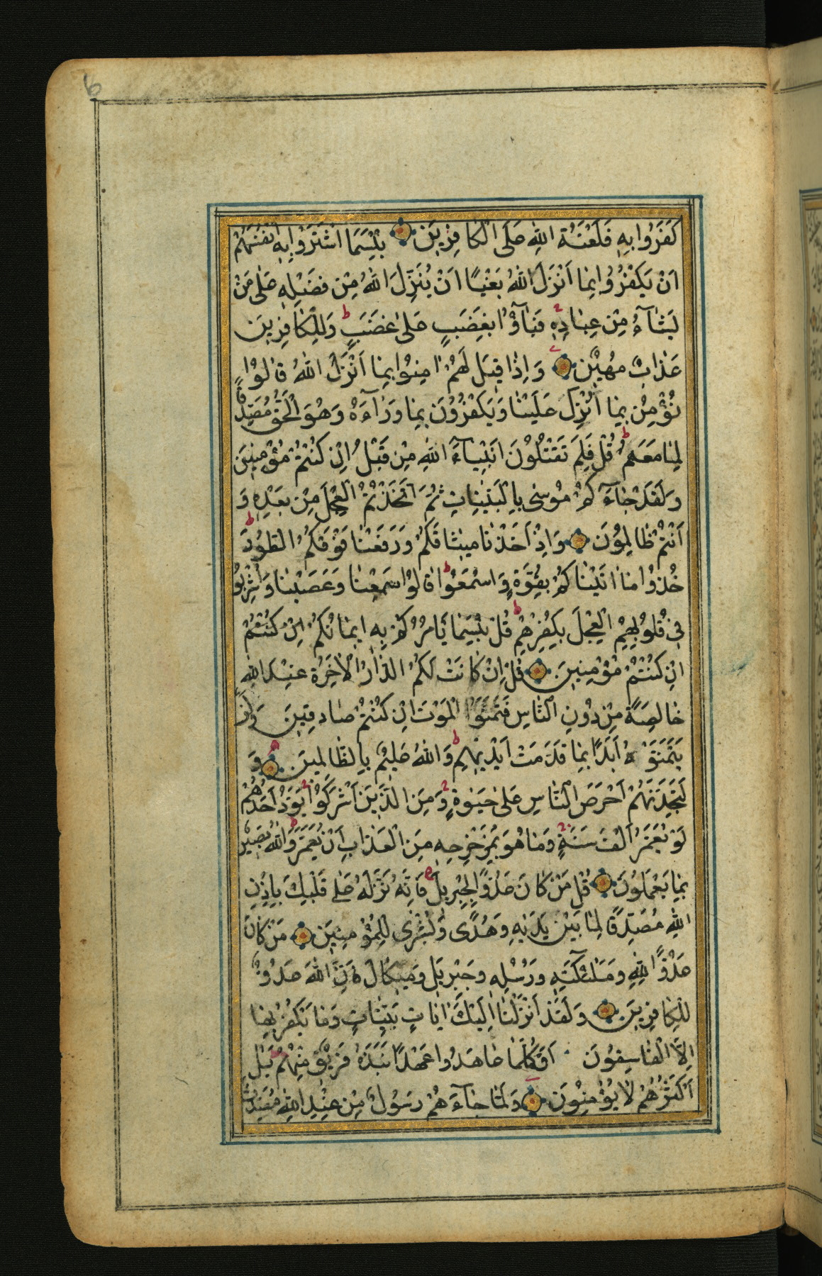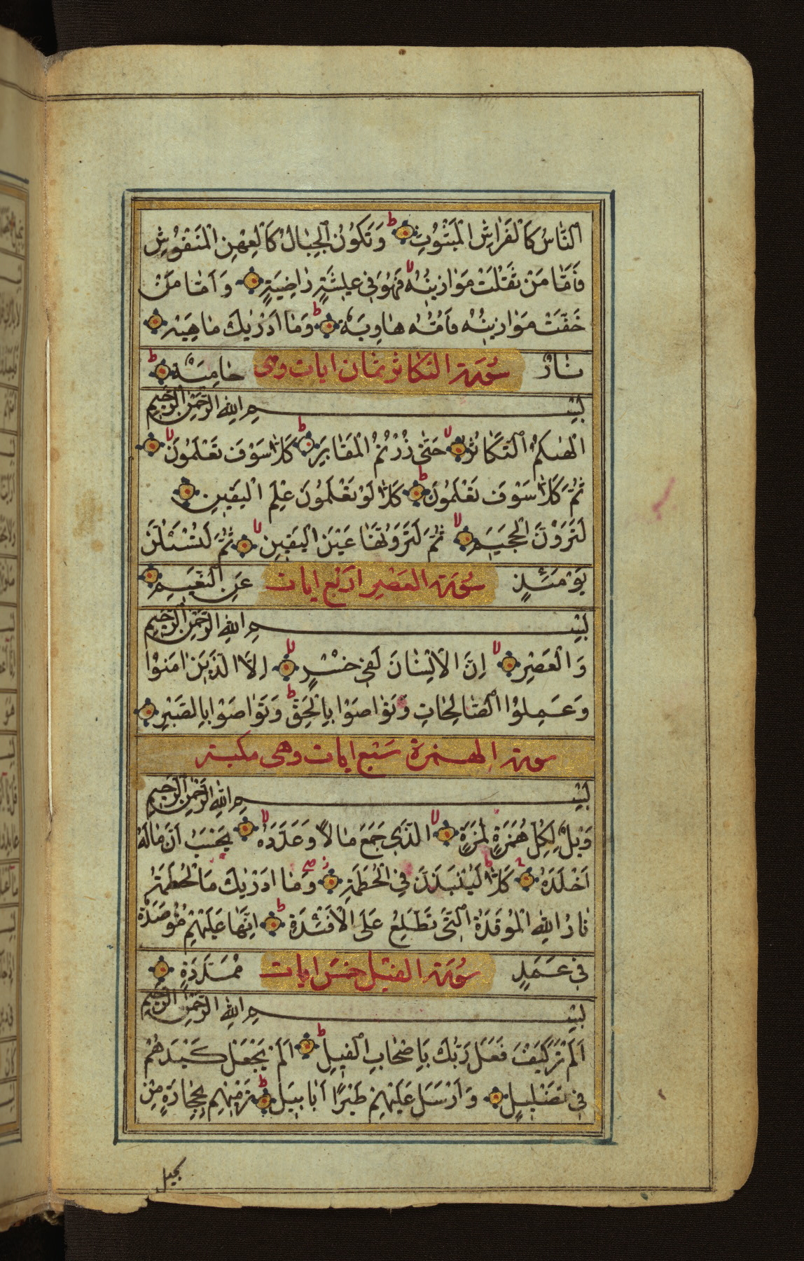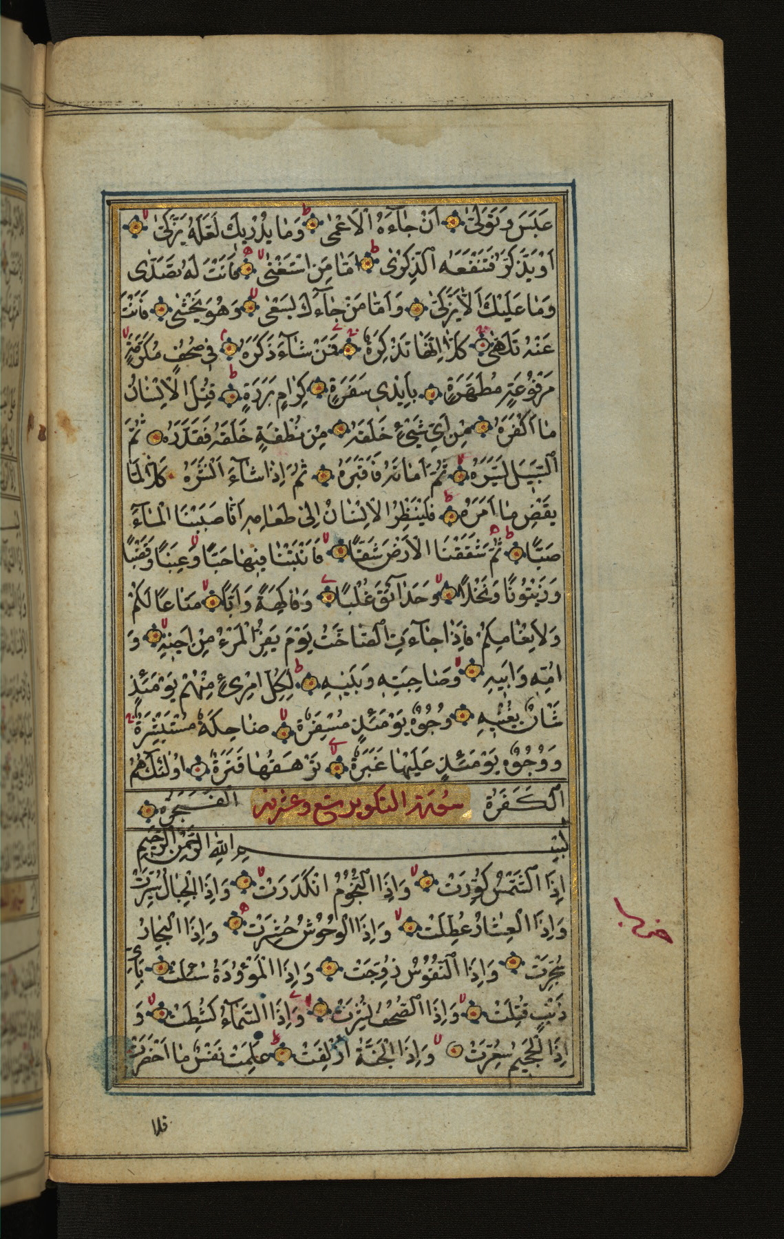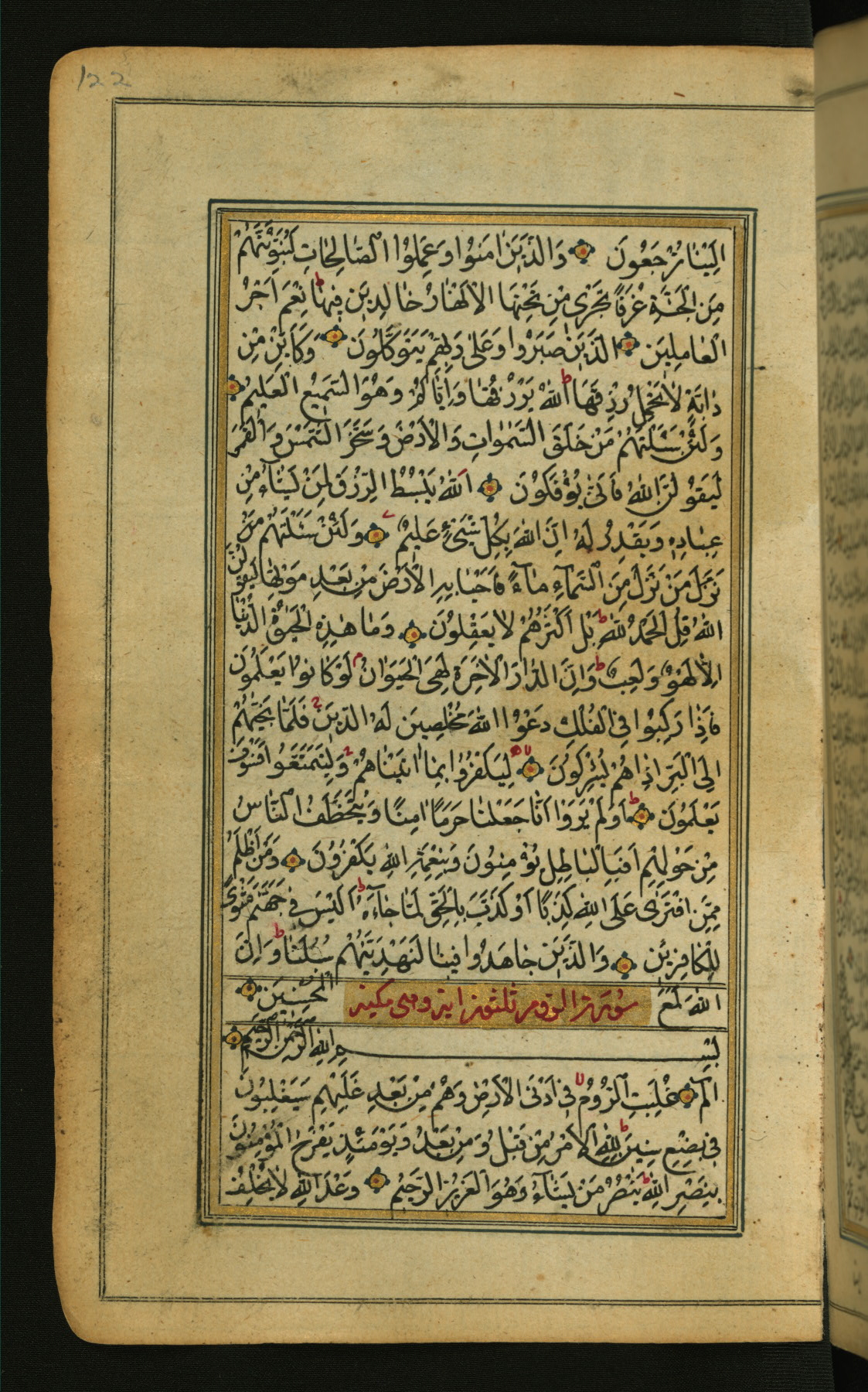 This manuscript is a small illuminated single-volume copy of the Qurʾan, likely produced in Iran. A date is inscribed on the final page, which is interpreted as 1230 AH / 1814-5 CE (fol. 186b). The manuscript opens with an illuminated double-page incipit with the verses of chapter 1 (Sūrat al-fātiḥah) and the initial verses of chapter 2 (Sūrat al-baqarah), decorated with interlinear illumination (fols. 1b-2a). The text is in vocalized naskh script in black ink with reading marks in red and text divisions, such as thirty verses (juzʾ) or sixty verses (ḥizb), in the margins. Illuminated discs with colored dots separate the verses. Chapter headings are in riqāʿ script in red ink on a gold ground. The nineteenth-century lacquer binding with a floral composition on a gold field on the upper and lower boards seems to be contemporary with the manuscript. The insides of both boards are painted with a lobed yellow central medallion and pendants on an orange field.