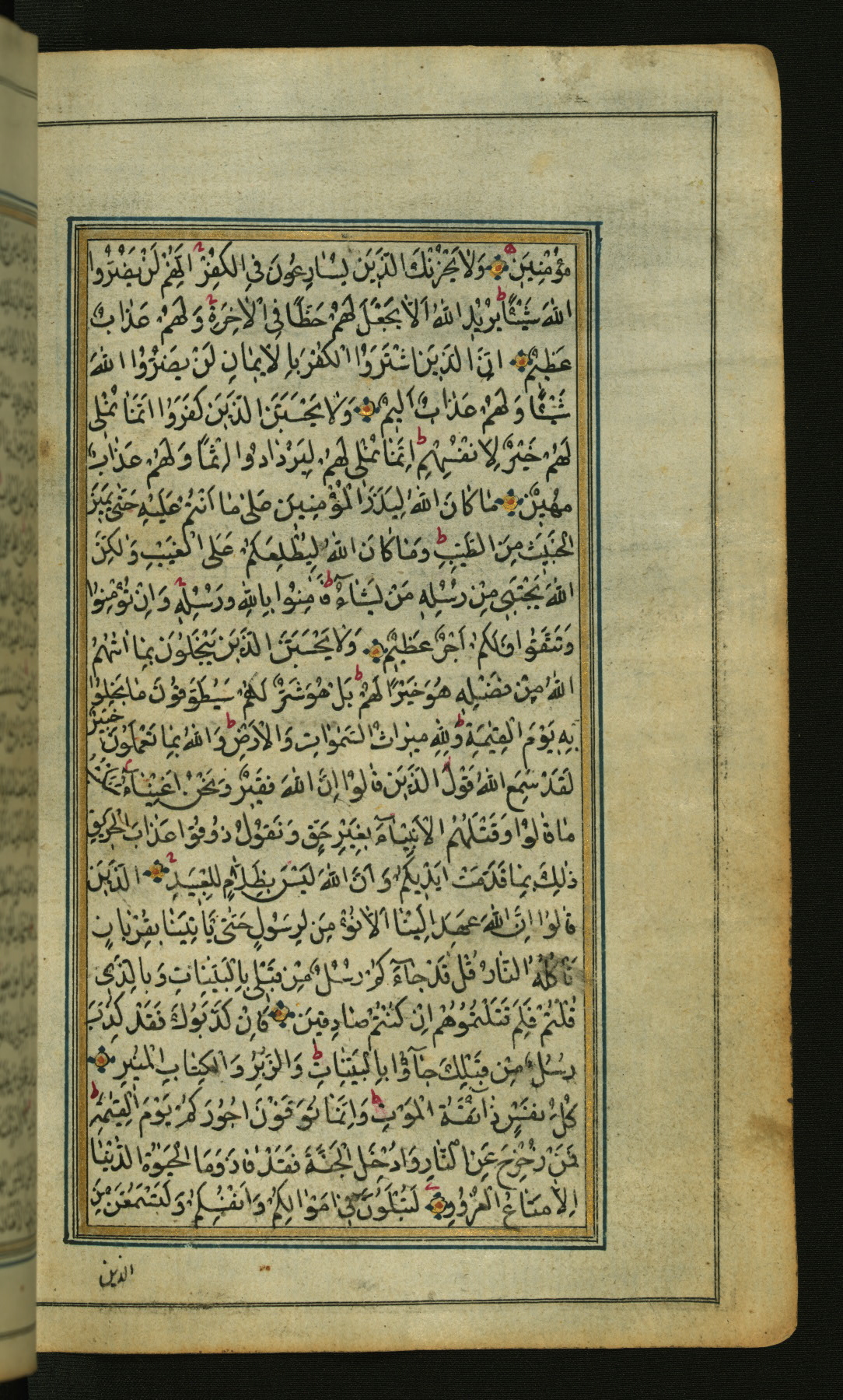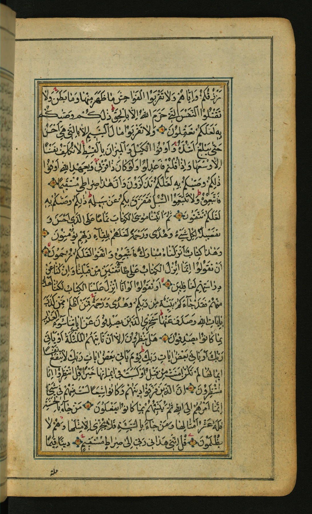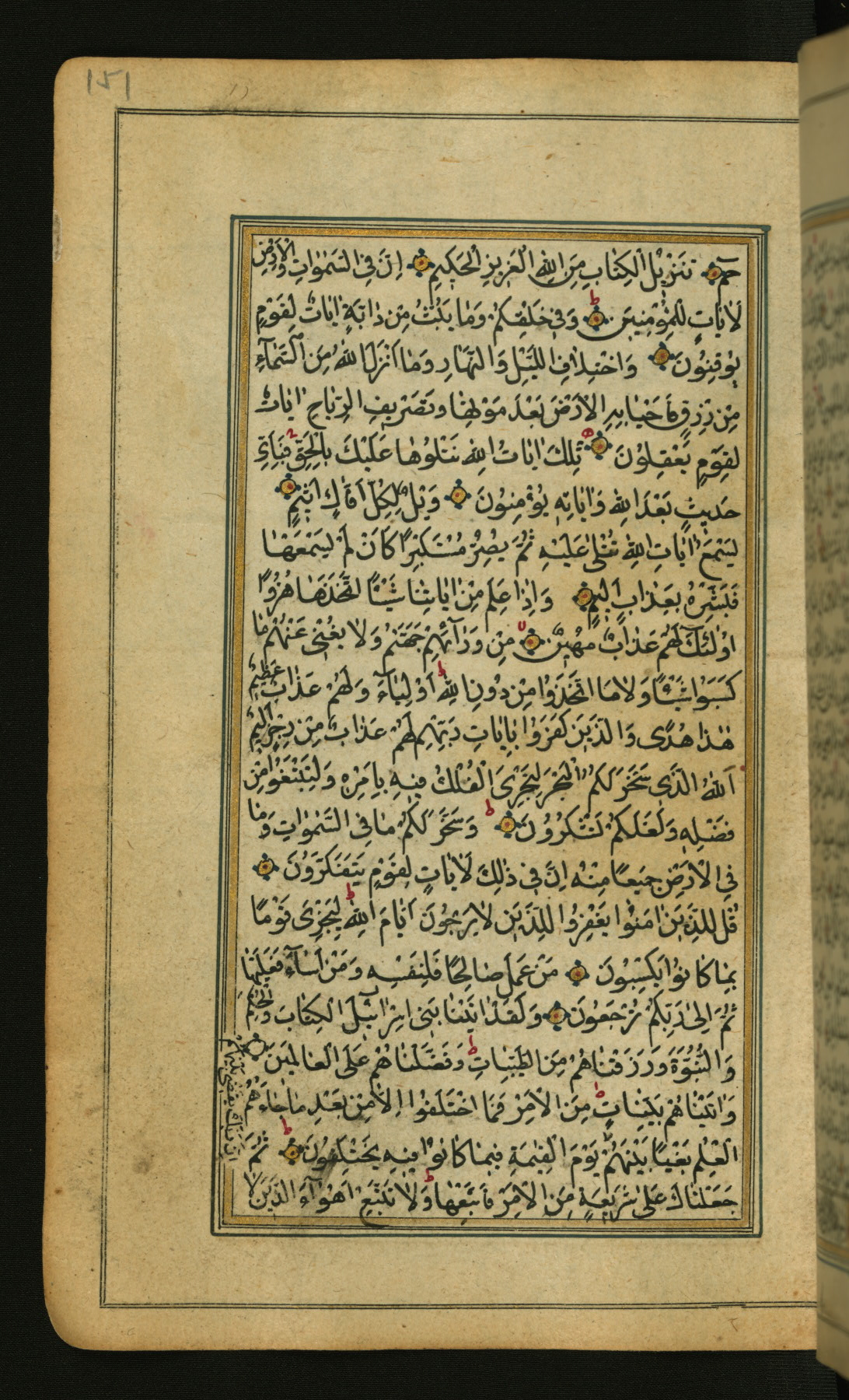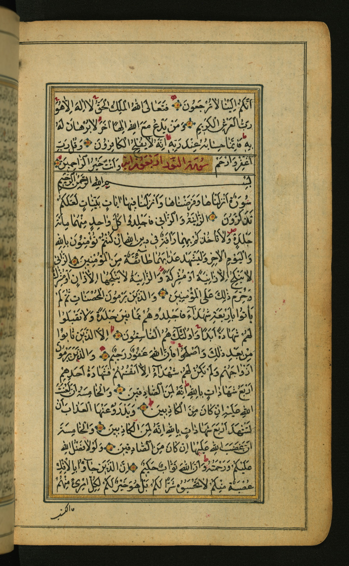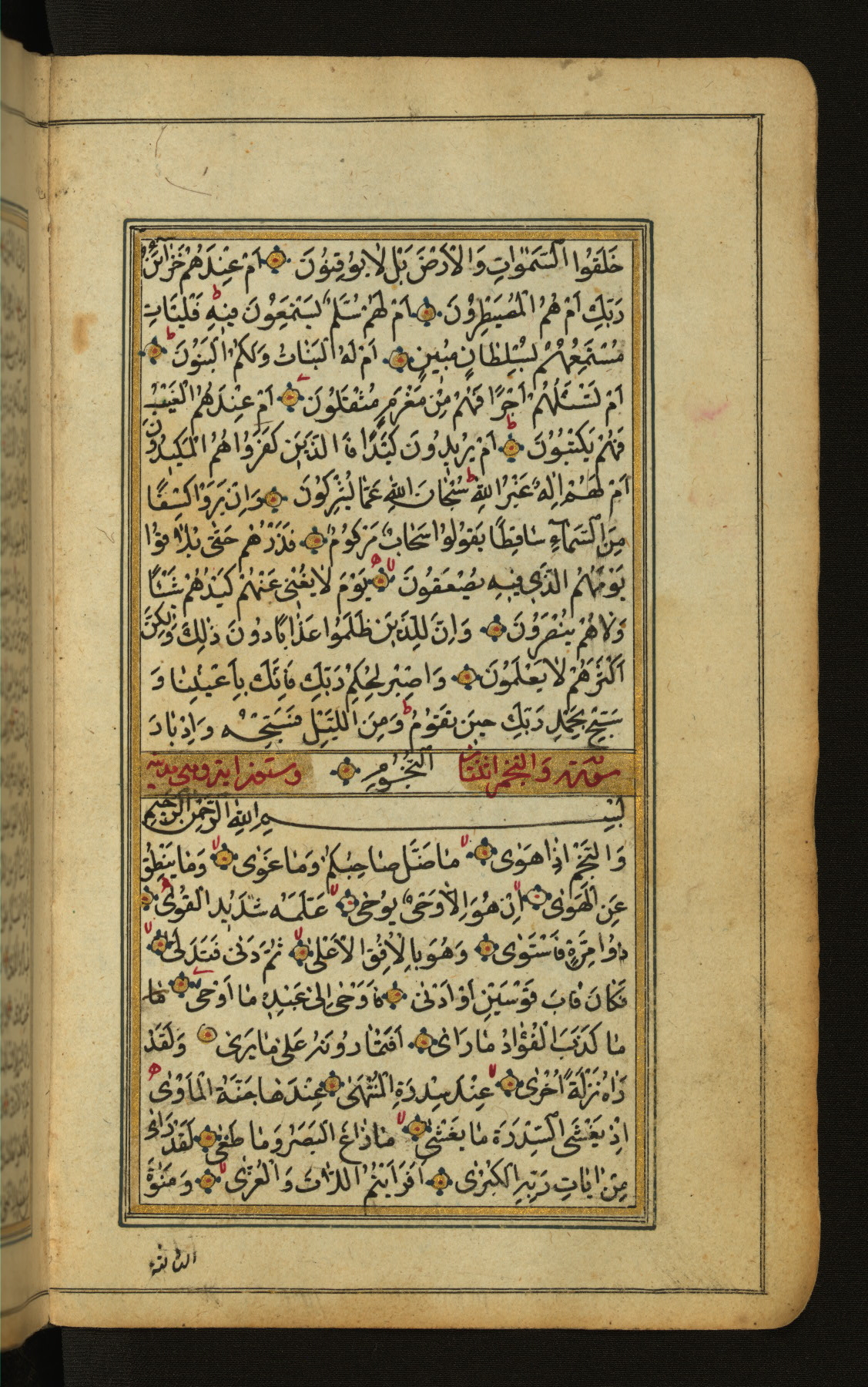 This manuscript is a small illuminated single-volume copy of the Qurʾan, likely produced in Iran. A date is inscribed on the final page, which is interpreted as 1230 AH / 1814-5 CE (fol. 186b). The manuscript opens with an illuminated double-page incipit with the verses of chapter 1 (Sūrat al-fātiḥah) and the initial verses of chapter 2 (Sūrat al-baqarah), decorated with interlinear illumination (fols. 1b-2a). The text is in vocalized naskh script in black ink with reading marks in red and text divisions, such as thirty verses (juzʾ) or sixty verses (ḥizb), in the margins. Illuminated discs with colored dots separate the verses. Chapter headings are in riqāʿ script in red ink on a gold ground. The nineteenth-century lacquer binding with a floral composition on a gold field on the upper and lower boards seems to be contemporary with the manuscript. The insides of both boards are painted with a lobed yellow central medallion and pendants on an orange field.