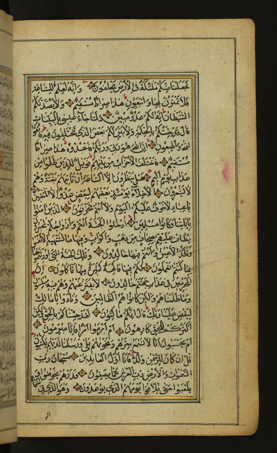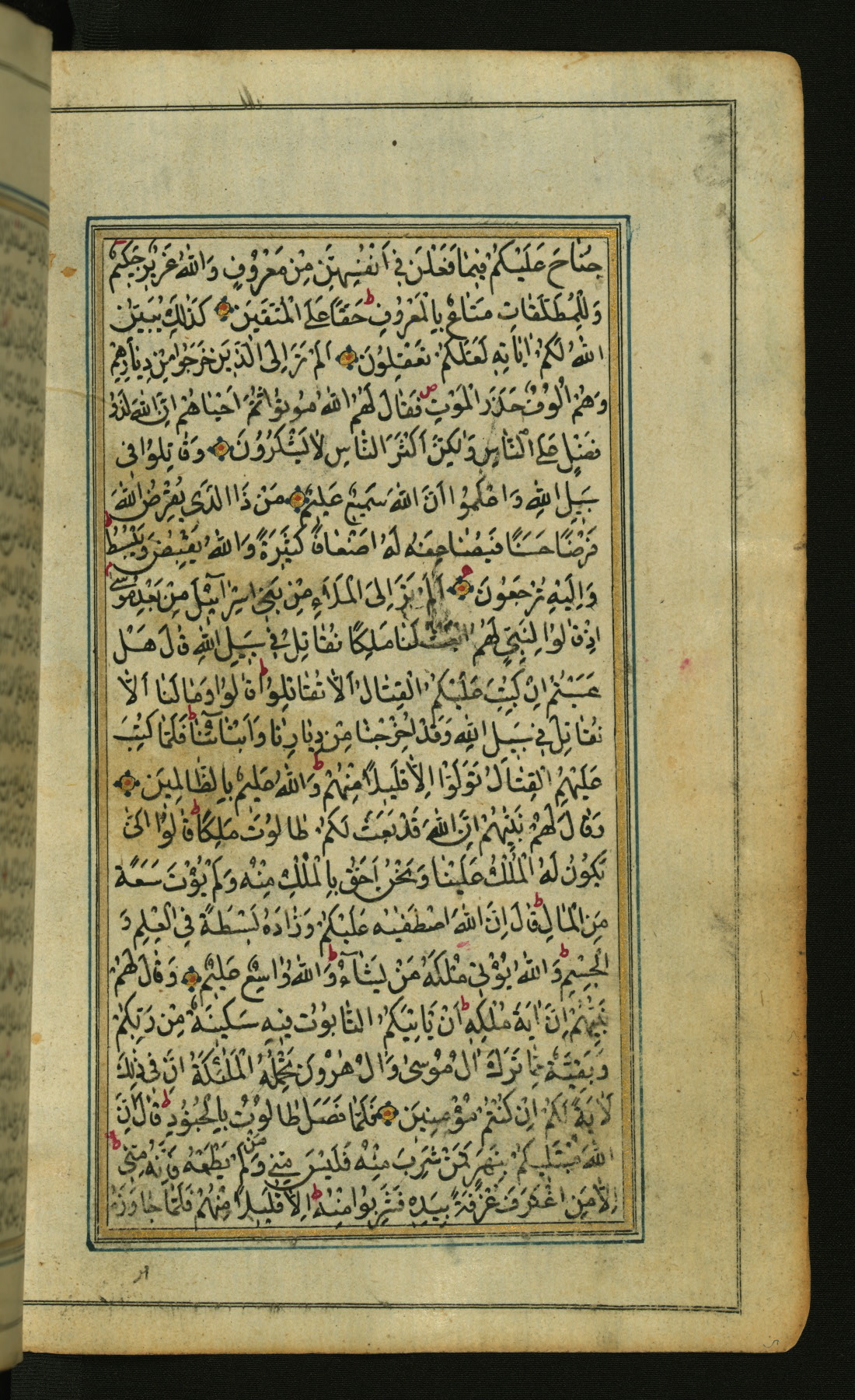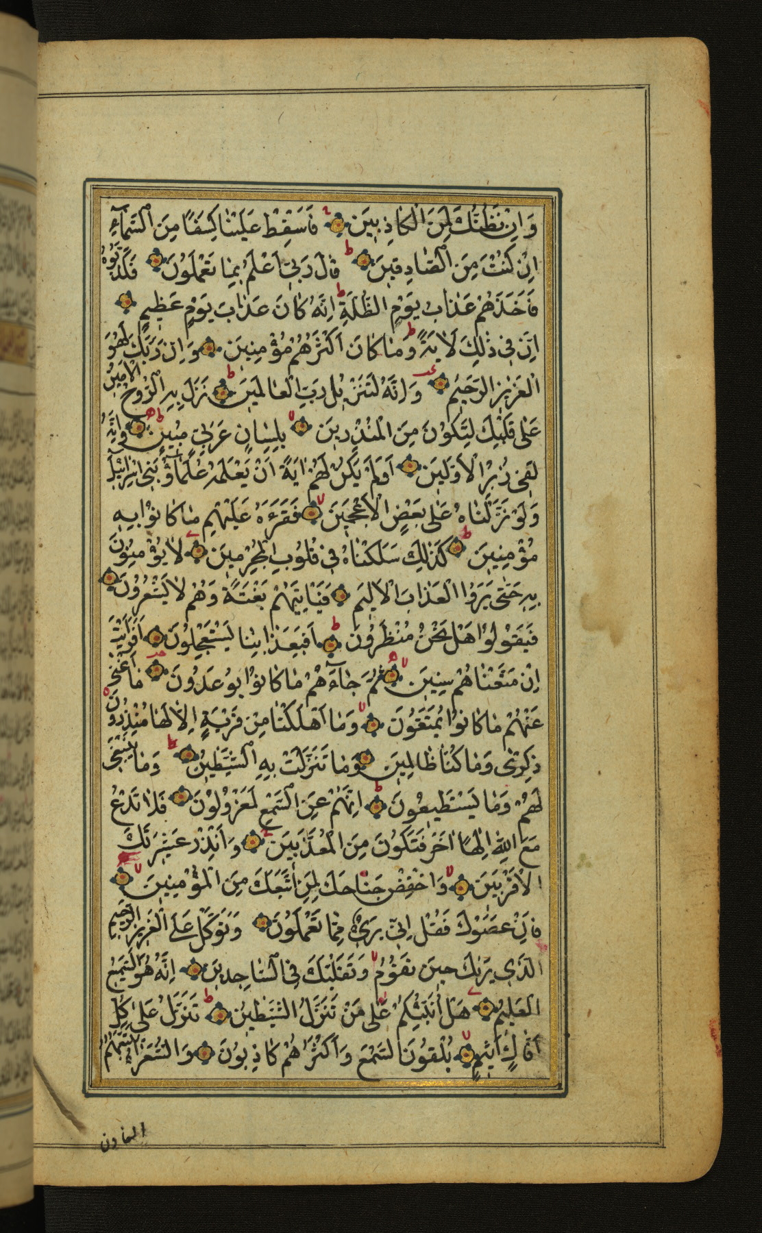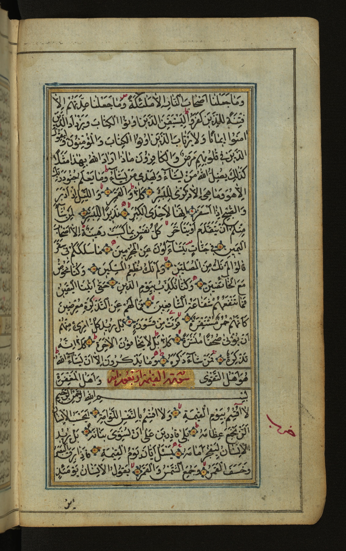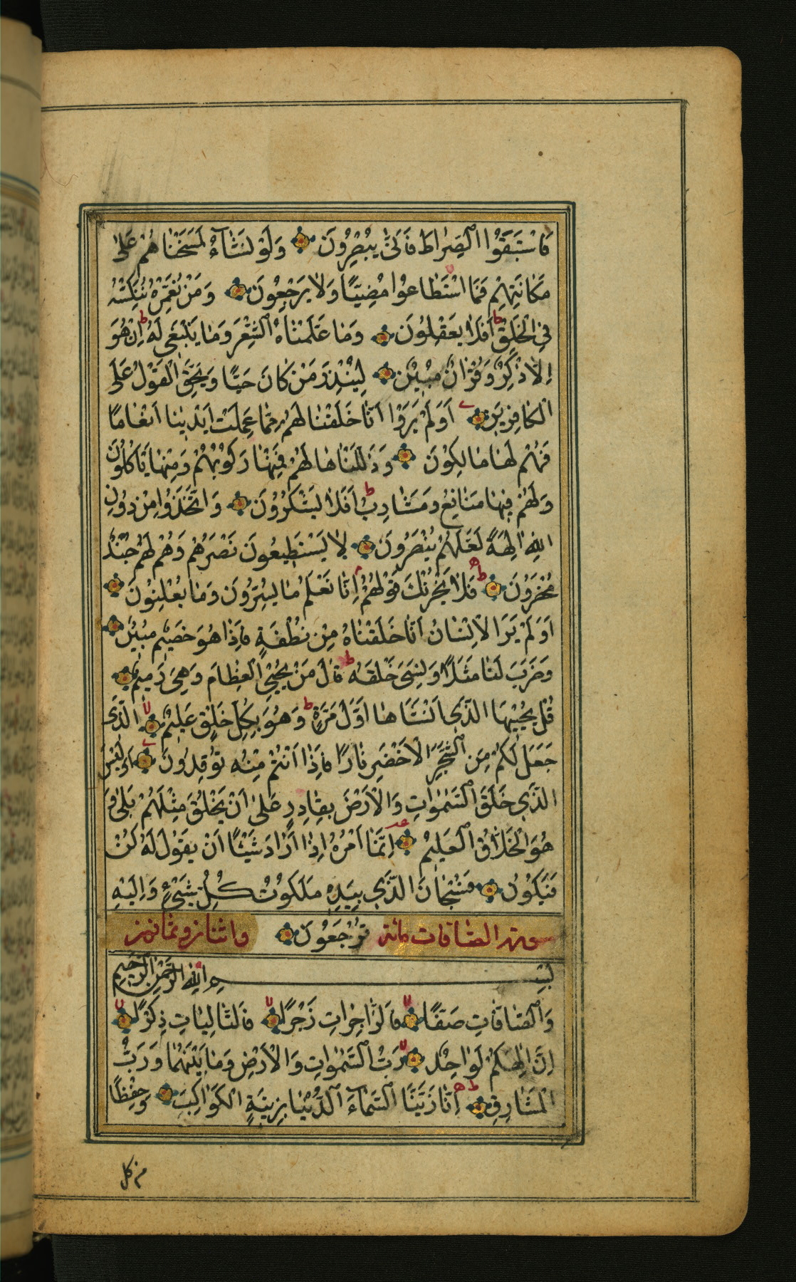 This manuscript is a small illuminated single-volume copy of the Qurʾan, likely produced in Iran. A date is inscribed on the final page, which is interpreted as 1230 AH / 1814-5 CE (fol. 186b). The manuscript opens with an illuminated double-page incipit with the verses of chapter 1 (Sūrat al-fātiḥah) and the initial verses of chapter 2 (Sūrat al-baqarah), decorated with interlinear illumination (fols. 1b-2a). The text is in vocalized naskh script in black ink with reading marks in red and text divisions, such as thirty verses (juzʾ) or sixty verses (ḥizb), in the margins. Illuminated discs with colored dots separate the verses. Chapter headings are in riqāʿ script in red ink on a gold ground. The nineteenth-century lacquer binding with a floral composition on a gold field on the upper and lower boards seems to be contemporary with the manuscript. The insides of both boards are painted with a lobed yellow central medallion and pendants on an orange field.