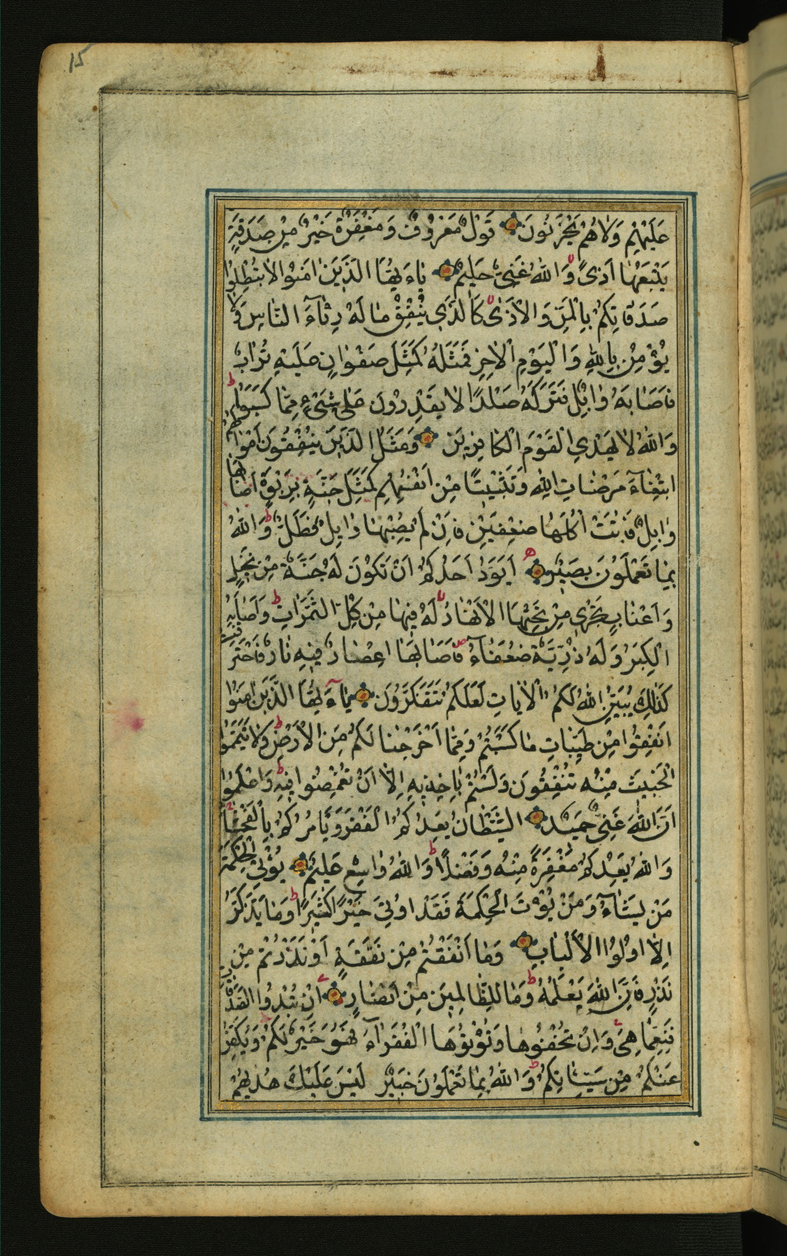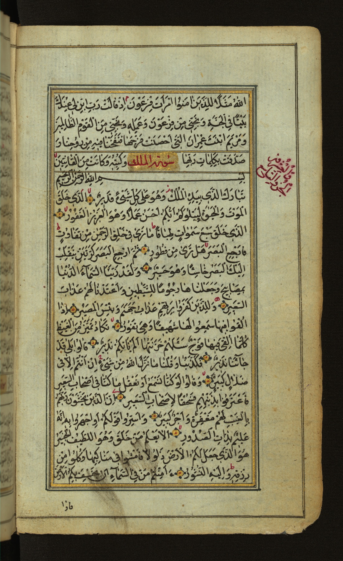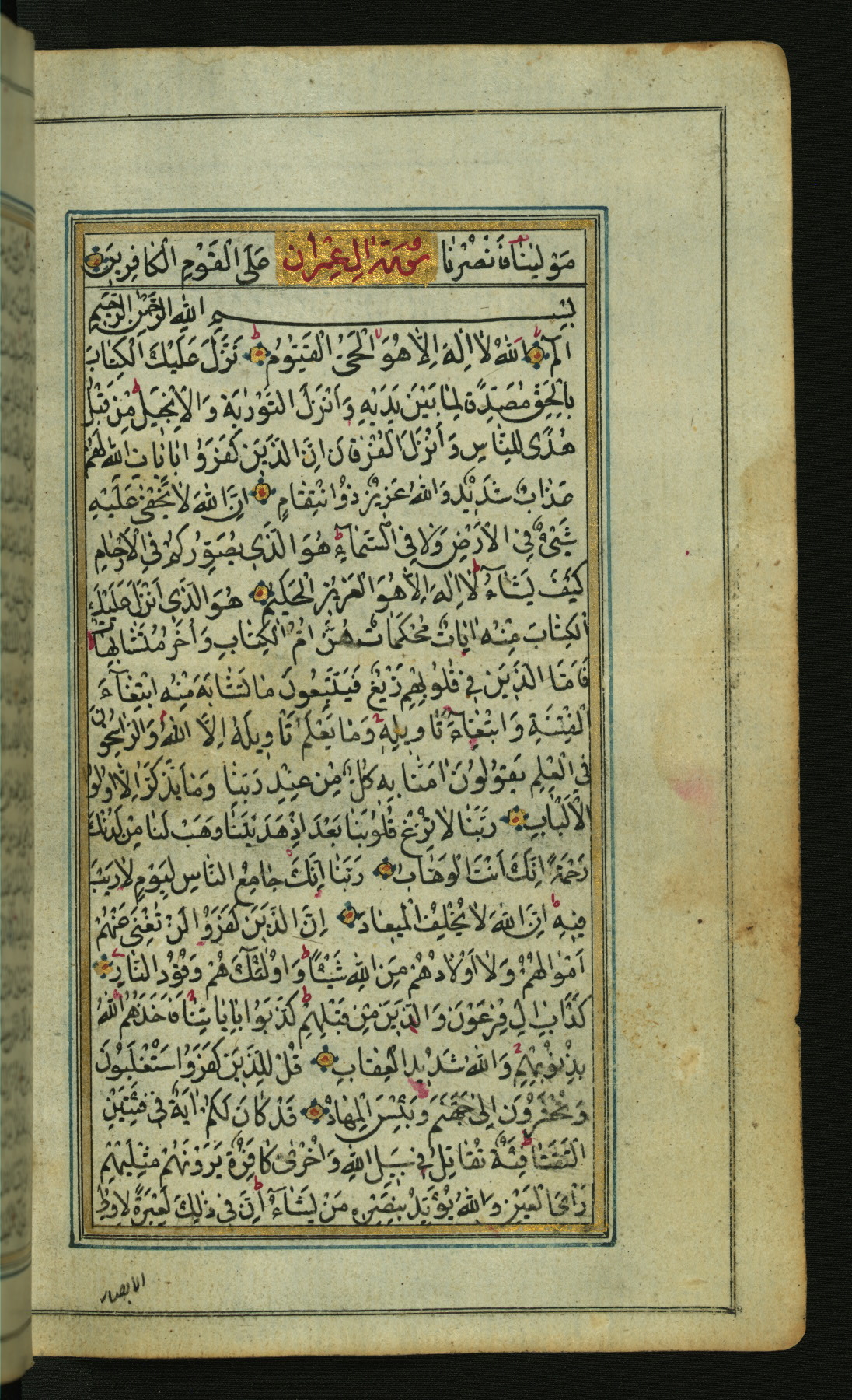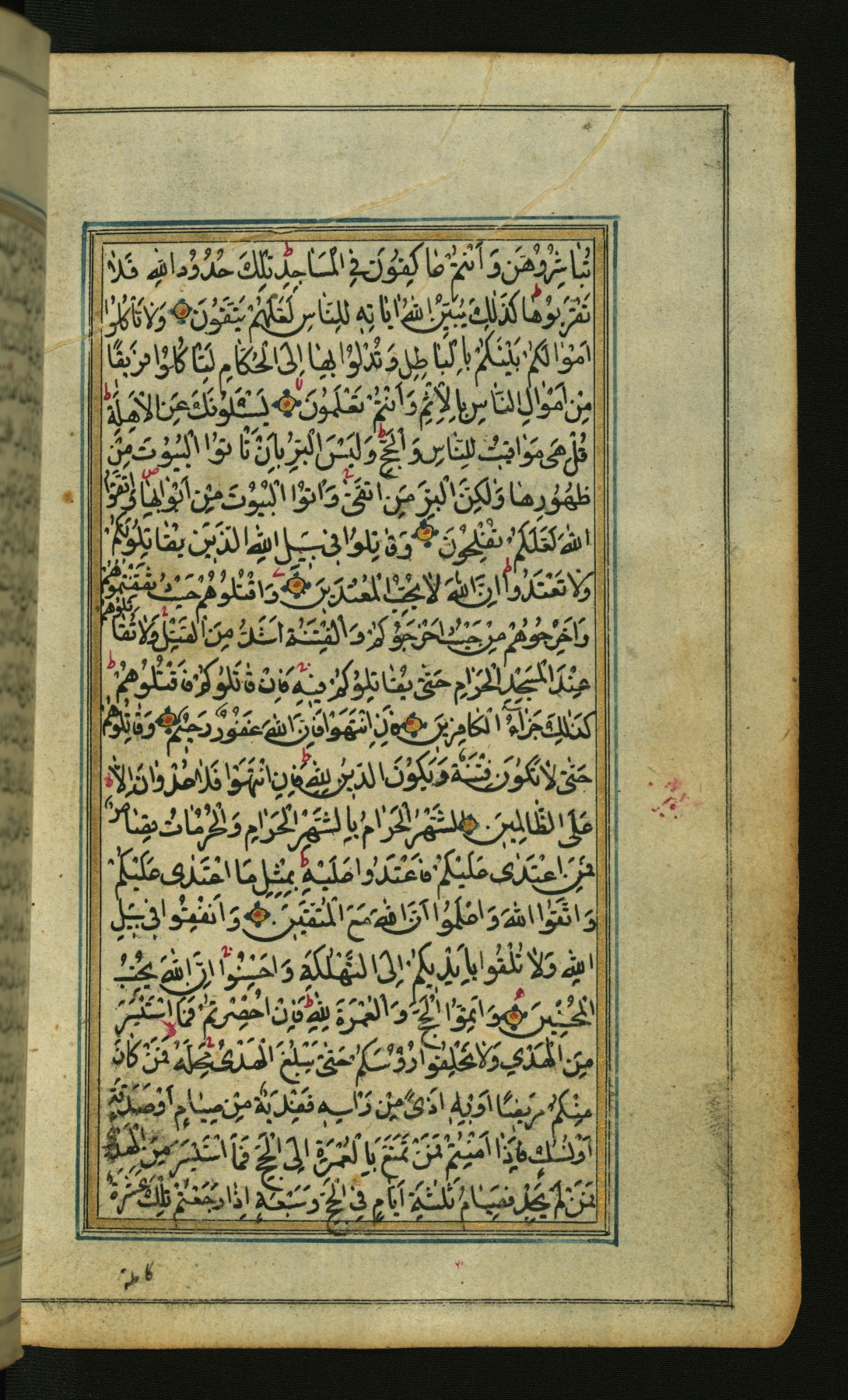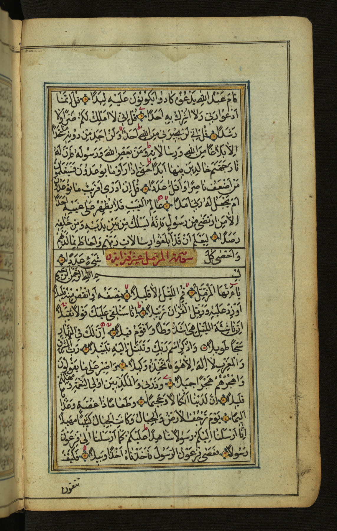 This manuscript is a small illuminated single-volume copy of the Qurʾan, likely produced in Iran. A date is inscribed on the final page, which is interpreted as 1230 AH / 1814-5 CE (fol. 186b). The manuscript opens with an illuminated double-page incipit with the verses of chapter 1 (Sūrat al-fātiḥah) and the initial verses of chapter 2 (Sūrat al-baqarah), decorated with interlinear illumination (fols. 1b-2a). The text is in vocalized naskh script in black ink with reading marks in red and text divisions, such as thirty verses (juzʾ) or sixty verses (ḥizb), in the margins. Illuminated discs with colored dots separate the verses. Chapter headings are in riqāʿ script in red ink on a gold ground. The nineteenth-century lacquer binding with a floral composition on a gold field on the upper and lower boards seems to be contemporary with the manuscript. The insides of both boards are painted with a lobed yellow central medallion and pendants on an orange field.