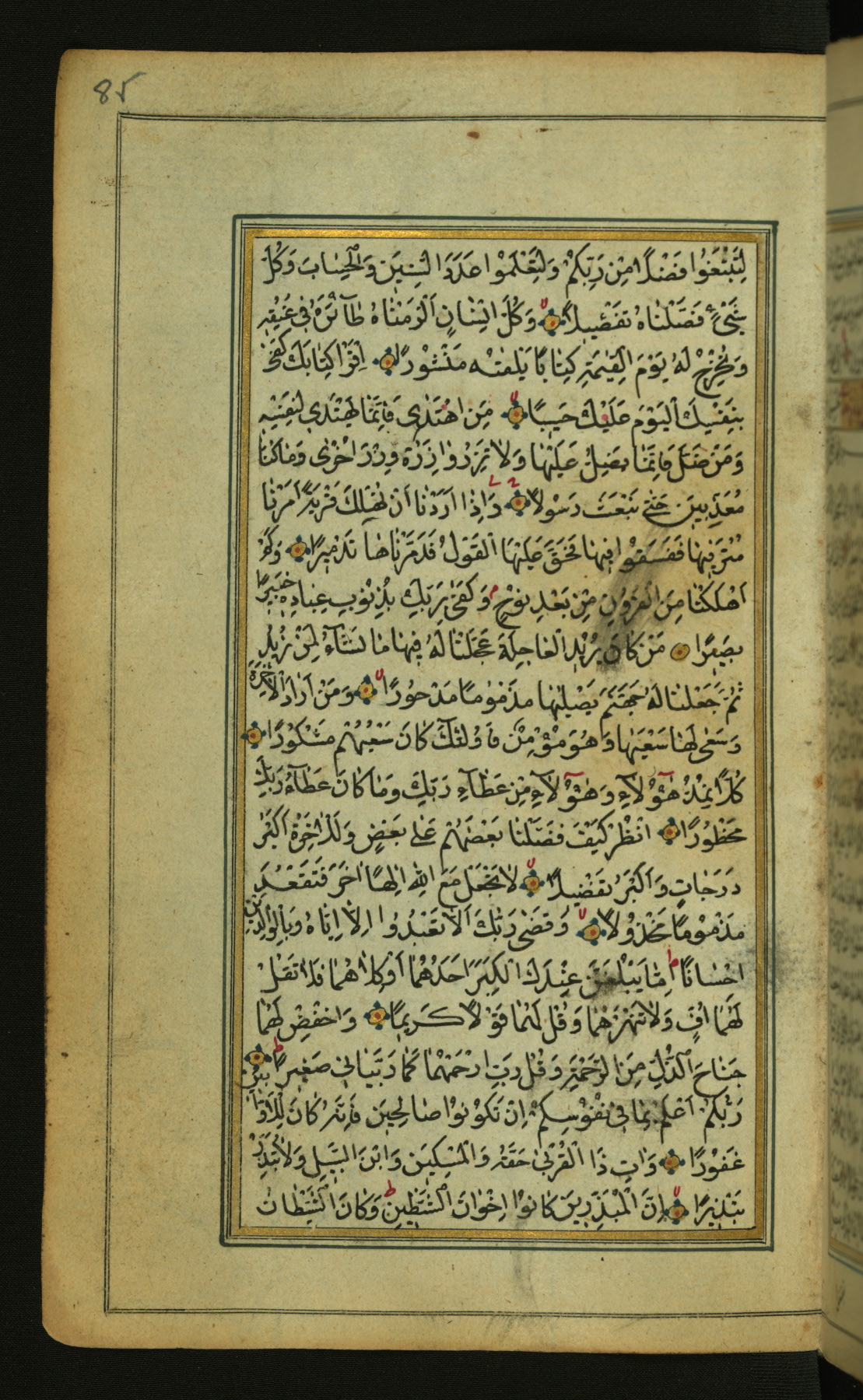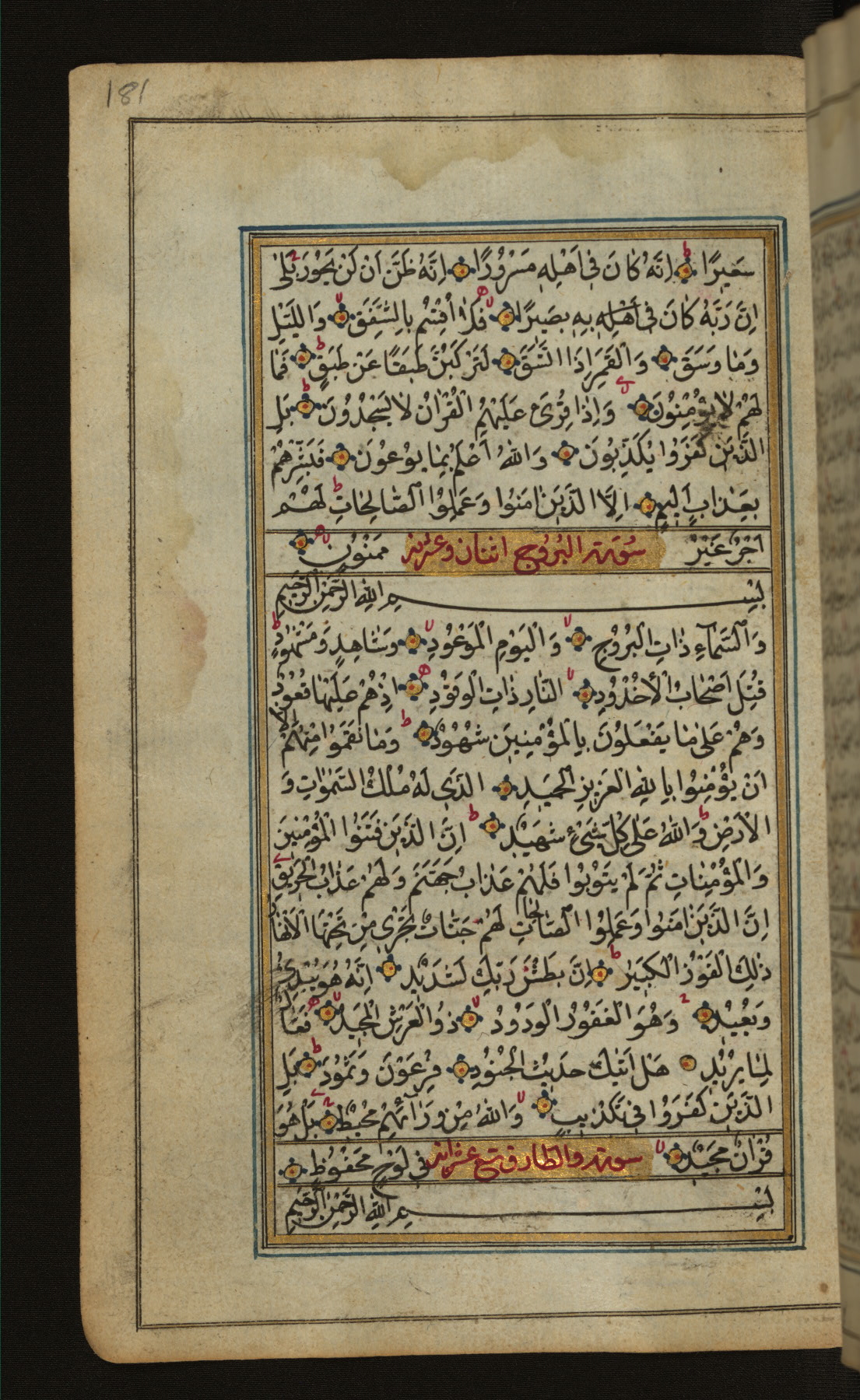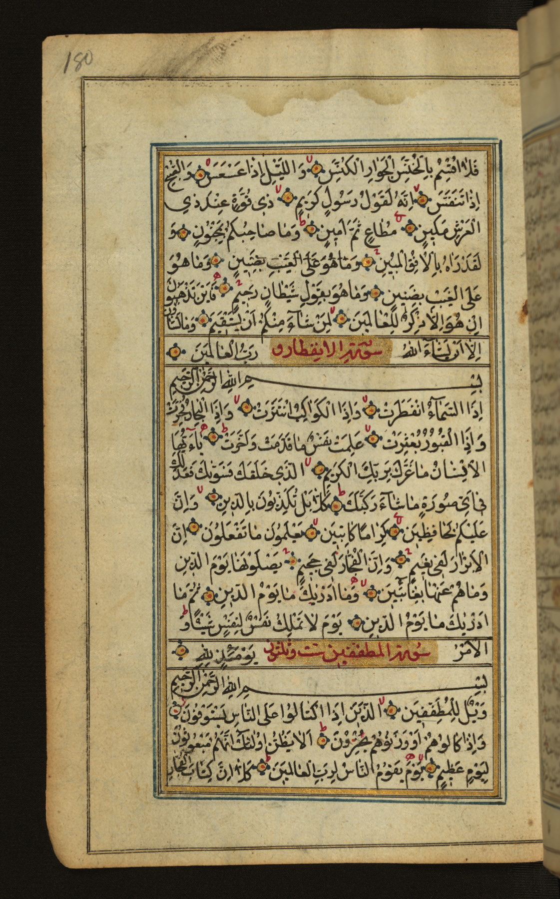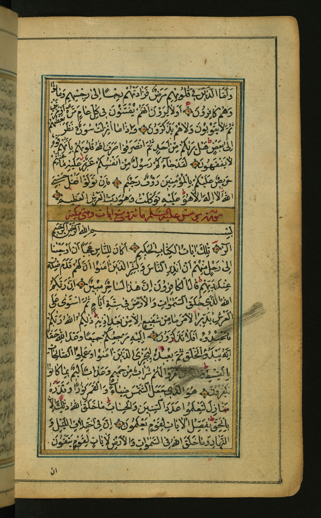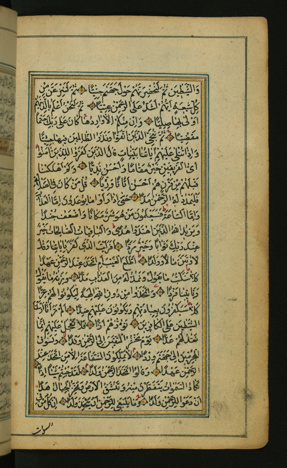 This manuscript is a small illuminated single-volume copy of the Qurʾan, likely produced in Iran. A date is inscribed on the final page, which is interpreted as 1230 AH / 1814-5 CE (fol. 186b). The manuscript opens with an illuminated double-page incipit with the verses of chapter 1 (Sūrat al-fātiḥah) and the initial verses of chapter 2 (Sūrat al-baqarah), decorated with interlinear illumination (fols. 1b-2a). The text is in vocalized naskh script in black ink with reading marks in red and text divisions, such as thirty verses (juzʾ) or sixty verses (ḥizb), in the margins. Illuminated discs with colored dots separate the verses. Chapter headings are in riqāʿ script in red ink on a gold ground. The nineteenth-century lacquer binding with a floral composition on a gold field on the upper and lower boards seems to be contemporary with the manuscript. The insides of both boards are painted with a lobed yellow central medallion and pendants on an orange field.