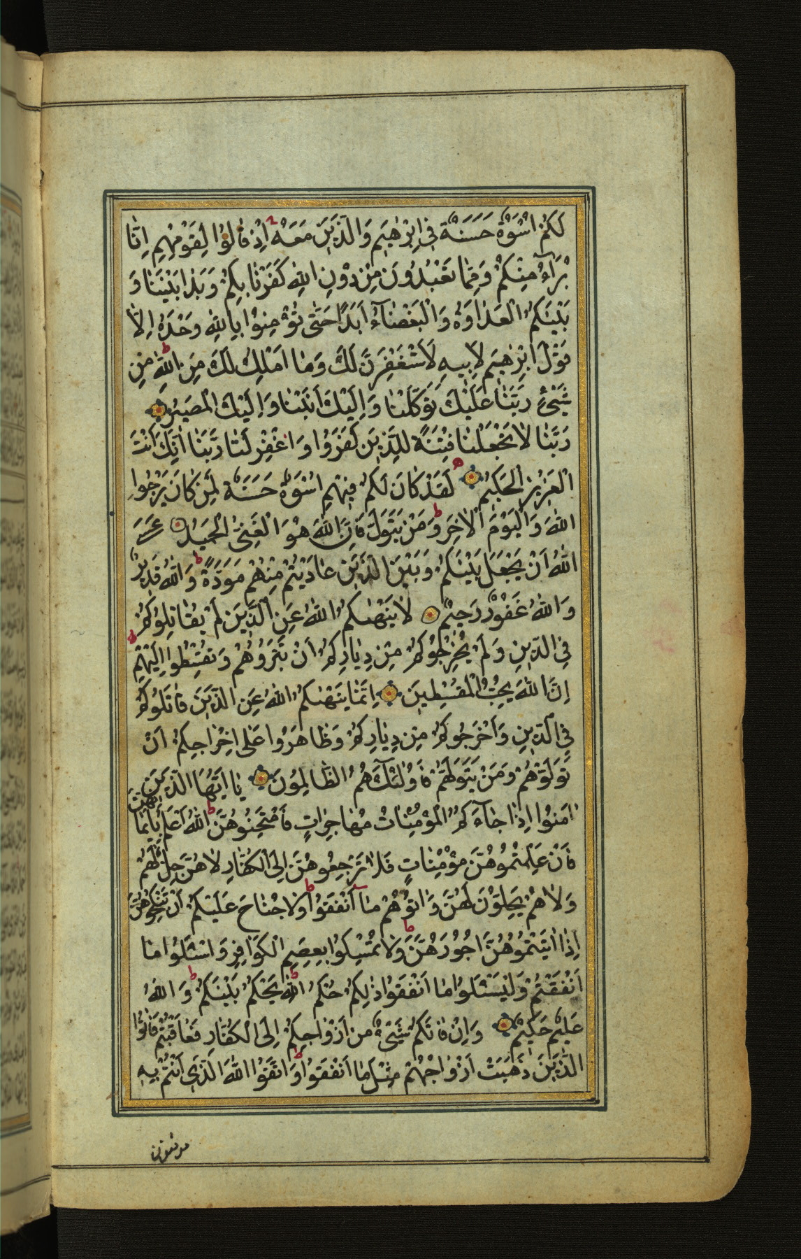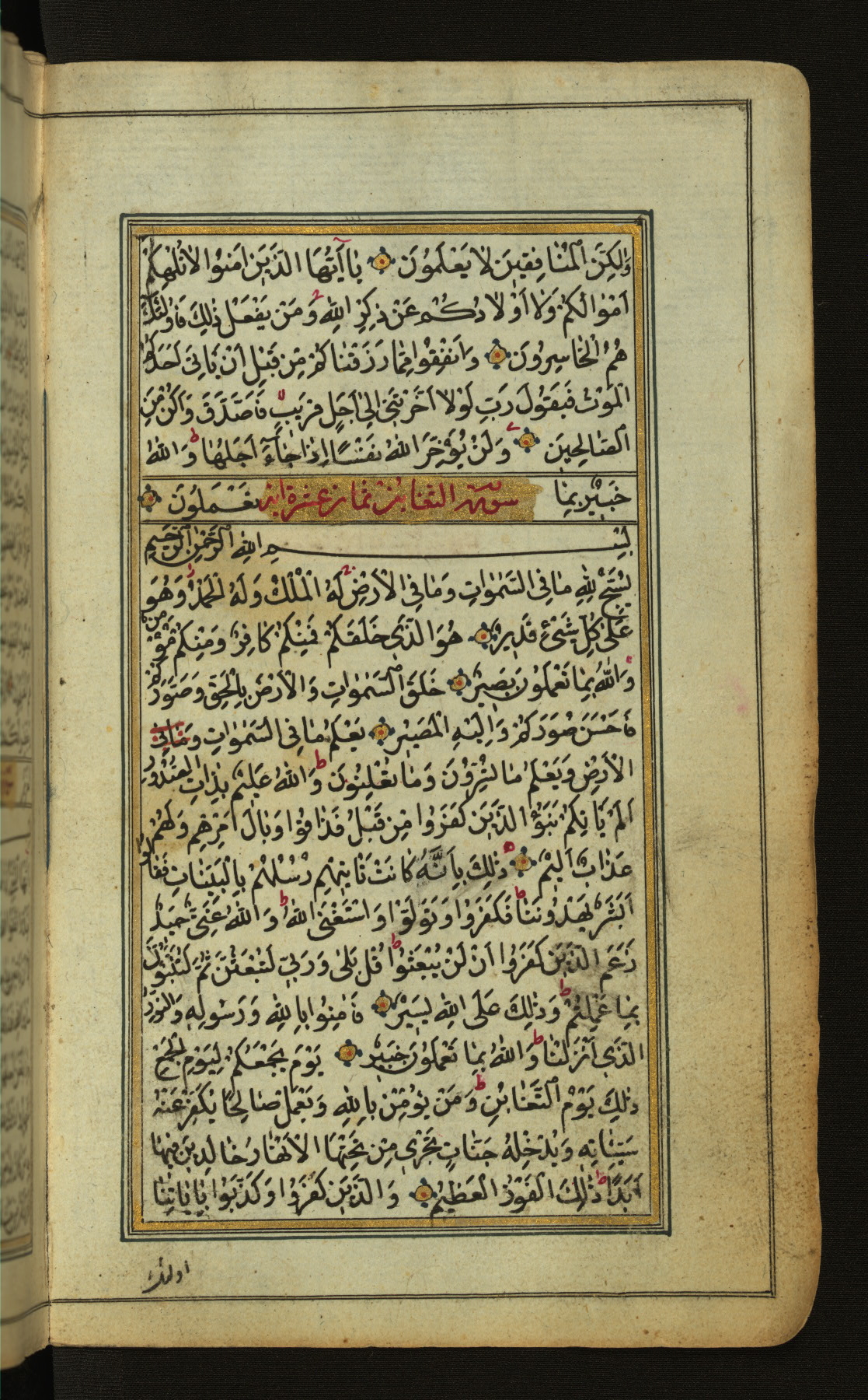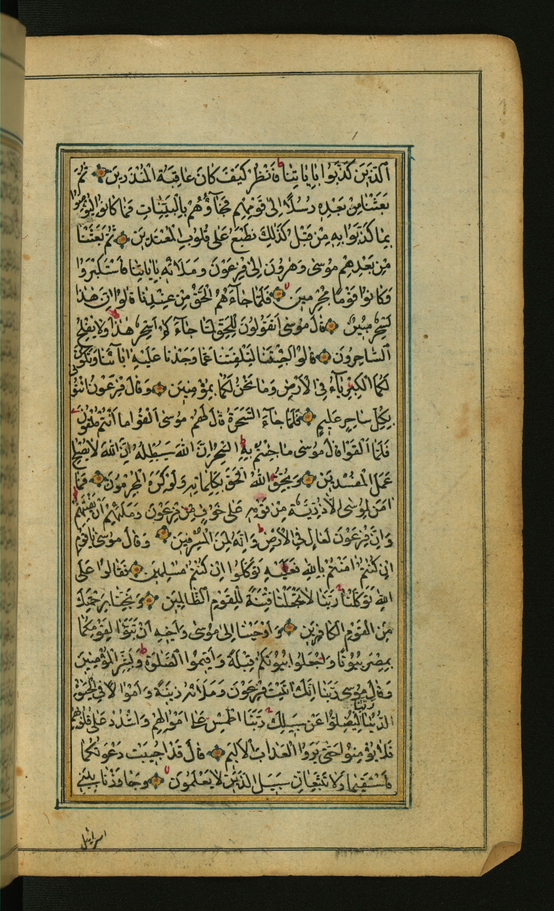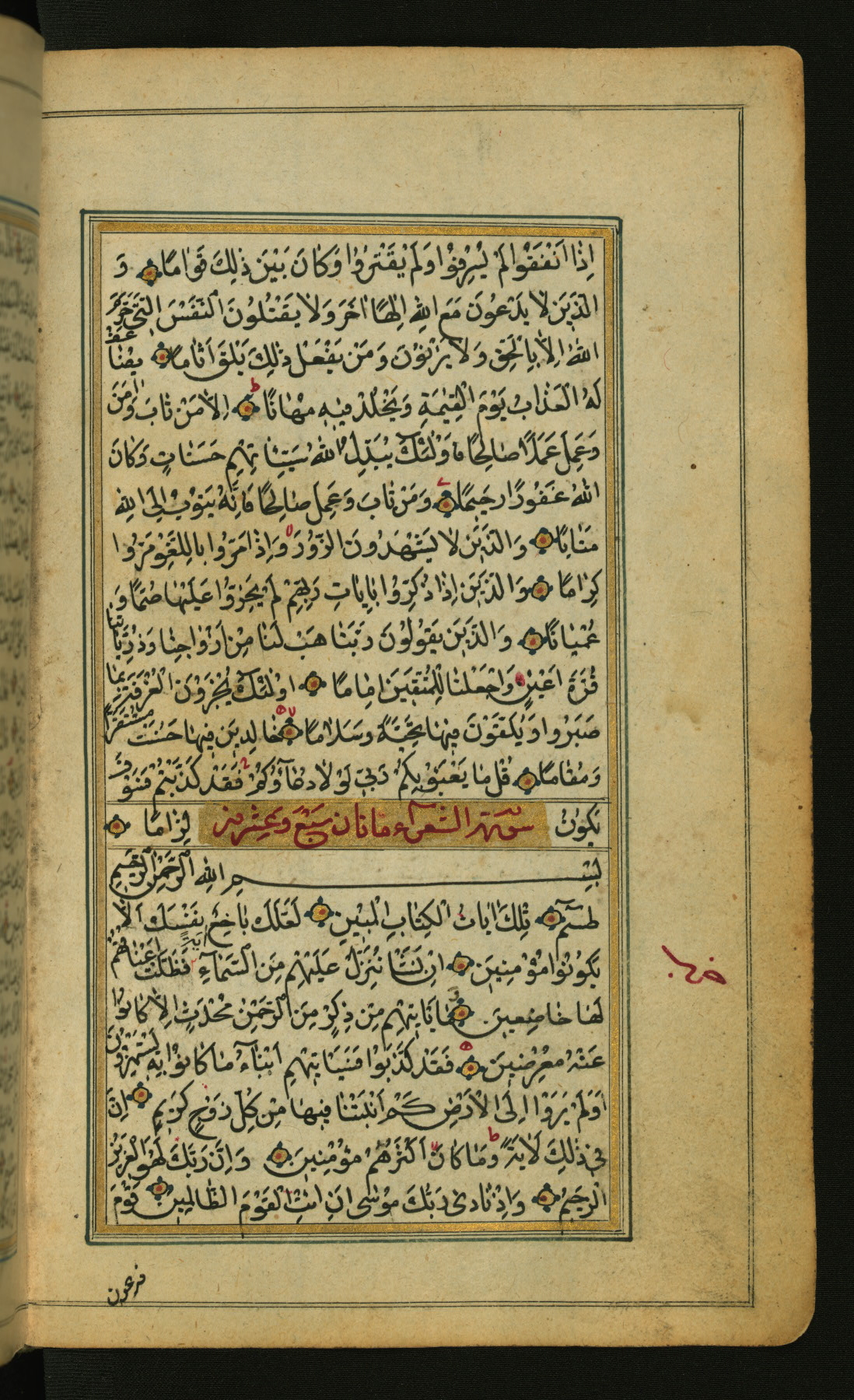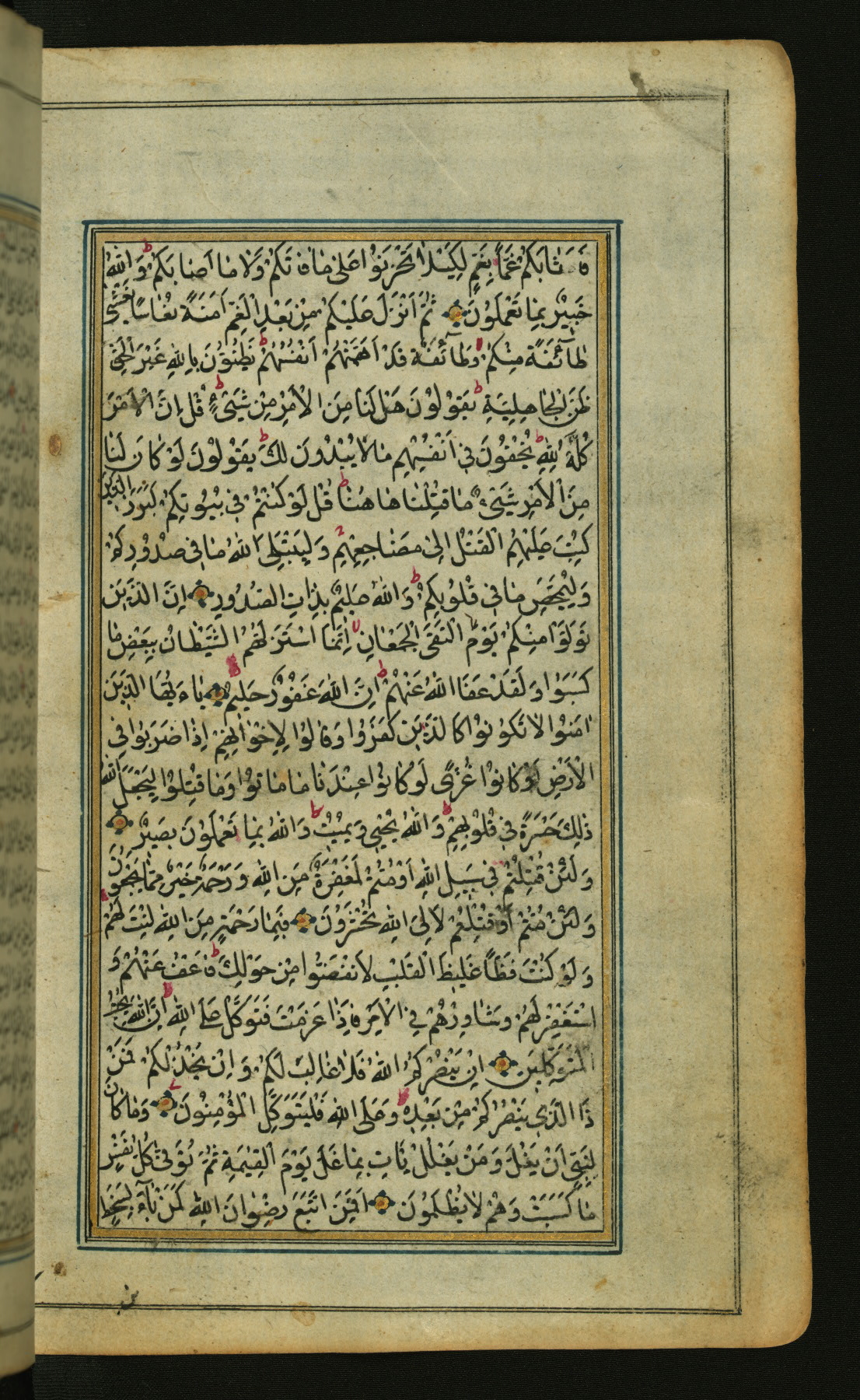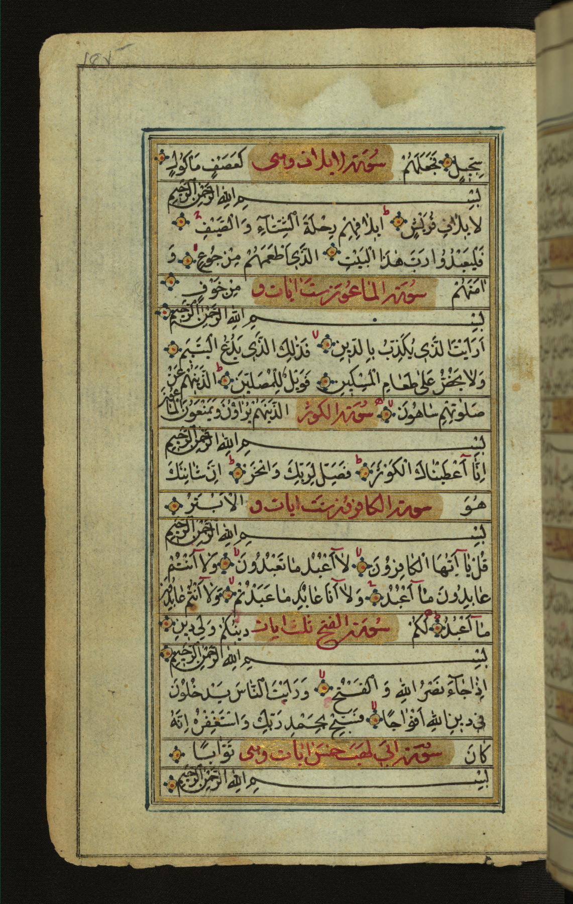 This manuscript is a small illuminated single-volume copy of the Qurʾan, likely produced in Iran. A date is inscribed on the final page, which is interpreted as 1230 AH / 1814-5 CE (fol. 186b). The manuscript opens with an illuminated double-page incipit with the verses of chapter 1 (Sūrat al-fātiḥah) and the initial verses of chapter 2 (Sūrat al-baqarah), decorated with interlinear illumination (fols. 1b-2a). The text is in vocalized naskh script in black ink with reading marks in red and text divisions, such as thirty verses (juzʾ) or sixty verses (ḥizb), in the margins. Illuminated discs with colored dots separate the verses. Chapter headings are in riqāʿ script in red ink on a gold ground. The nineteenth-century lacquer binding with a floral composition on a gold field on the upper and lower boards seems to be contemporary with the manuscript. The insides of both boards are painted with a lobed yellow central medallion and pendants on an orange field.
