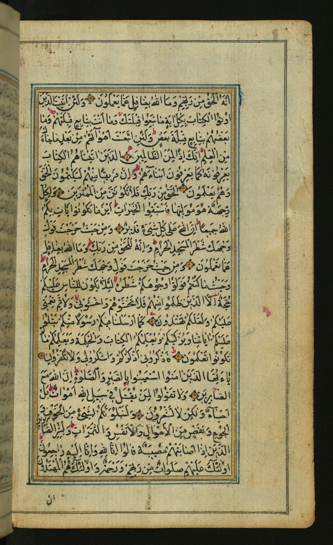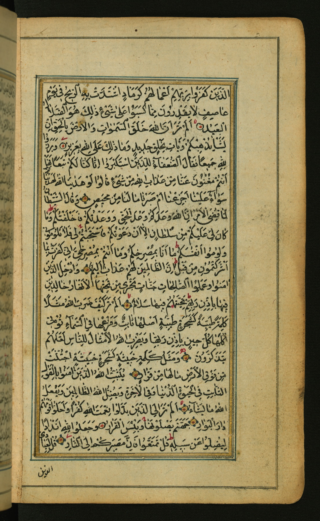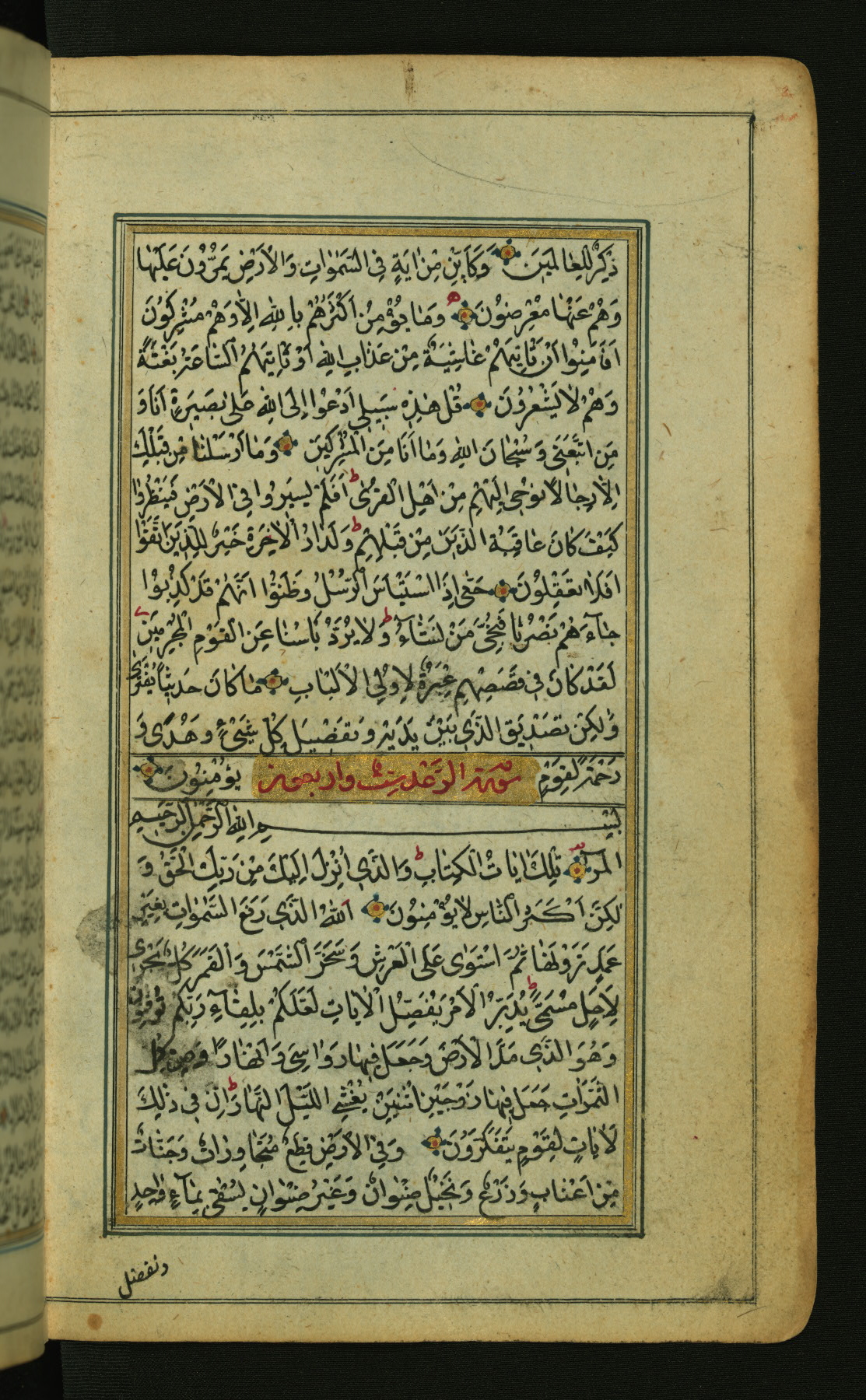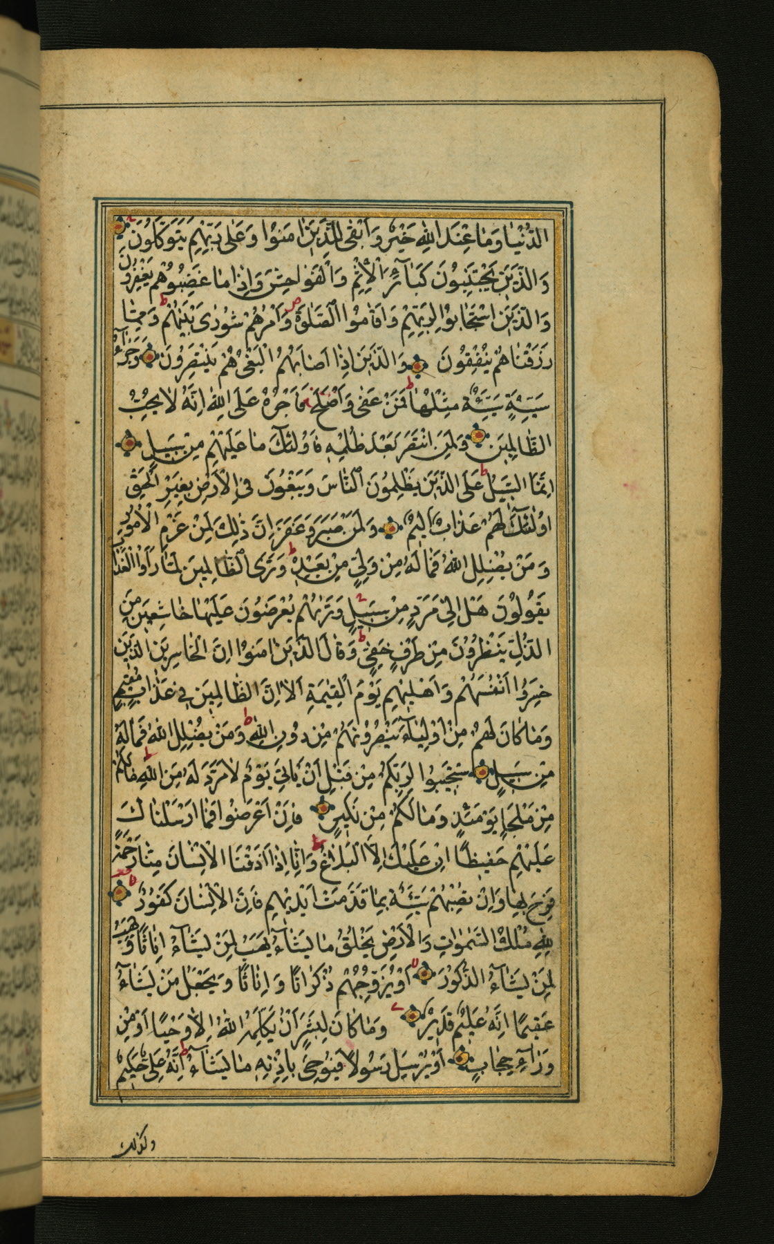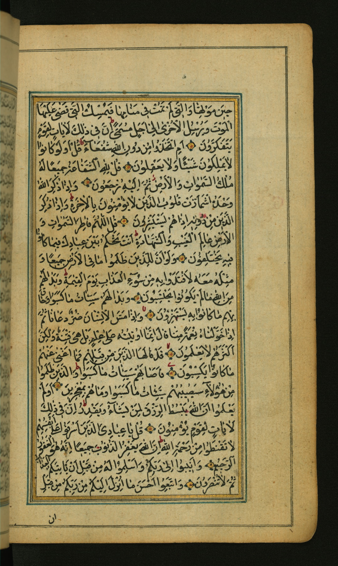 This manuscript is a small illuminated single-volume copy of the Qurʾan, likely produced in Iran. A date is inscribed on the final page, which is interpreted as 1230 AH / 1814-5 CE (fol. 186b). The manuscript opens with an illuminated double-page incipit with the verses of chapter 1 (Sūrat al-fātiḥah) and the initial verses of chapter 2 (Sūrat al-baqarah), decorated with interlinear illumination (fols. 1b-2a). The text is in vocalized naskh script in black ink with reading marks in red and text divisions, such as thirty verses (juzʾ) or sixty verses (ḥizb), in the margins. Illuminated discs with colored dots separate the verses. Chapter headings are in riqāʿ script in red ink on a gold ground. The nineteenth-century lacquer binding with a floral composition on a gold field on the upper and lower boards seems to be contemporary with the manuscript. The insides of both boards are painted with a lobed yellow central medallion and pendants on an orange field.