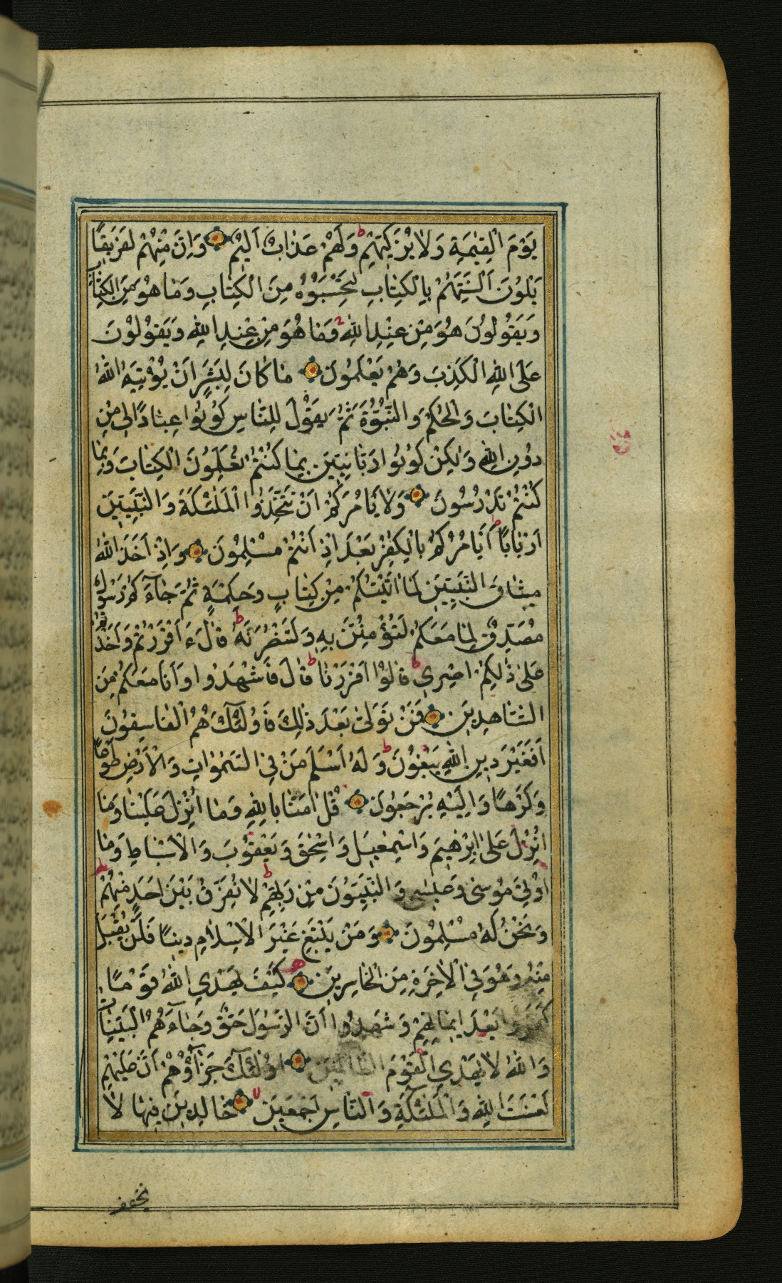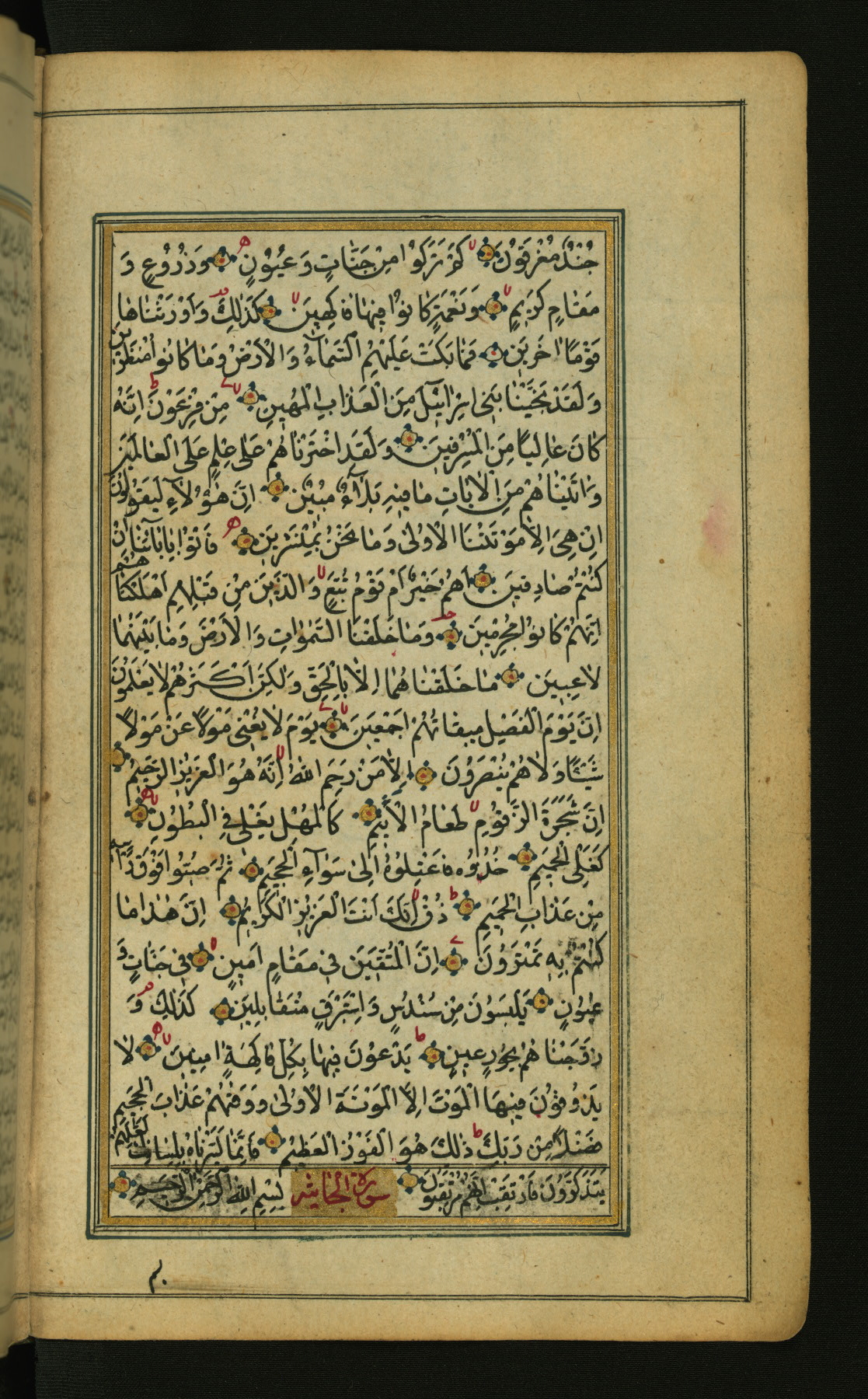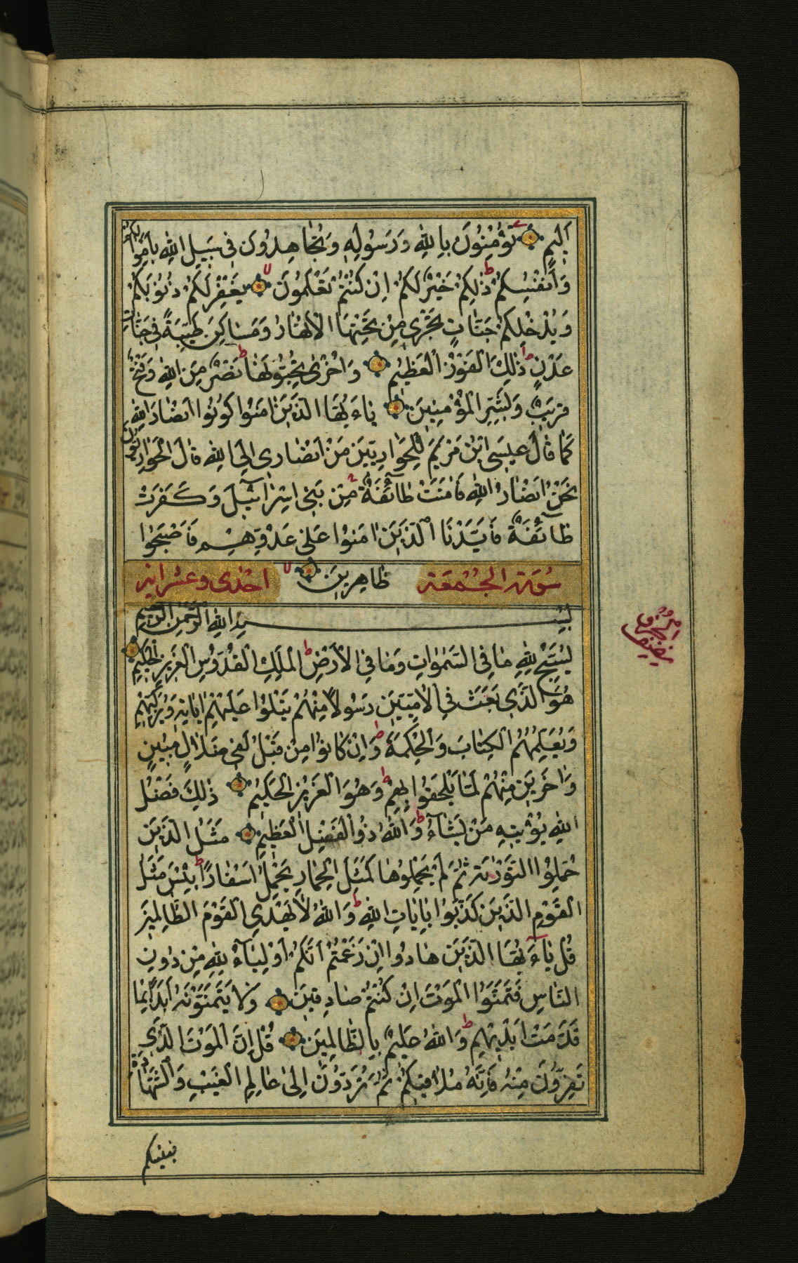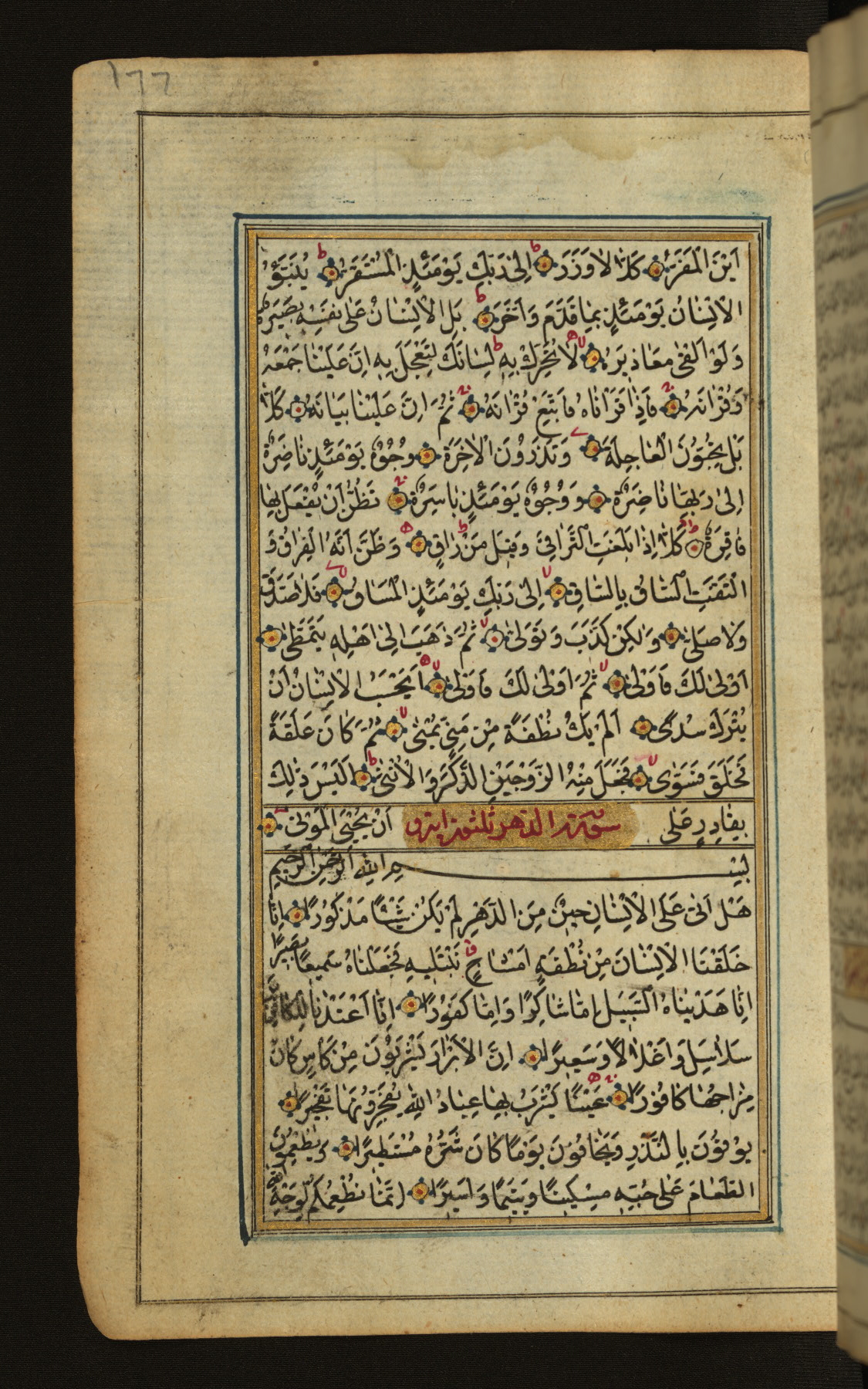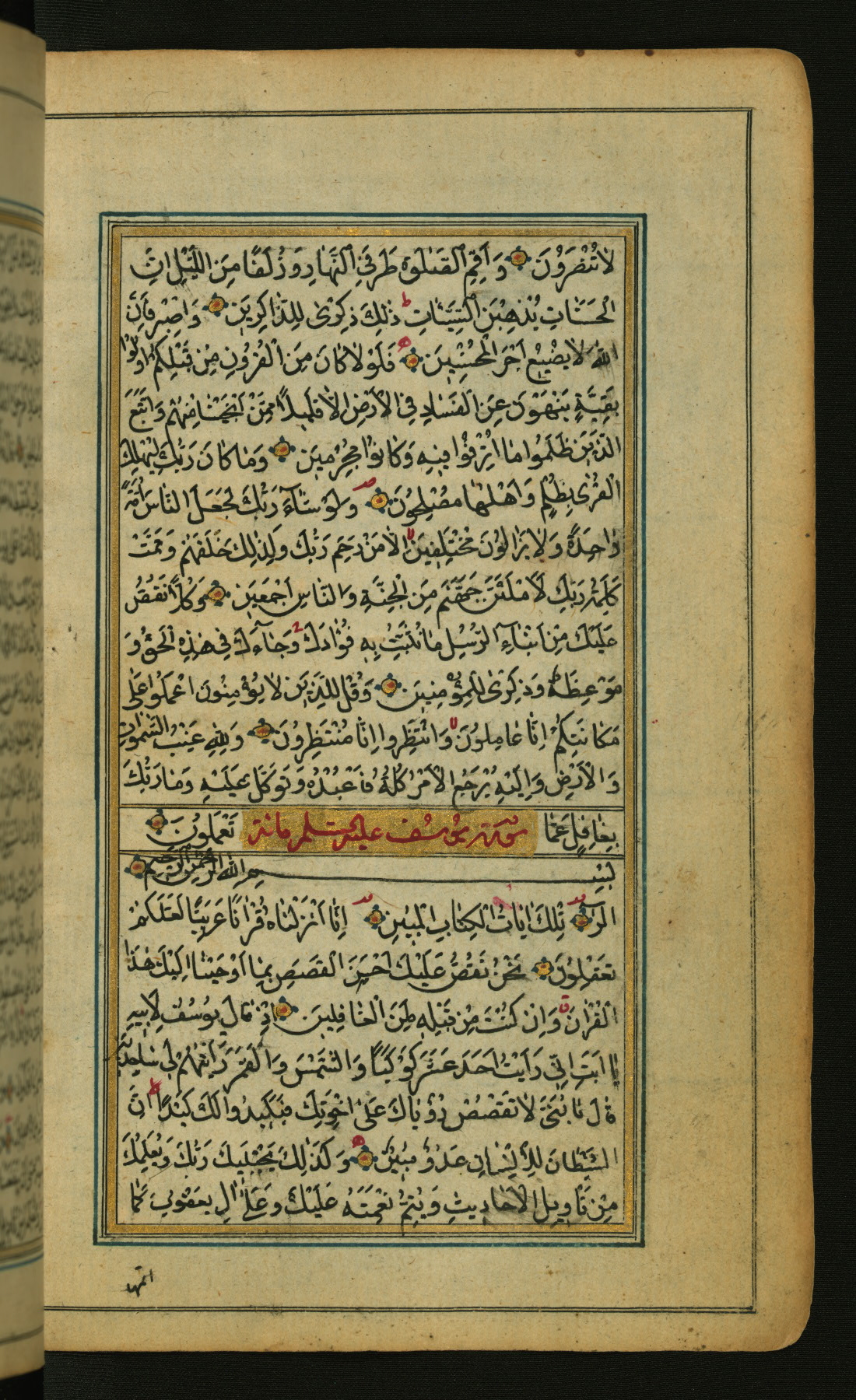 This manuscript is a small illuminated single-volume copy of the Qurʾan, likely produced in Iran. A date is inscribed on the final page, which is interpreted as 1230 AH / 1814-5 CE (fol. 186b). The manuscript opens with an illuminated double-page incipit with the verses of chapter 1 (Sūrat al-fātiḥah) and the initial verses of chapter 2 (Sūrat al-baqarah), decorated with interlinear illumination (fols. 1b-2a). The text is in vocalized naskh script in black ink with reading marks in red and text divisions, such as thirty verses (juzʾ) or sixty verses (ḥizb), in the margins. Illuminated discs with colored dots separate the verses. Chapter headings are in riqāʿ script in red ink on a gold ground. The nineteenth-century lacquer binding with a floral composition on a gold field on the upper and lower boards seems to be contemporary with the manuscript. The insides of both boards are painted with a lobed yellow central medallion and pendants on an orange field.