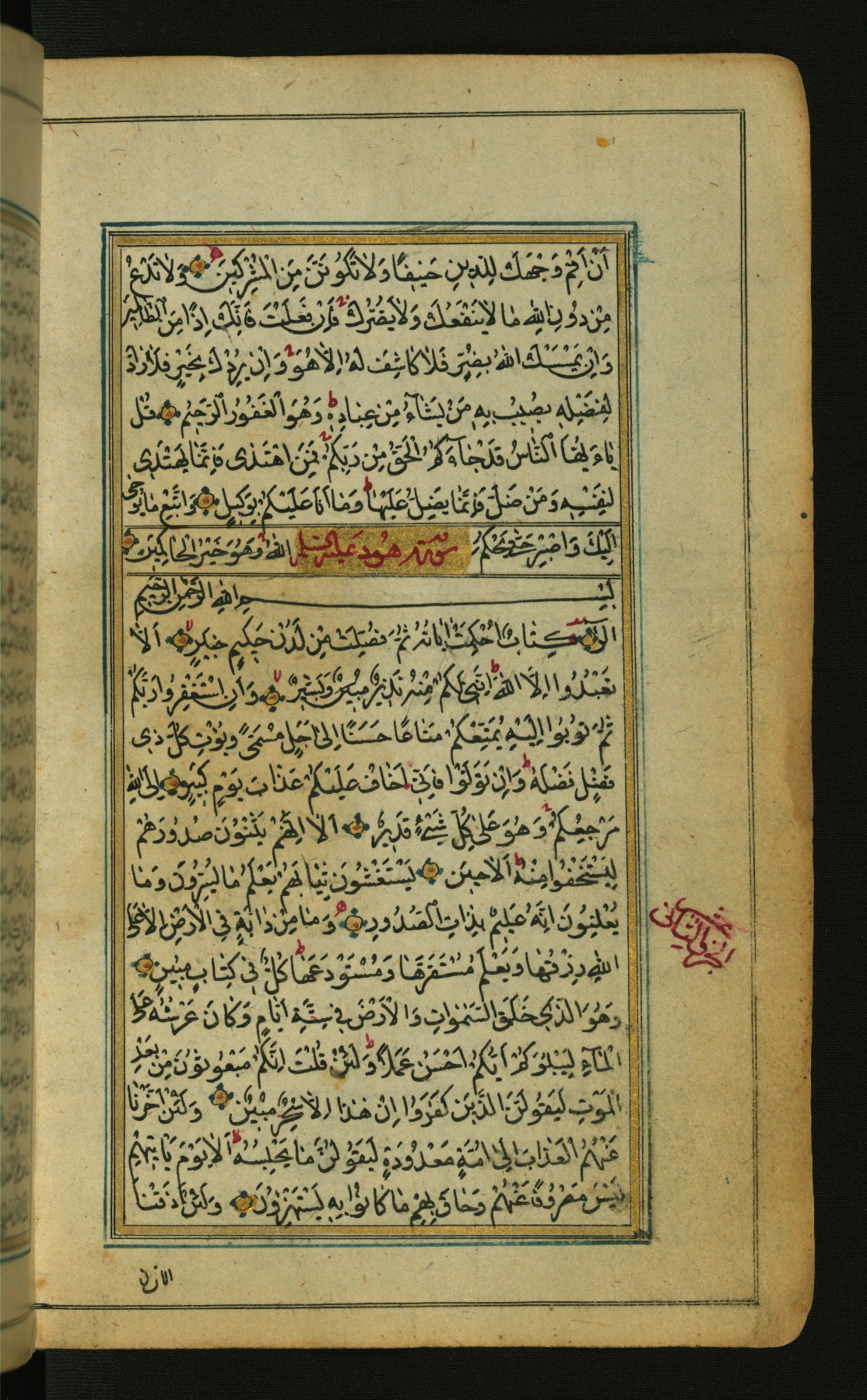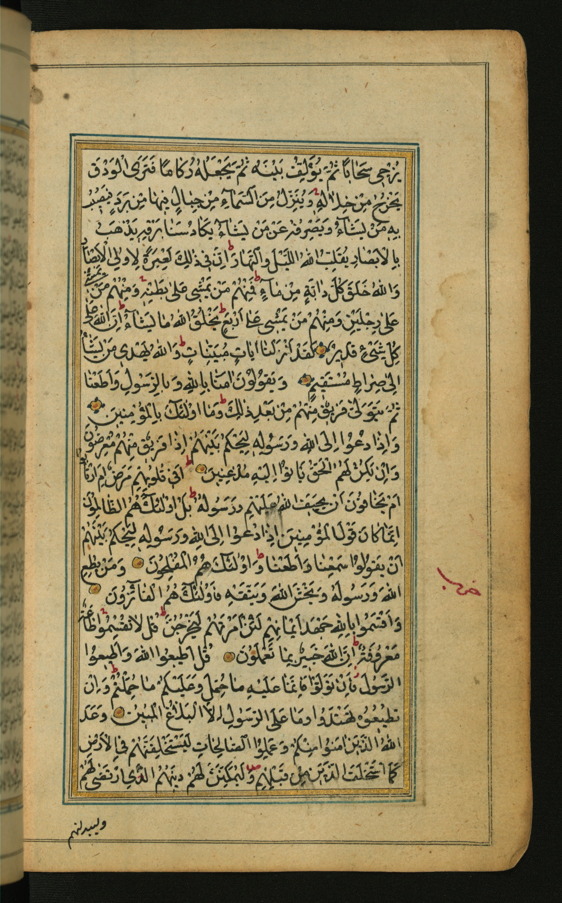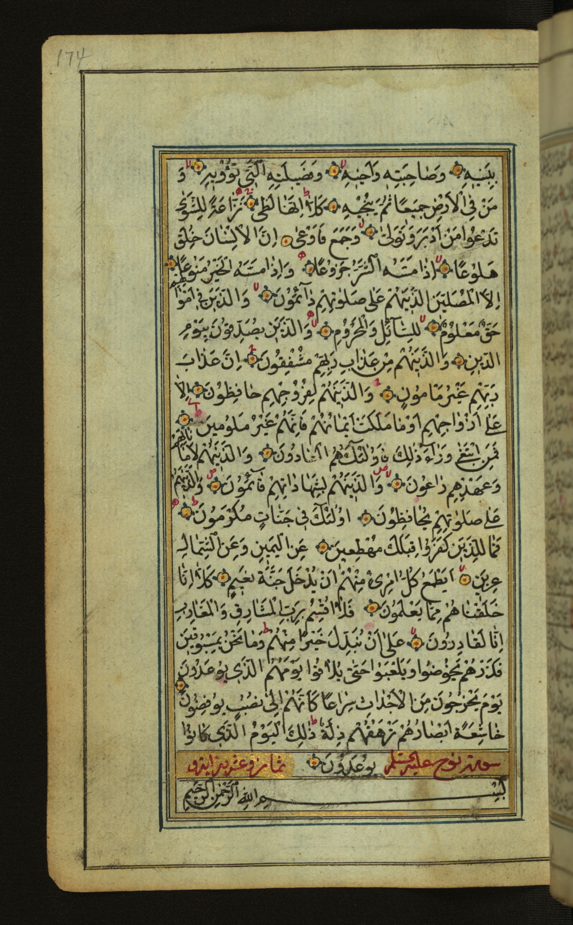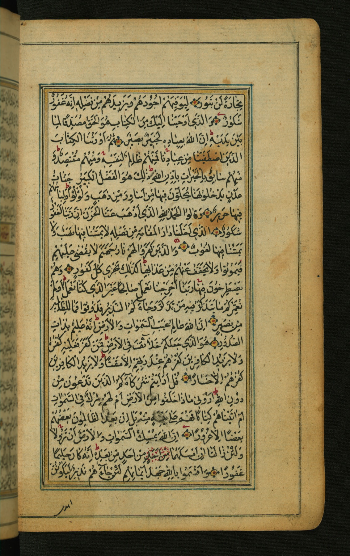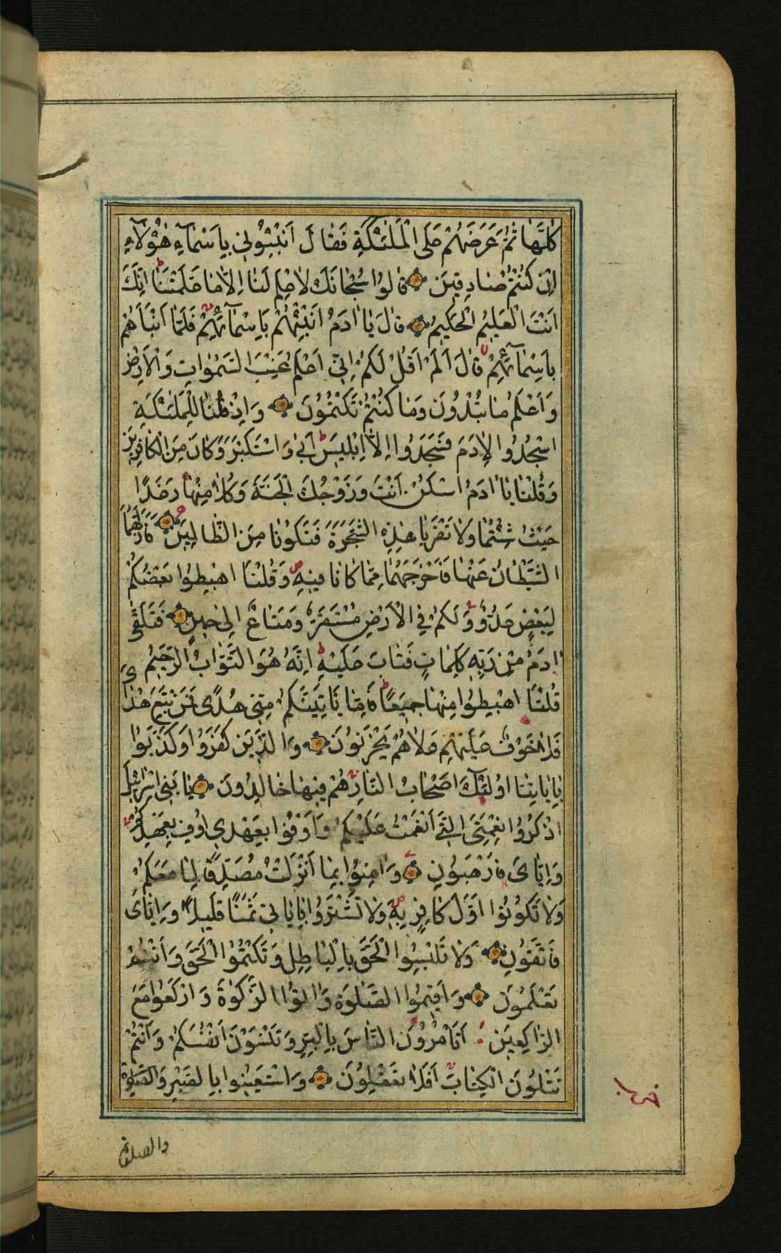 This manuscript is a small illuminated single-volume copy of the Qurʾan, likely produced in Iran. A date is inscribed on the final page, which is interpreted as 1230 AH / 1814-5 CE (fol. 186b). The manuscript opens with an illuminated double-page incipit with the verses of chapter 1 (Sūrat al-fātiḥah) and the initial verses of chapter 2 (Sūrat al-baqarah), decorated with interlinear illumination (fols. 1b-2a). The text is in vocalized naskh script in black ink with reading marks in red and text divisions, such as thirty verses (juzʾ) or sixty verses (ḥizb), in the margins. Illuminated discs with colored dots separate the verses. Chapter headings are in riqāʿ script in red ink on a gold ground. The nineteenth-century lacquer binding with a floral composition on a gold field on the upper and lower boards seems to be contemporary with the manuscript. The insides of both boards are painted with a lobed yellow central medallion and pendants on an orange field.