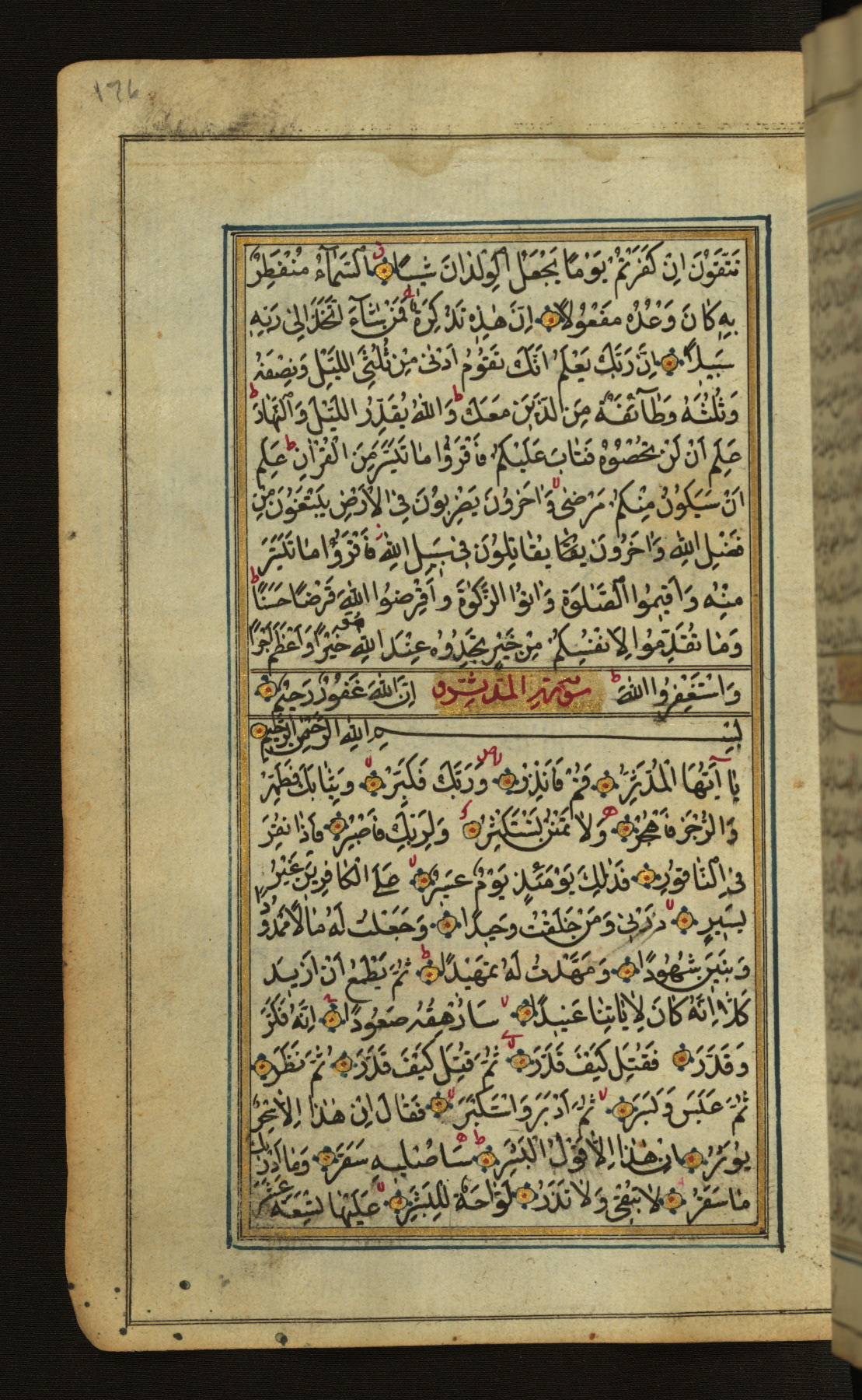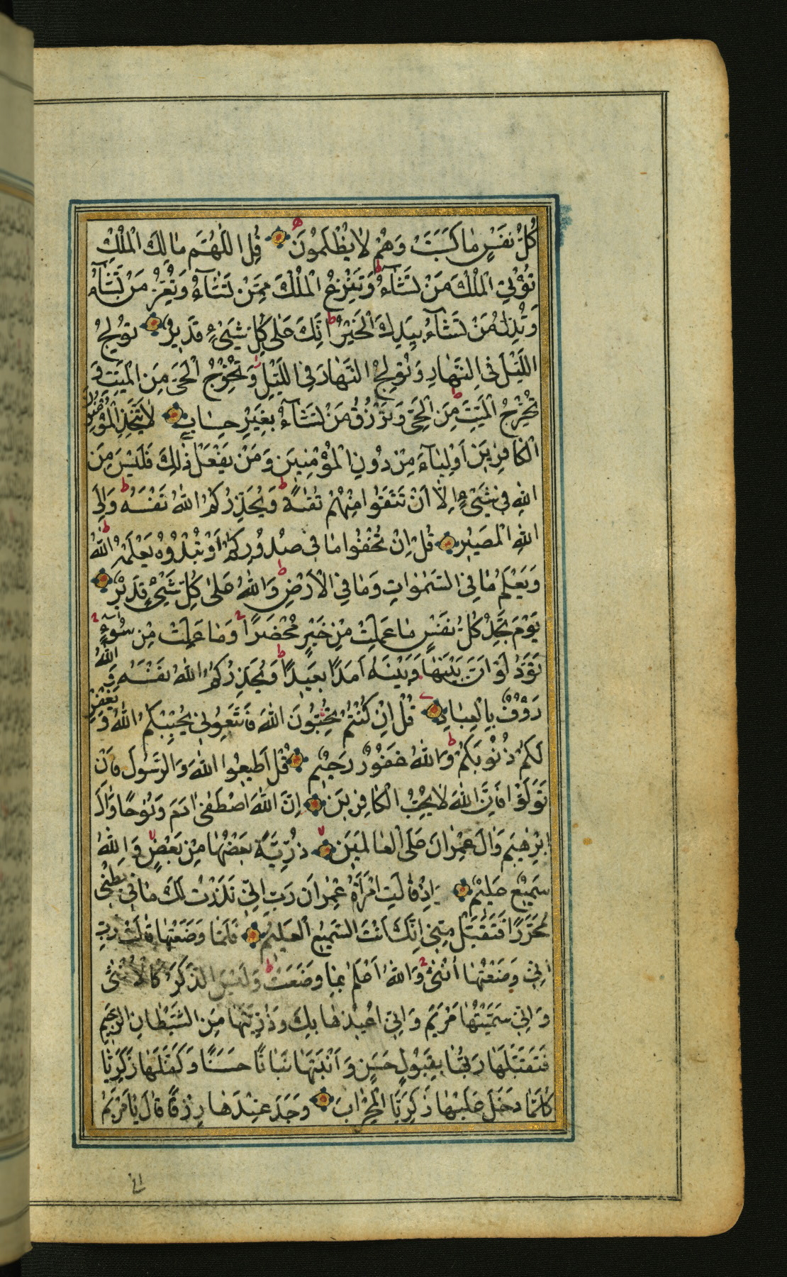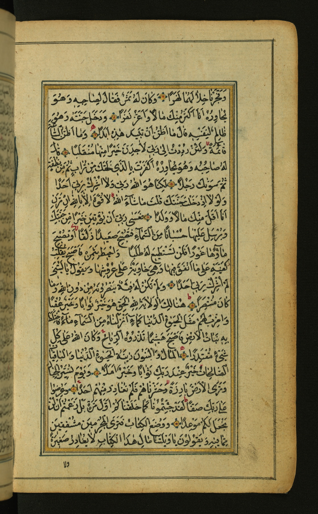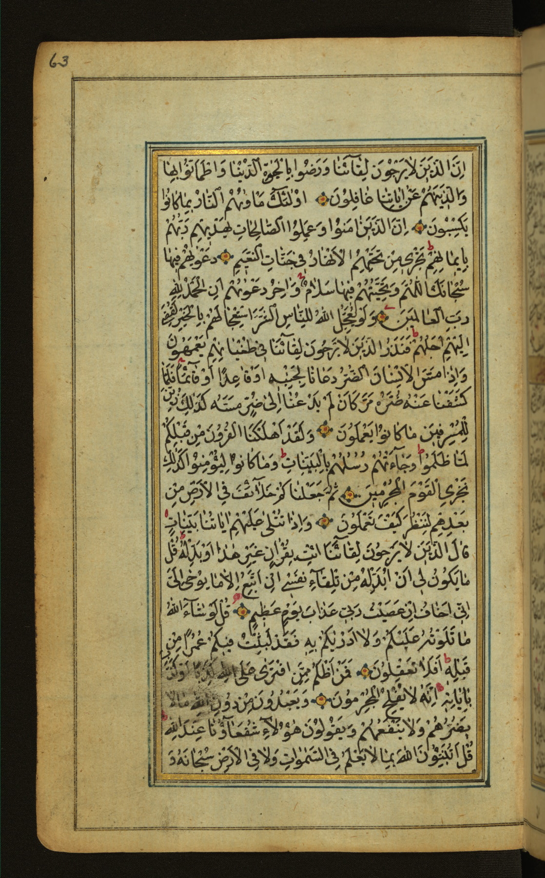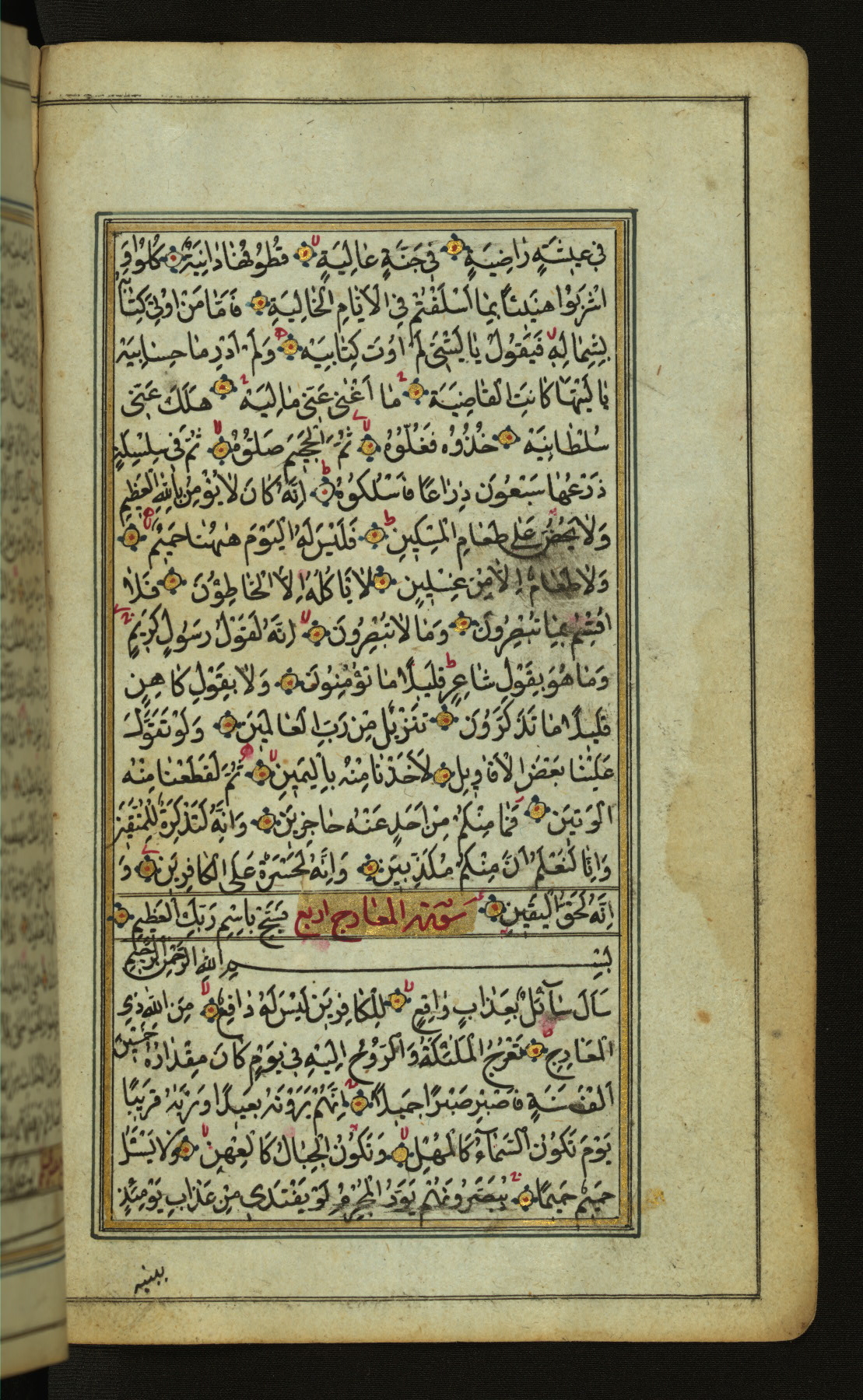 This manuscript is a small illuminated single-volume copy of the Qurʾan, likely produced in Iran. A date is inscribed on the final page, which is interpreted as 1230 AH / 1814-5 CE (fol. 186b). The manuscript opens with an illuminated double-page incipit with the verses of chapter 1 (Sūrat al-fātiḥah) and the initial verses of chapter 2 (Sūrat al-baqarah), decorated with interlinear illumination (fols. 1b-2a). The text is in vocalized naskh script in black ink with reading marks in red and text divisions, such as thirty verses (juzʾ) or sixty verses (ḥizb), in the margins. Illuminated discs with colored dots separate the verses. Chapter headings are in riqāʿ script in red ink on a gold ground. The nineteenth-century lacquer binding with a floral composition on a gold field on the upper and lower boards seems to be contemporary with the manuscript. The insides of both boards are painted with a lobed yellow central medallion and pendants on an orange field.