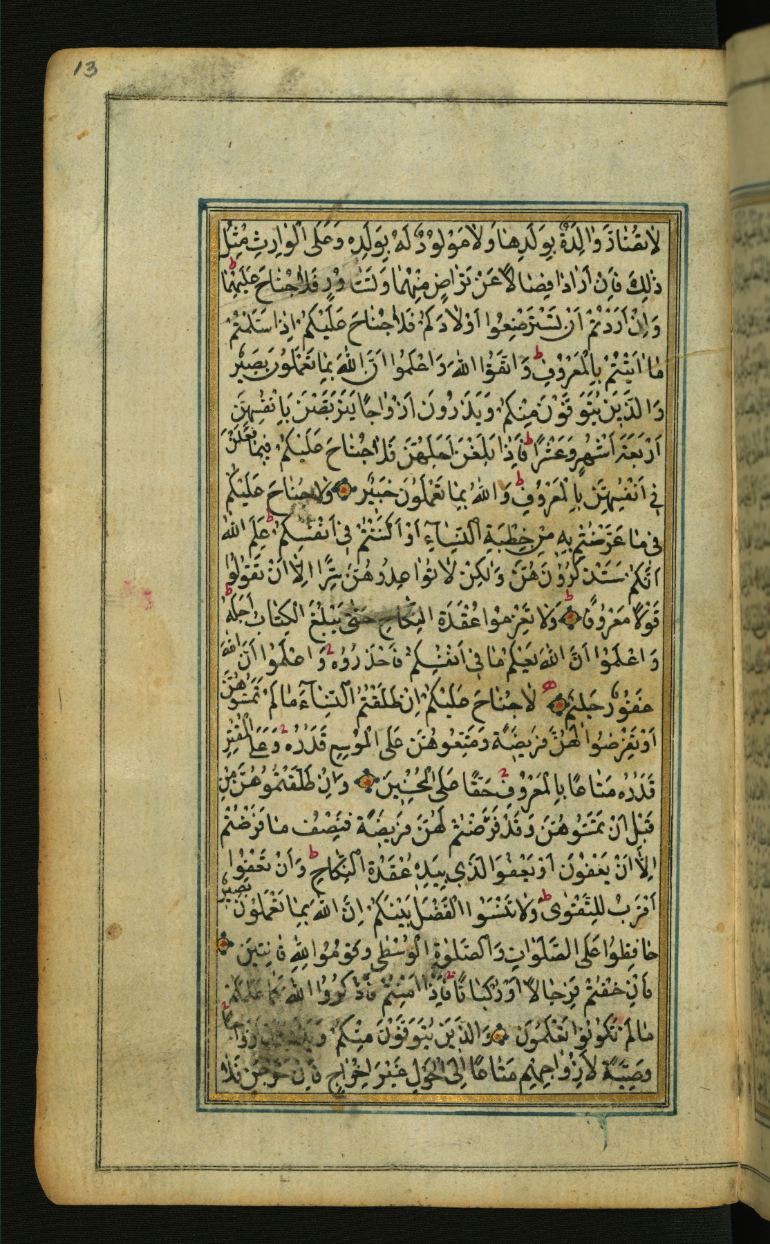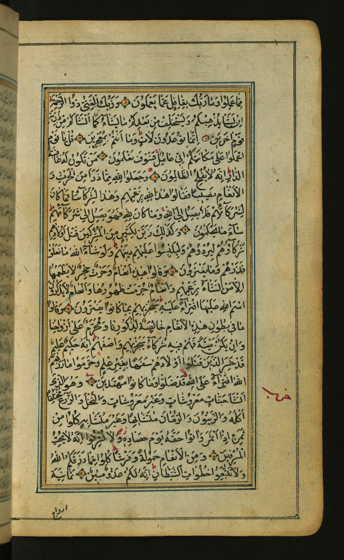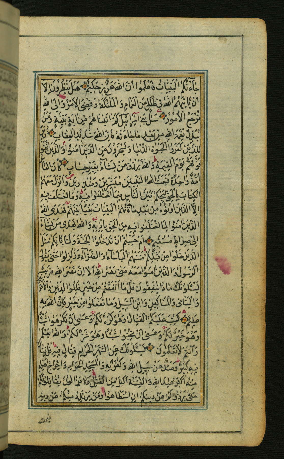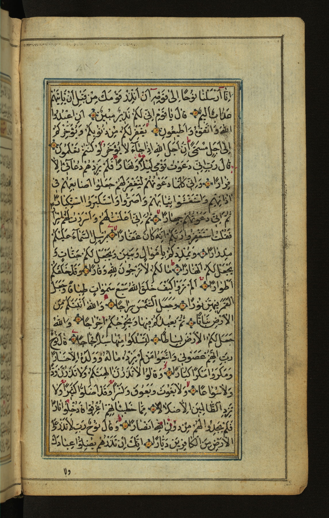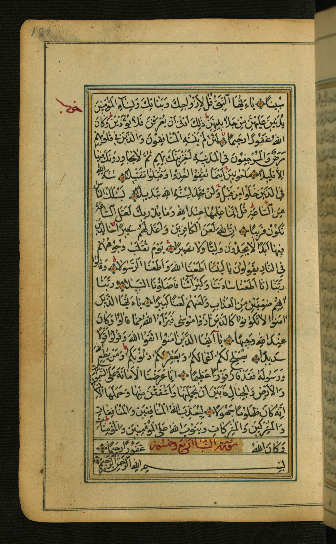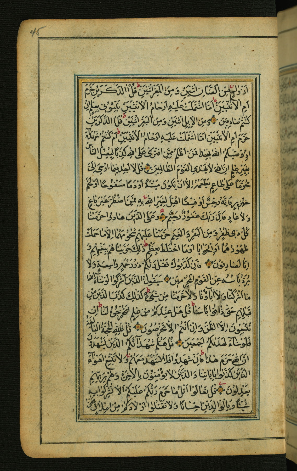 This manuscript is a small illuminated single-volume copy of the Qurʾan, likely produced in Iran. A date is inscribed on the final page, which is interpreted as 1230 AH / 1814-5 CE (fol. 186b). The manuscript opens with an illuminated double-page incipit with the verses of chapter 1 (Sūrat al-fātiḥah) and the initial verses of chapter 2 (Sūrat al-baqarah), decorated with interlinear illumination (fols. 1b-2a). The text is in vocalized naskh script in black ink with reading marks in red and text divisions, such as thirty verses (juzʾ) or sixty verses (ḥizb), in the margins. Illuminated discs with colored dots separate the verses. Chapter headings are in riqāʿ script in red ink on a gold ground. The nineteenth-century lacquer binding with a floral composition on a gold field on the upper and lower boards seems to be contemporary with the manuscript. The insides of both boards are painted with a lobed yellow central medallion and pendants on an orange field.
