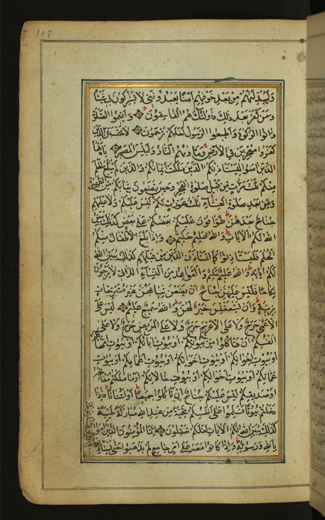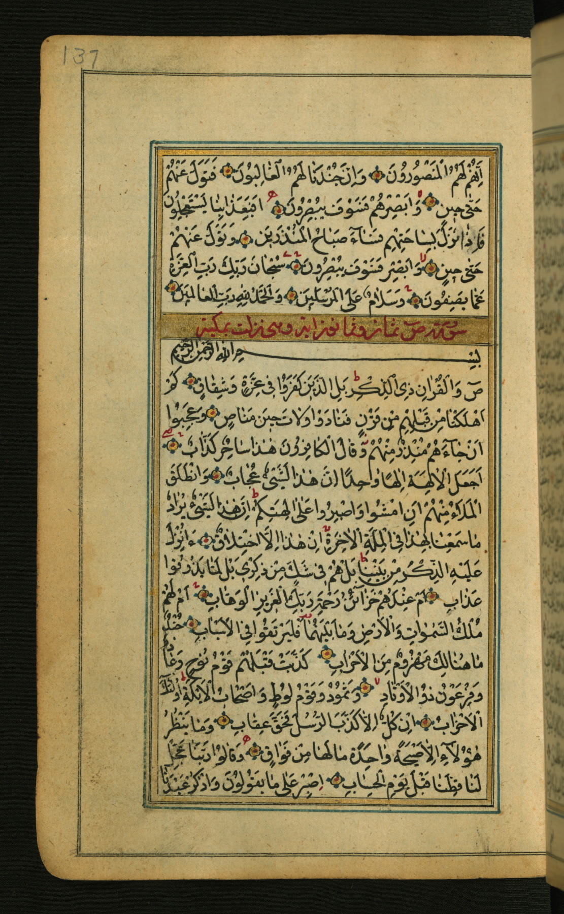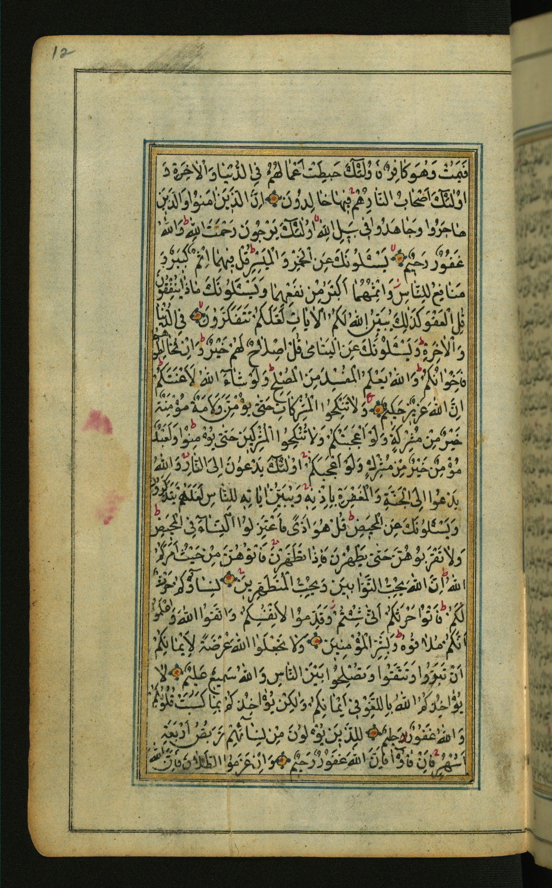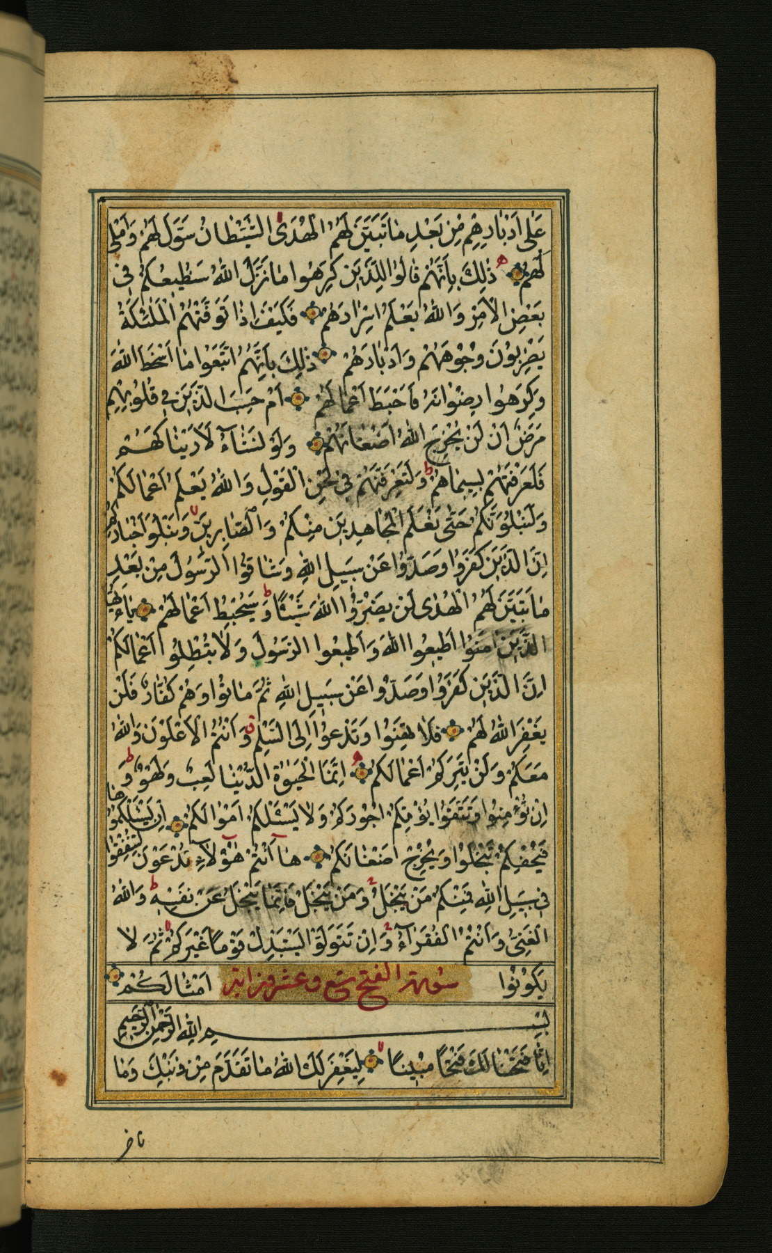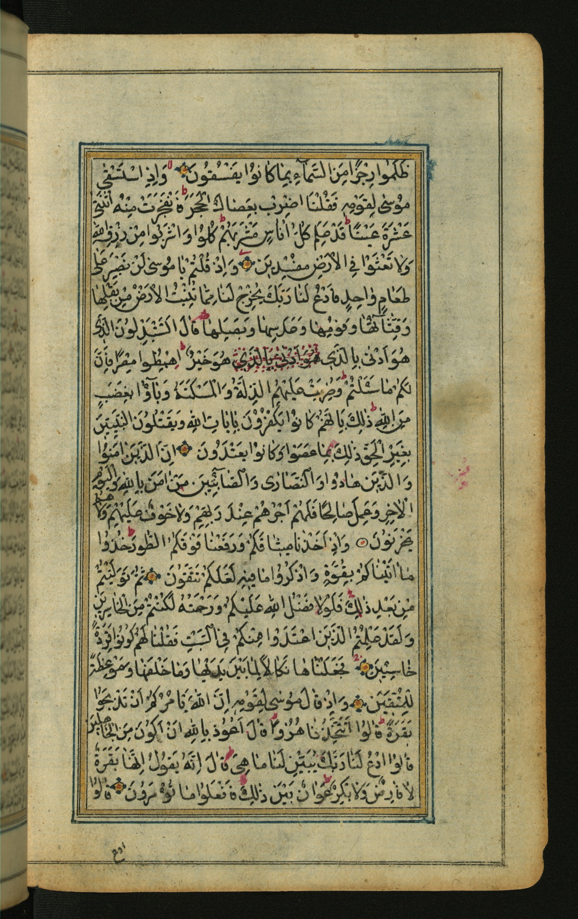 This manuscript is a small illuminated single-volume copy of the Qurʾan, likely produced in Iran. A date is inscribed on the final page, which is interpreted as 1230 AH / 1814-5 CE (fol. 186b). The manuscript opens with an illuminated double-page incipit with the verses of chapter 1 (Sūrat al-fātiḥah) and the initial verses of chapter 2 (Sūrat al-baqarah), decorated with interlinear illumination (fols. 1b-2a). The text is in vocalized naskh script in black ink with reading marks in red and text divisions, such as thirty verses (juzʾ) or sixty verses (ḥizb), in the margins. Illuminated discs with colored dots separate the verses. Chapter headings are in riqāʿ script in red ink on a gold ground. The nineteenth-century lacquer binding with a floral composition on a gold field on the upper and lower boards seems to be contemporary with the manuscript. The insides of both boards are painted with a lobed yellow central medallion and pendants on an orange field.