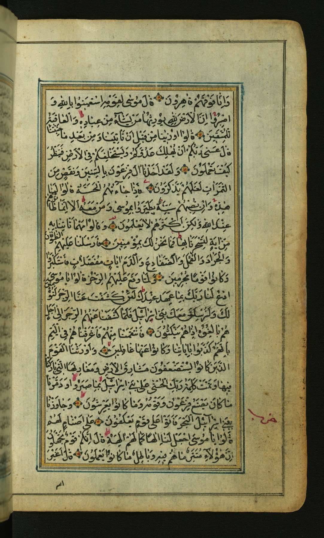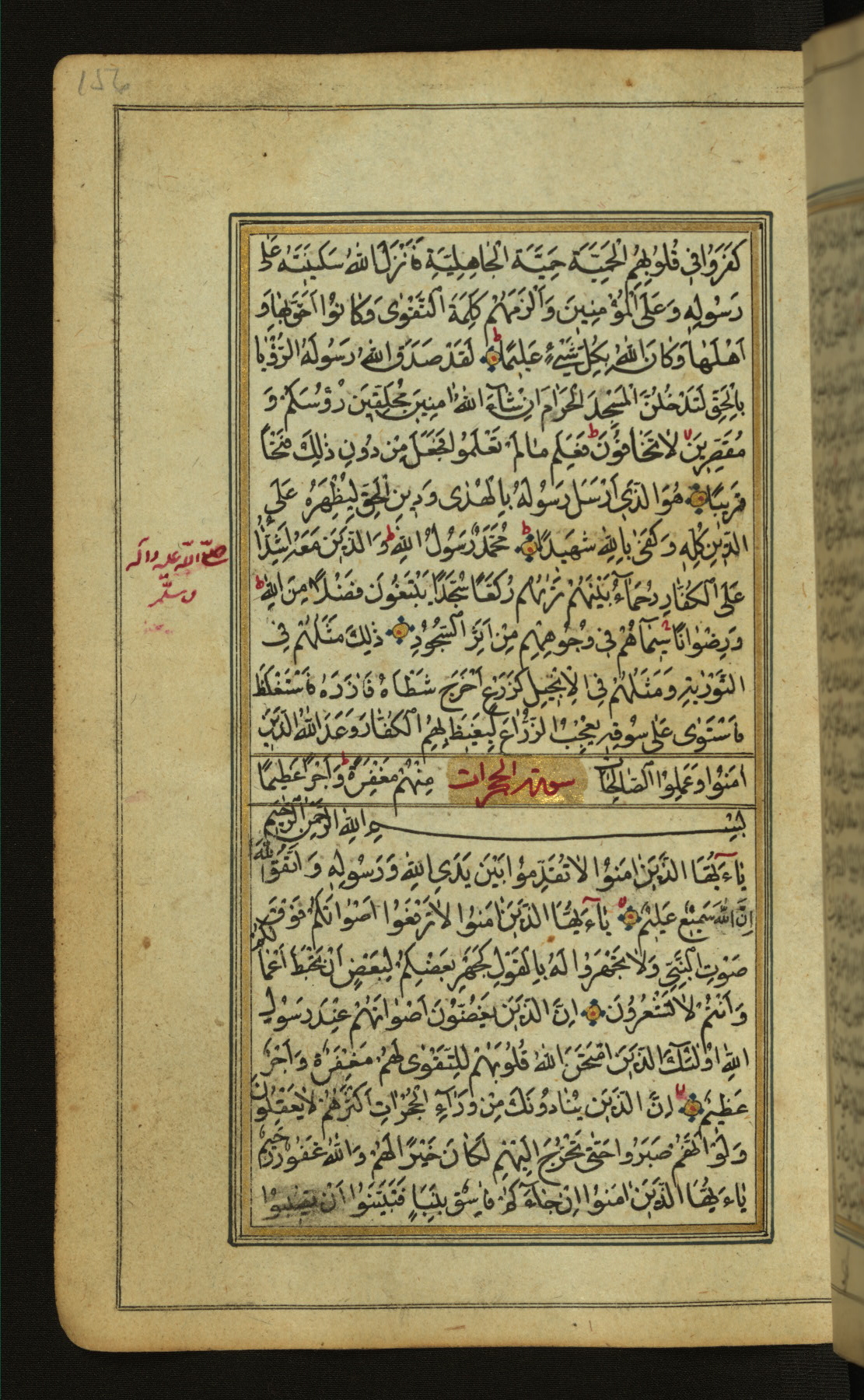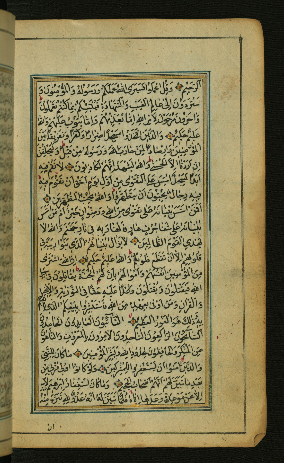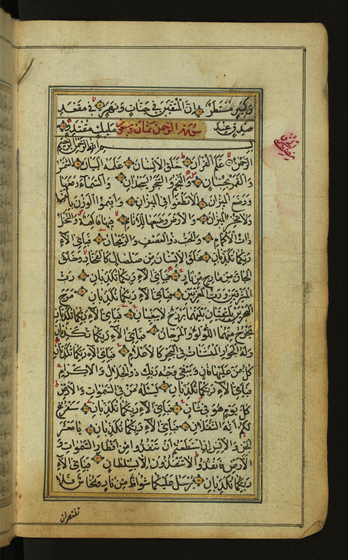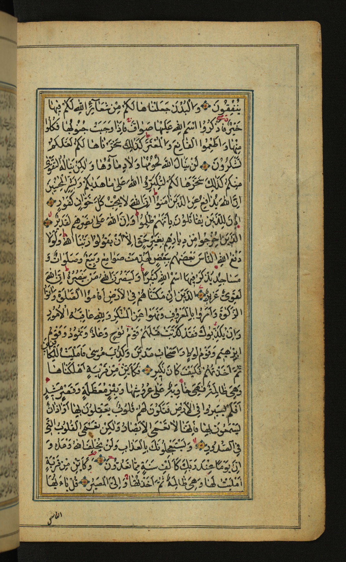 This manuscript is a small illuminated single-volume copy of the Qurʾan, likely produced in Iran. A date is inscribed on the final page, which is interpreted as 1230 AH / 1814-5 CE (fol. 186b). The manuscript opens with an illuminated double-page incipit with the verses of chapter 1 (Sūrat al-fātiḥah) and the initial verses of chapter 2 (Sūrat al-baqarah), decorated with interlinear illumination (fols. 1b-2a). The text is in vocalized naskh script in black ink with reading marks in red and text divisions, such as thirty verses (juzʾ) or sixty verses (ḥizb), in the margins. Illuminated discs with colored dots separate the verses. Chapter headings are in riqāʿ script in red ink on a gold ground. The nineteenth-century lacquer binding with a floral composition on a gold field on the upper and lower boards seems to be contemporary with the manuscript. The insides of both boards are painted with a lobed yellow central medallion and pendants on an orange field.