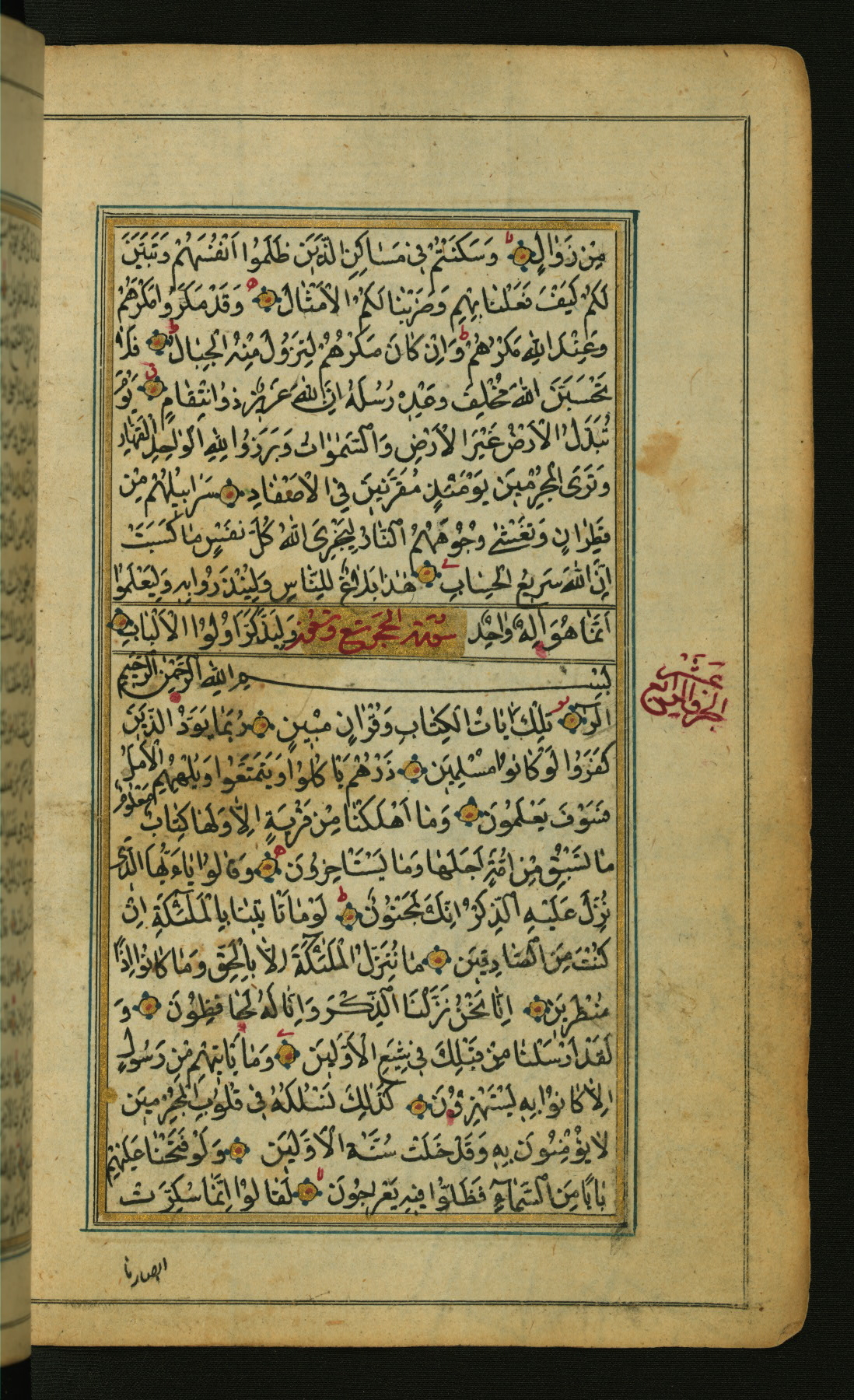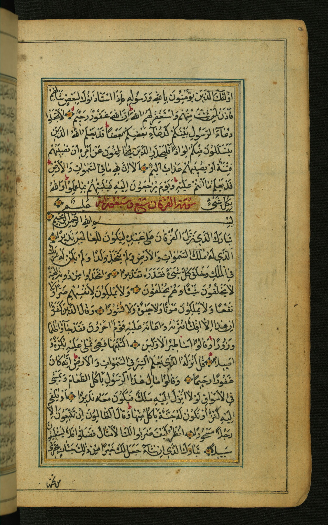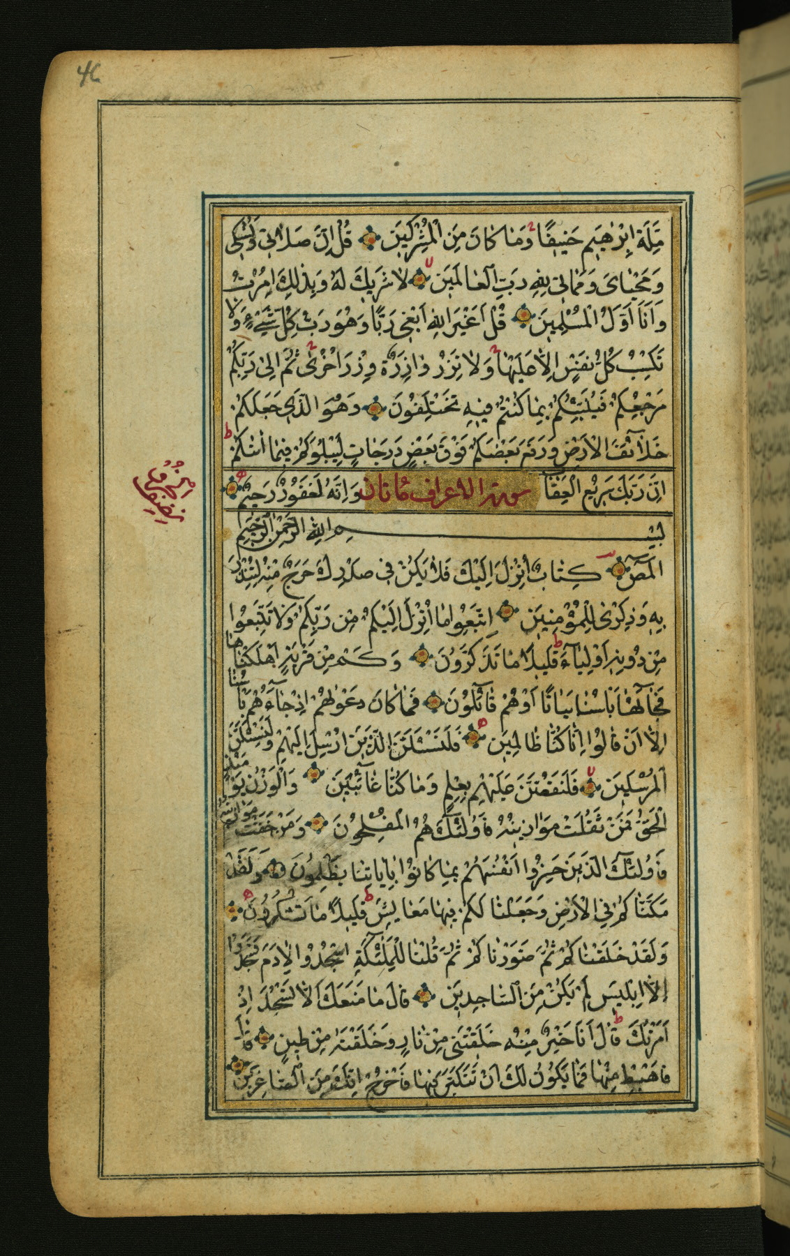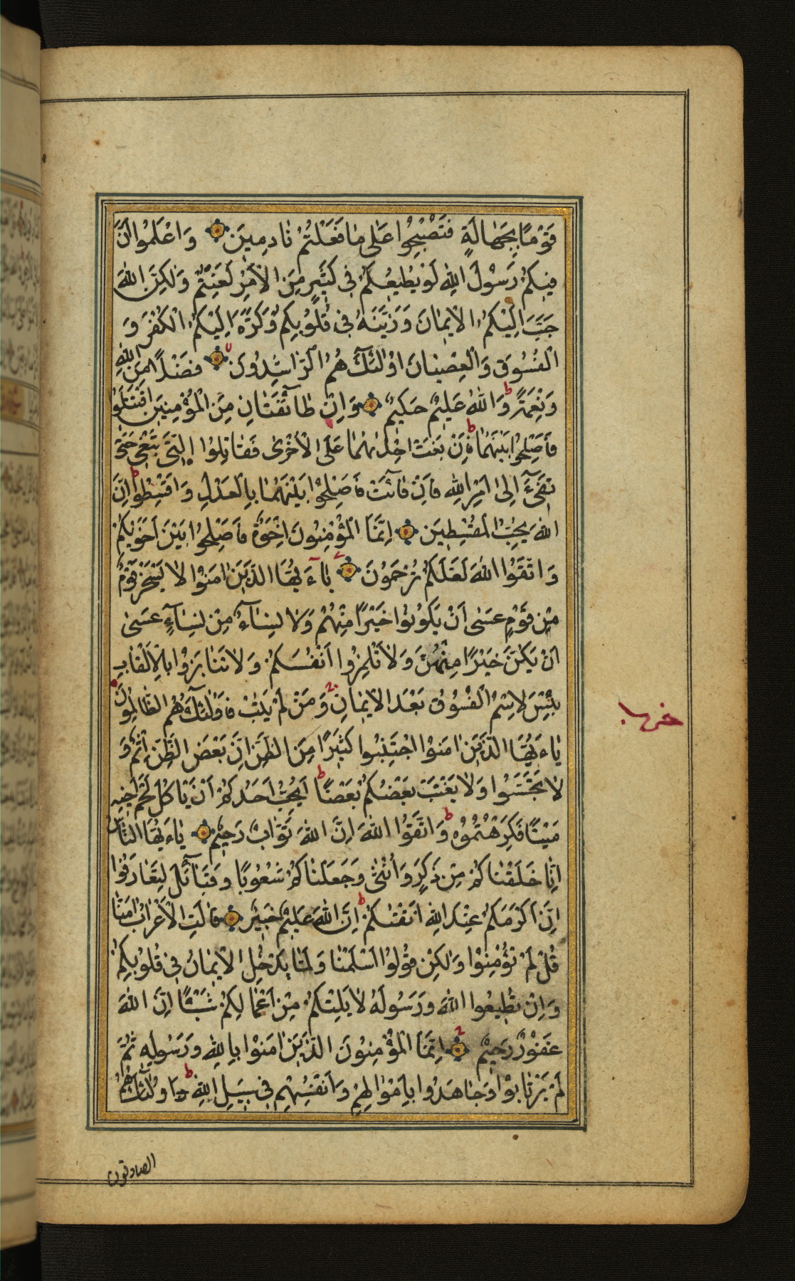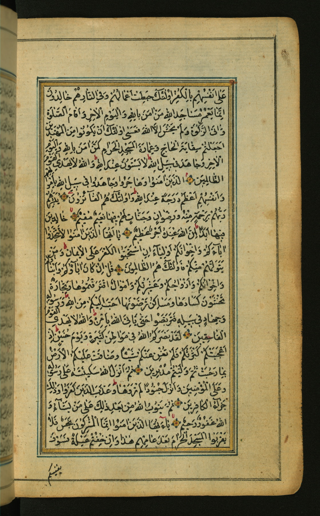 This manuscript is a small illuminated single-volume copy of the Qurʾan, likely produced in Iran. A date is inscribed on the final page, which is interpreted as 1230 AH / 1814-5 CE (fol. 186b). The manuscript opens with an illuminated double-page incipit with the verses of chapter 1 (Sūrat al-fātiḥah) and the initial verses of chapter 2 (Sūrat al-baqarah), decorated with interlinear illumination (fols. 1b-2a). The text is in vocalized naskh script in black ink with reading marks in red and text divisions, such as thirty verses (juzʾ) or sixty verses (ḥizb), in the margins. Illuminated discs with colored dots separate the verses. Chapter headings are in riqāʿ script in red ink on a gold ground. The nineteenth-century lacquer binding with a floral composition on a gold field on the upper and lower boards seems to be contemporary with the manuscript. The insides of both boards are painted with a lobed yellow central medallion and pendants on an orange field.