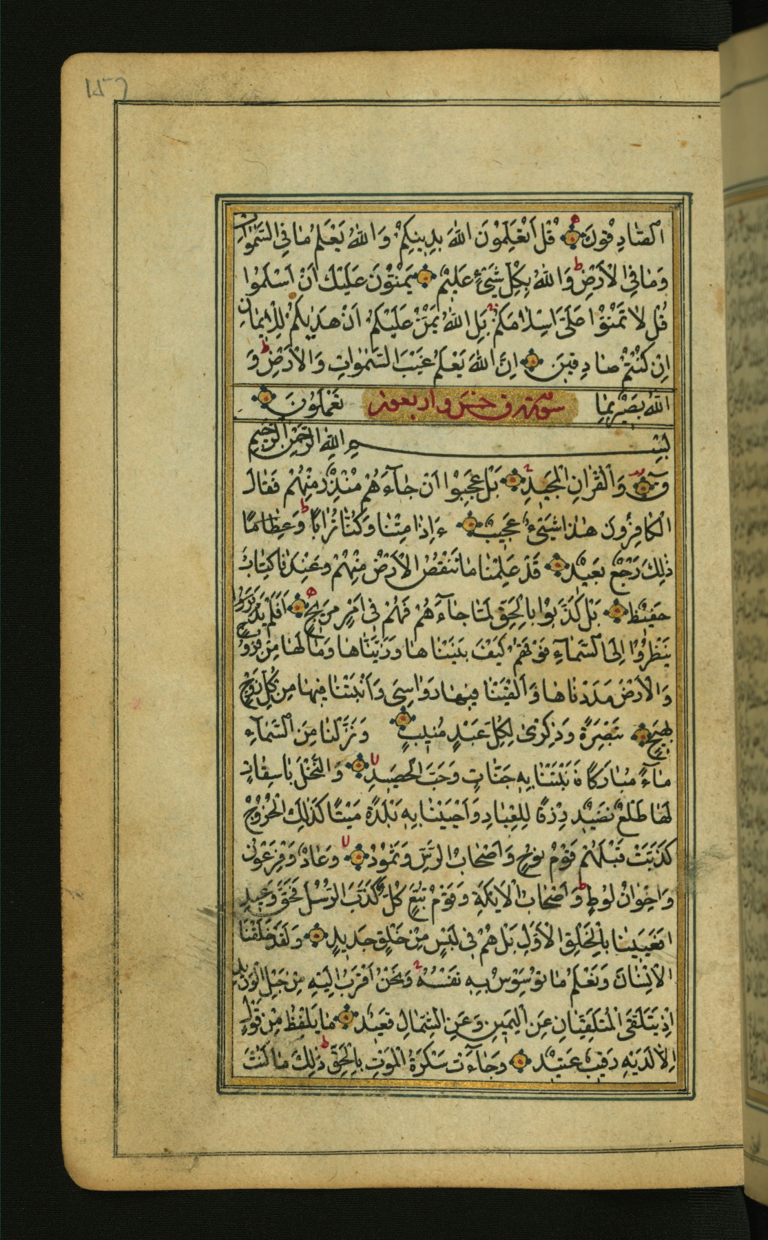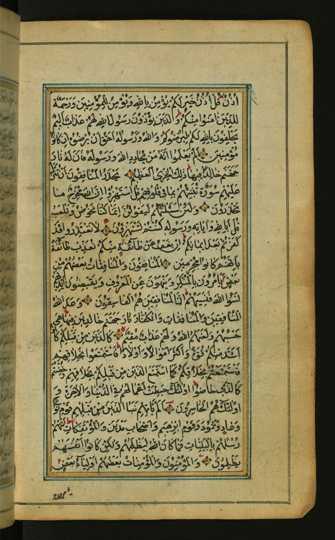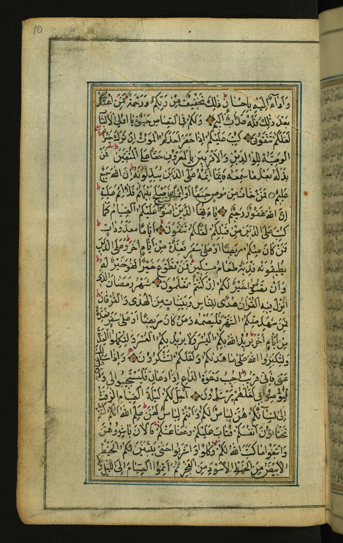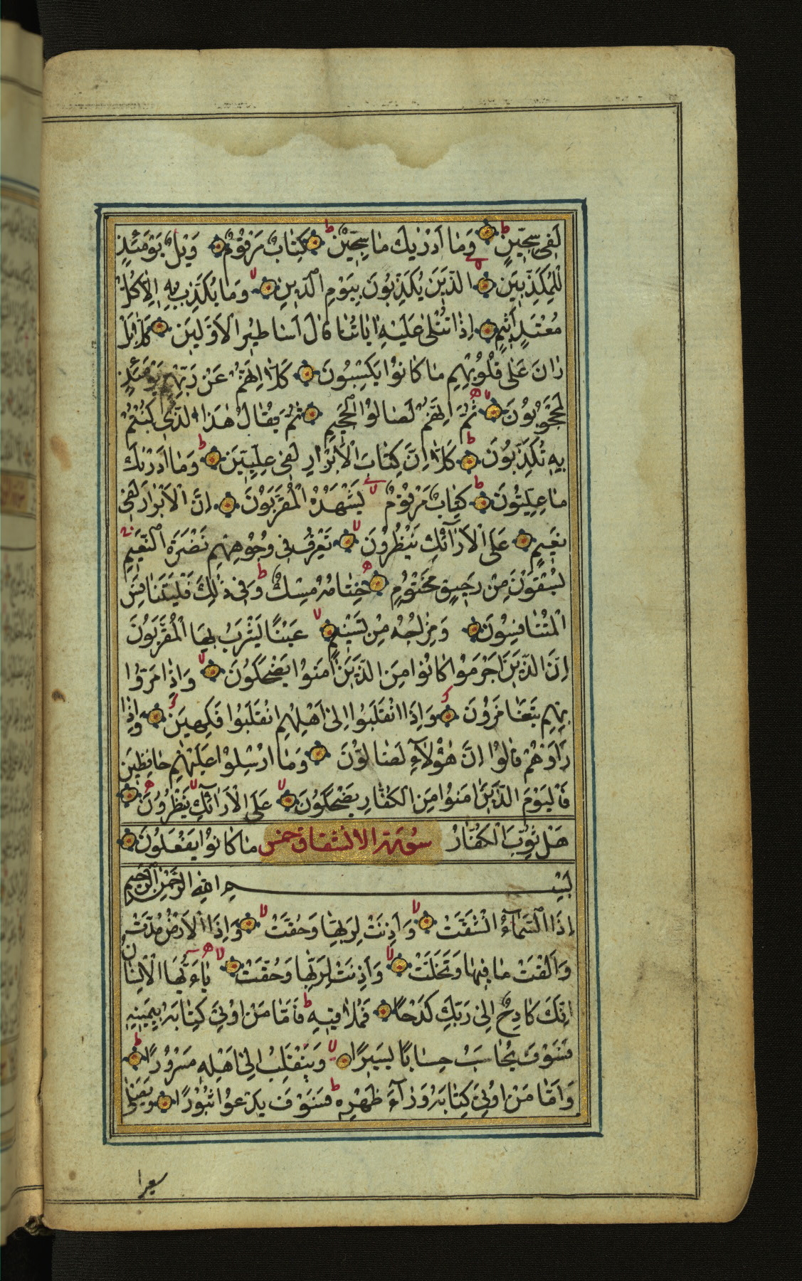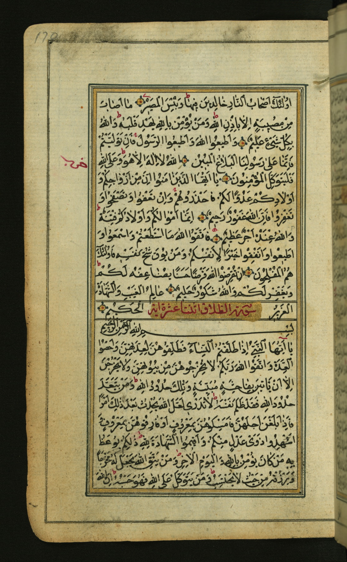 This manuscript is a small illuminated single-volume copy of the Qurʾan, likely produced in Iran. A date is inscribed on the final page, which is interpreted as 1230 AH / 1814-5 CE (fol. 186b). The manuscript opens with an illuminated double-page incipit with the verses of chapter 1 (Sūrat al-fātiḥah) and the initial verses of chapter 2 (Sūrat al-baqarah), decorated with interlinear illumination (fols. 1b-2a). The text is in vocalized naskh script in black ink with reading marks in red and text divisions, such as thirty verses (juzʾ) or sixty verses (ḥizb), in the margins. Illuminated discs with colored dots separate the verses. Chapter headings are in riqāʿ script in red ink on a gold ground. The nineteenth-century lacquer binding with a floral composition on a gold field on the upper and lower boards seems to be contemporary with the manuscript. The insides of both boards are painted with a lobed yellow central medallion and pendants on an orange field.
