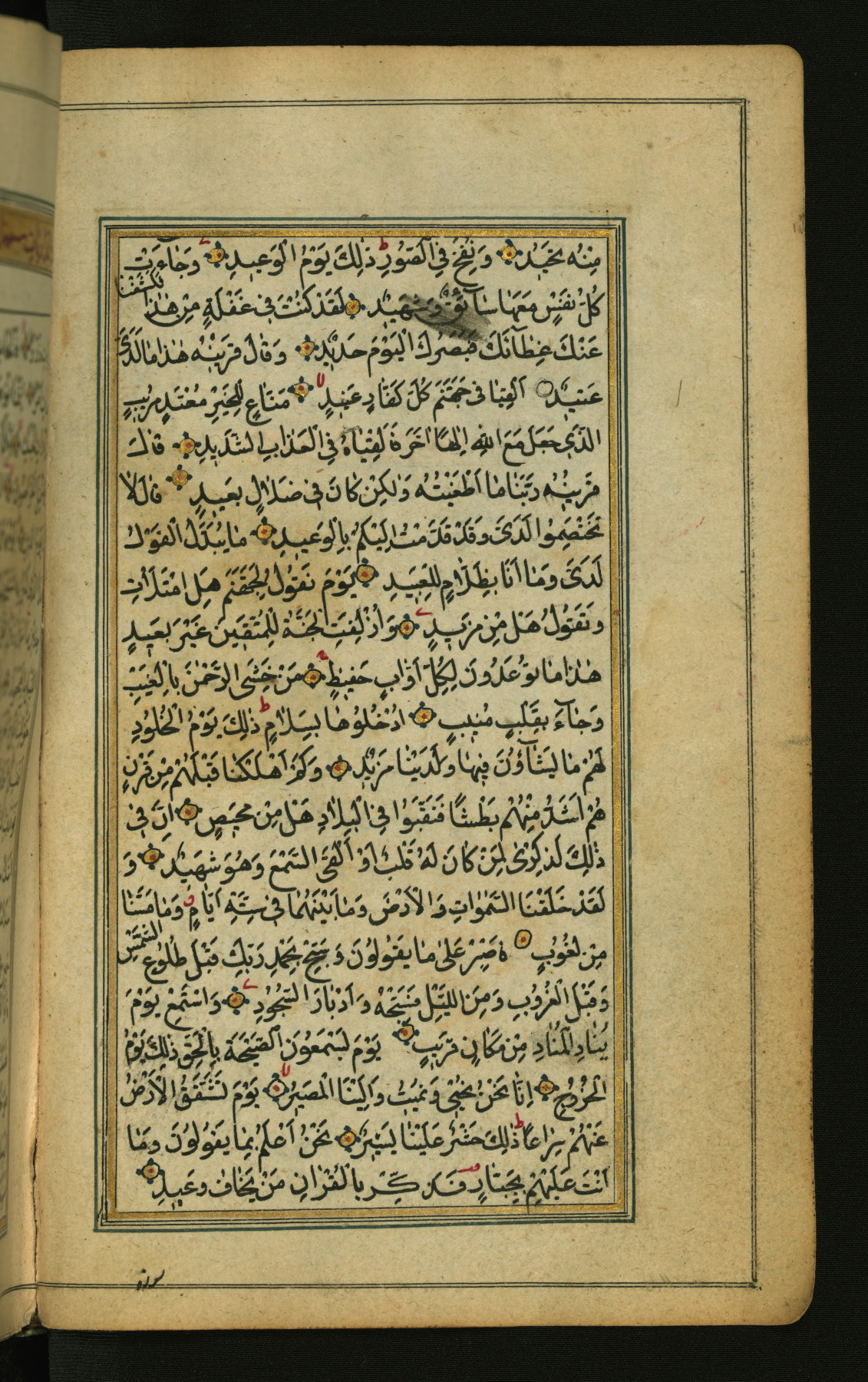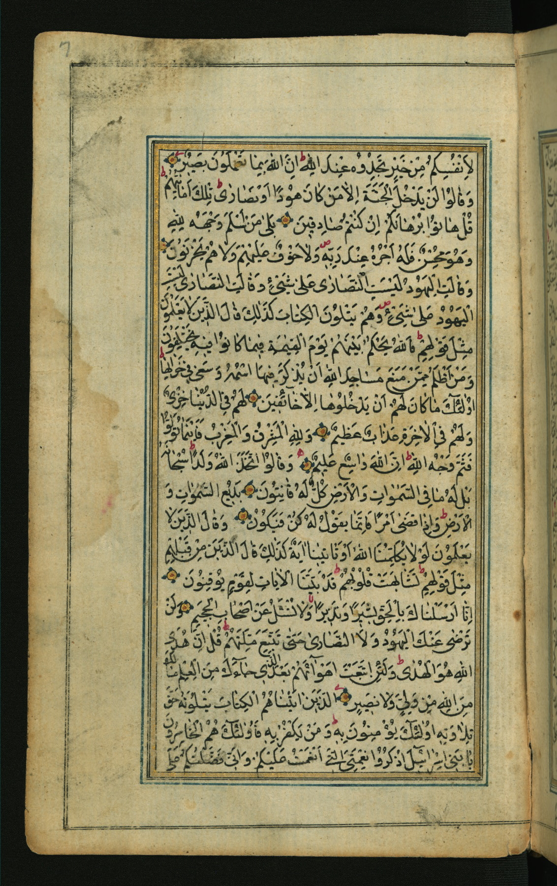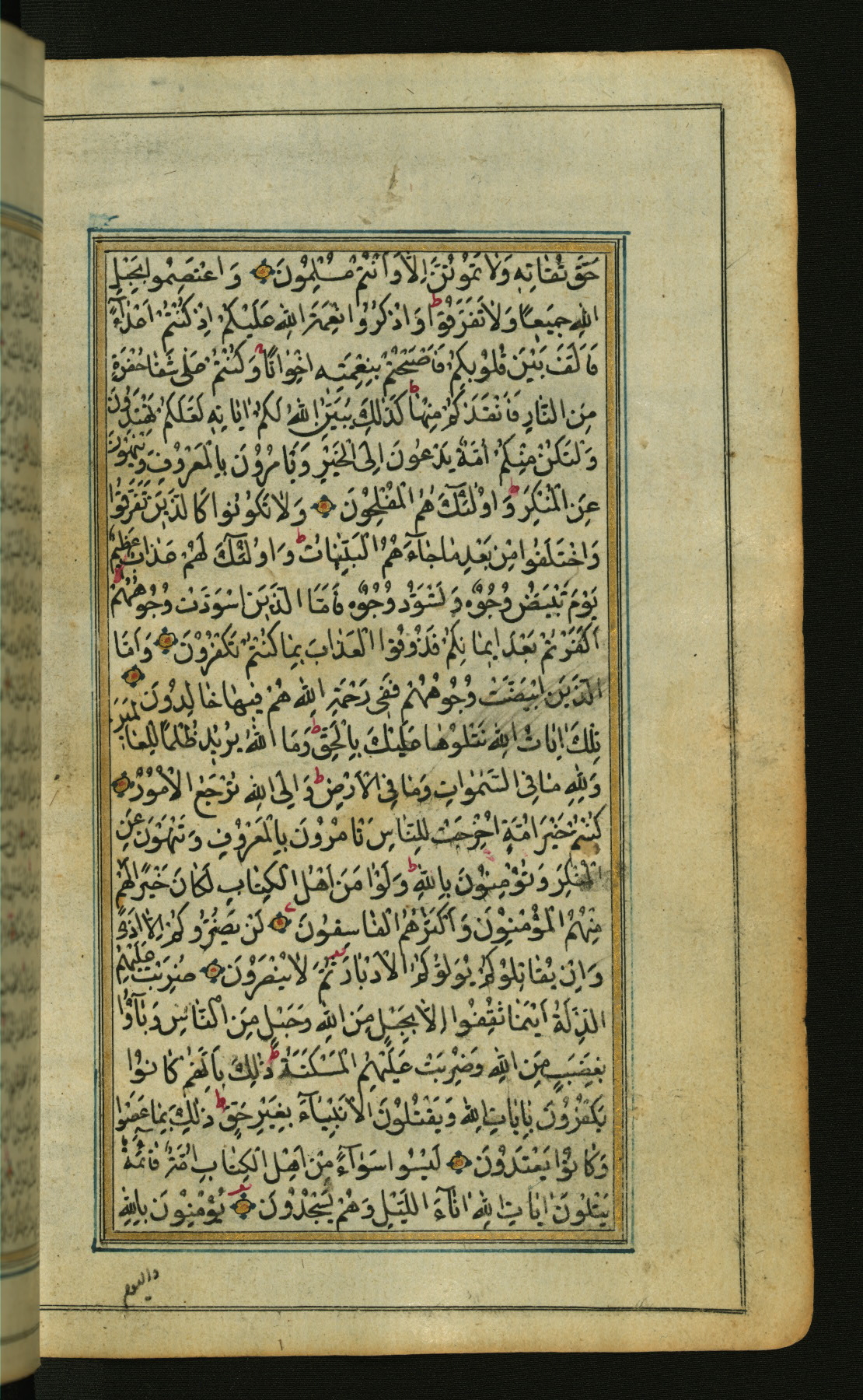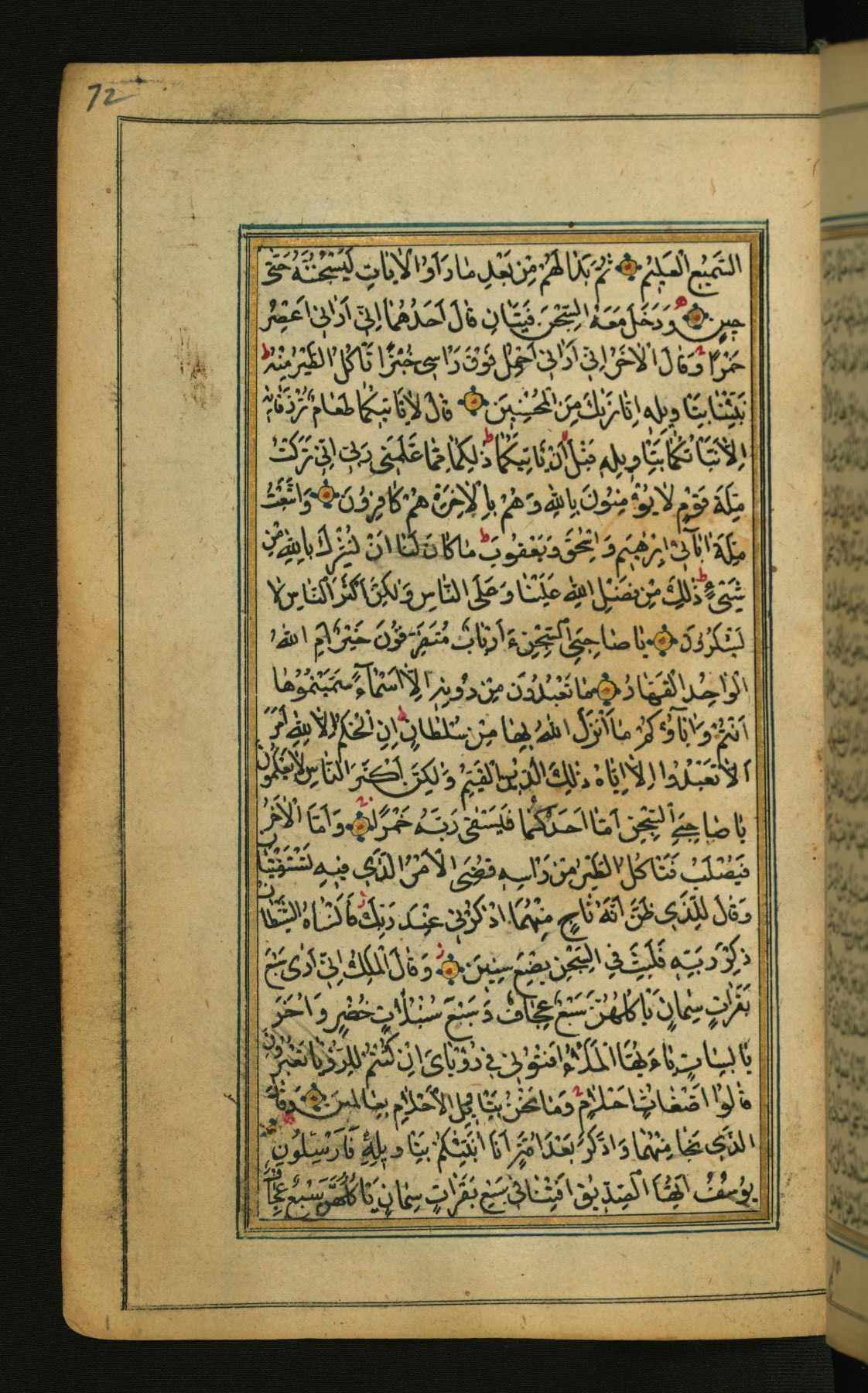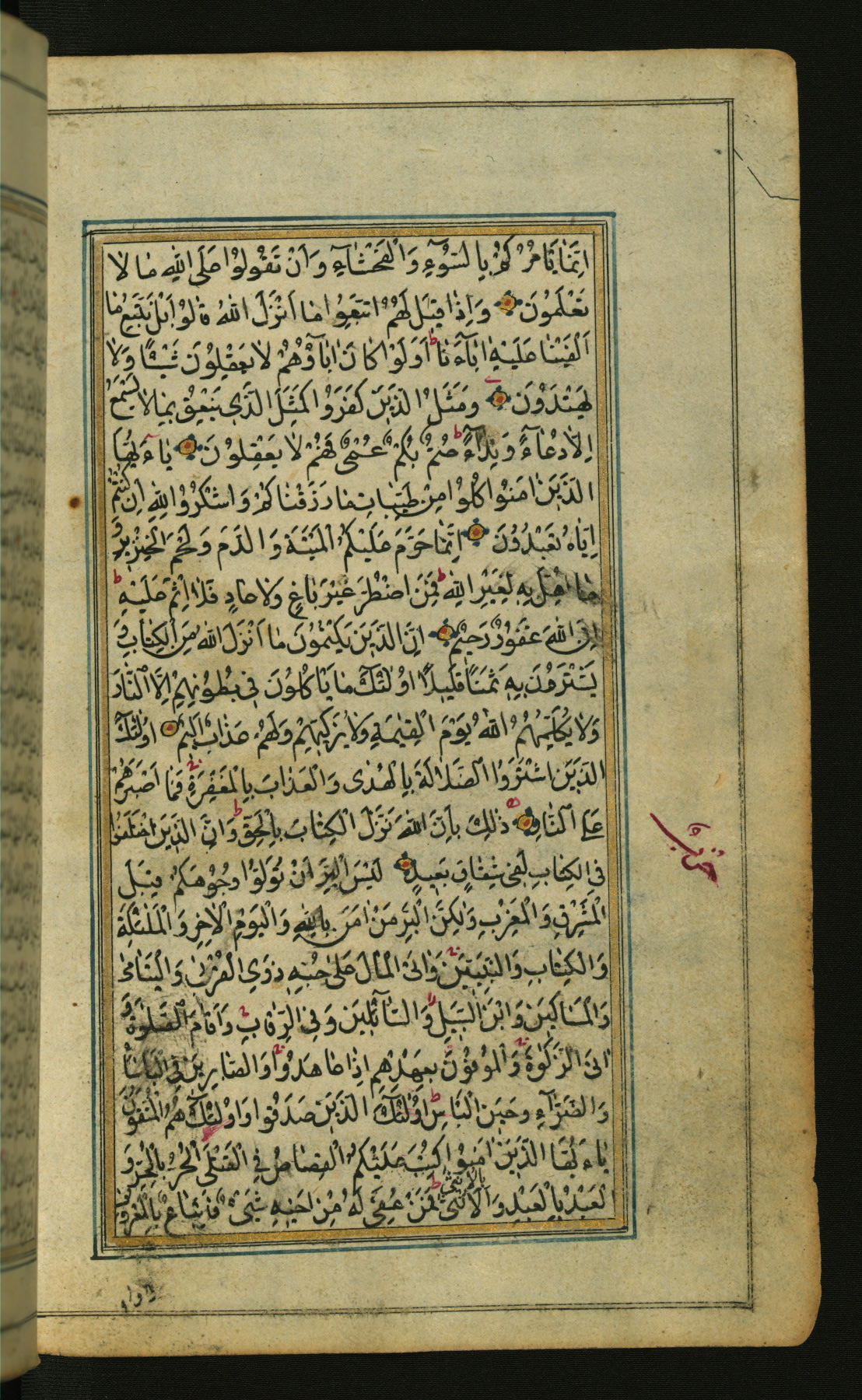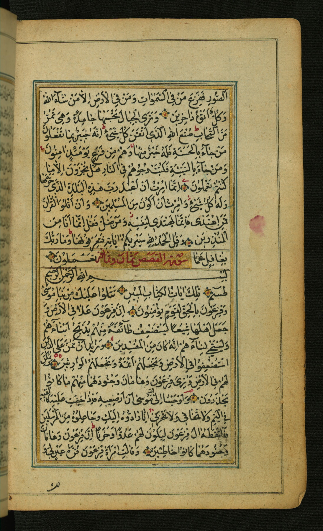 This manuscript is a small illuminated single-volume copy of the Qurʾan, likely produced in Iran. A date is inscribed on the final page, which is interpreted as 1230 AH / 1814-5 CE (fol. 186b). The manuscript opens with an illuminated double-page incipit with the verses of chapter 1 (Sūrat al-fātiḥah) and the initial verses of chapter 2 (Sūrat al-baqarah), decorated with interlinear illumination (fols. 1b-2a). The text is in vocalized naskh script in black ink with reading marks in red and text divisions, such as thirty verses (juzʾ) or sixty verses (ḥizb), in the margins. Illuminated discs with colored dots separate the verses. Chapter headings are in riqāʿ script in red ink on a gold ground. The nineteenth-century lacquer binding with a floral composition on a gold field on the upper and lower boards seems to be contemporary with the manuscript. The insides of both boards are painted with a lobed yellow central medallion and pendants on an orange field.