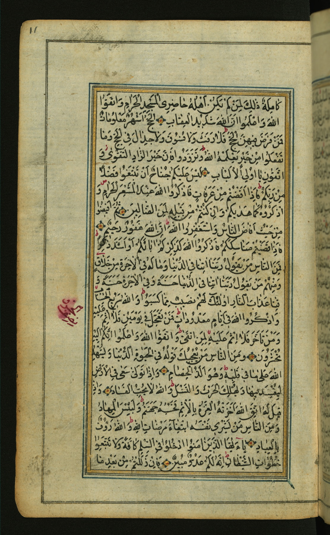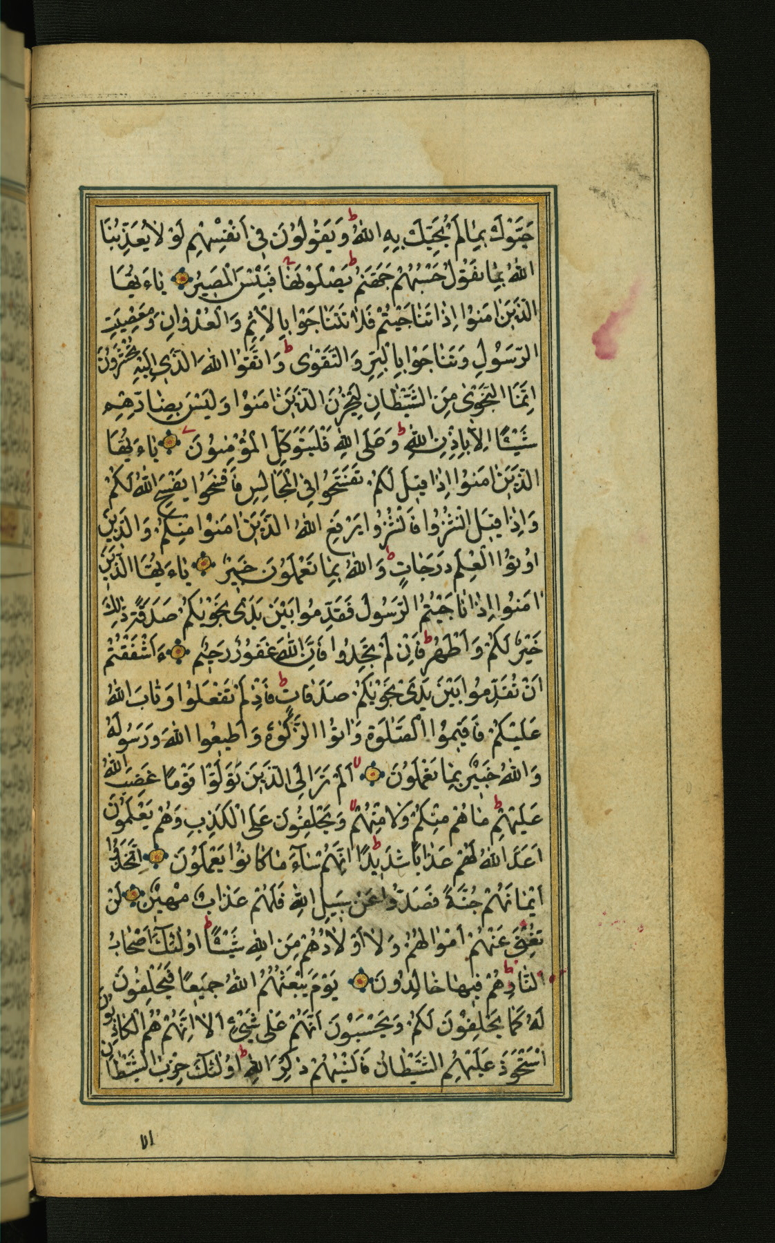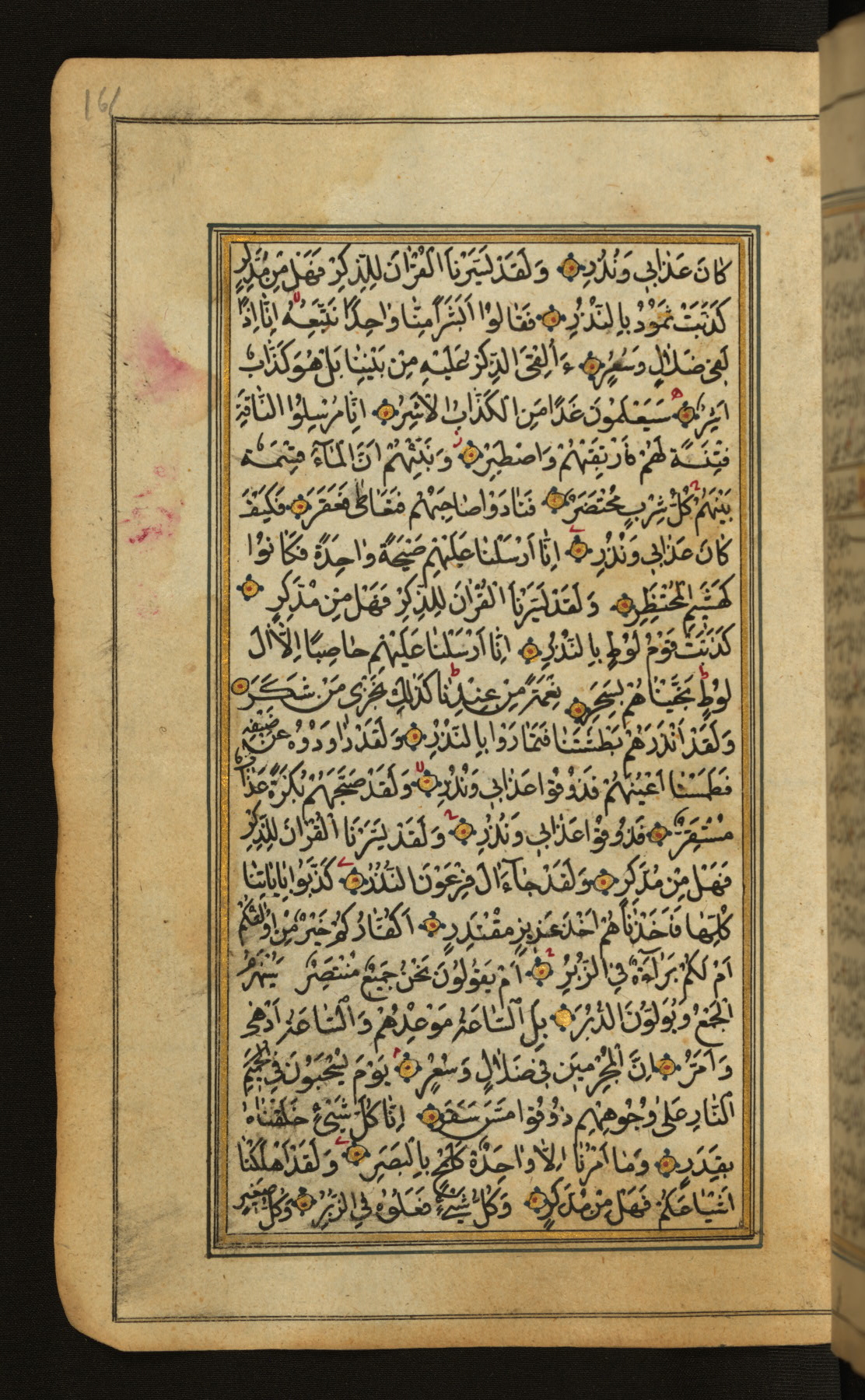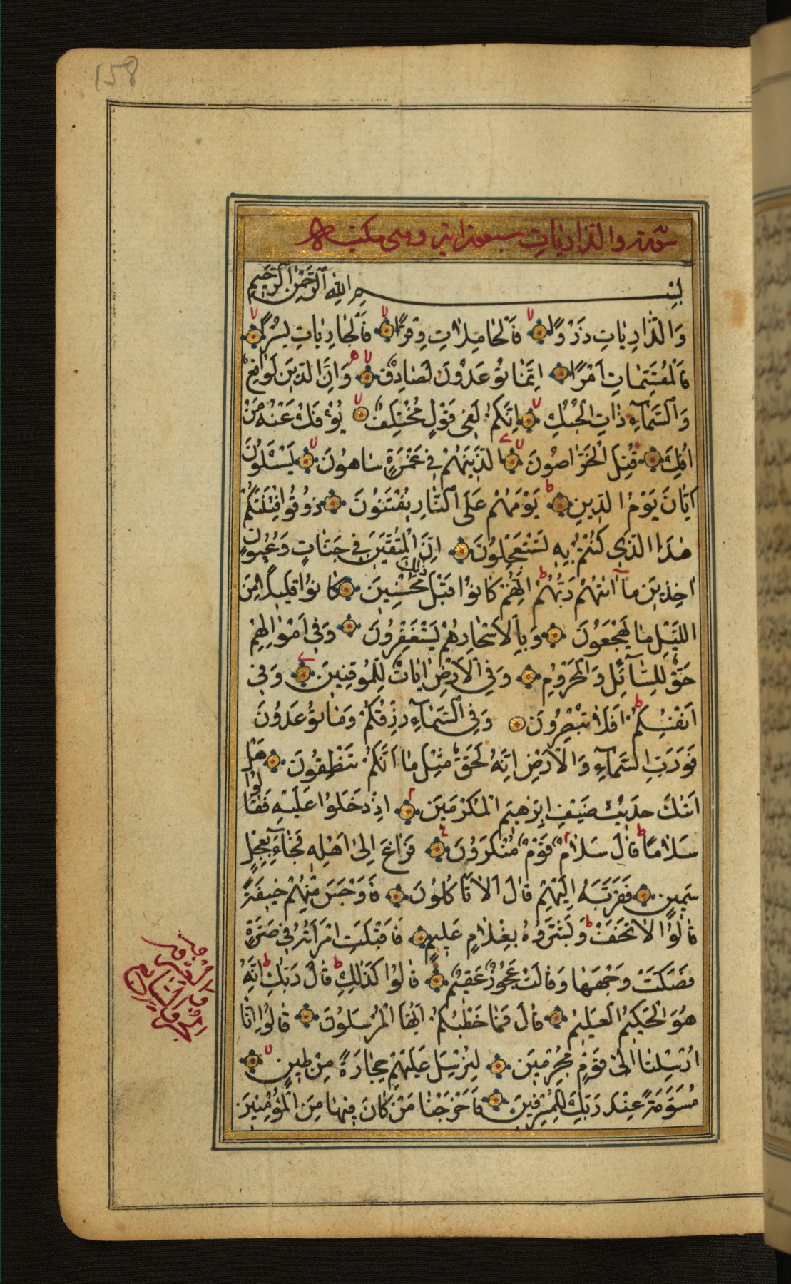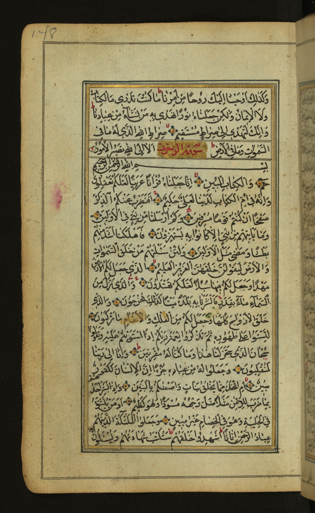 This manuscript is a small illuminated single-volume copy of the Qurʾan, likely produced in Iran. A date is inscribed on the final page, which is interpreted as 1230 AH / 1814-5 CE (fol. 186b). The manuscript opens with an illuminated double-page incipit with the verses of chapter 1 (Sūrat al-fātiḥah) and the initial verses of chapter 2 (Sūrat al-baqarah), decorated with interlinear illumination (fols. 1b-2a). The text is in vocalized naskh script in black ink with reading marks in red and text divisions, such as thirty verses (juzʾ) or sixty verses (ḥizb), in the margins. Illuminated discs with colored dots separate the verses. Chapter headings are in riqāʿ script in red ink on a gold ground. The nineteenth-century lacquer binding with a floral composition on a gold field on the upper and lower boards seems to be contemporary with the manuscript. The insides of both boards are painted with a lobed yellow central medallion and pendants on an orange field.