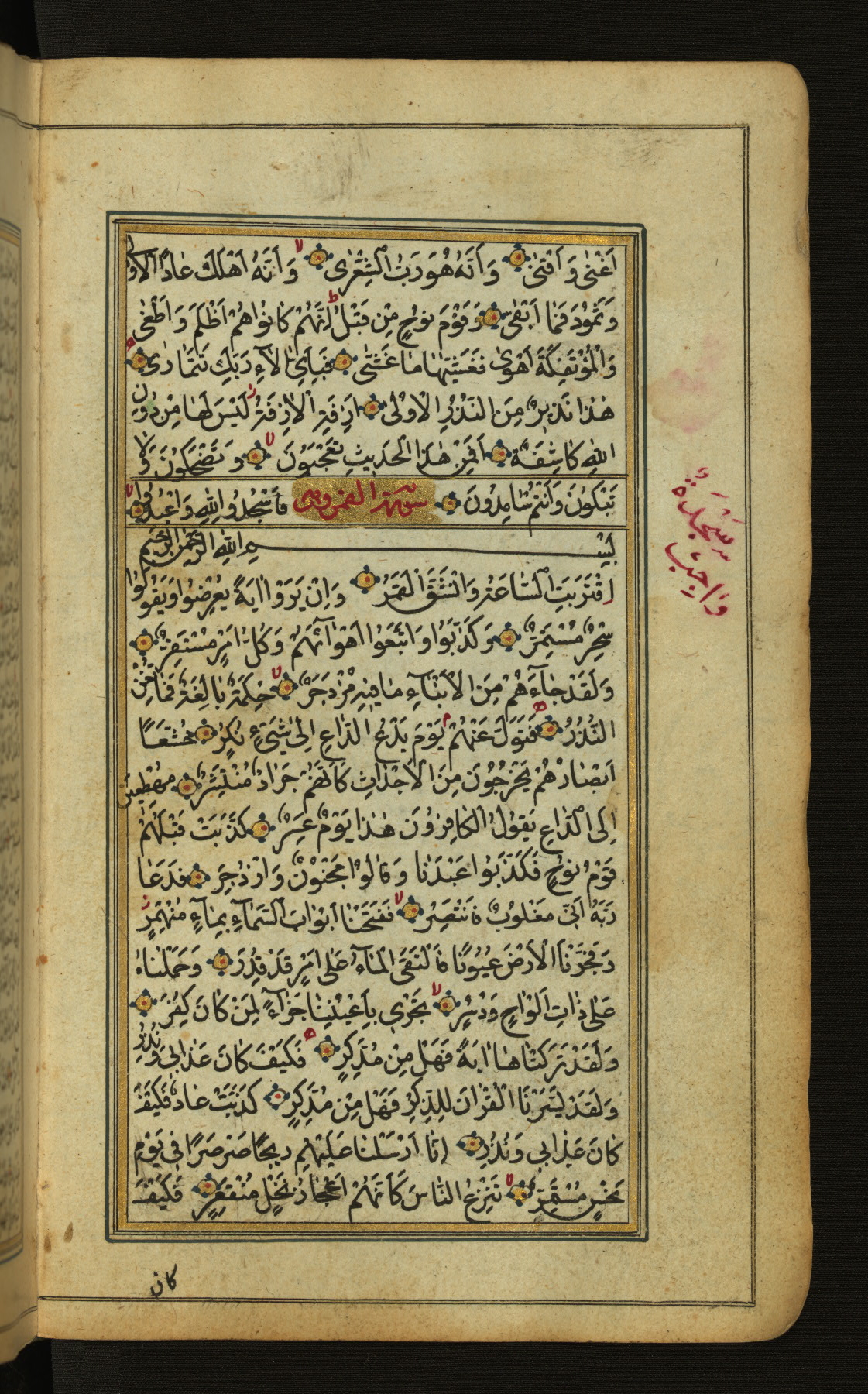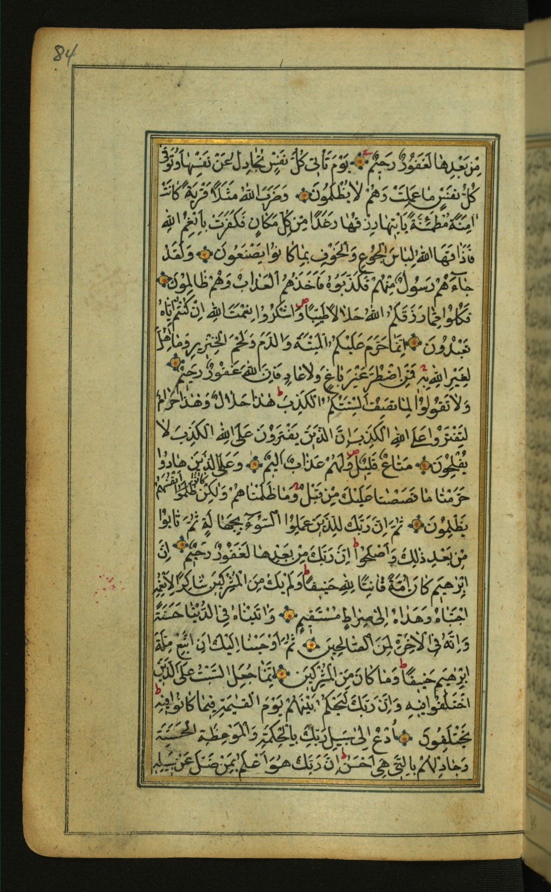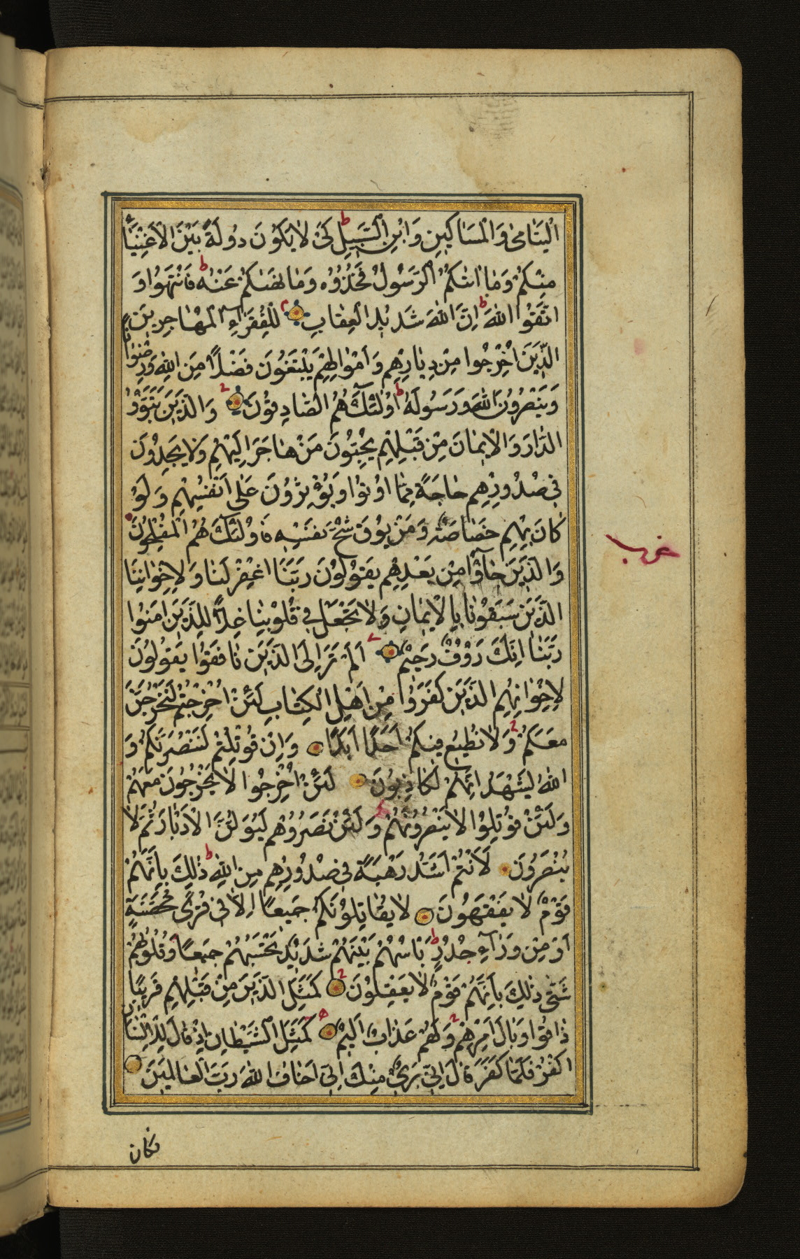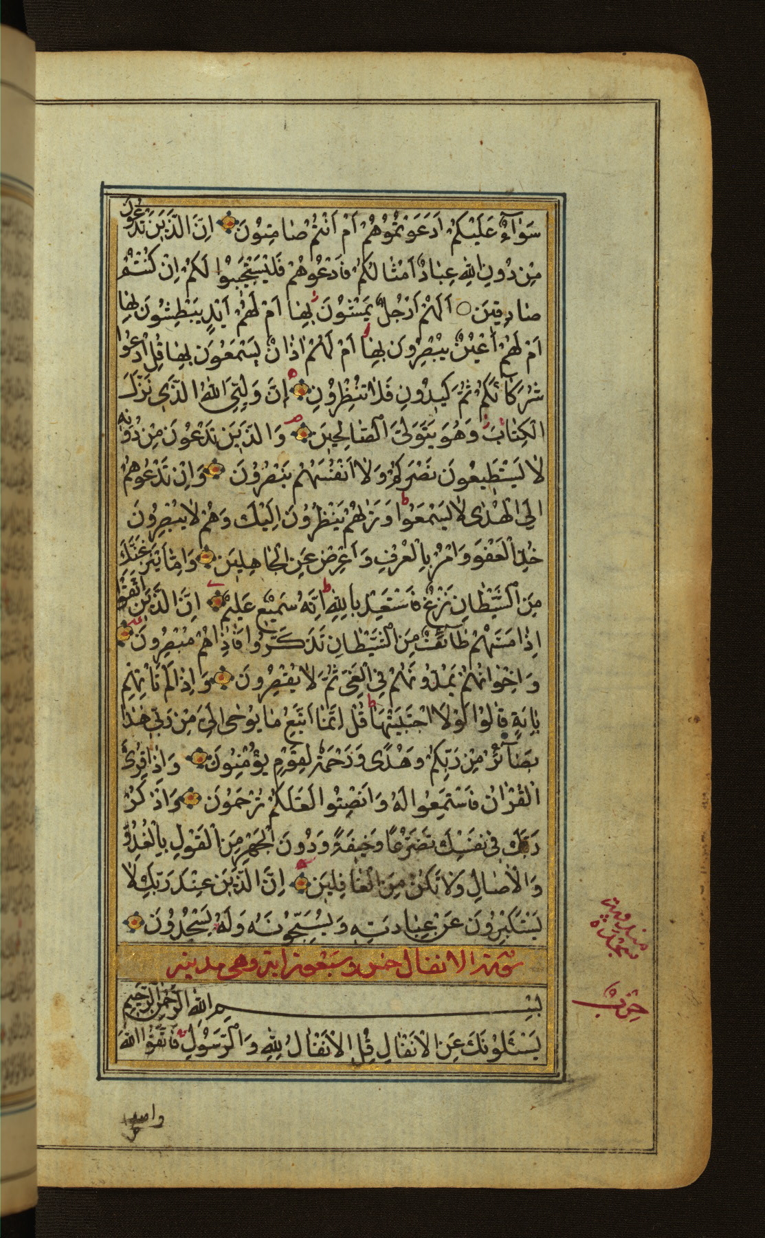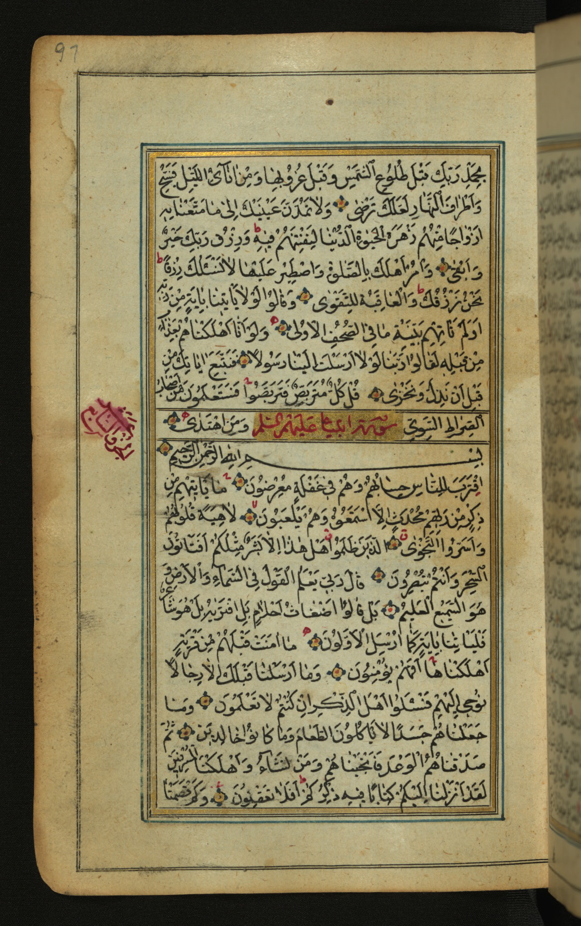 This manuscript is a small illuminated single-volume copy of the Qurʾan, likely produced in Iran. A date is inscribed on the final page, which is interpreted as 1230 AH / 1814-5 CE (fol. 186b). The manuscript opens with an illuminated double-page incipit with the verses of chapter 1 (Sūrat al-fātiḥah) and the initial verses of chapter 2 (Sūrat al-baqarah), decorated with interlinear illumination (fols. 1b-2a). The text is in vocalized naskh script in black ink with reading marks in red and text divisions, such as thirty verses (juzʾ) or sixty verses (ḥizb), in the margins. Illuminated discs with colored dots separate the verses. Chapter headings are in riqāʿ script in red ink on a gold ground. The nineteenth-century lacquer binding with a floral composition on a gold field on the upper and lower boards seems to be contemporary with the manuscript. The insides of both boards are painted with a lobed yellow central medallion and pendants on an orange field.