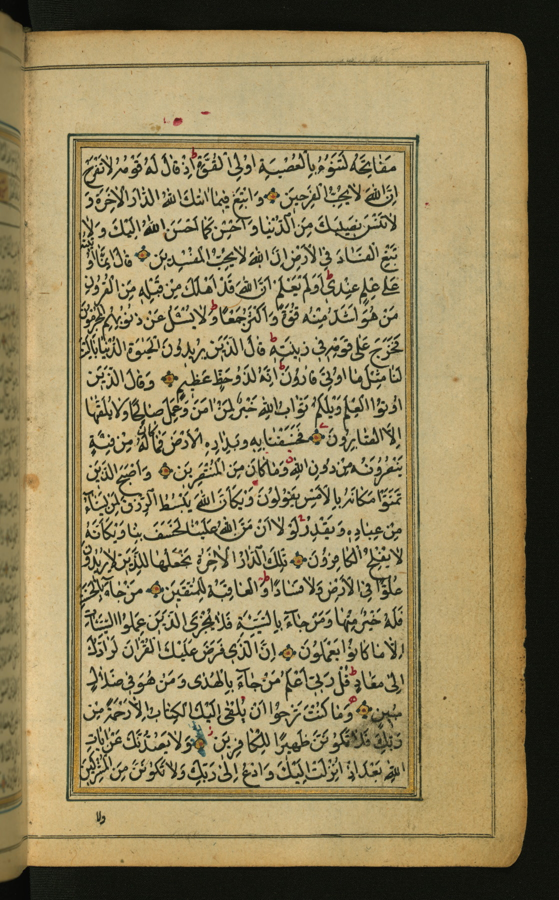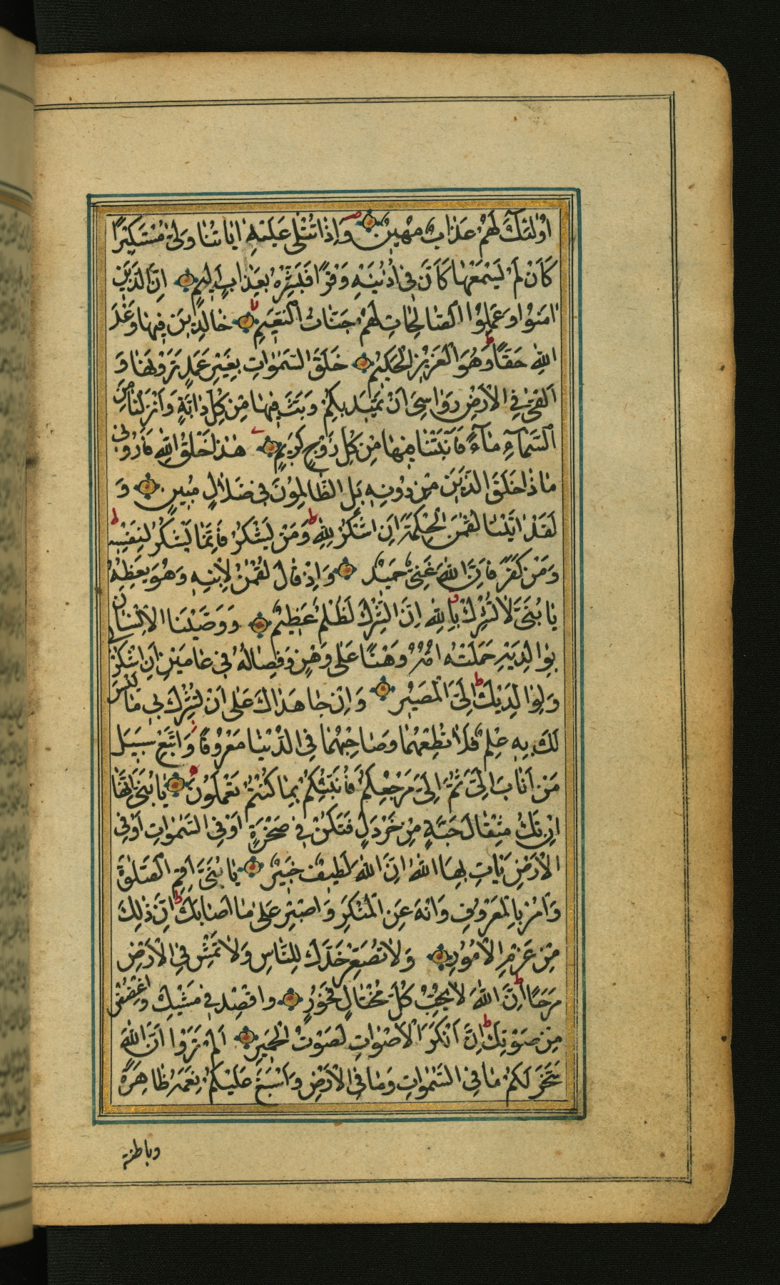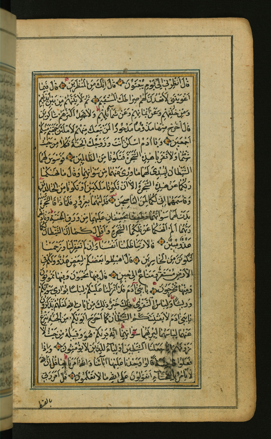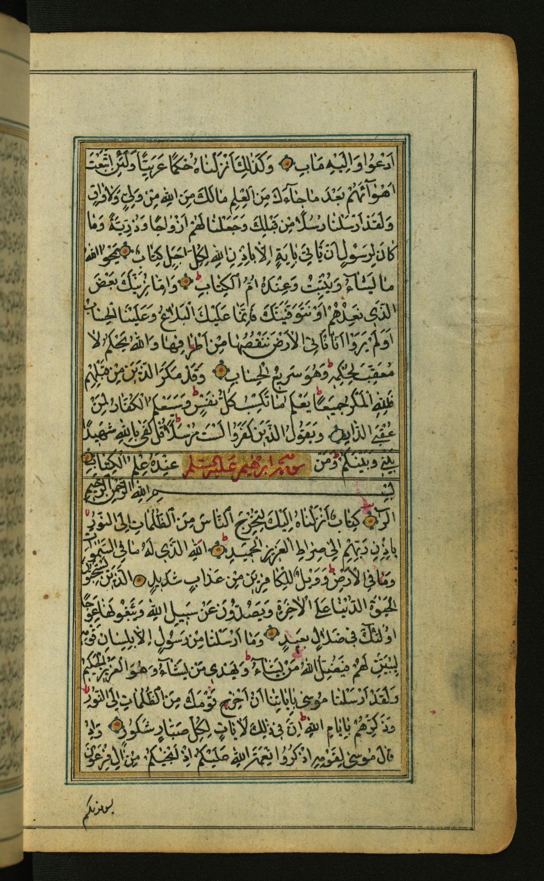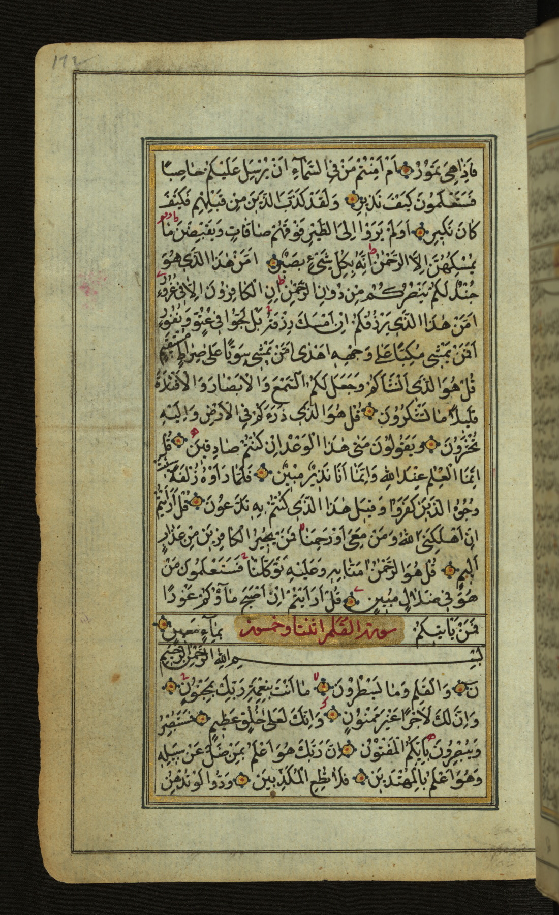 This manuscript is a small illuminated single-volume copy of the Qurʾan, likely produced in Iran. A date is inscribed on the final page, which is interpreted as 1230 AH / 1814-5 CE (fol. 186b). The manuscript opens with an illuminated double-page incipit with the verses of chapter 1 (Sūrat al-fātiḥah) and the initial verses of chapter 2 (Sūrat al-baqarah), decorated with interlinear illumination (fols. 1b-2a). The text is in vocalized naskh script in black ink with reading marks in red and text divisions, such as thirty verses (juzʾ) or sixty verses (ḥizb), in the margins. Illuminated discs with colored dots separate the verses. Chapter headings are in riqāʿ script in red ink on a gold ground. The nineteenth-century lacquer binding with a floral composition on a gold field on the upper and lower boards seems to be contemporary with the manuscript. The insides of both boards are painted with a lobed yellow central medallion and pendants on an orange field.