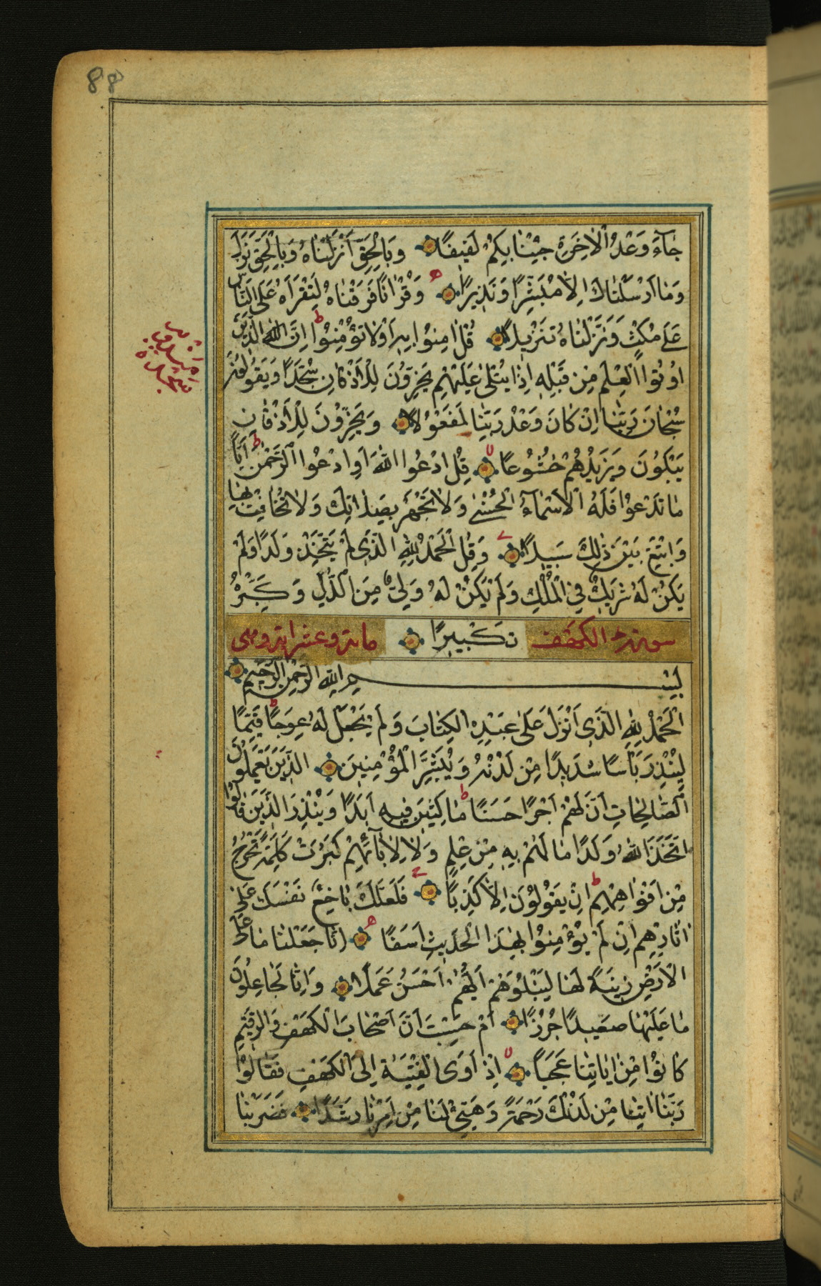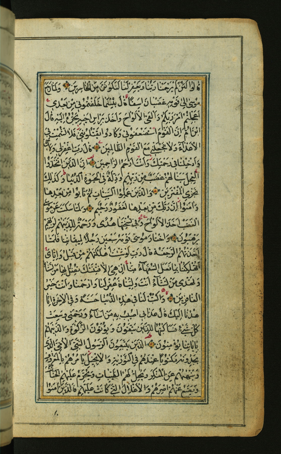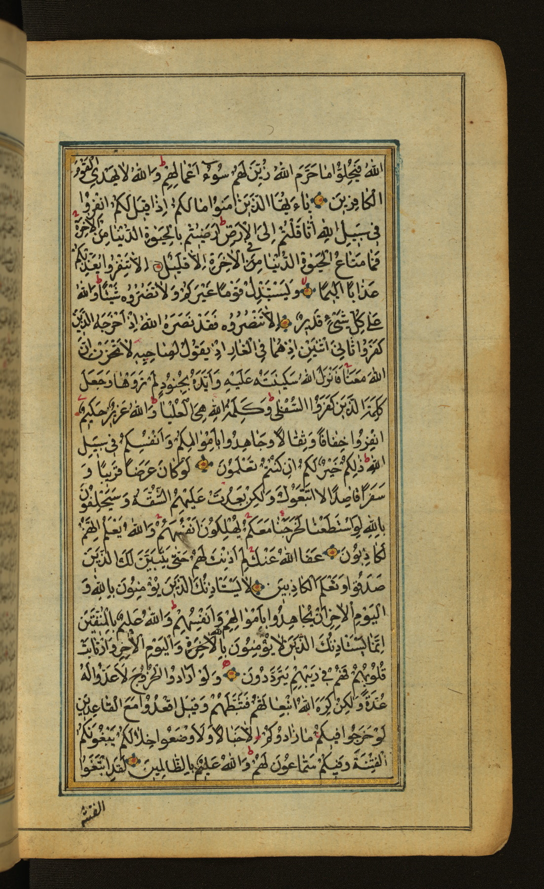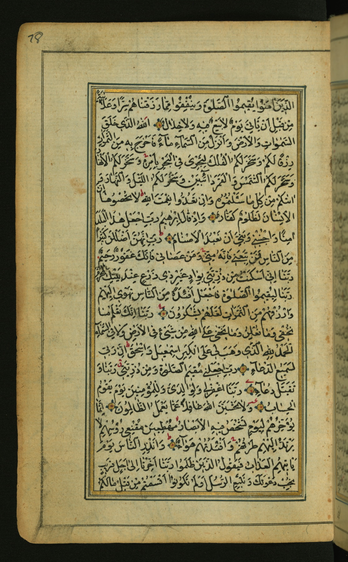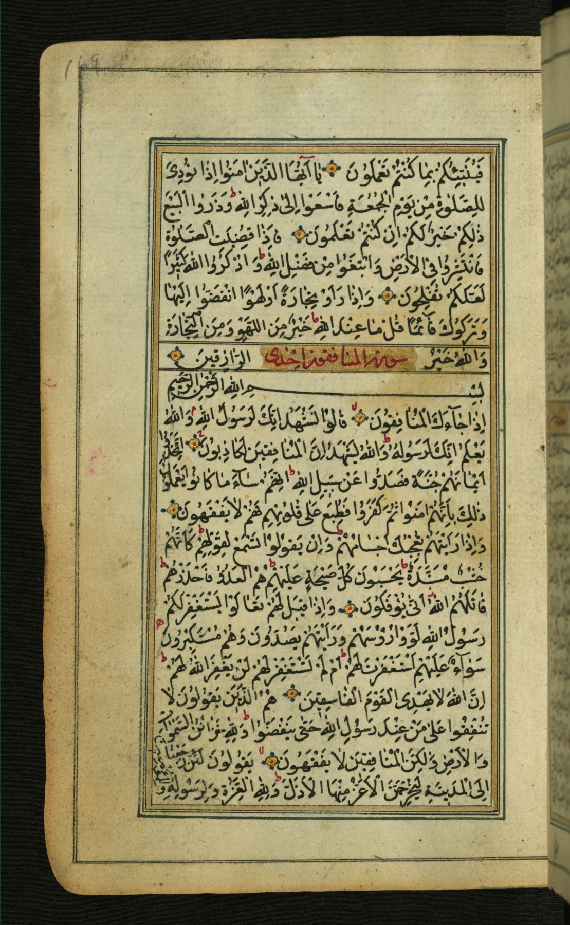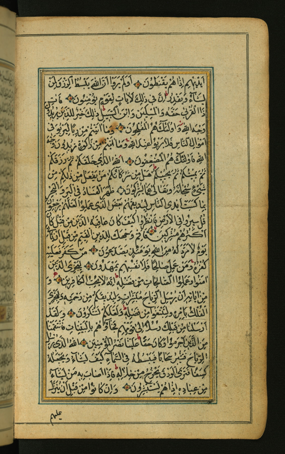 This manuscript is a small illuminated single-volume copy of the Qurʾan, likely produced in Iran. A date is inscribed on the final page, which is interpreted as 1230 AH / 1814-5 CE (fol. 186b). The manuscript opens with an illuminated double-page incipit with the verses of chapter 1 (Sūrat al-fātiḥah) and the initial verses of chapter 2 (Sūrat al-baqarah), decorated with interlinear illumination (fols. 1b-2a). The text is in vocalized naskh script in black ink with reading marks in red and text divisions, such as thirty verses (juzʾ) or sixty verses (ḥizb), in the margins. Illuminated discs with colored dots separate the verses. Chapter headings are in riqāʿ script in red ink on a gold ground. The nineteenth-century lacquer binding with a floral composition on a gold field on the upper and lower boards seems to be contemporary with the manuscript. The insides of both boards are painted with a lobed yellow central medallion and pendants on an orange field.
