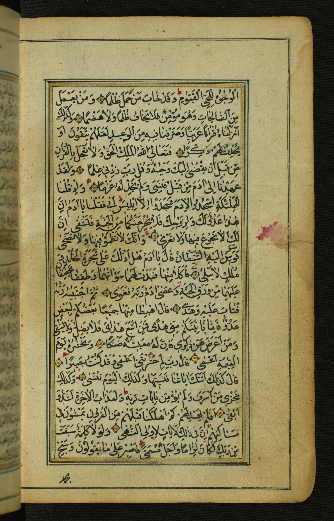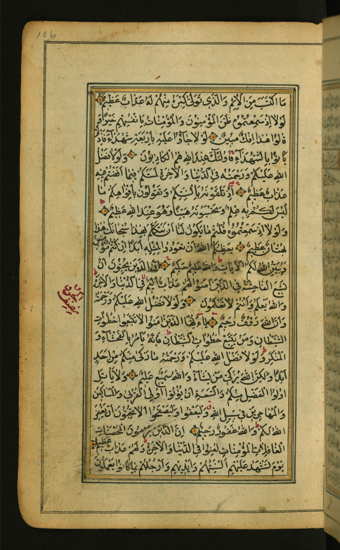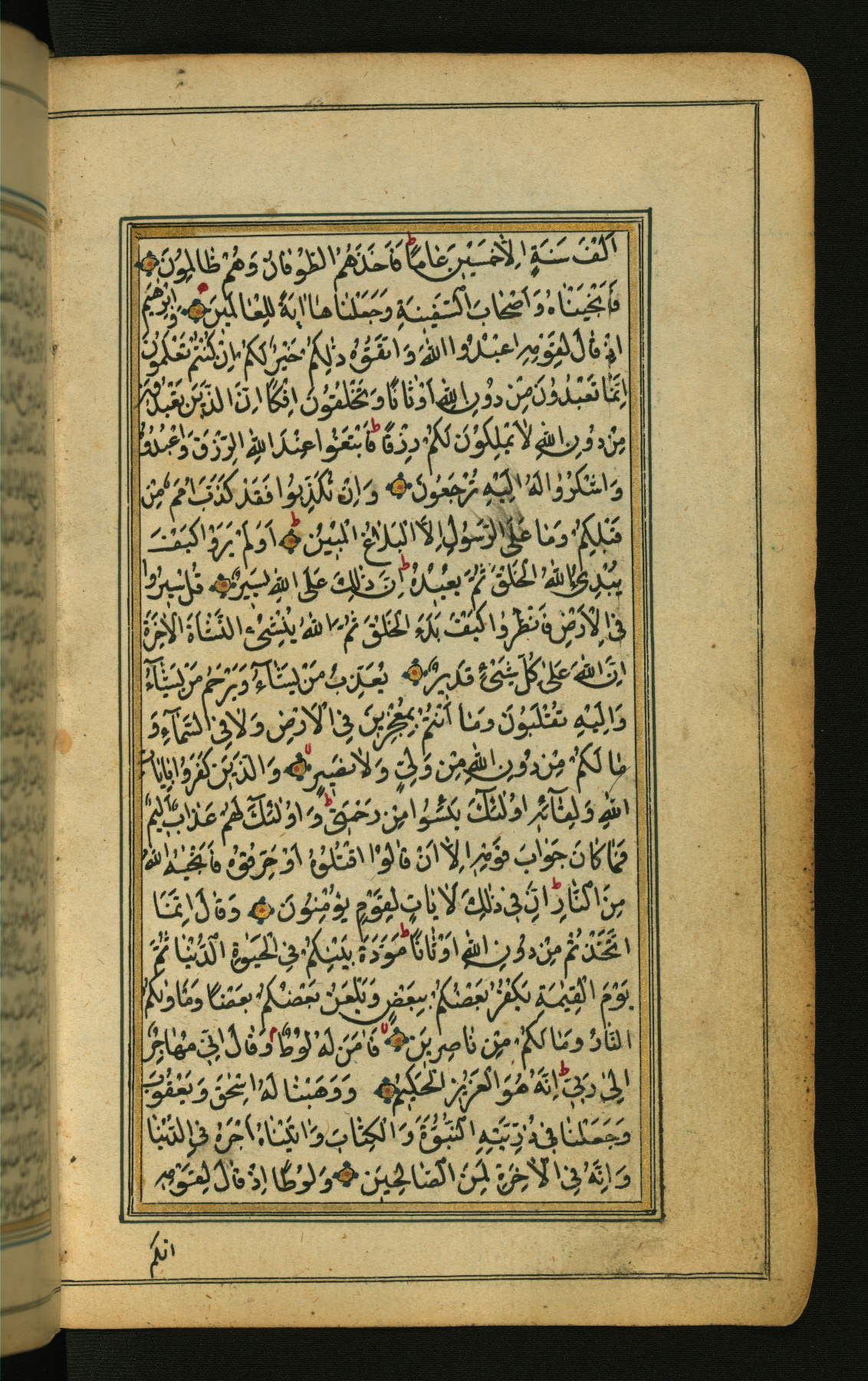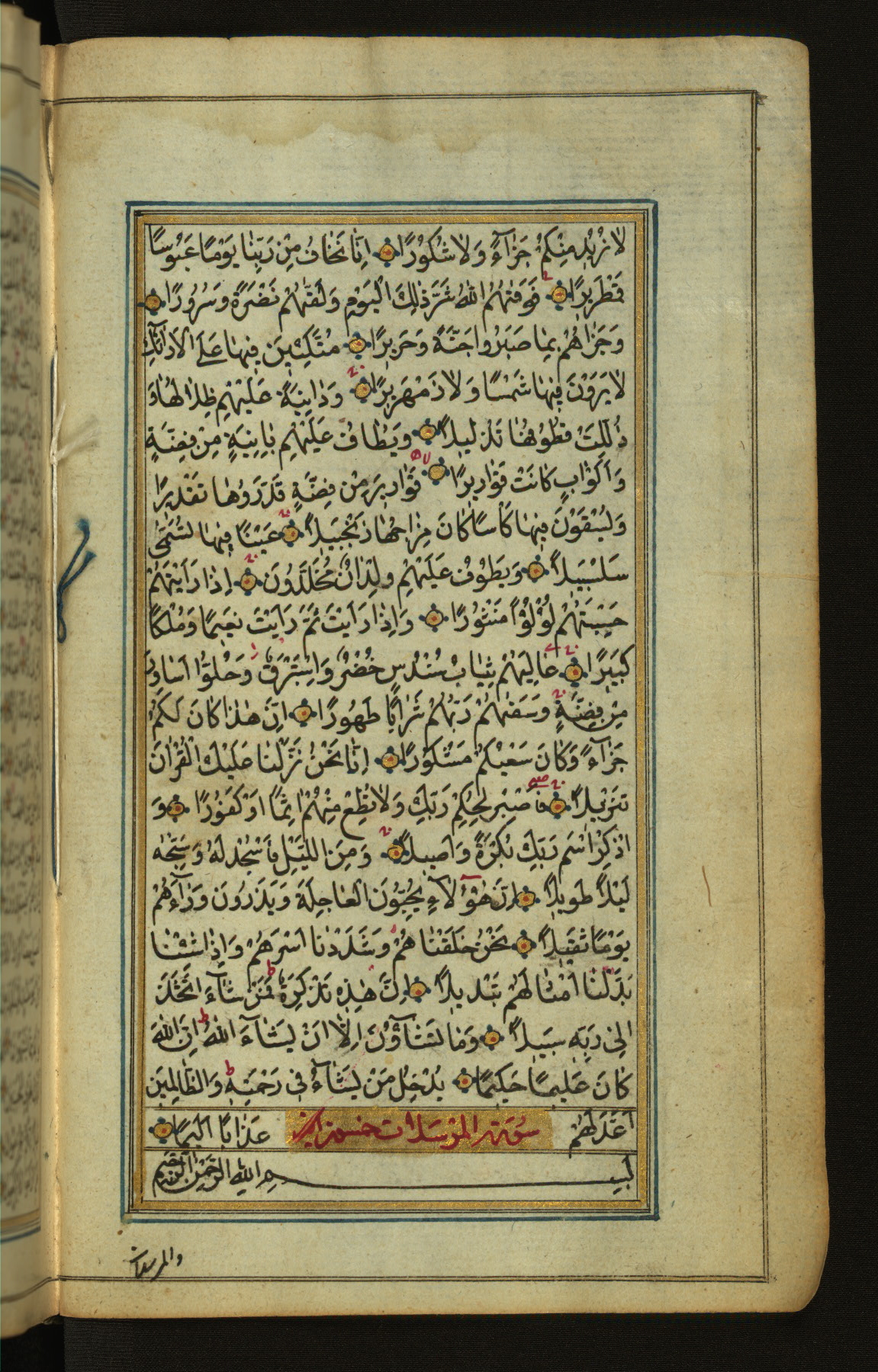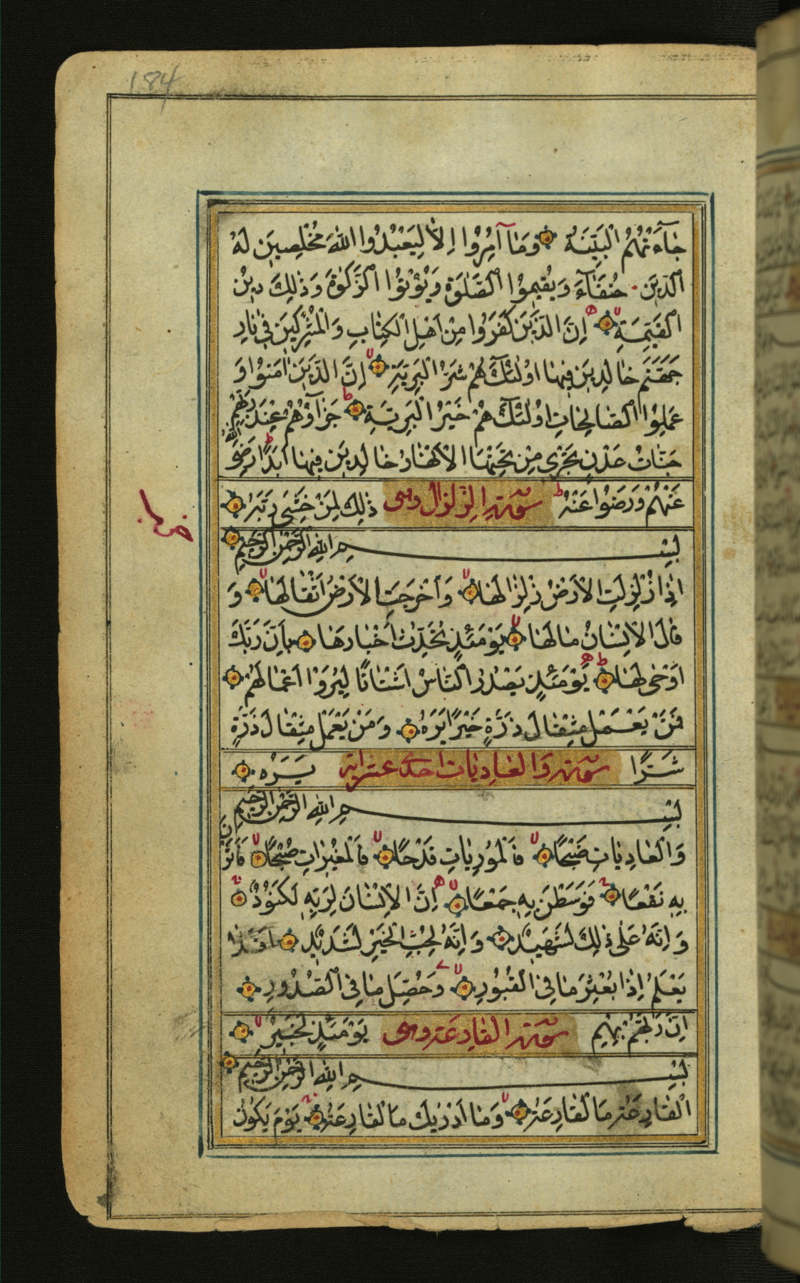 This manuscript is a small illuminated single-volume copy of the Qurʾan, likely produced in Iran. A date is inscribed on the final page, which is interpreted as 1230 AH / 1814-5 CE (fol. 186b). The manuscript opens with an illuminated double-page incipit with the verses of chapter 1 (Sūrat al-fātiḥah) and the initial verses of chapter 2 (Sūrat al-baqarah), decorated with interlinear illumination (fols. 1b-2a). The text is in vocalized naskh script in black ink with reading marks in red and text divisions, such as thirty verses (juzʾ) or sixty verses (ḥizb), in the margins. Illuminated discs with colored dots separate the verses. Chapter headings are in riqāʿ script in red ink on a gold ground. The nineteenth-century lacquer binding with a floral composition on a gold field on the upper and lower boards seems to be contemporary with the manuscript. The insides of both boards are painted with a lobed yellow central medallion and pendants on an orange field.