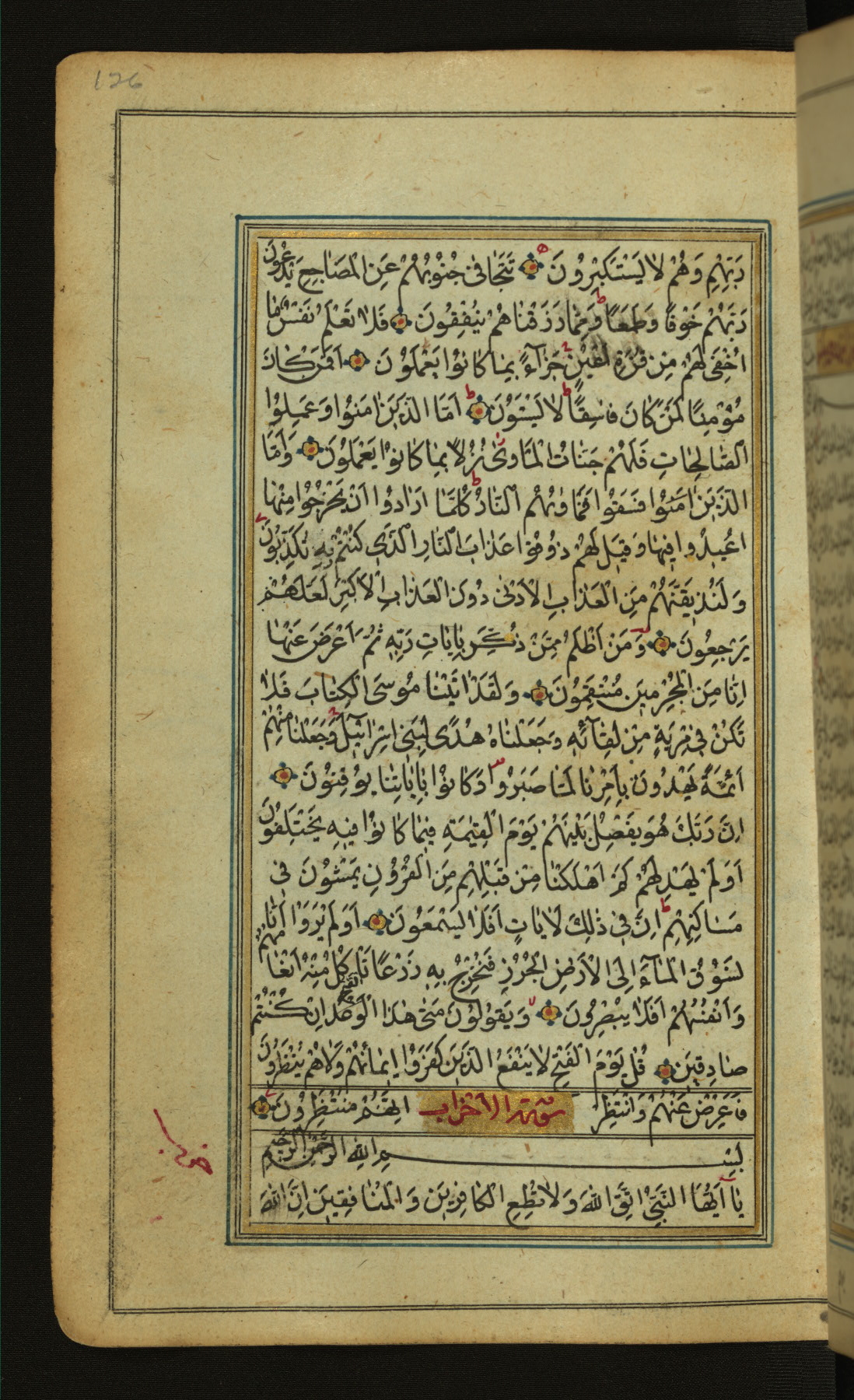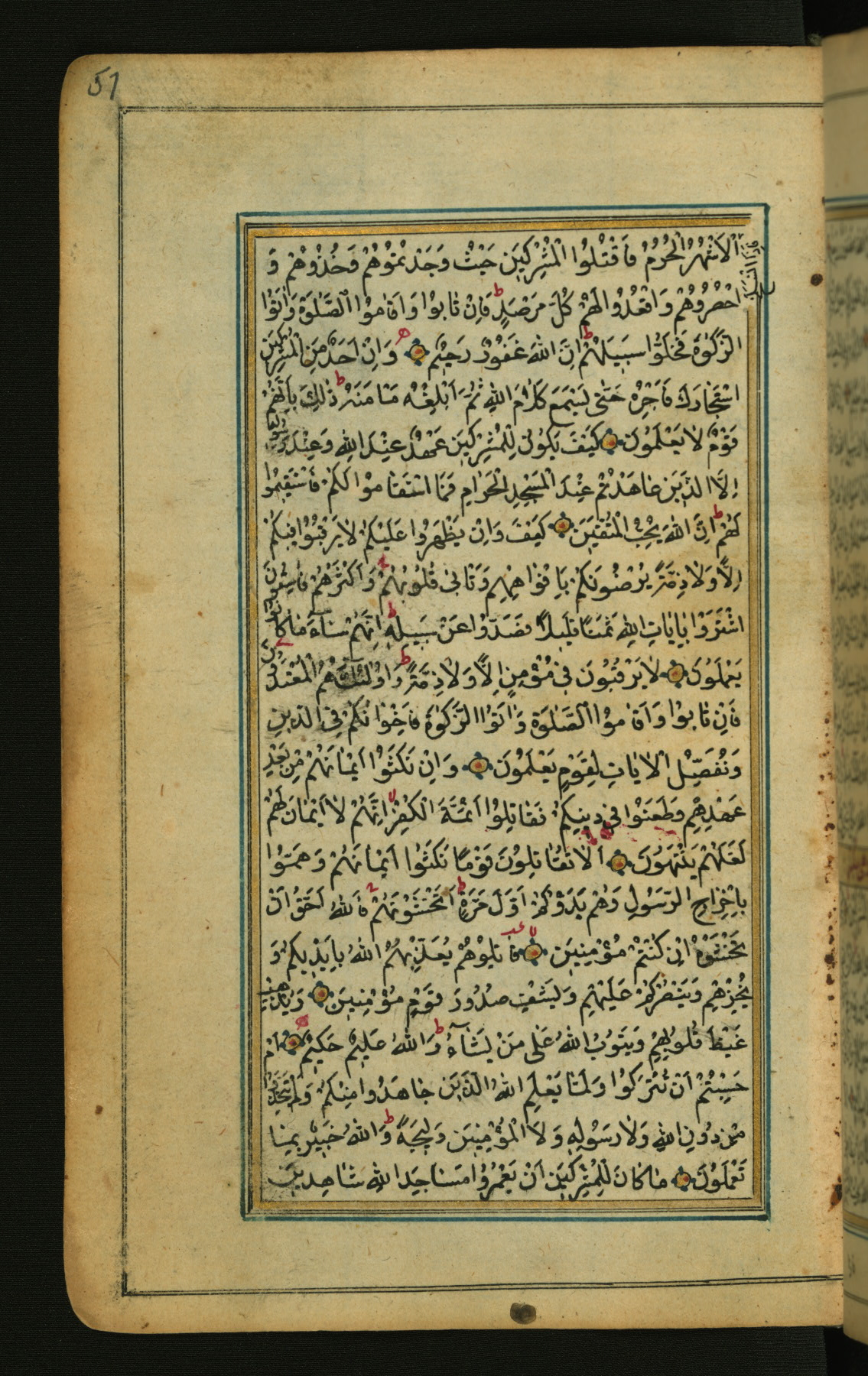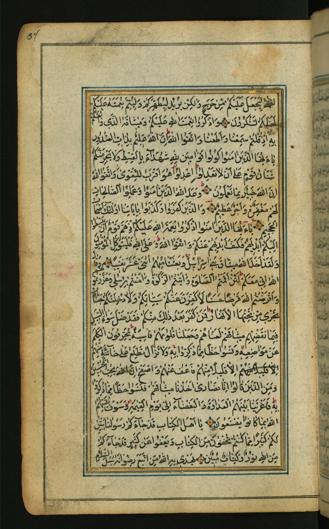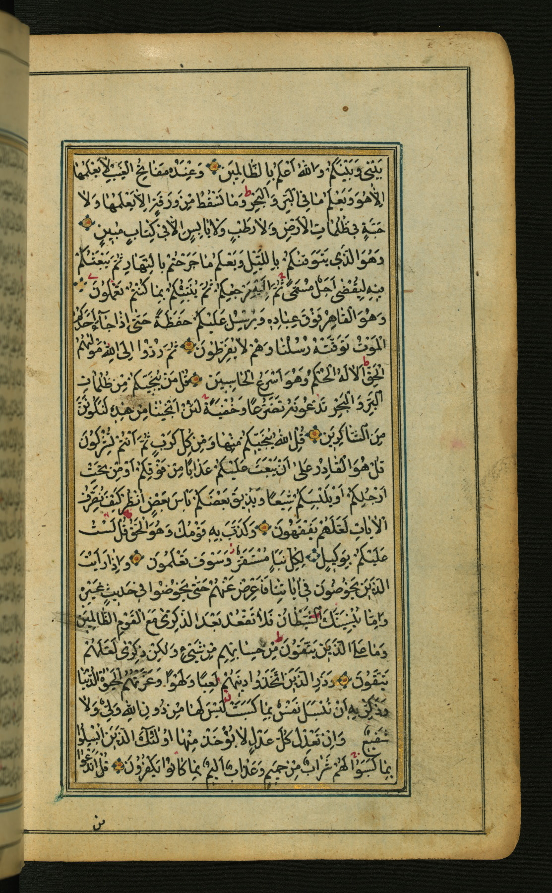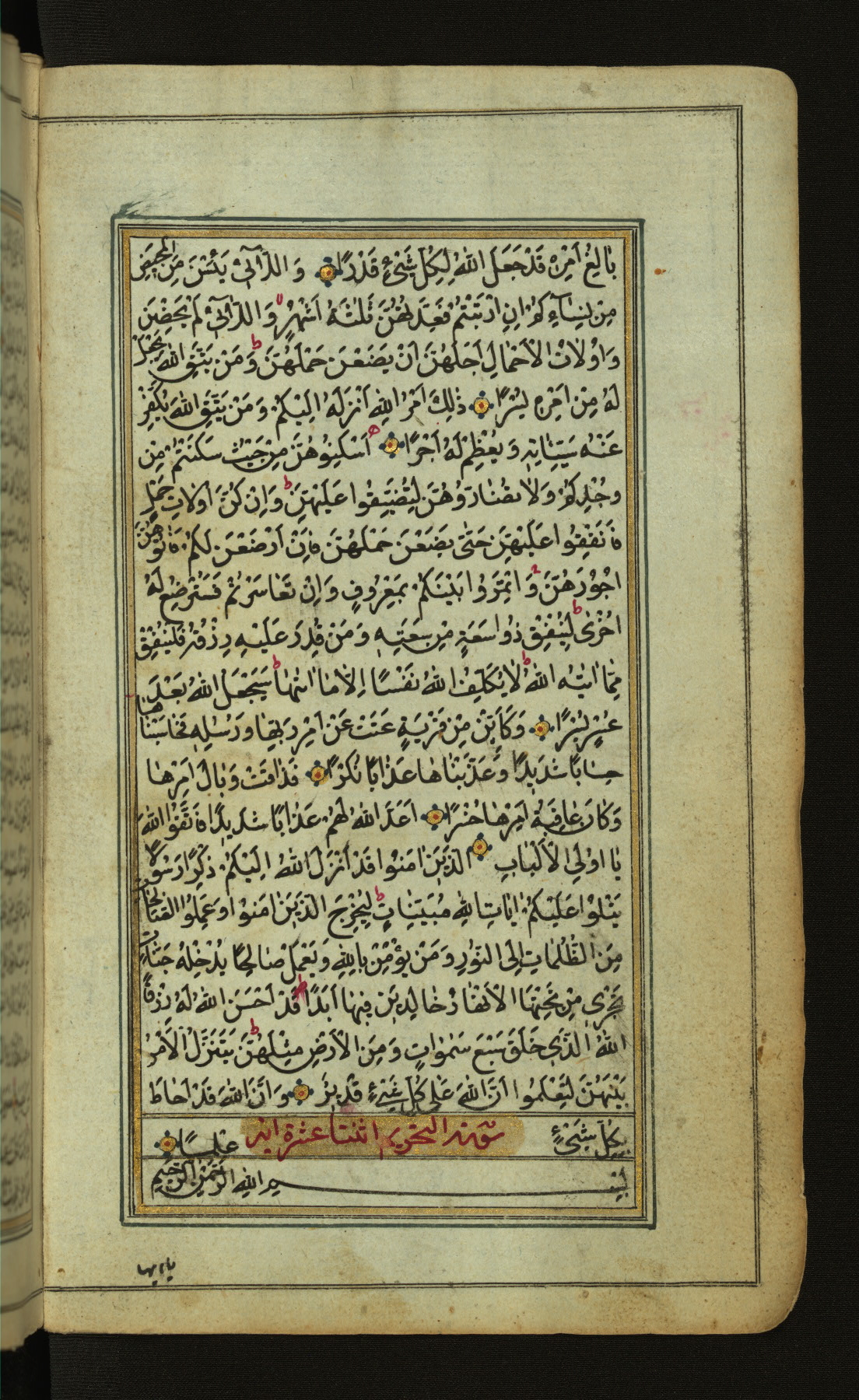 This manuscript is a small illuminated single-volume copy of the Qurʾan, likely produced in Iran. A date is inscribed on the final page, which is interpreted as 1230 AH / 1814-5 CE (fol. 186b). The manuscript opens with an illuminated double-page incipit with the verses of chapter 1 (Sūrat al-fātiḥah) and the initial verses of chapter 2 (Sūrat al-baqarah), decorated with interlinear illumination (fols. 1b-2a). The text is in vocalized naskh script in black ink with reading marks in red and text divisions, such as thirty verses (juzʾ) or sixty verses (ḥizb), in the margins. Illuminated discs with colored dots separate the verses. Chapter headings are in riqāʿ script in red ink on a gold ground. The nineteenth-century lacquer binding with a floral composition on a gold field on the upper and lower boards seems to be contemporary with the manuscript. The insides of both boards are painted with a lobed yellow central medallion and pendants on an orange field.
