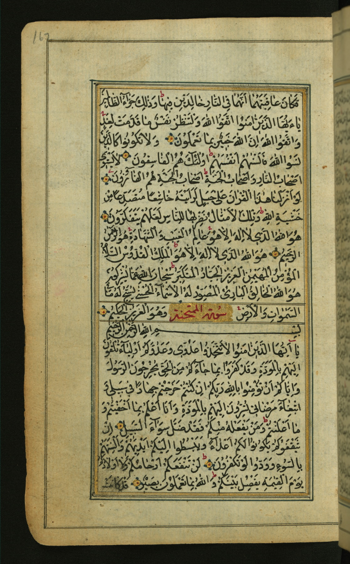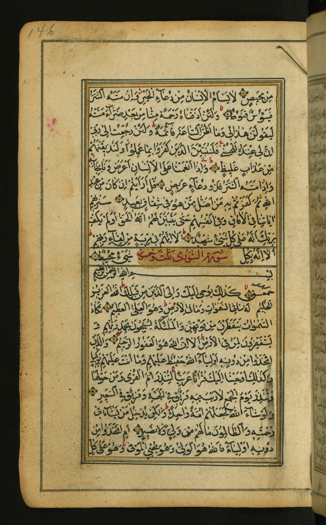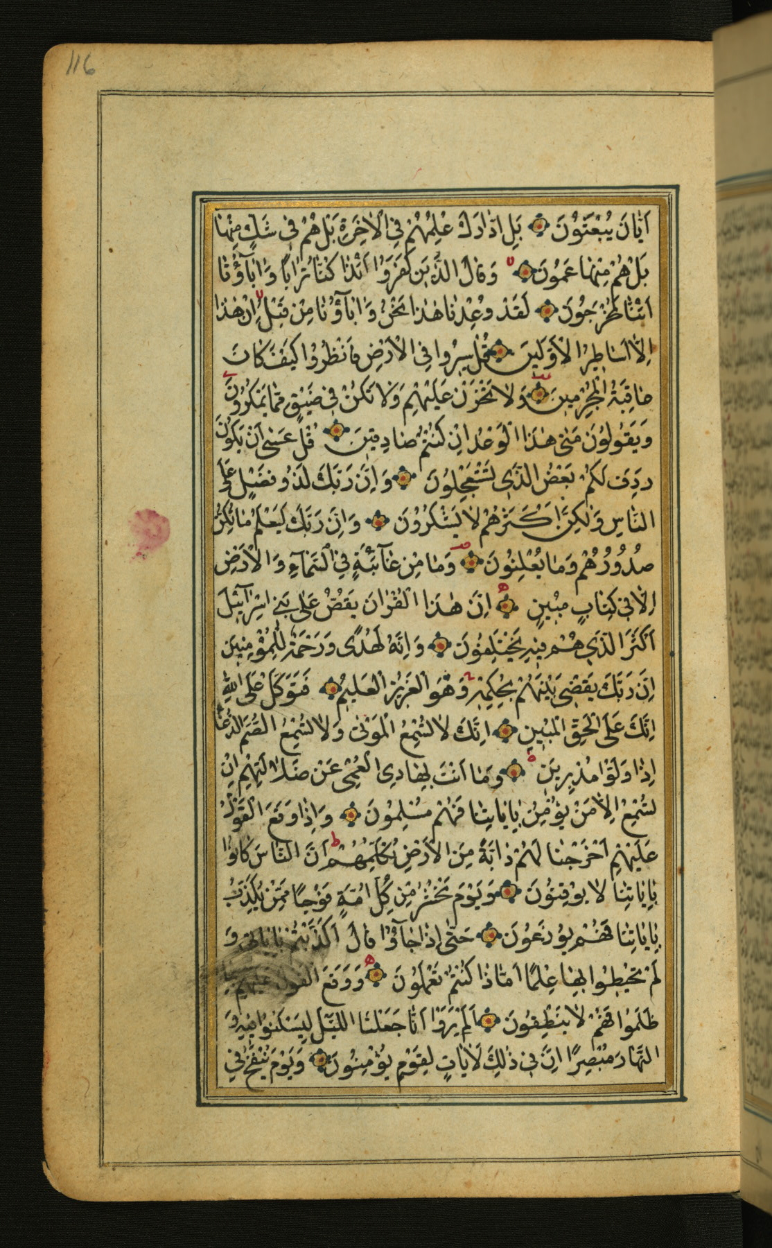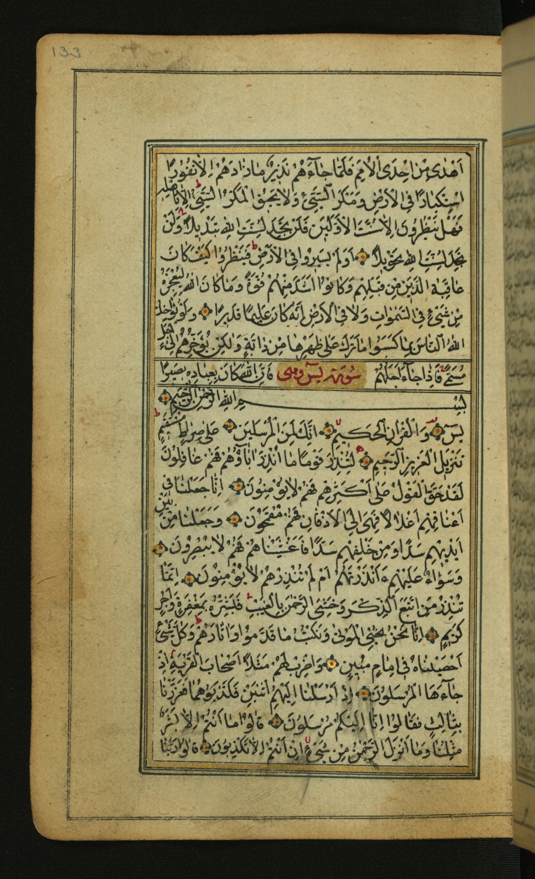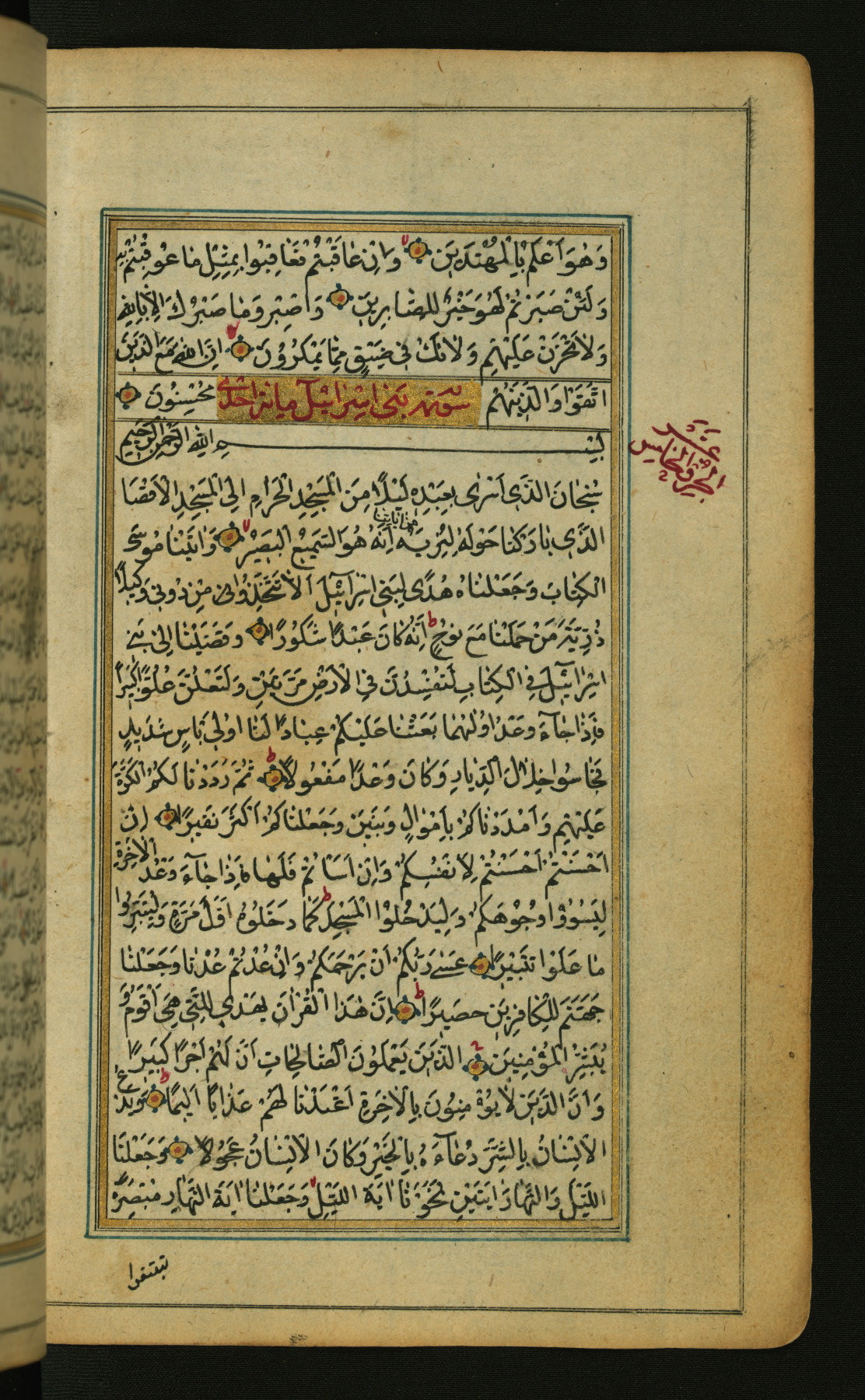 This manuscript is a small illuminated single-volume copy of the Qurʾan, likely produced in Iran. A date is inscribed on the final page, which is interpreted as 1230 AH / 1814-5 CE (fol. 186b). The manuscript opens with an illuminated double-page incipit with the verses of chapter 1 (Sūrat al-fātiḥah) and the initial verses of chapter 2 (Sūrat al-baqarah), decorated with interlinear illumination (fols. 1b-2a). The text is in vocalized naskh script in black ink with reading marks in red and text divisions, such as thirty verses (juzʾ) or sixty verses (ḥizb), in the margins. Illuminated discs with colored dots separate the verses. Chapter headings are in riqāʿ script in red ink on a gold ground. The nineteenth-century lacquer binding with a floral composition on a gold field on the upper and lower boards seems to be contemporary with the manuscript. The insides of both boards are painted with a lobed yellow central medallion and pendants on an orange field.