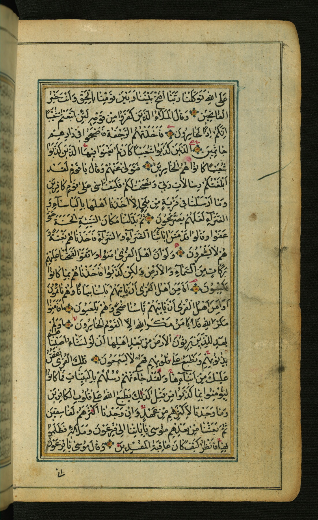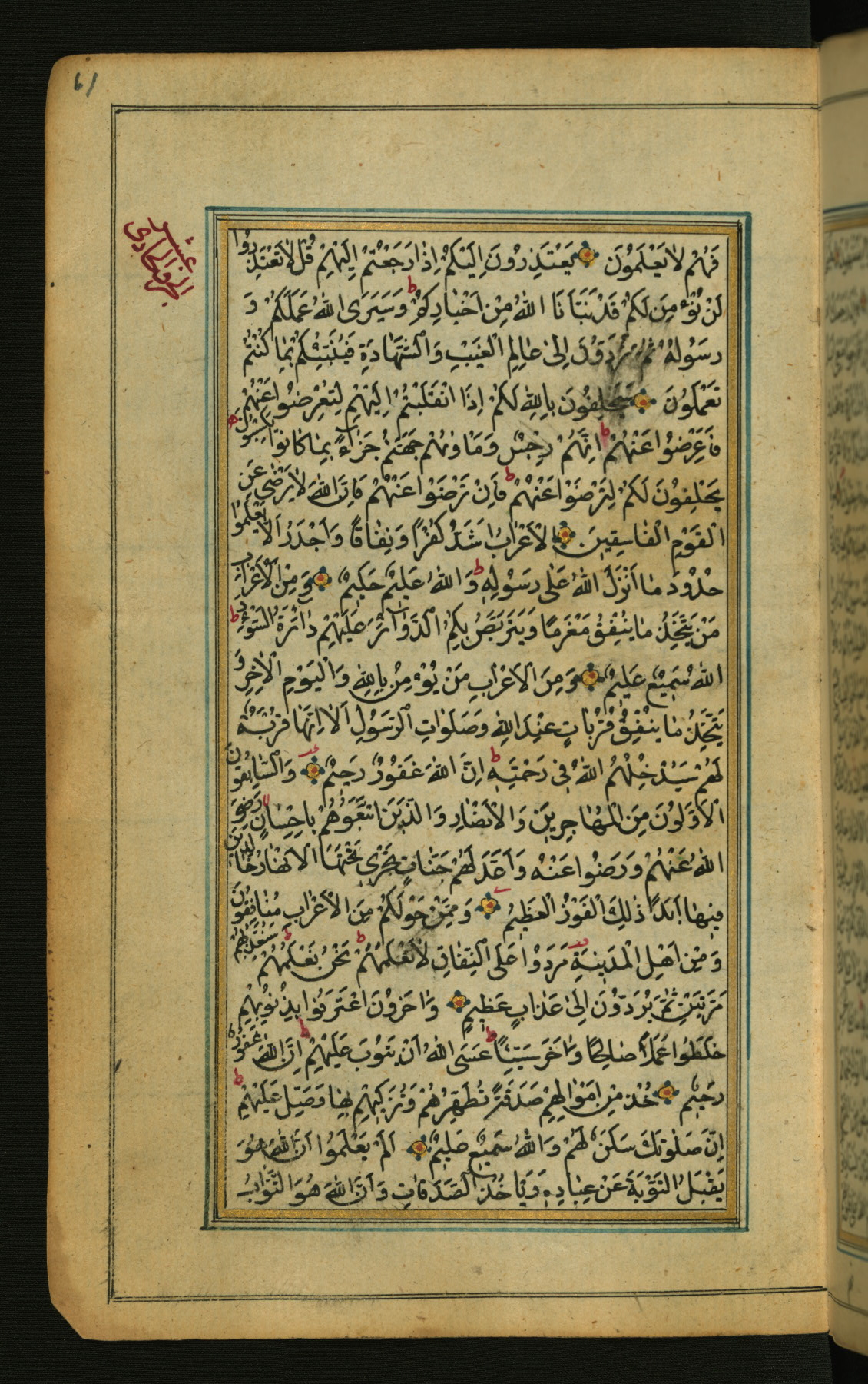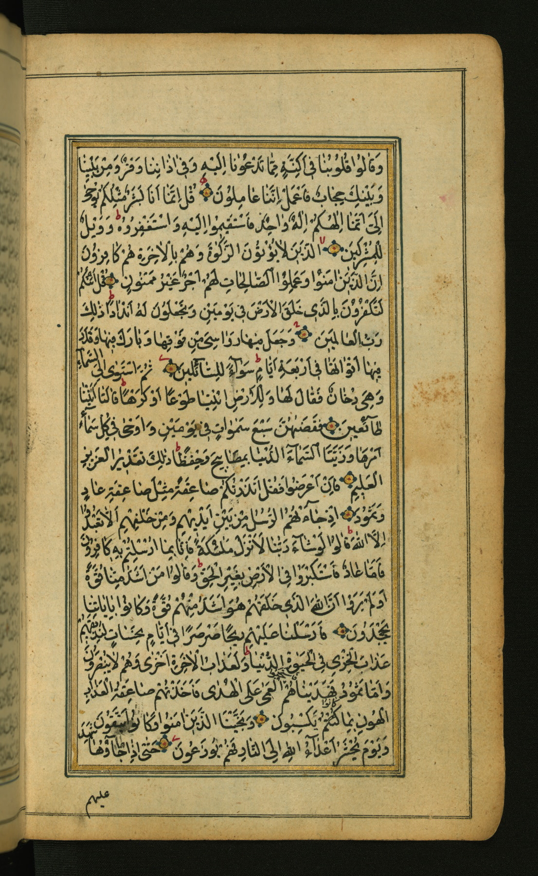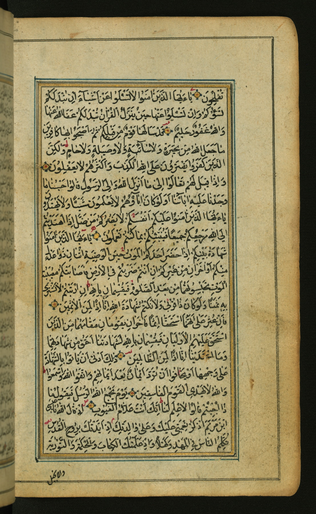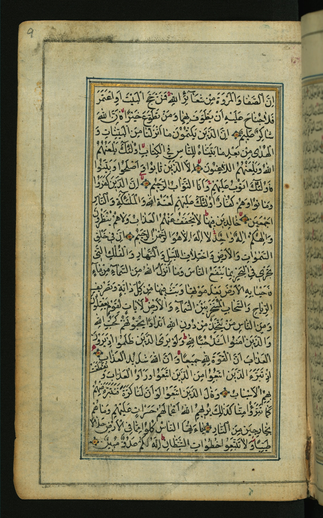 This manuscript is a small illuminated single-volume copy of the Qurʾan, likely produced in Iran. A date is inscribed on the final page, which is interpreted as 1230 AH / 1814-5 CE (fol. 186b). The manuscript opens with an illuminated double-page incipit with the verses of chapter 1 (Sūrat al-fātiḥah) and the initial verses of chapter 2 (Sūrat al-baqarah), decorated with interlinear illumination (fols. 1b-2a). The text is in vocalized naskh script in black ink with reading marks in red and text divisions, such as thirty verses (juzʾ) or sixty verses (ḥizb), in the margins. Illuminated discs with colored dots separate the verses. Chapter headings are in riqāʿ script in red ink on a gold ground. The nineteenth-century lacquer binding with a floral composition on a gold field on the upper and lower boards seems to be contemporary with the manuscript. The insides of both boards are painted with a lobed yellow central medallion and pendants on an orange field.
