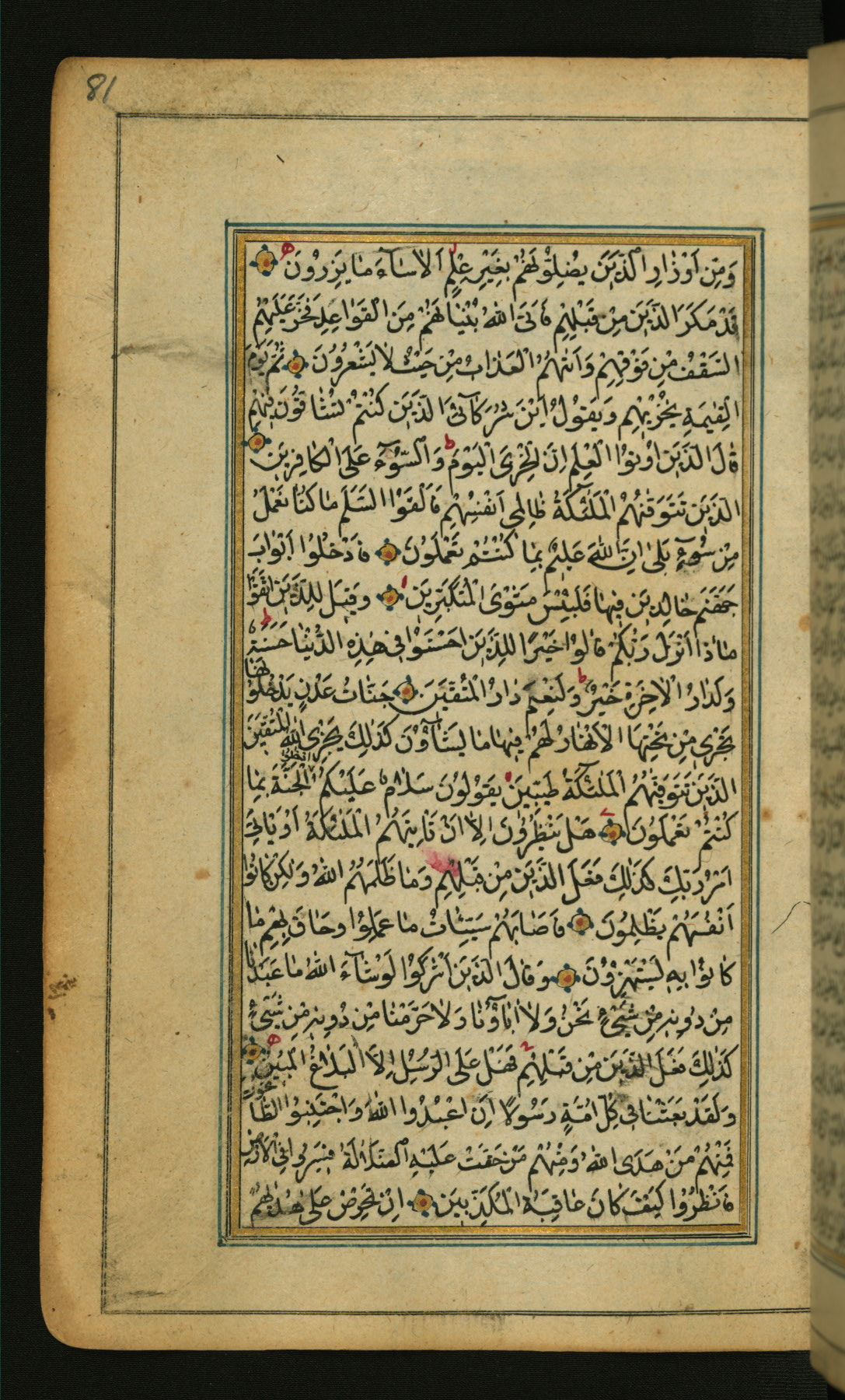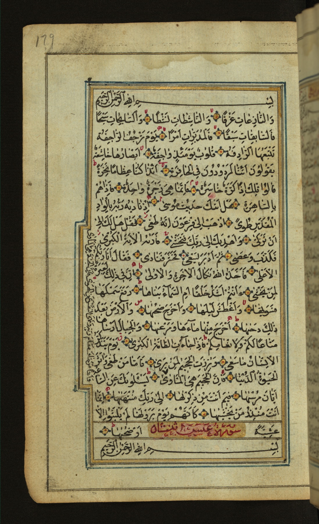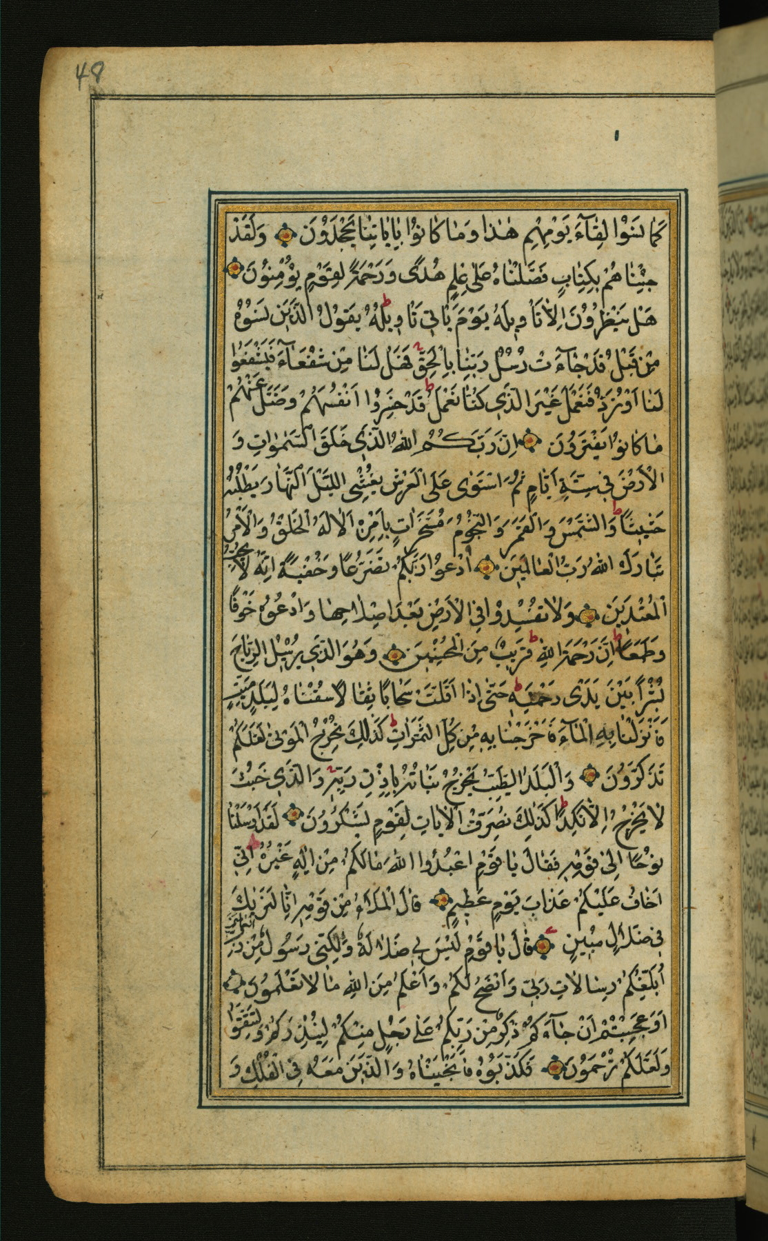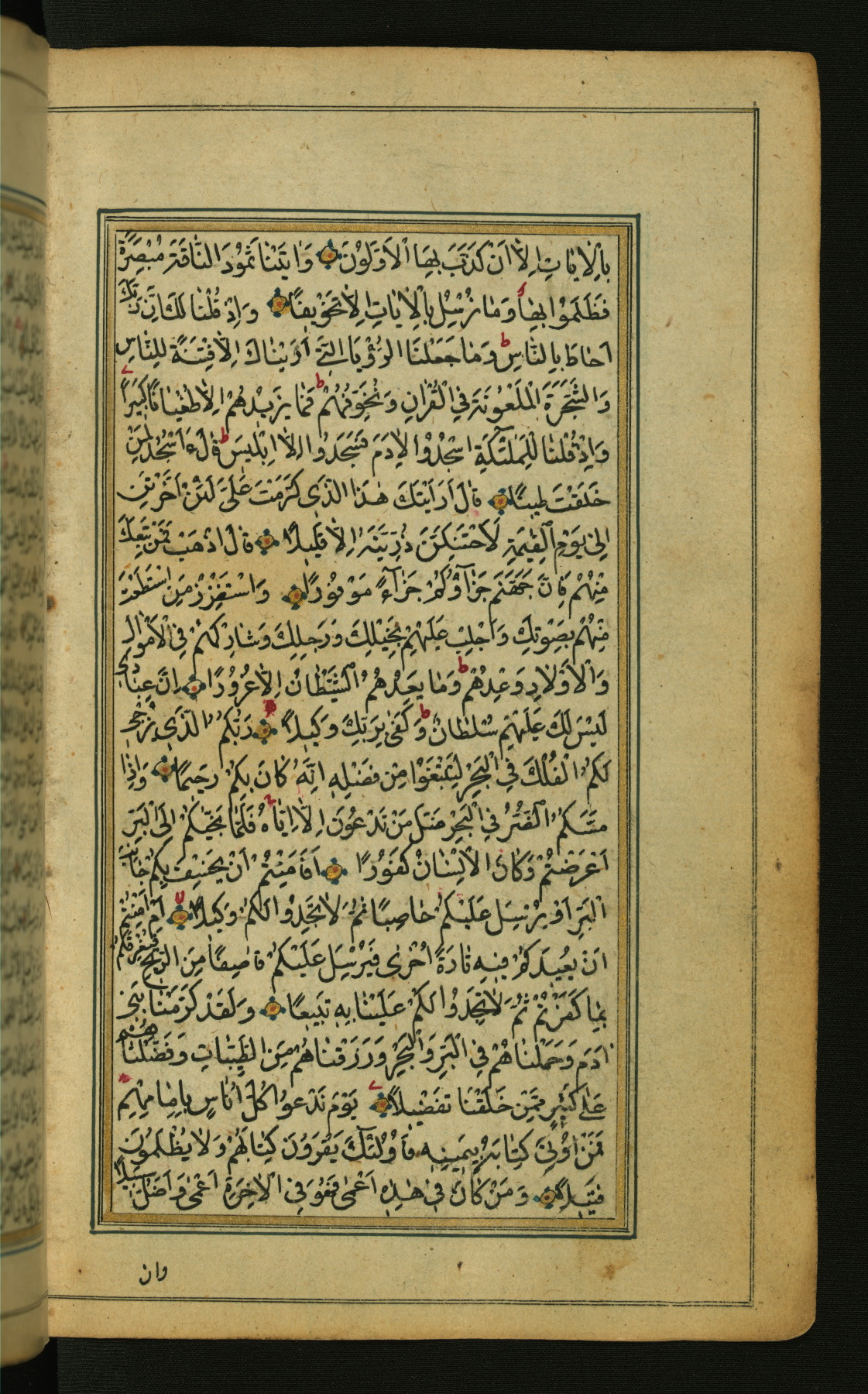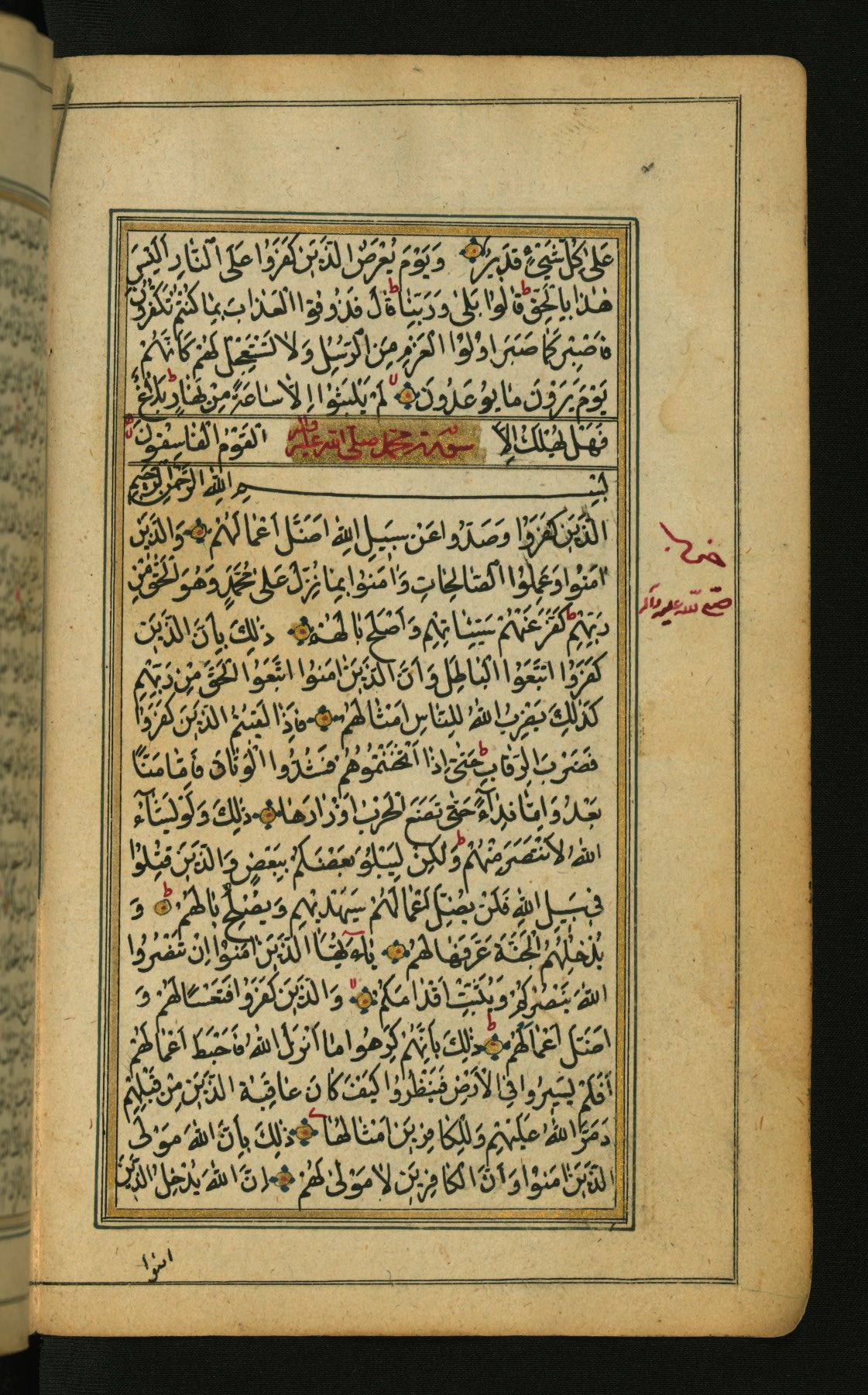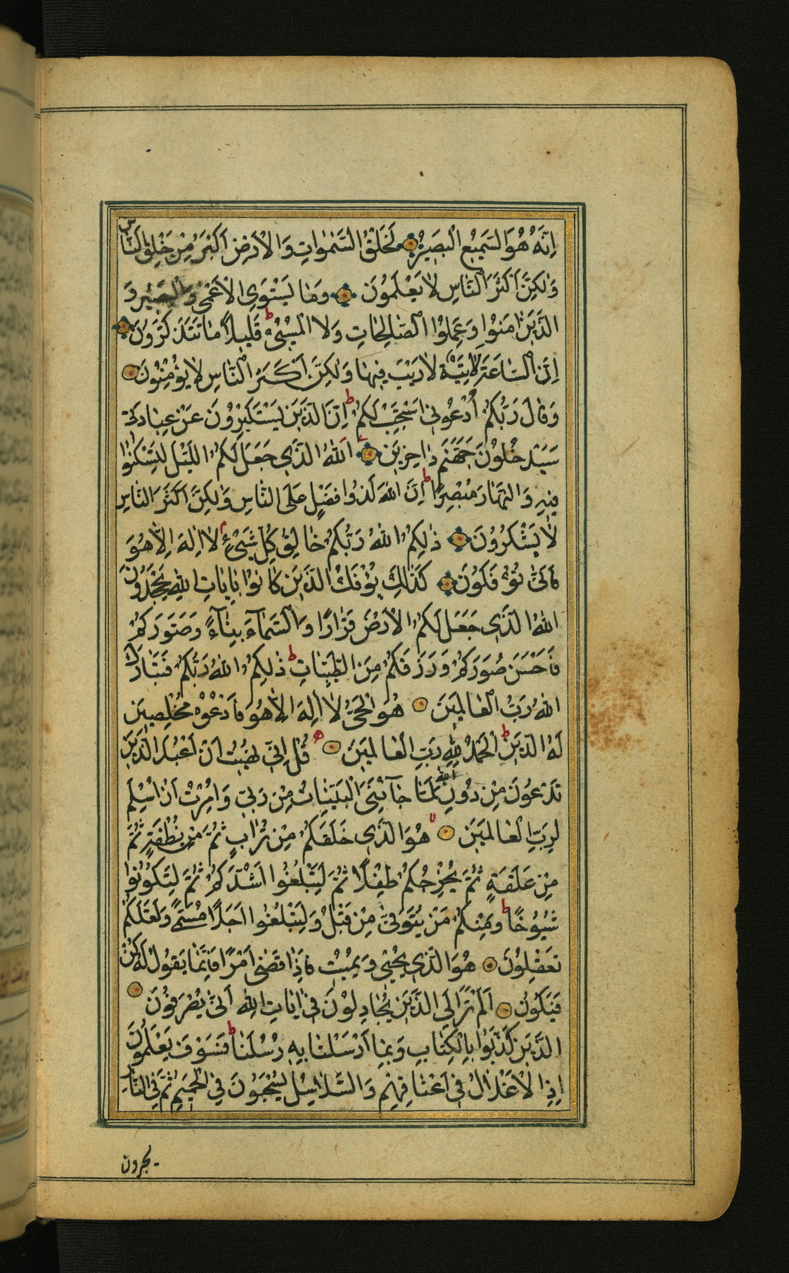 This manuscript is a small illuminated single-volume copy of the Qurʾan, likely produced in Iran. A date is inscribed on the final page, which is interpreted as 1230 AH / 1814-5 CE (fol. 186b). The manuscript opens with an illuminated double-page incipit with the verses of chapter 1 (Sūrat al-fātiḥah) and the initial verses of chapter 2 (Sūrat al-baqarah), decorated with interlinear illumination (fols. 1b-2a). The text is in vocalized naskh script in black ink with reading marks in red and text divisions, such as thirty verses (juzʾ) or sixty verses (ḥizb), in the margins. Illuminated discs with colored dots separate the verses. Chapter headings are in riqāʿ script in red ink on a gold ground. The nineteenth-century lacquer binding with a floral composition on a gold field on the upper and lower boards seems to be contemporary with the manuscript. The insides of both boards are painted with a lobed yellow central medallion and pendants on an orange field.