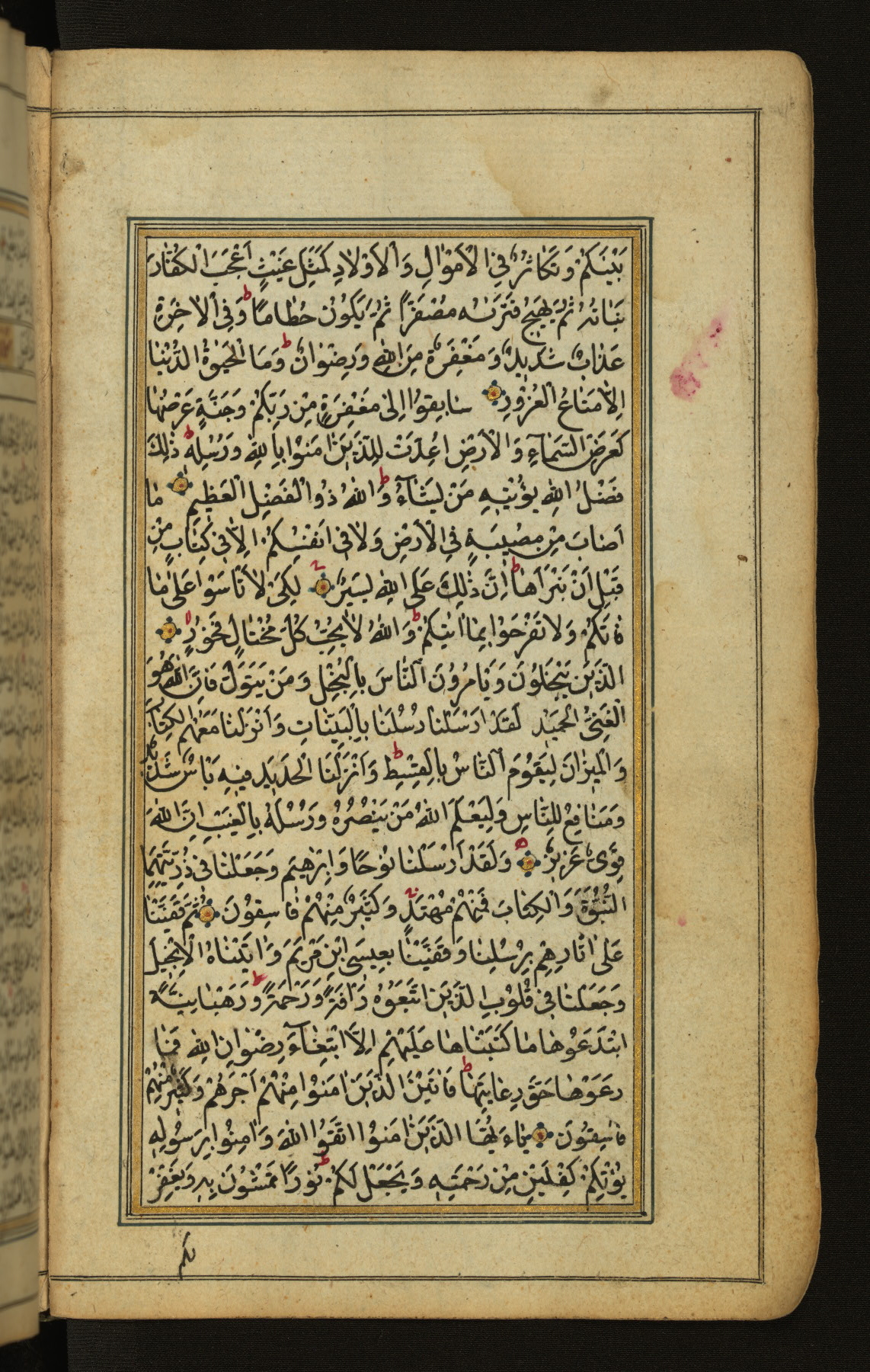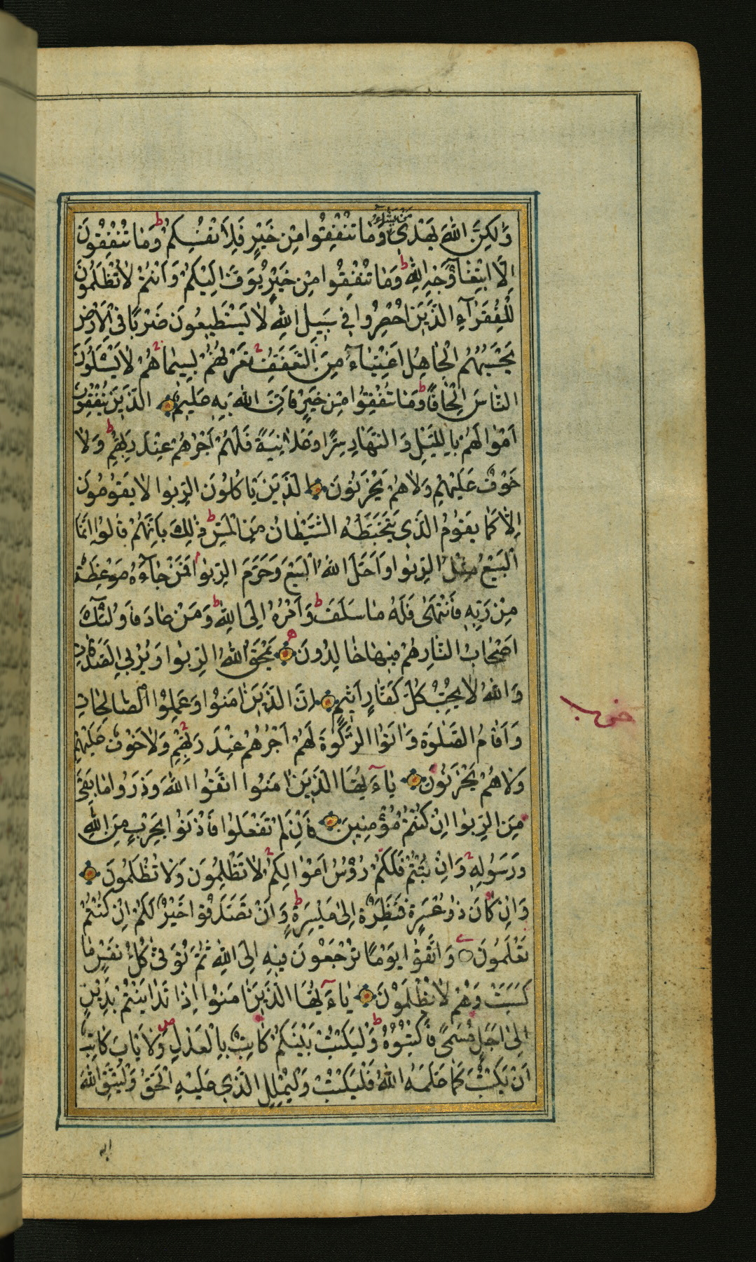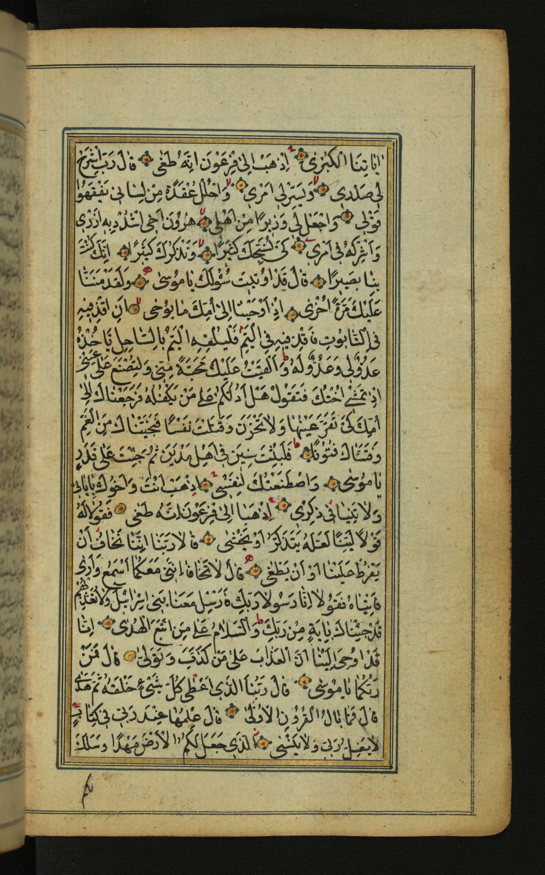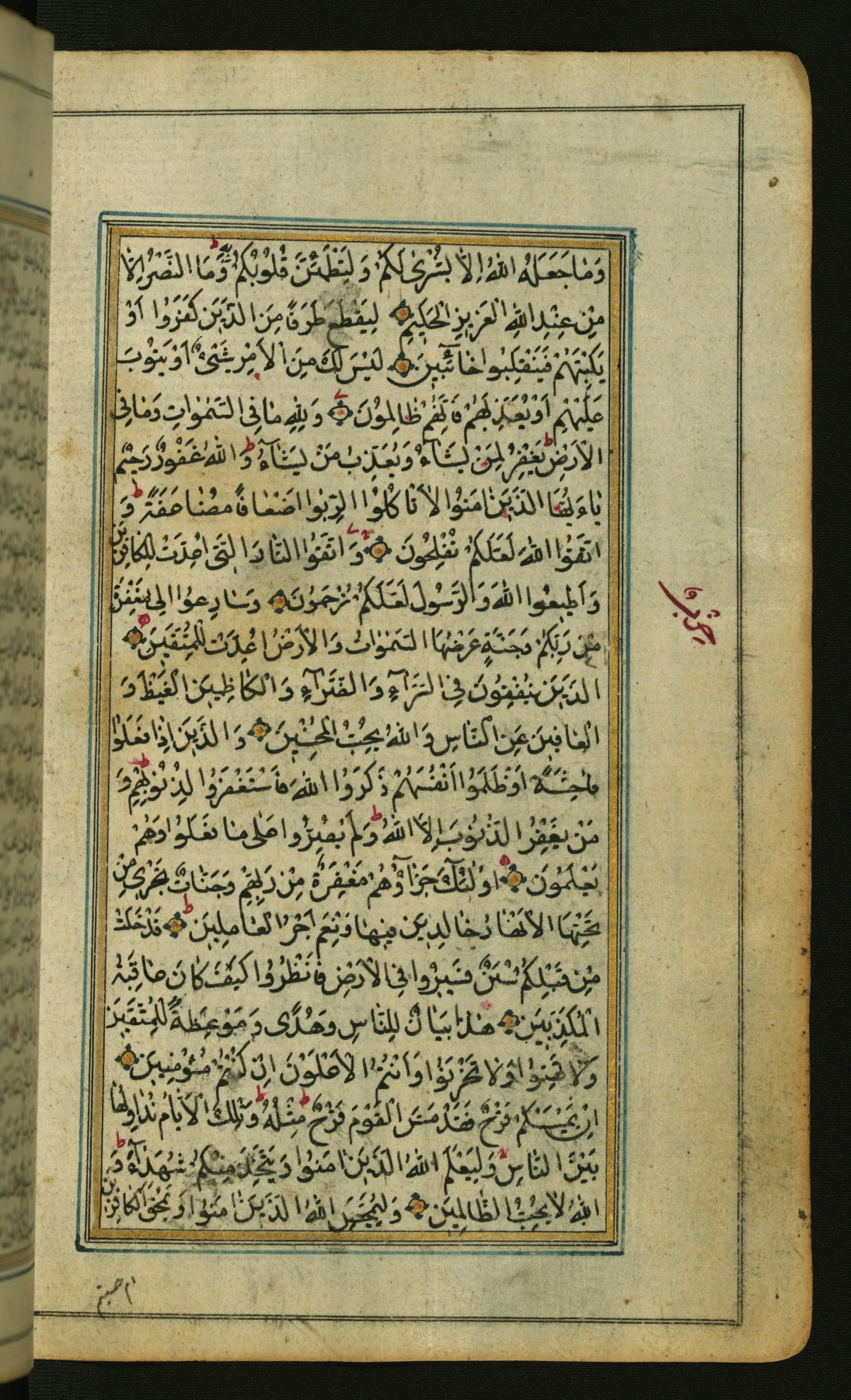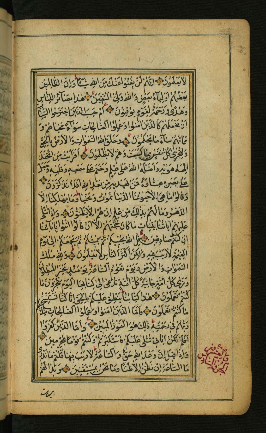 This manuscript is a small illuminated single-volume copy of the Qurʾan, likely produced in Iran. A date is inscribed on the final page, which is interpreted as 1230 AH / 1814-5 CE (fol. 186b). The manuscript opens with an illuminated double-page incipit with the verses of chapter 1 (Sūrat al-fātiḥah) and the initial verses of chapter 2 (Sūrat al-baqarah), decorated with interlinear illumination (fols. 1b-2a). The text is in vocalized naskh script in black ink with reading marks in red and text divisions, such as thirty verses (juzʾ) or sixty verses (ḥizb), in the margins. Illuminated discs with colored dots separate the verses. Chapter headings are in riqāʿ script in red ink on a gold ground. The nineteenth-century lacquer binding with a floral composition on a gold field on the upper and lower boards seems to be contemporary with the manuscript. The insides of both boards are painted with a lobed yellow central medallion and pendants on an orange field.