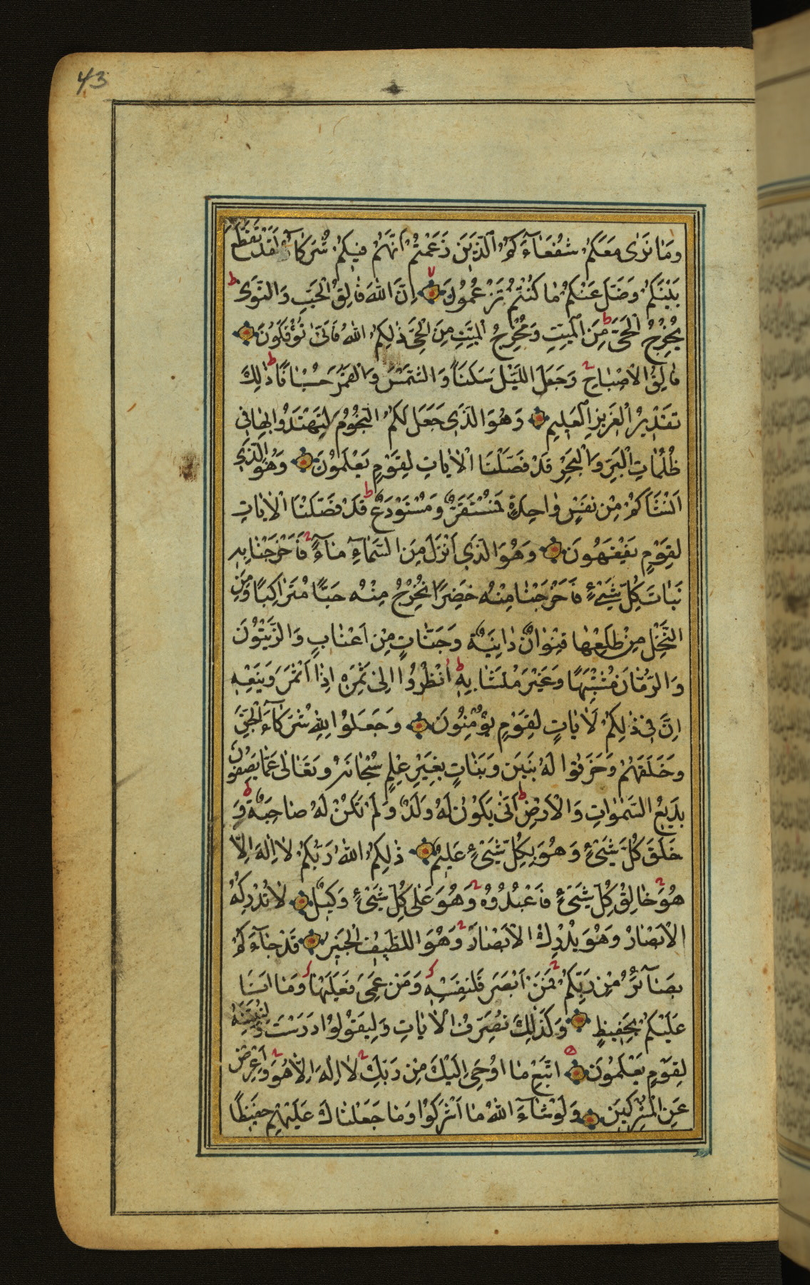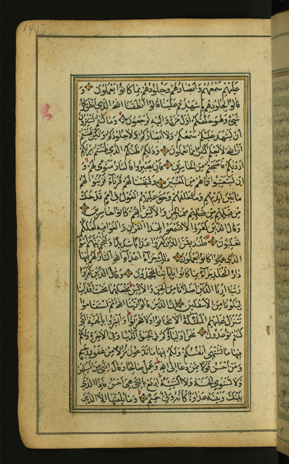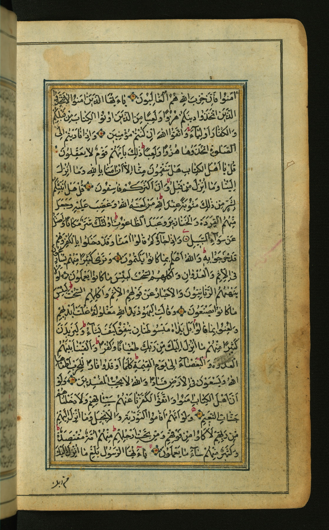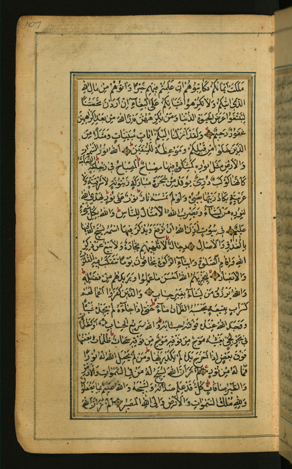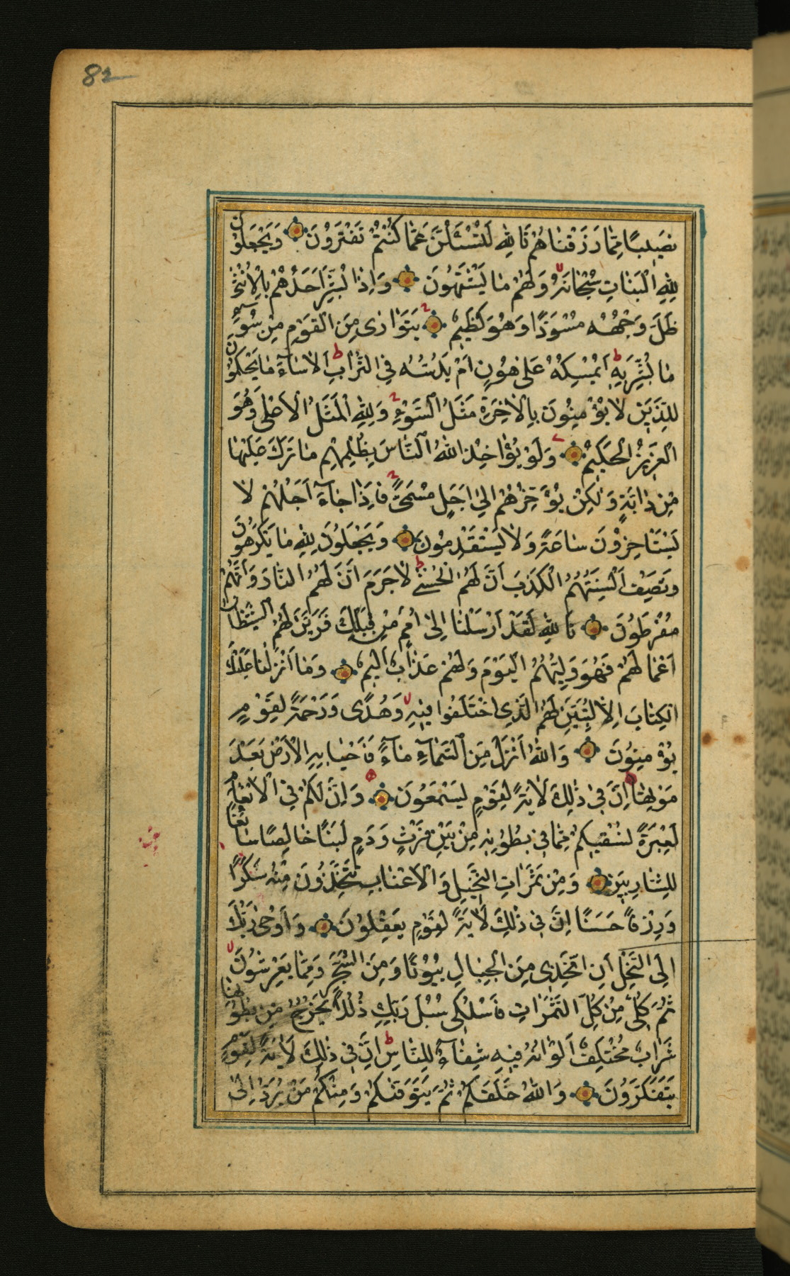 This manuscript is a small illuminated single-volume copy of the Qurʾan, likely produced in Iran. A date is inscribed on the final page, which is interpreted as 1230 AH / 1814-5 CE (fol. 186b). The manuscript opens with an illuminated double-page incipit with the verses of chapter 1 (Sūrat al-fātiḥah) and the initial verses of chapter 2 (Sūrat al-baqarah), decorated with interlinear illumination (fols. 1b-2a). The text is in vocalized naskh script in black ink with reading marks in red and text divisions, such as thirty verses (juzʾ) or sixty verses (ḥizb), in the margins. Illuminated discs with colored dots separate the verses. Chapter headings are in riqāʿ script in red ink on a gold ground. The nineteenth-century lacquer binding with a floral composition on a gold field on the upper and lower boards seems to be contemporary with the manuscript. The insides of both boards are painted with a lobed yellow central medallion and pendants on an orange field.