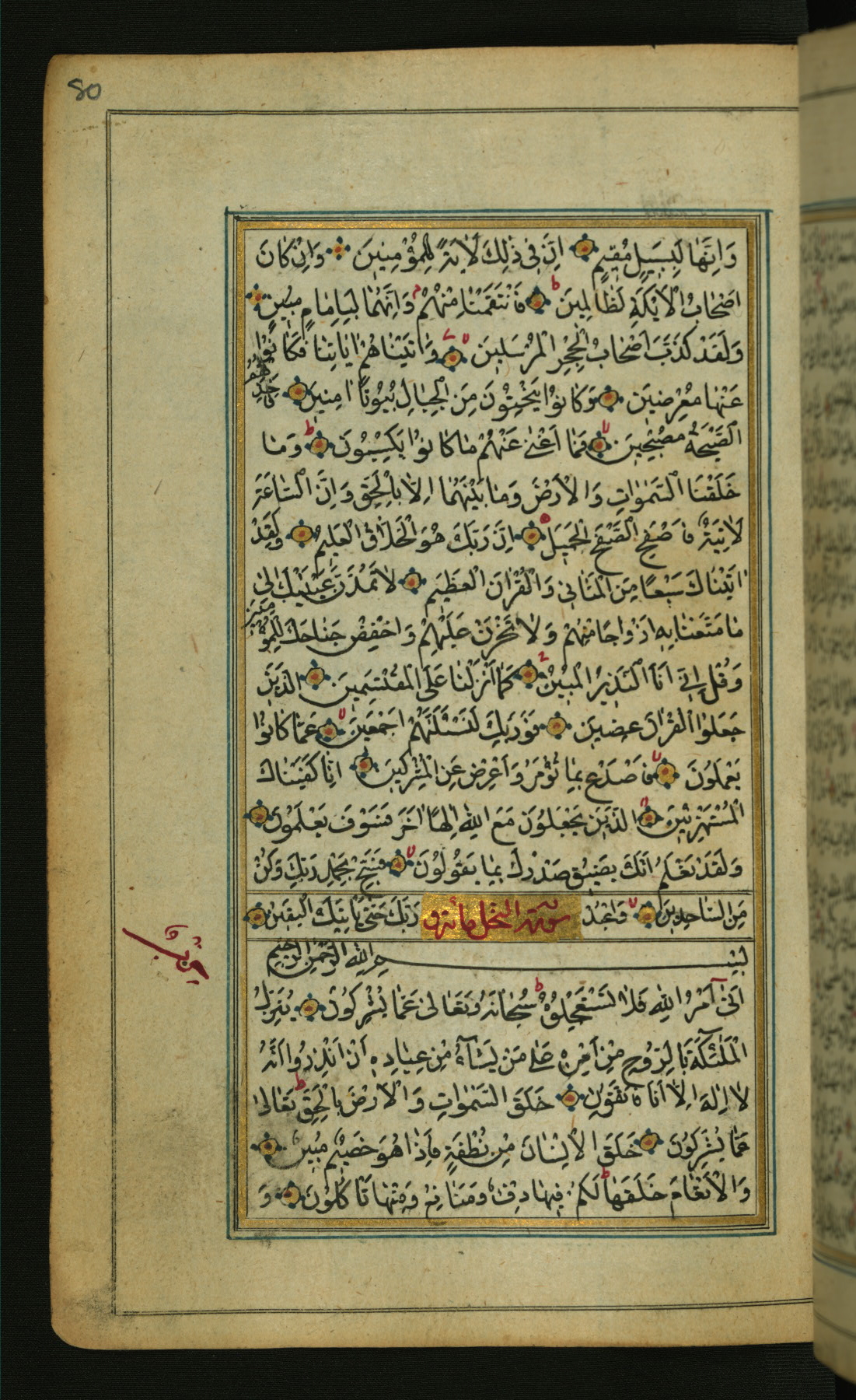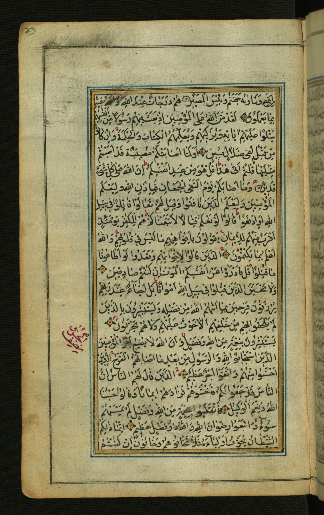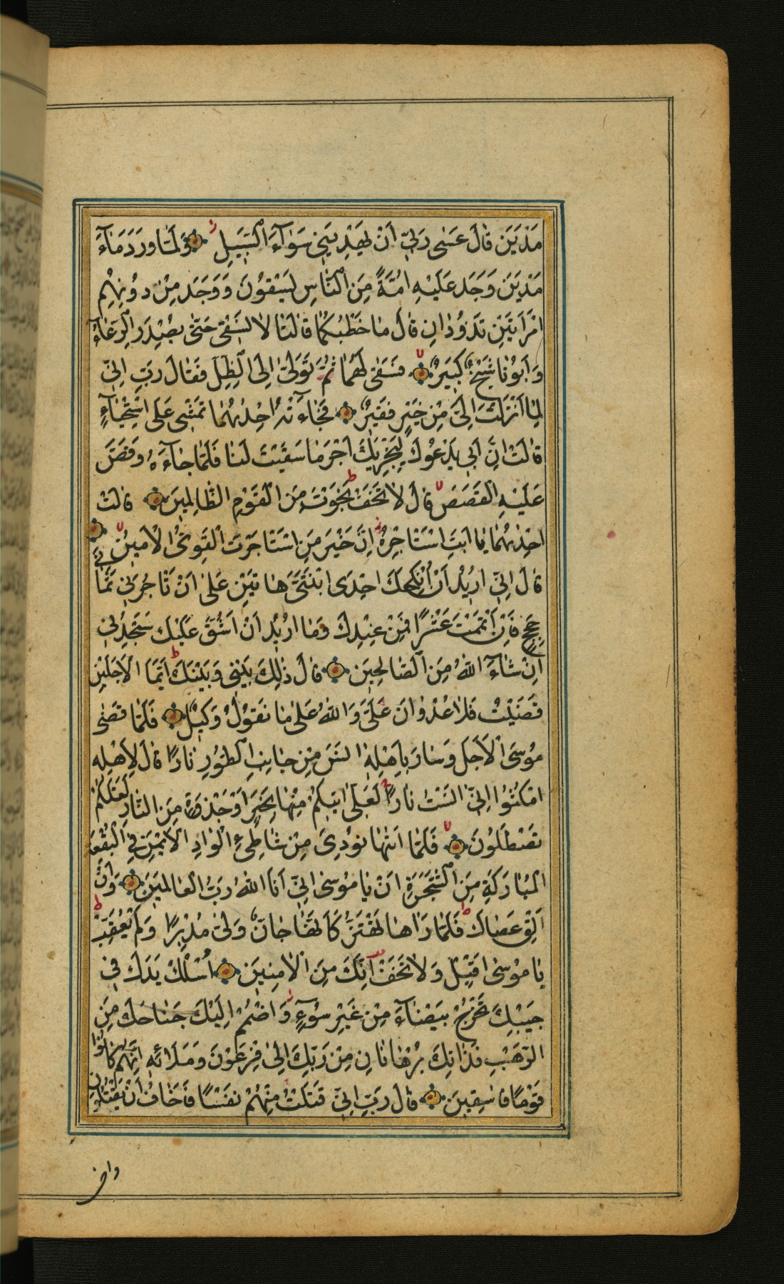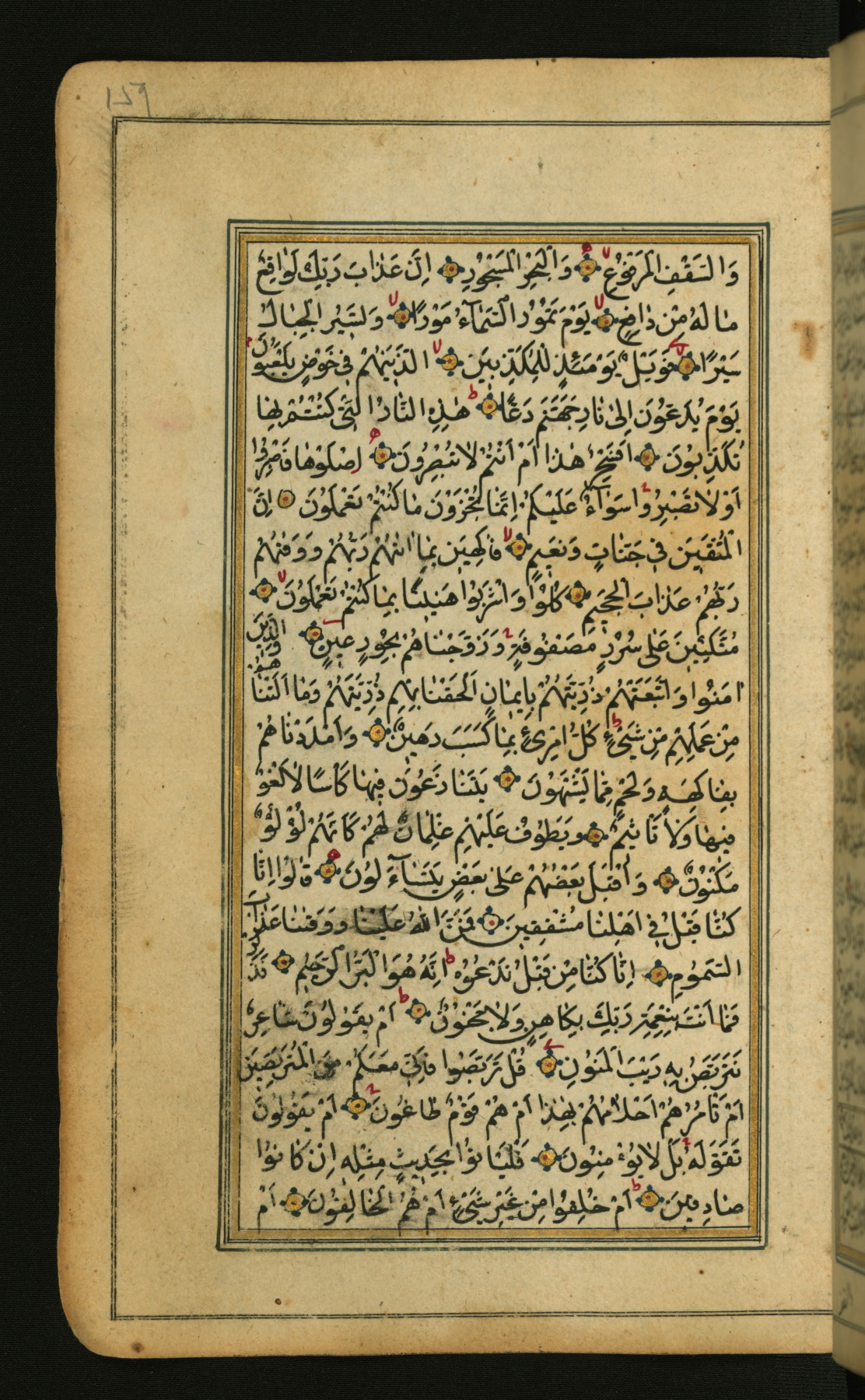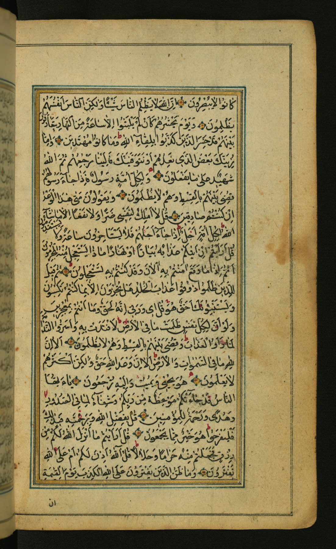 This manuscript is a small illuminated single-volume copy of the Qurʾan, likely produced in Iran. A date is inscribed on the final page, which is interpreted as 1230 AH / 1814-5 CE (fol. 186b). The manuscript opens with an illuminated double-page incipit with the verses of chapter 1 (Sūrat al-fātiḥah) and the initial verses of chapter 2 (Sūrat al-baqarah), decorated with interlinear illumination (fols. 1b-2a). The text is in vocalized naskh script in black ink with reading marks in red and text divisions, such as thirty verses (juzʾ) or sixty verses (ḥizb), in the margins. Illuminated discs with colored dots separate the verses. Chapter headings are in riqāʿ script in red ink on a gold ground. The nineteenth-century lacquer binding with a floral composition on a gold field on the upper and lower boards seems to be contemporary with the manuscript. The insides of both boards are painted with a lobed yellow central medallion and pendants on an orange field.
