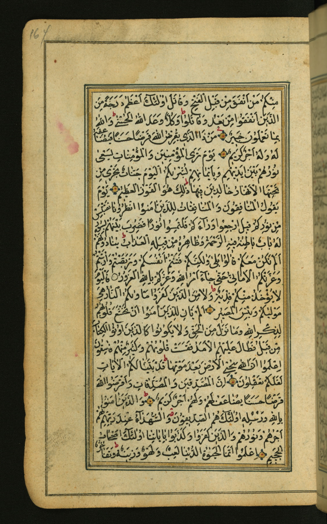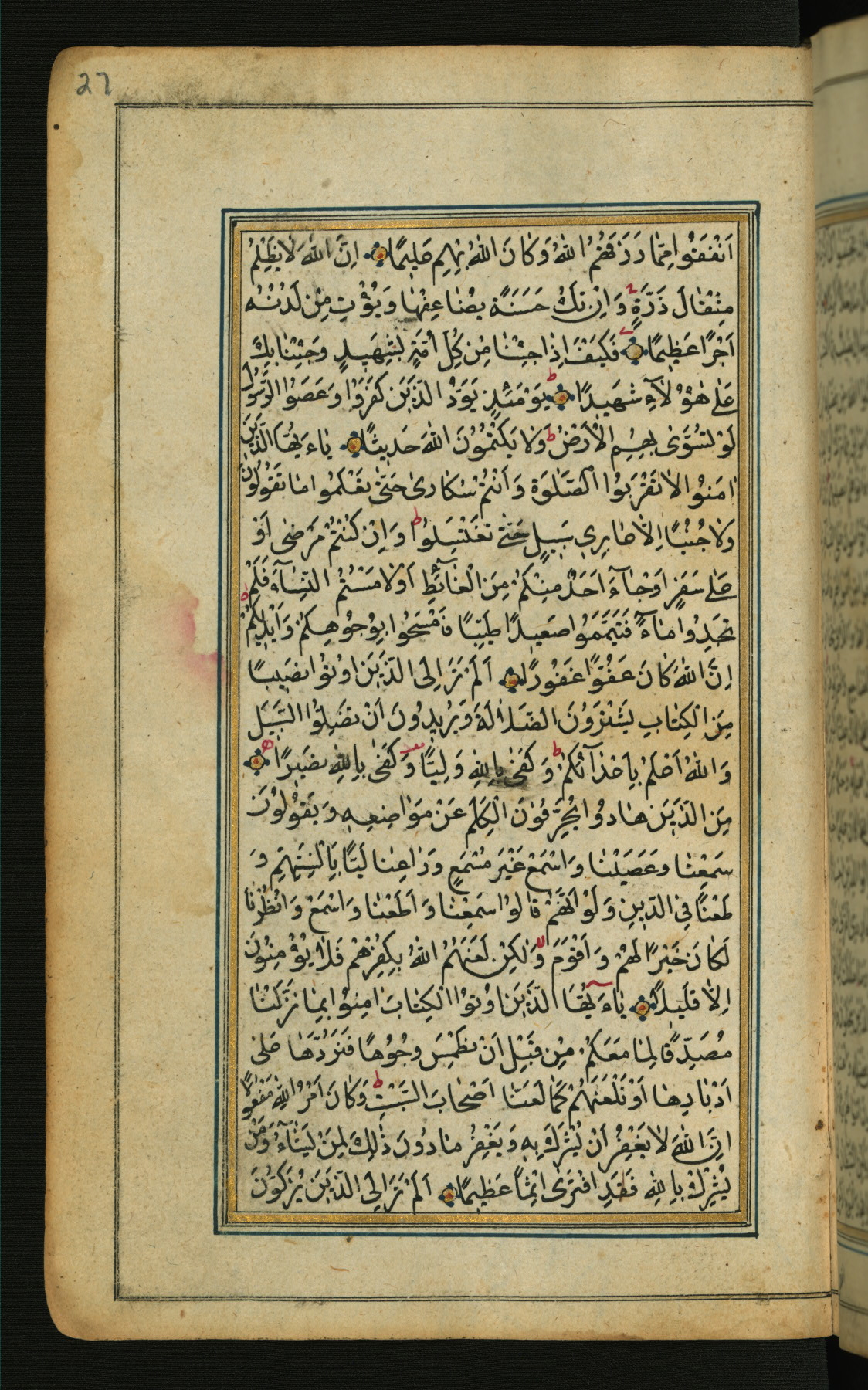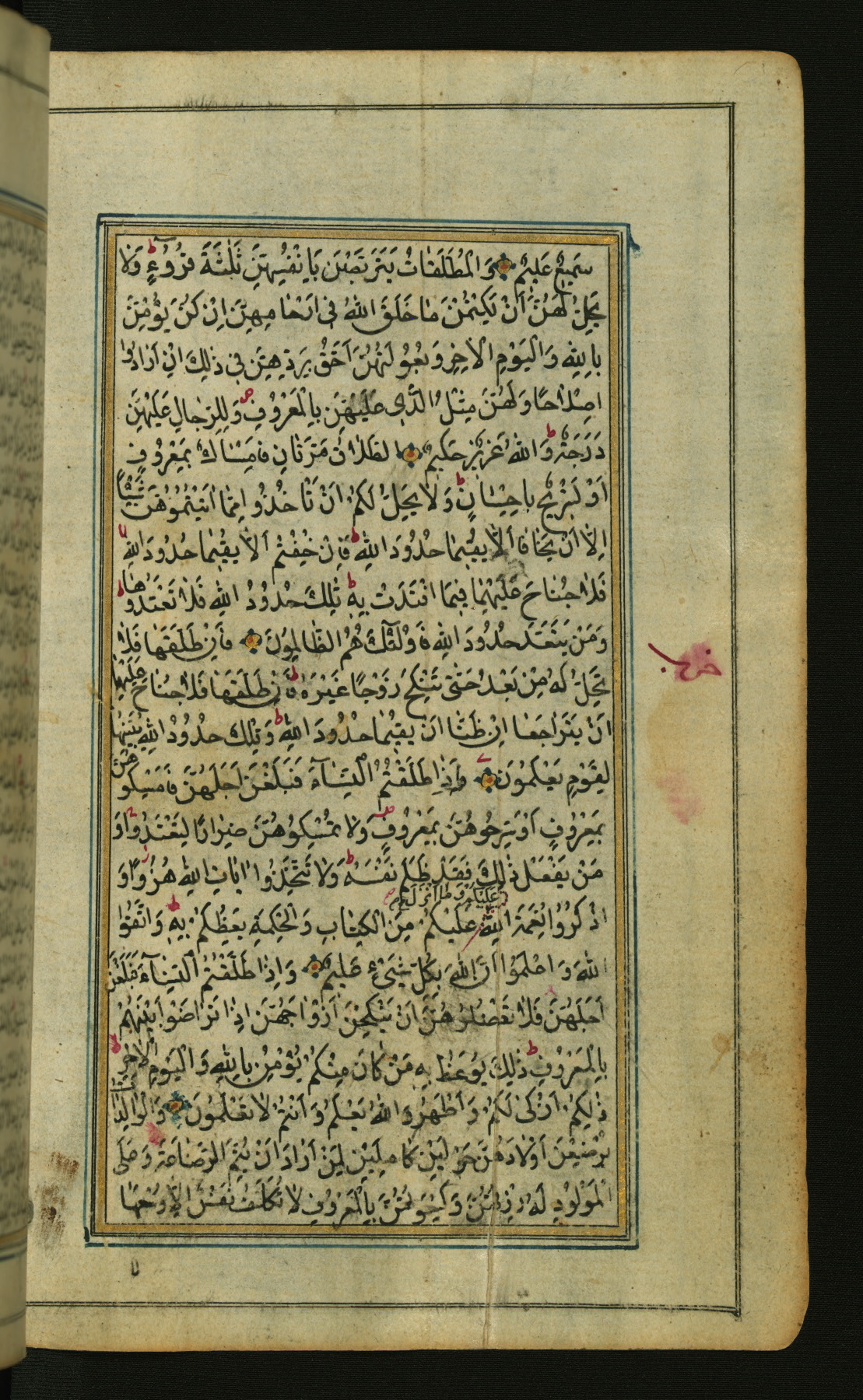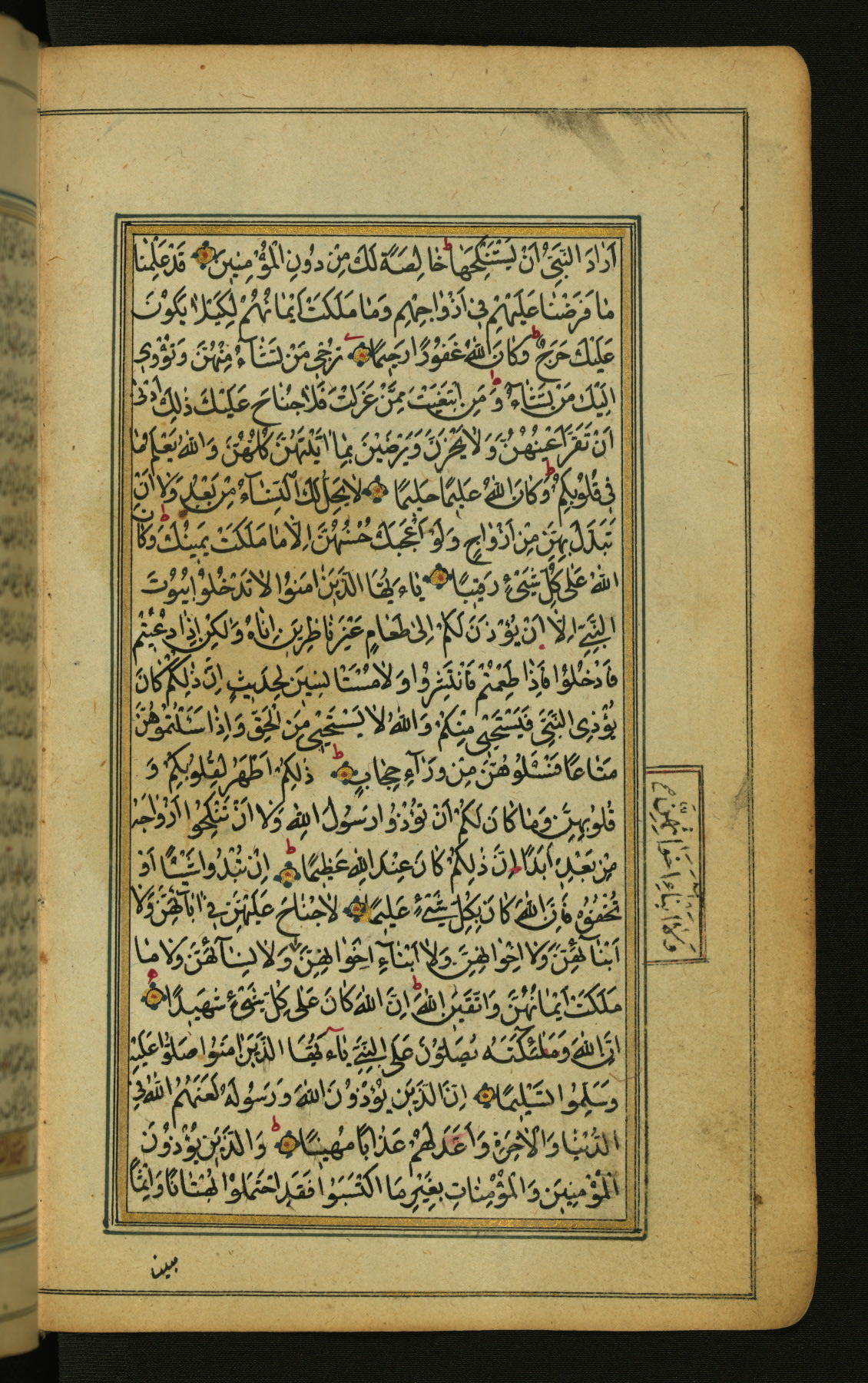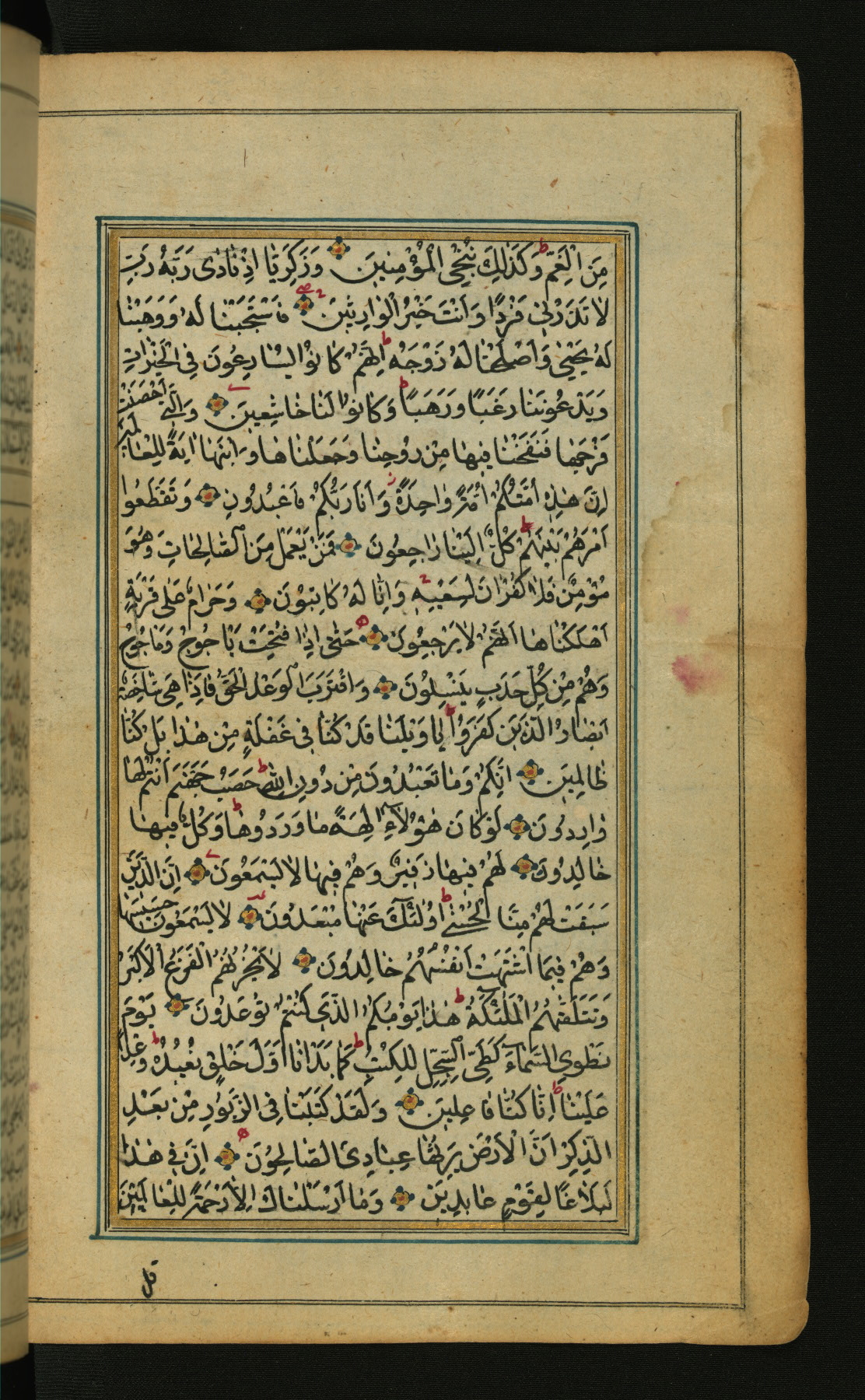 This manuscript is a small illuminated single-volume copy of the Qurʾan, likely produced in Iran. A date is inscribed on the final page, which is interpreted as 1230 AH / 1814-5 CE (fol. 186b). The manuscript opens with an illuminated double-page incipit with the verses of chapter 1 (Sūrat al-fātiḥah) and the initial verses of chapter 2 (Sūrat al-baqarah), decorated with interlinear illumination (fols. 1b-2a). The text is in vocalized naskh script in black ink with reading marks in red and text divisions, such as thirty verses (juzʾ) or sixty verses (ḥizb), in the margins. Illuminated discs with colored dots separate the verses. Chapter headings are in riqāʿ script in red ink on a gold ground. The nineteenth-century lacquer binding with a floral composition on a gold field on the upper and lower boards seems to be contemporary with the manuscript. The insides of both boards are painted with a lobed yellow central medallion and pendants on an orange field.