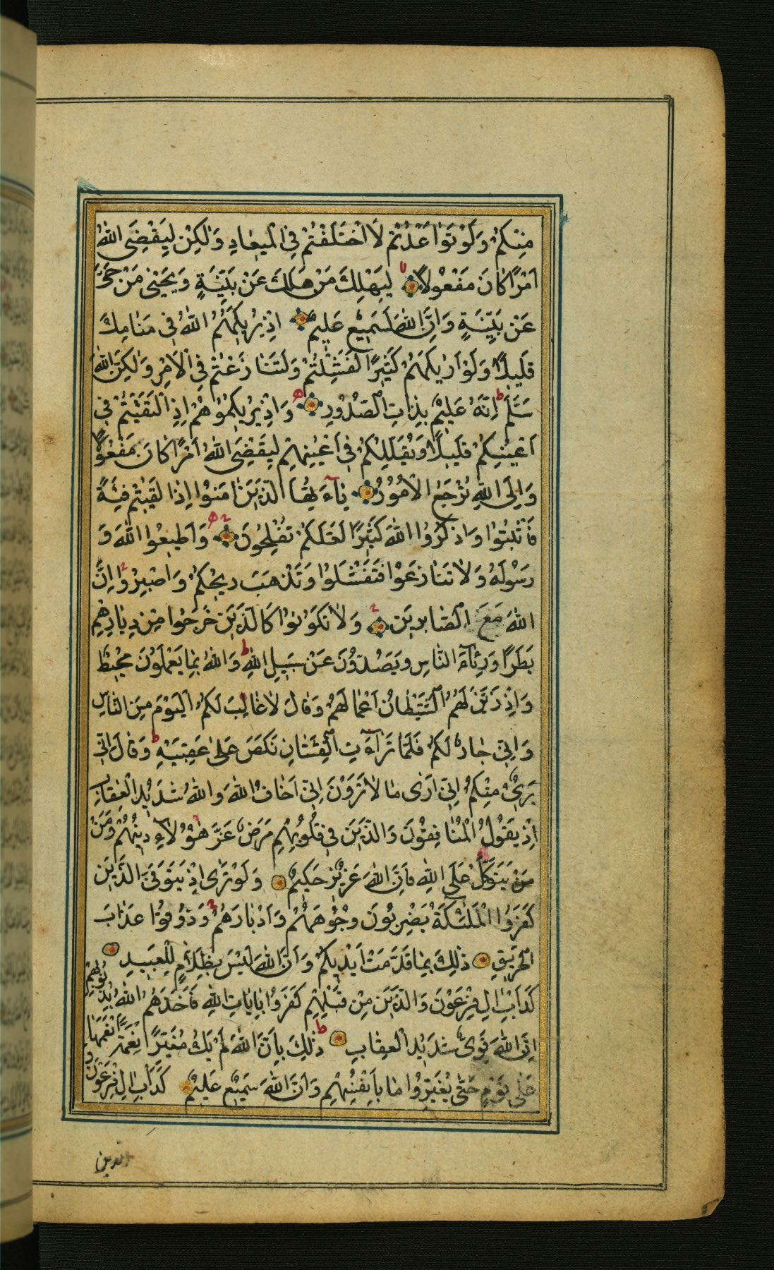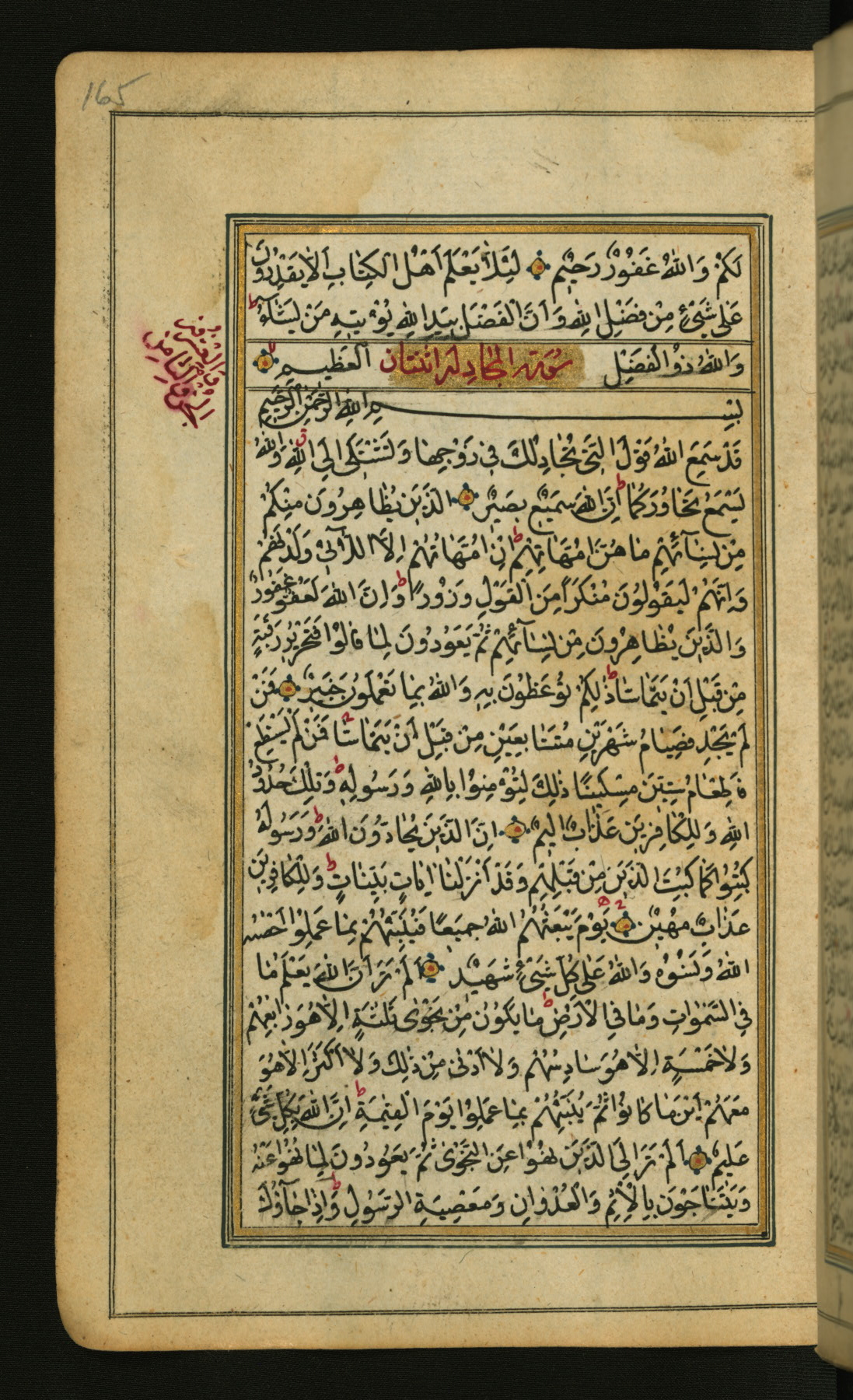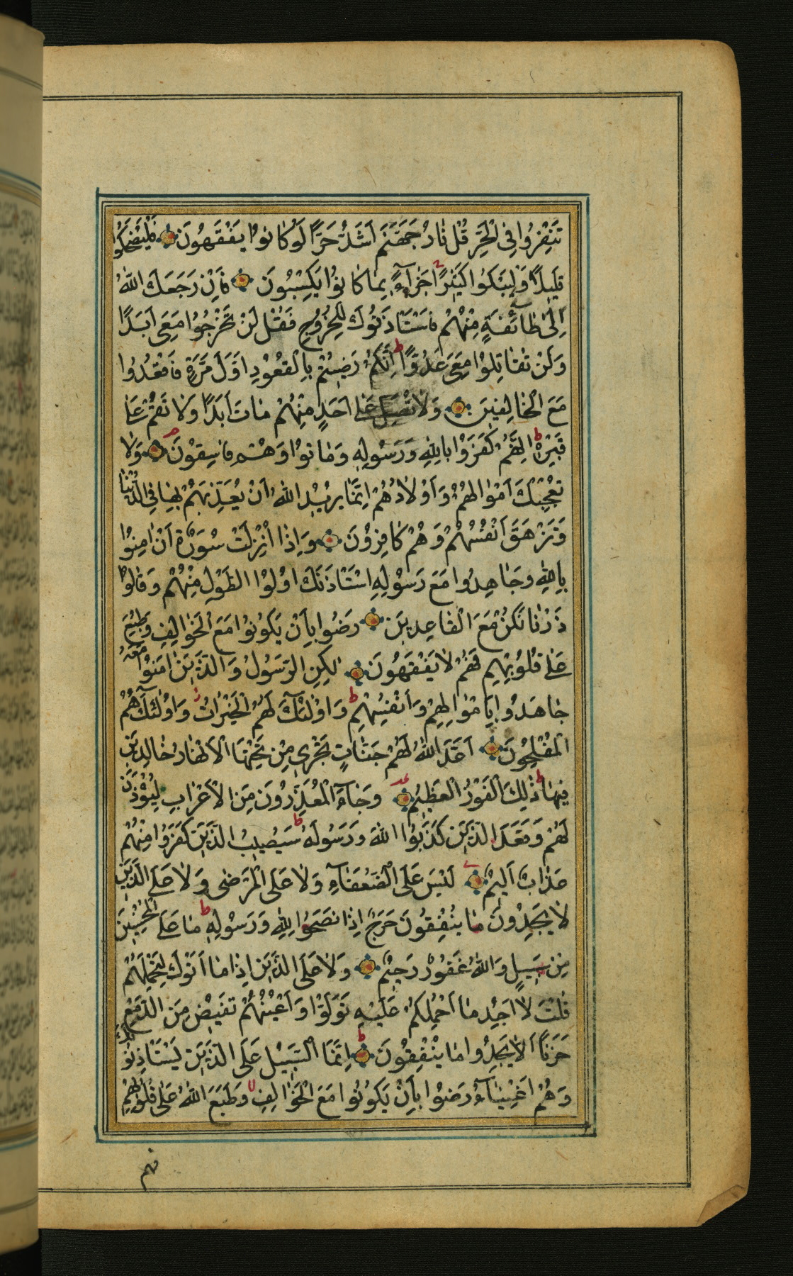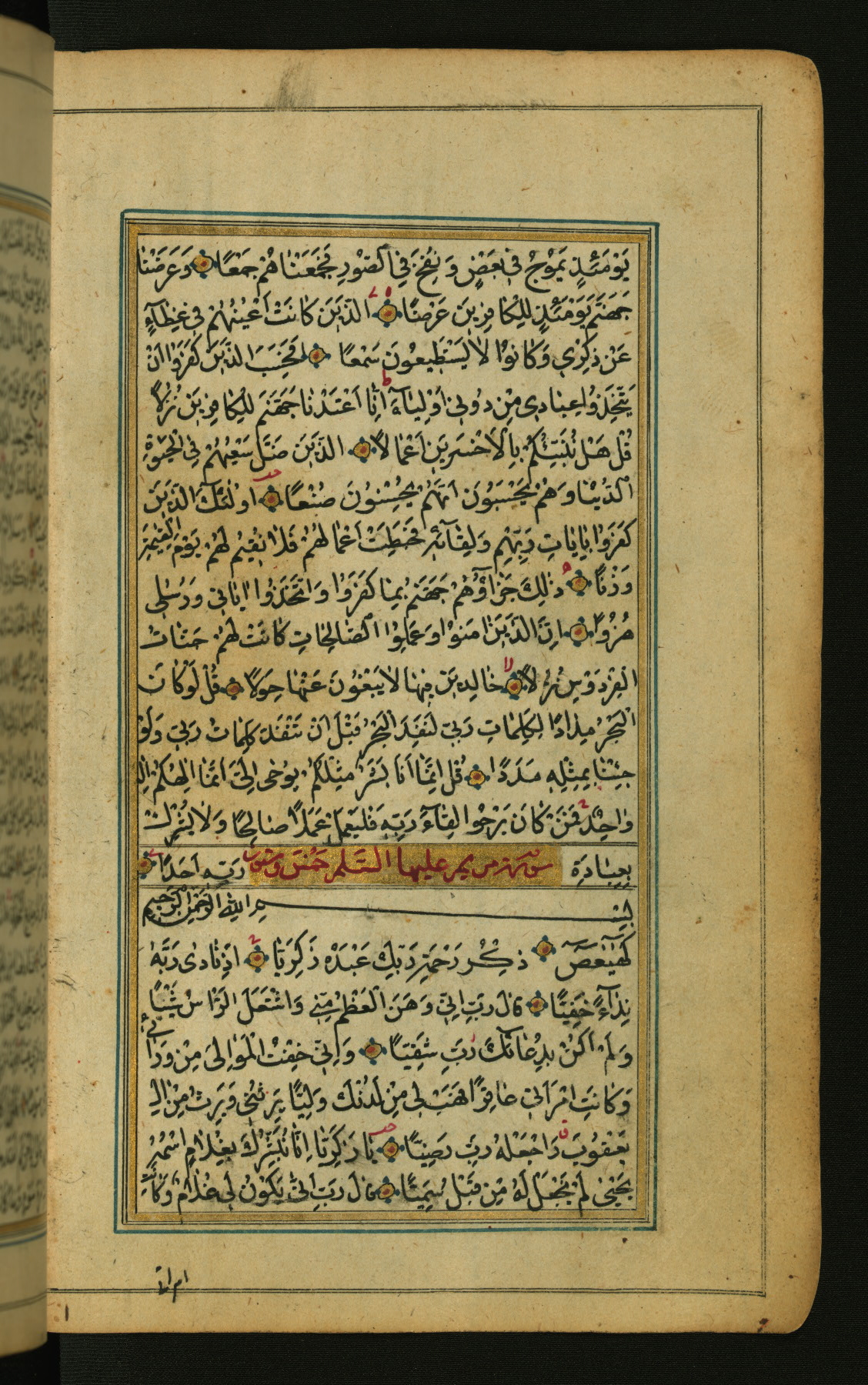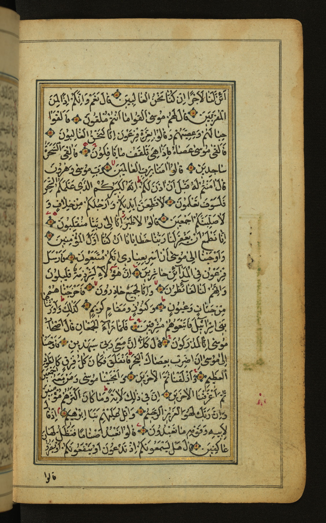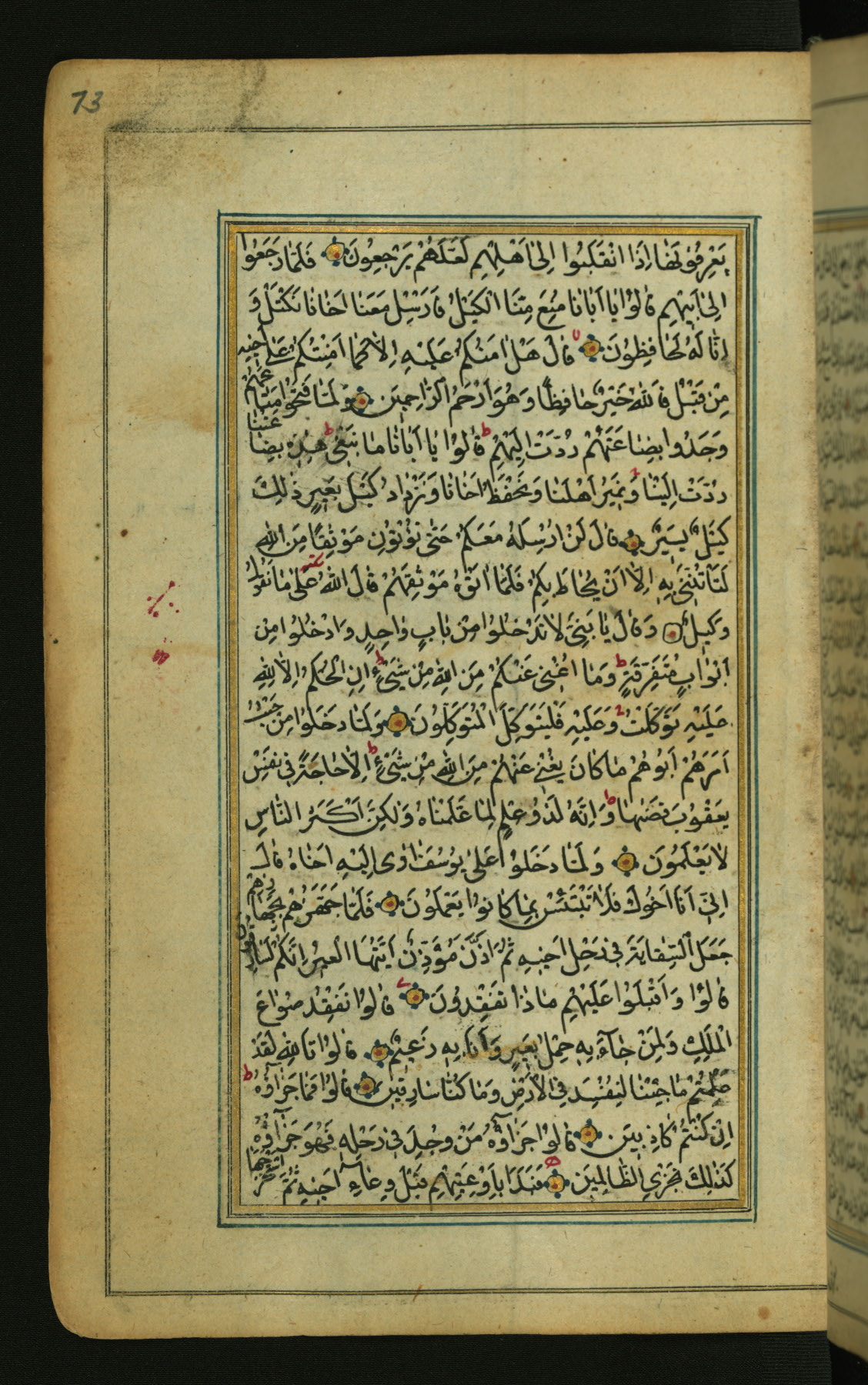 This manuscript is a small illuminated single-volume copy of the Qurʾan, likely produced in Iran. A date is inscribed on the final page, which is interpreted as 1230 AH / 1814-5 CE (fol. 186b). The manuscript opens with an illuminated double-page incipit with the verses of chapter 1 (Sūrat al-fātiḥah) and the initial verses of chapter 2 (Sūrat al-baqarah), decorated with interlinear illumination (fols. 1b-2a). The text is in vocalized naskh script in black ink with reading marks in red and text divisions, such as thirty verses (juzʾ) or sixty verses (ḥizb), in the margins. Illuminated discs with colored dots separate the verses. Chapter headings are in riqāʿ script in red ink on a gold ground. The nineteenth-century lacquer binding with a floral composition on a gold field on the upper and lower boards seems to be contemporary with the manuscript. The insides of both boards are painted with a lobed yellow central medallion and pendants on an orange field.