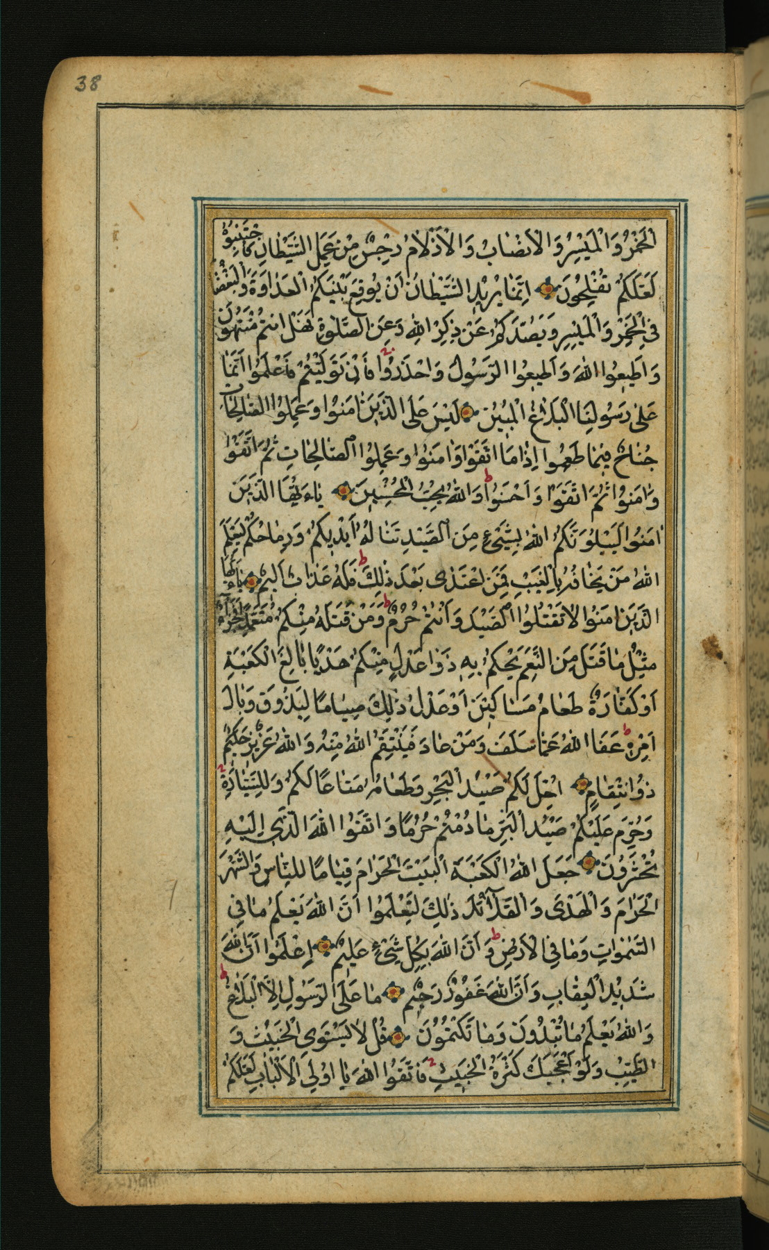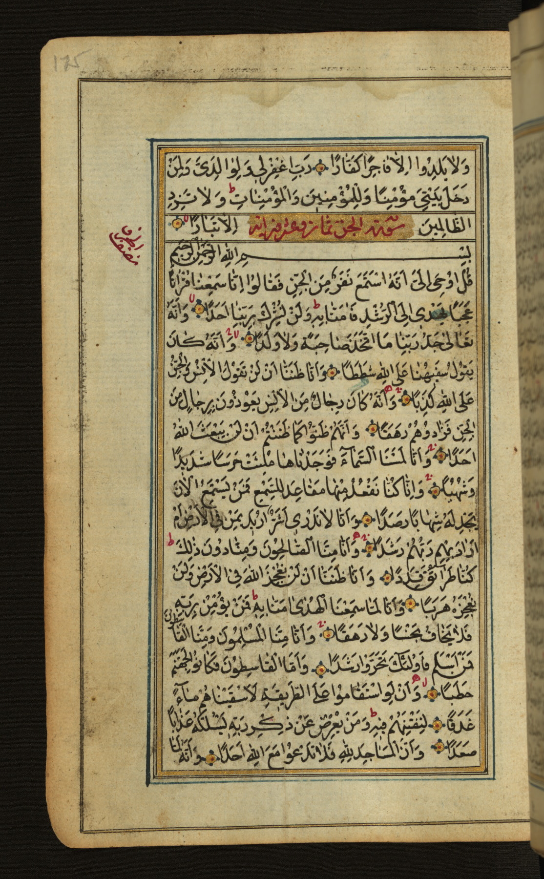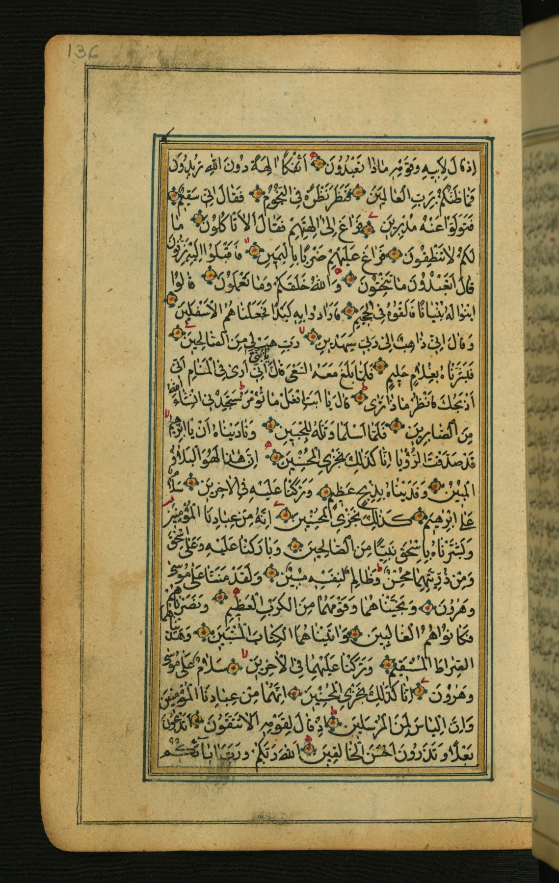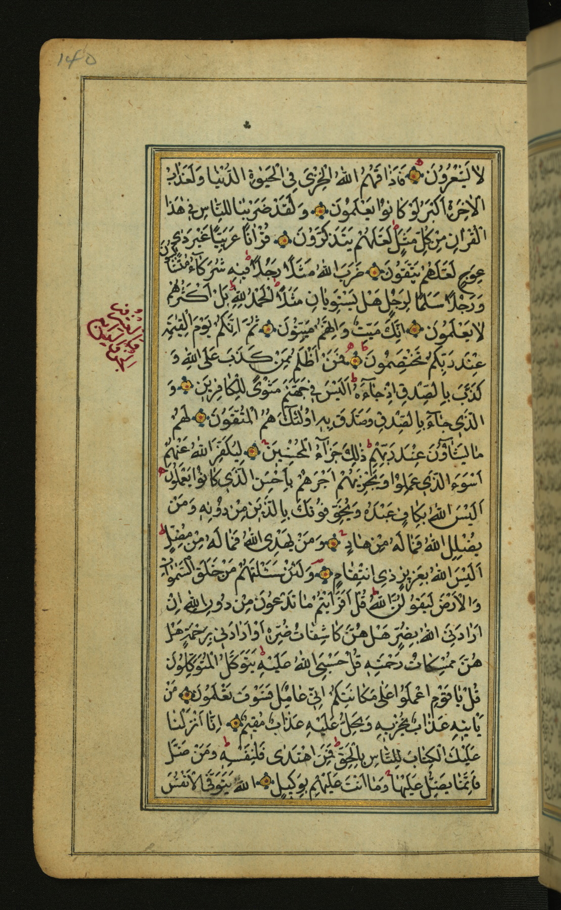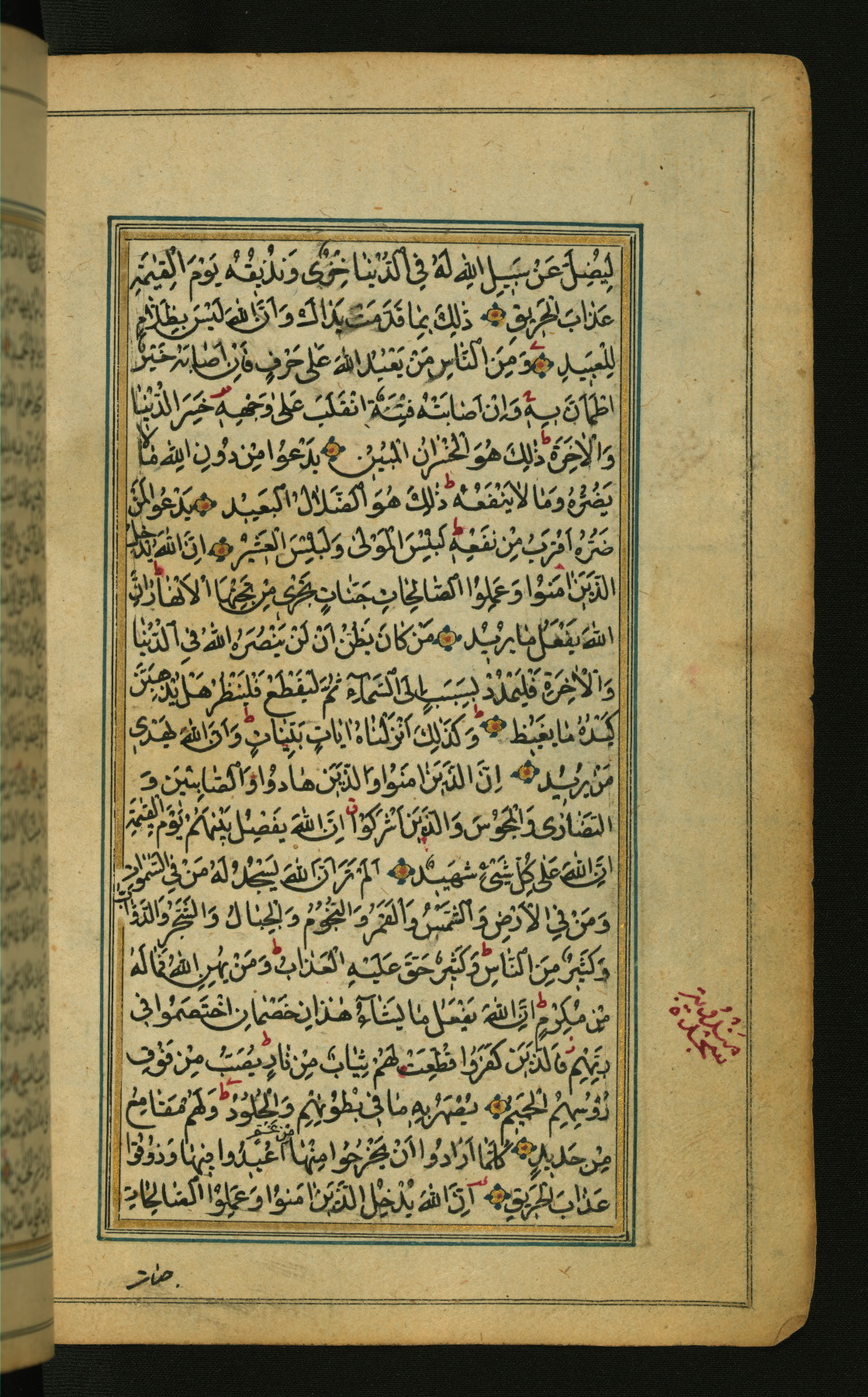 This manuscript is a small illuminated single-volume copy of the Qurʾan, likely produced in Iran. A date is inscribed on the final page, which is interpreted as 1230 AH / 1814-5 CE (fol. 186b). The manuscript opens with an illuminated double-page incipit with the verses of chapter 1 (Sūrat al-fātiḥah) and the initial verses of chapter 2 (Sūrat al-baqarah), decorated with interlinear illumination (fols. 1b-2a). The text is in vocalized naskh script in black ink with reading marks in red and text divisions, such as thirty verses (juzʾ) or sixty verses (ḥizb), in the margins. Illuminated discs with colored dots separate the verses. Chapter headings are in riqāʿ script in red ink on a gold ground. The nineteenth-century lacquer binding with a floral composition on a gold field on the upper and lower boards seems to be contemporary with the manuscript. The insides of both boards are painted with a lobed yellow central medallion and pendants on an orange field.