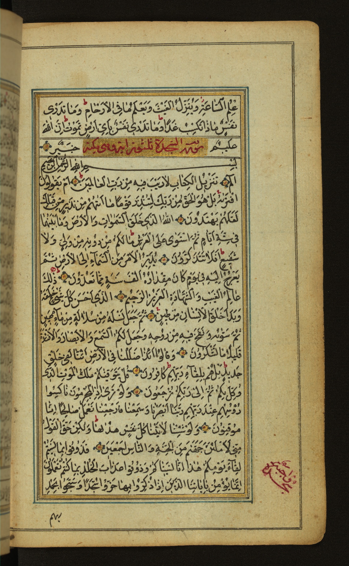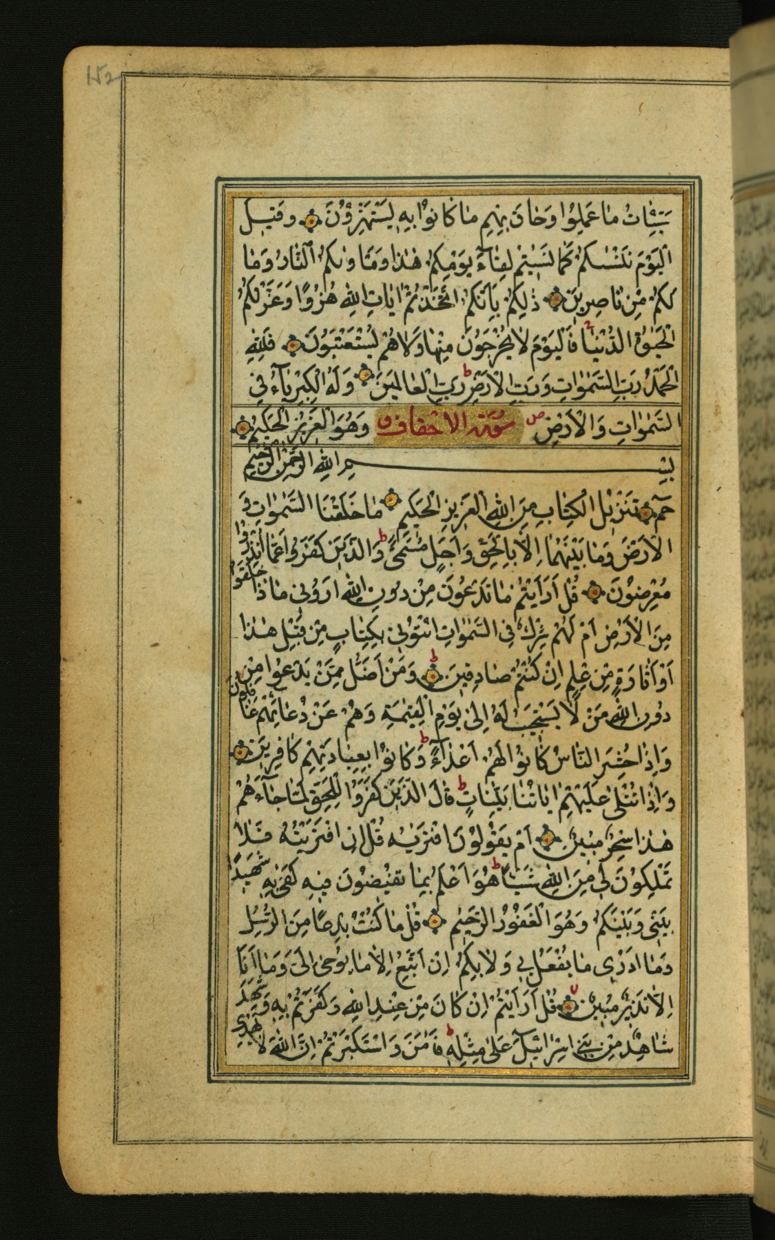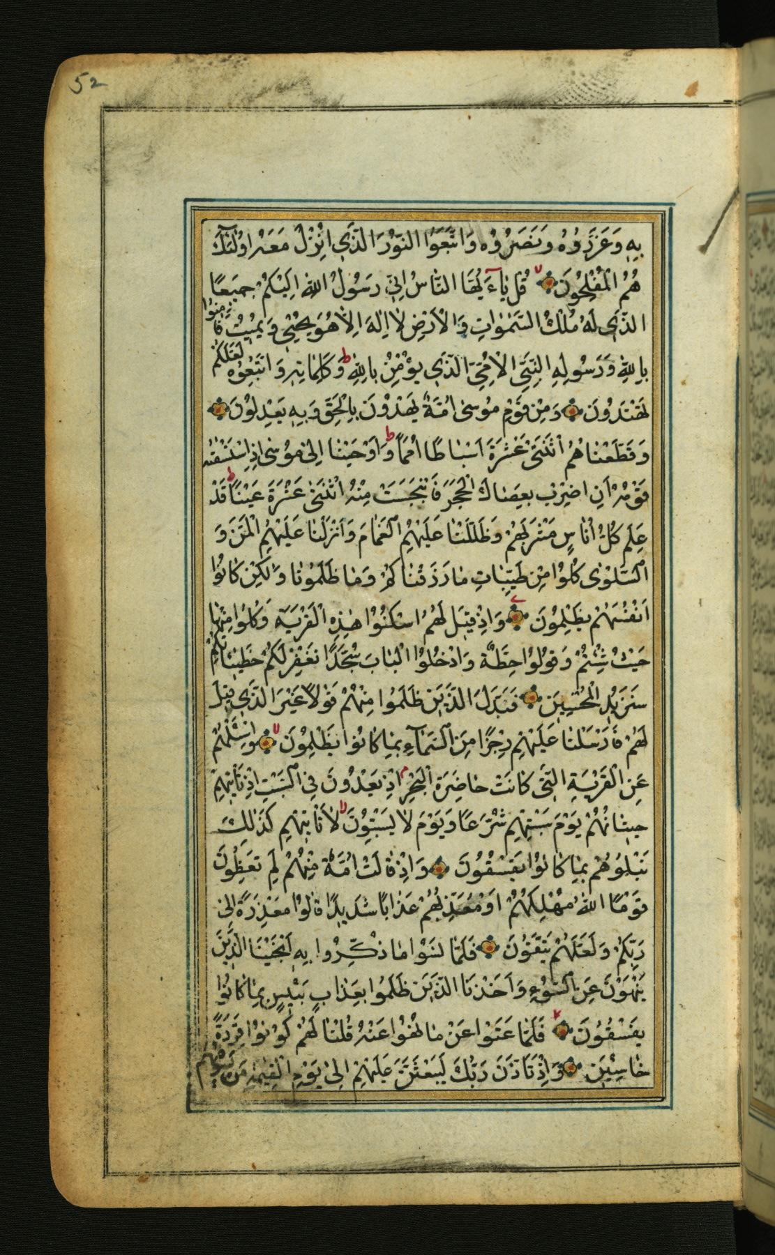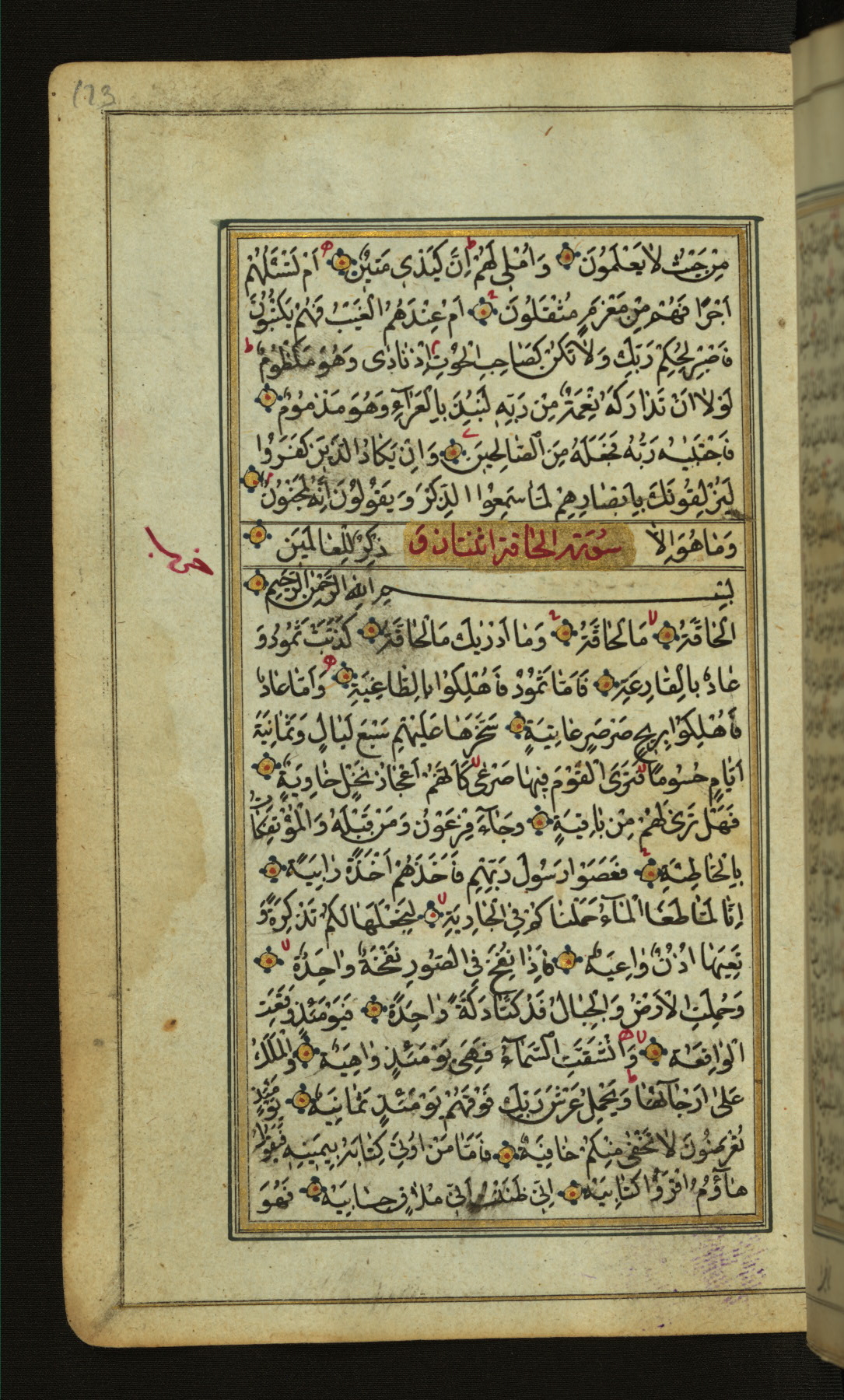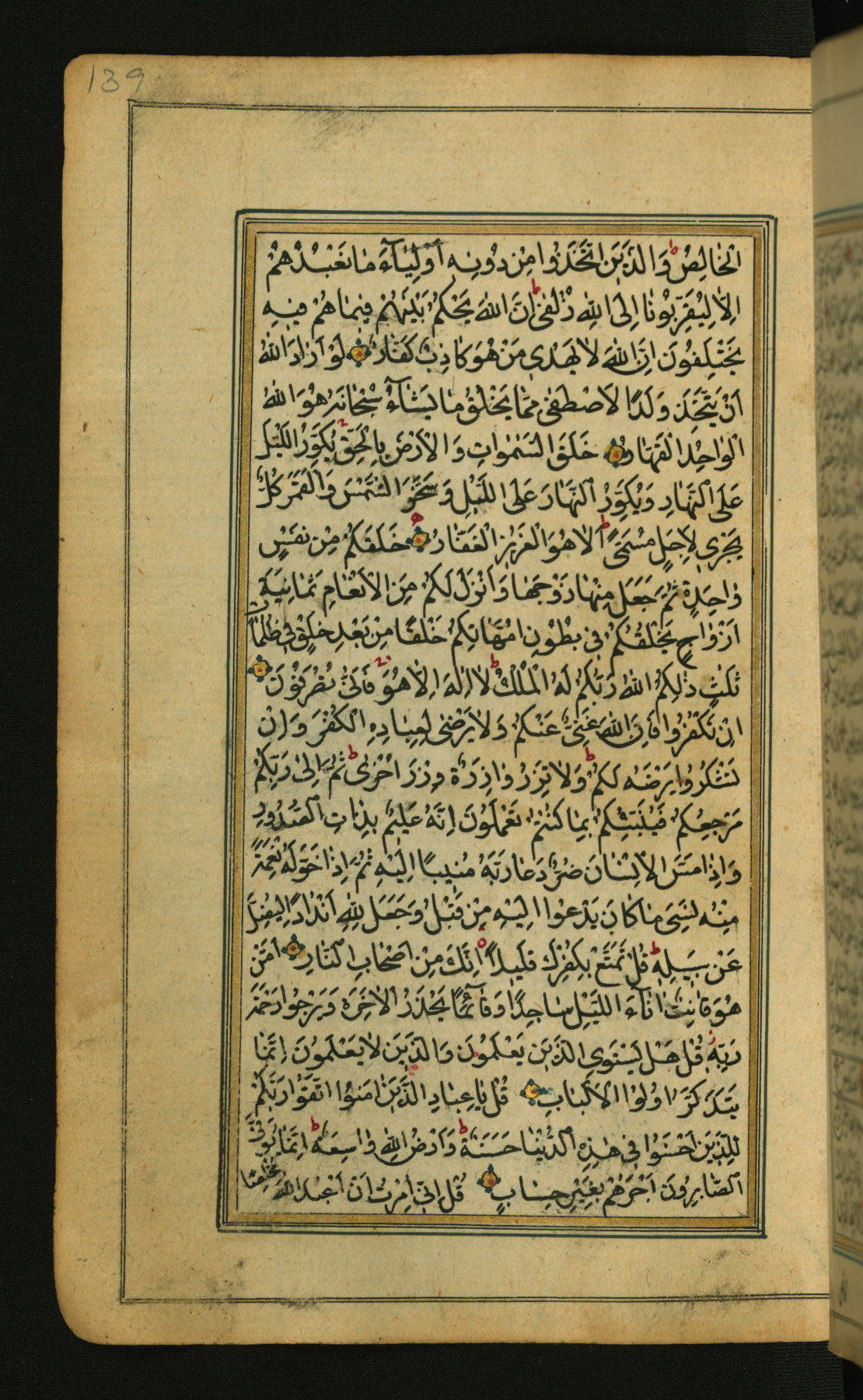 This manuscript is a small illuminated single-volume copy of the Qurʾan, likely produced in Iran. A date is inscribed on the final page, which is interpreted as 1230 AH / 1814-5 CE (fol. 186b). The manuscript opens with an illuminated double-page incipit with the verses of chapter 1 (Sūrat al-fātiḥah) and the initial verses of chapter 2 (Sūrat al-baqarah), decorated with interlinear illumination (fols. 1b-2a). The text is in vocalized naskh script in black ink with reading marks in red and text divisions, such as thirty verses (juzʾ) or sixty verses (ḥizb), in the margins. Illuminated discs with colored dots separate the verses. Chapter headings are in riqāʿ script in red ink on a gold ground. The nineteenth-century lacquer binding with a floral composition on a gold field on the upper and lower boards seems to be contemporary with the manuscript. The insides of both boards are painted with a lobed yellow central medallion and pendants on an orange field.