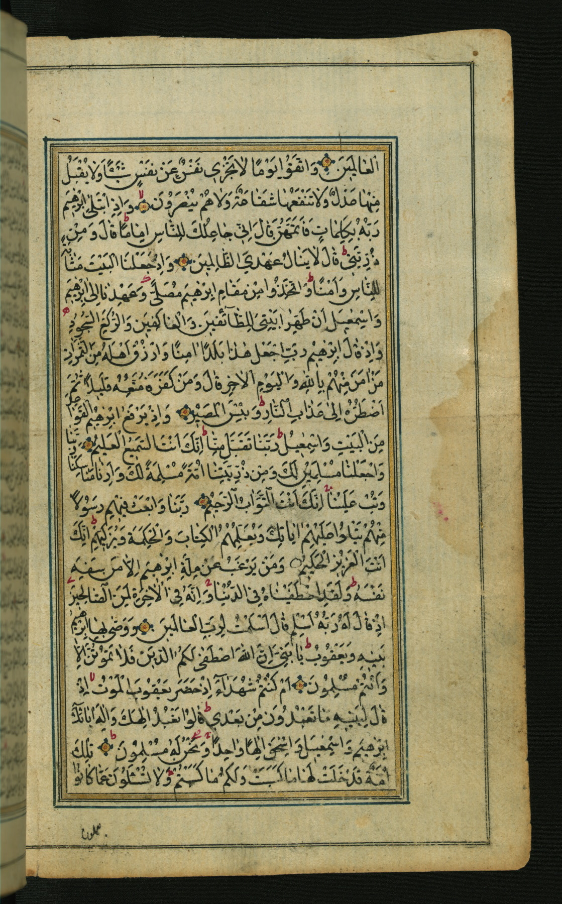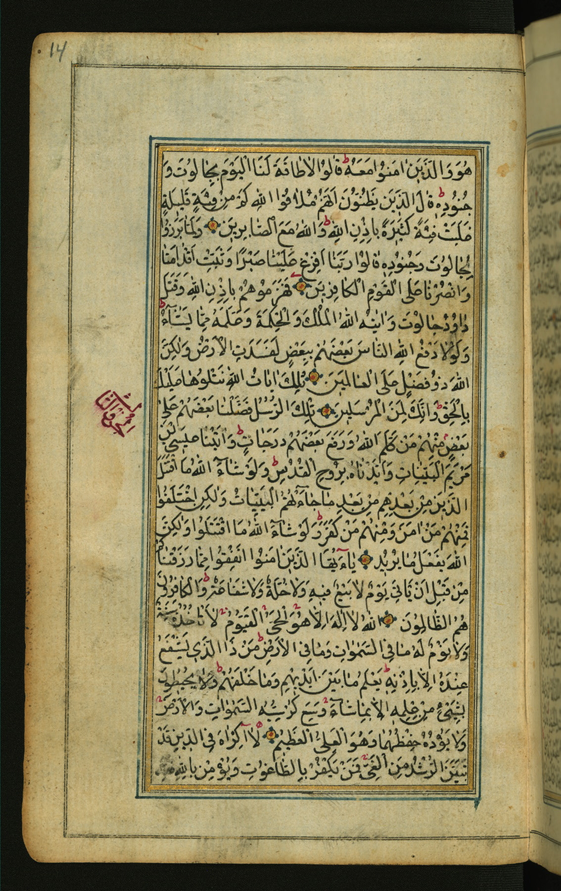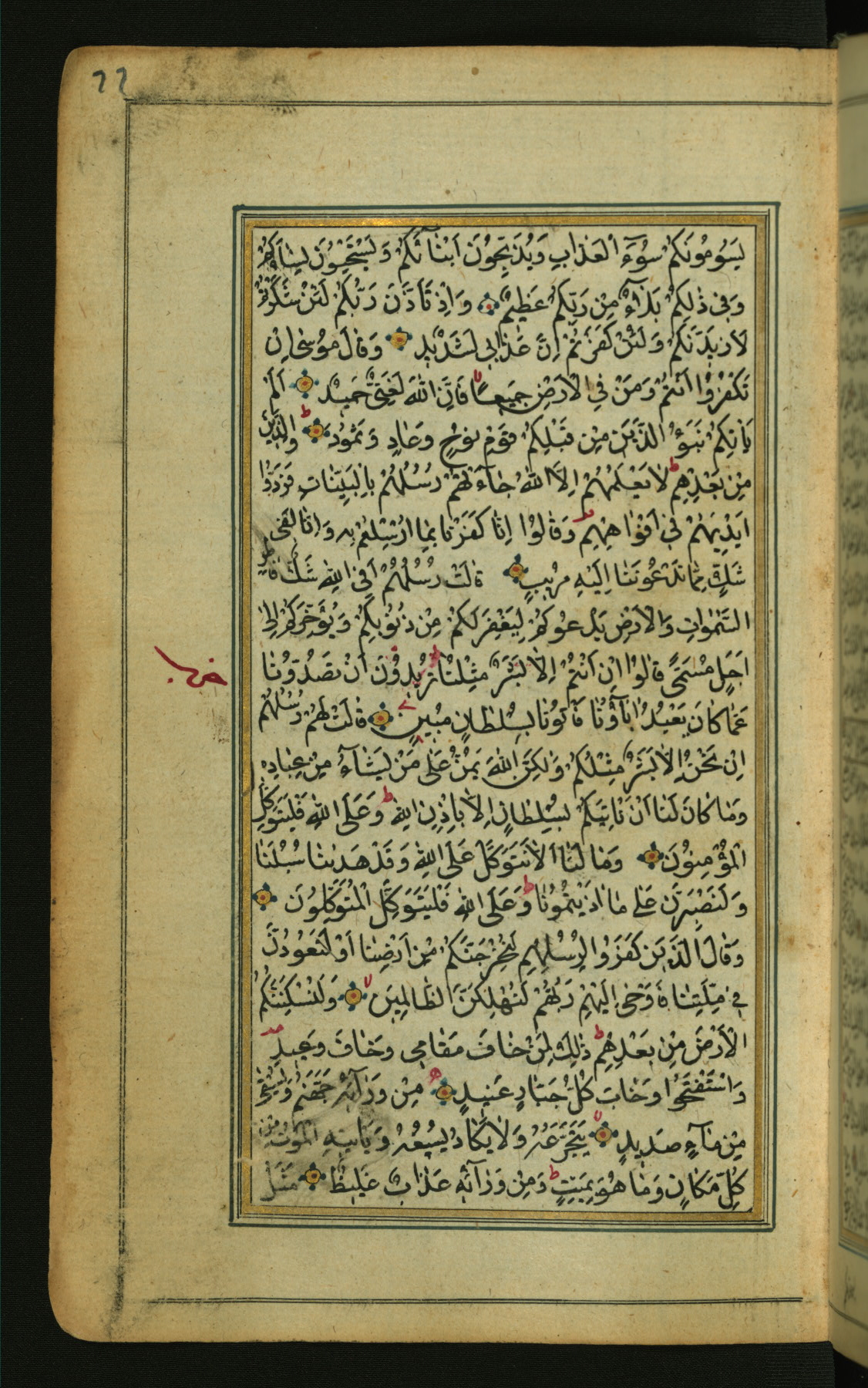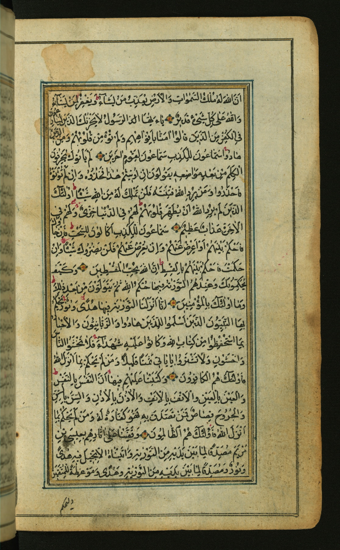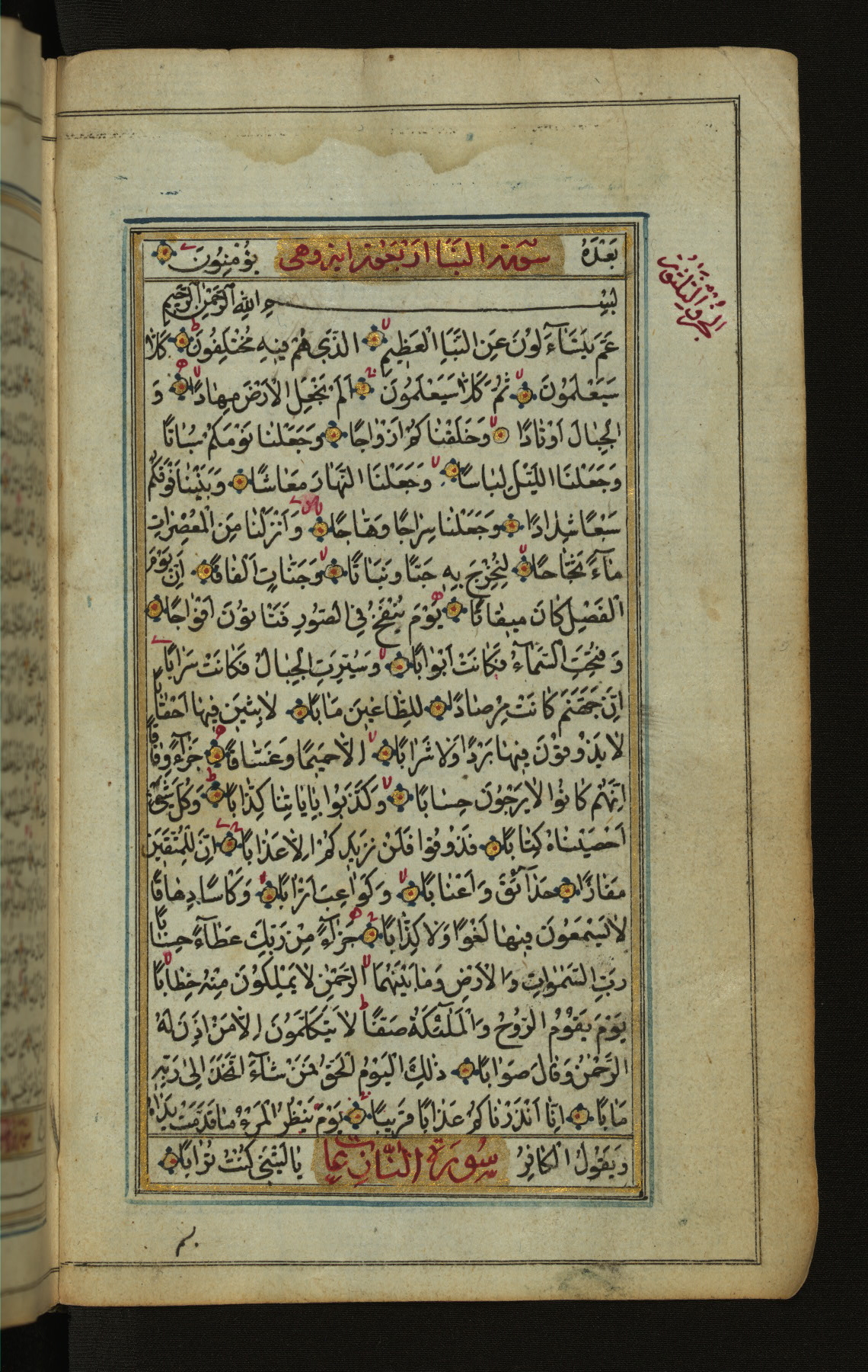 This manuscript is a small illuminated single-volume copy of the Qurʾan, likely produced in Iran. A date is inscribed on the final page, which is interpreted as 1230 AH / 1814-5 CE (fol. 186b). The manuscript opens with an illuminated double-page incipit with the verses of chapter 1 (Sūrat al-fātiḥah) and the initial verses of chapter 2 (Sūrat al-baqarah), decorated with interlinear illumination (fols. 1b-2a). The text is in vocalized naskh script in black ink with reading marks in red and text divisions, such as thirty verses (juzʾ) or sixty verses (ḥizb), in the margins. Illuminated discs with colored dots separate the verses. Chapter headings are in riqāʿ script in red ink on a gold ground. The nineteenth-century lacquer binding with a floral composition on a gold field on the upper and lower boards seems to be contemporary with the manuscript. The insides of both boards are painted with a lobed yellow central medallion and pendants on an orange field.