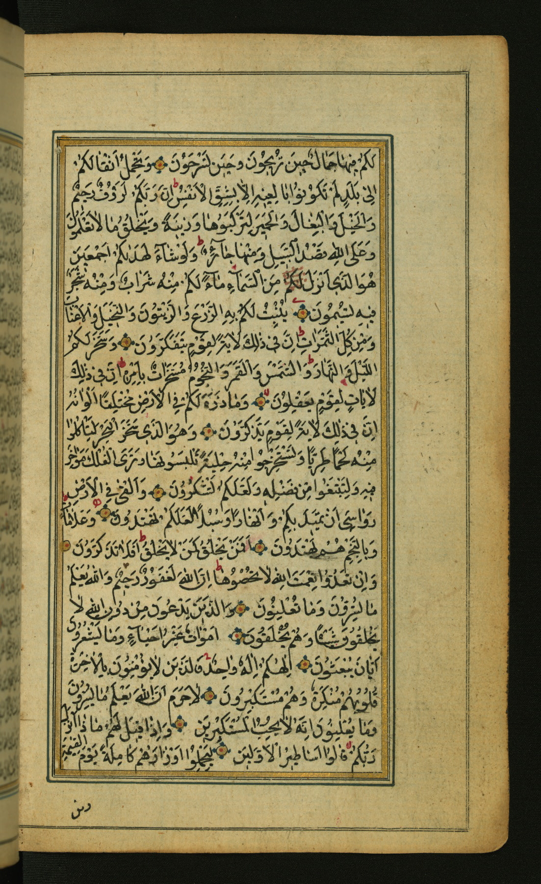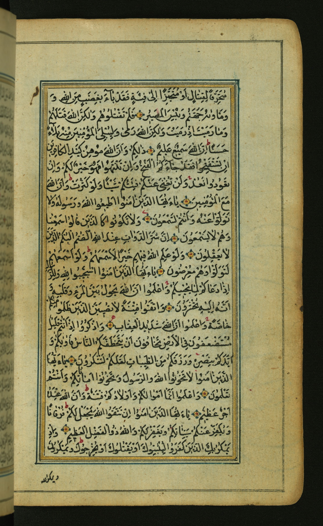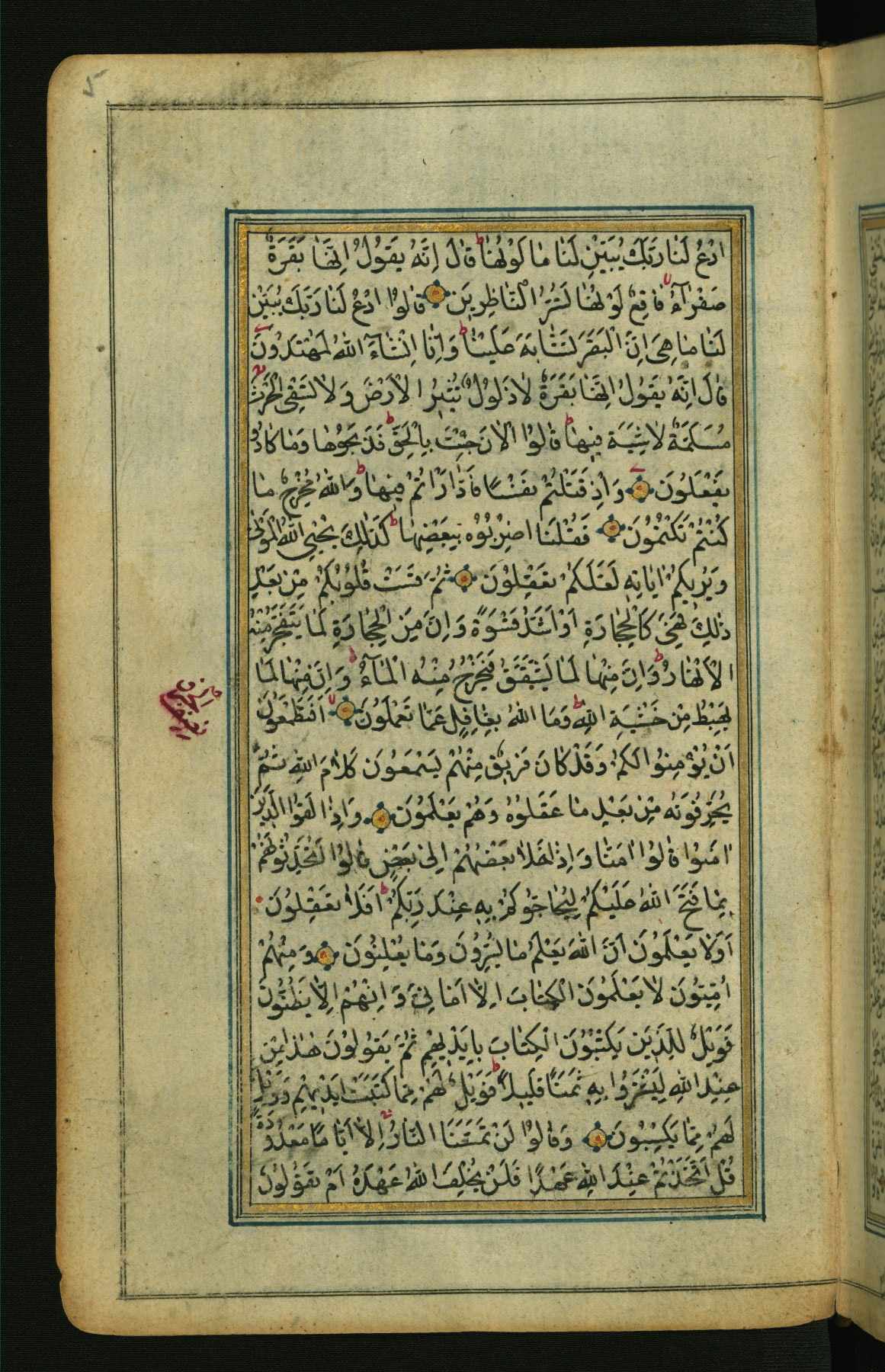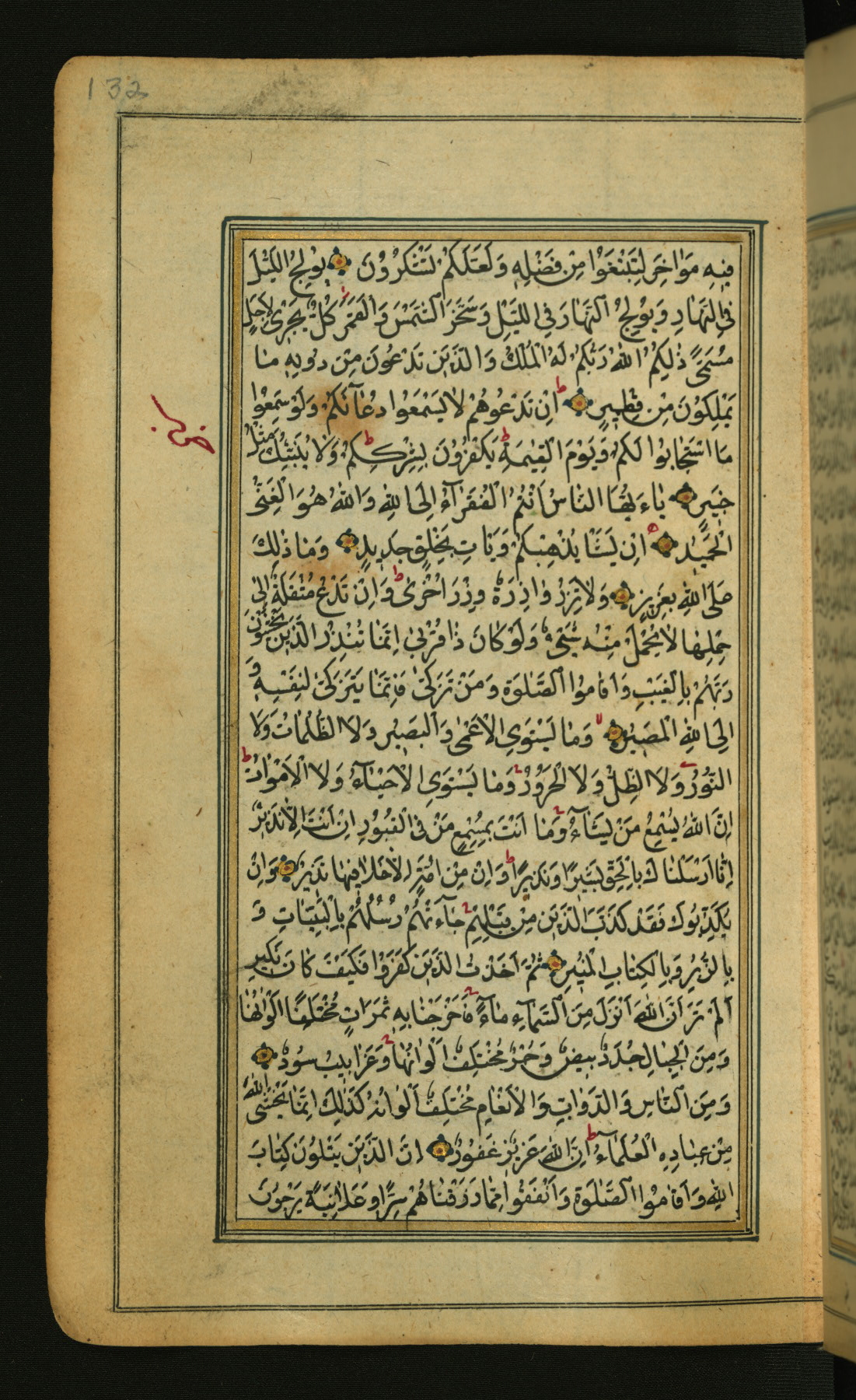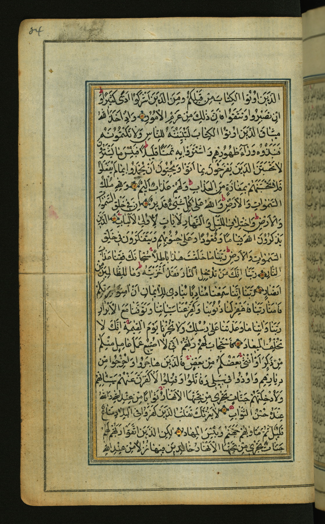 This manuscript is a small illuminated single-volume copy of the Qurʾan, likely produced in Iran. A date is inscribed on the final page, which is interpreted as 1230 AH / 1814-5 CE (fol. 186b). The manuscript opens with an illuminated double-page incipit with the verses of chapter 1 (Sūrat al-fātiḥah) and the initial verses of chapter 2 (Sūrat al-baqarah), decorated with interlinear illumination (fols. 1b-2a). The text is in vocalized naskh script in black ink with reading marks in red and text divisions, such as thirty verses (juzʾ) or sixty verses (ḥizb), in the margins. Illuminated discs with colored dots separate the verses. Chapter headings are in riqāʿ script in red ink on a gold ground. The nineteenth-century lacquer binding with a floral composition on a gold field on the upper and lower boards seems to be contemporary with the manuscript. The insides of both boards are painted with a lobed yellow central medallion and pendants on an orange field.
