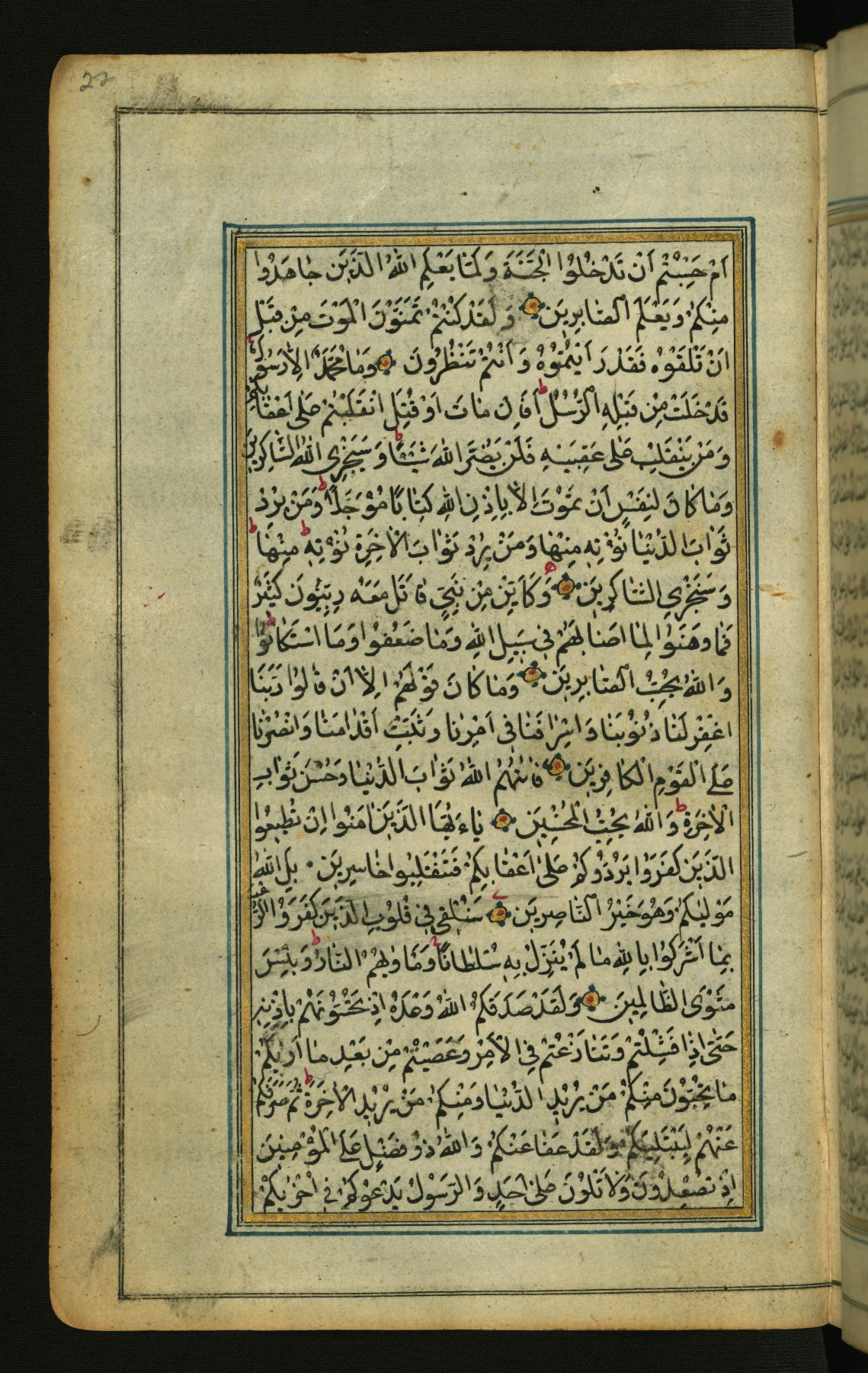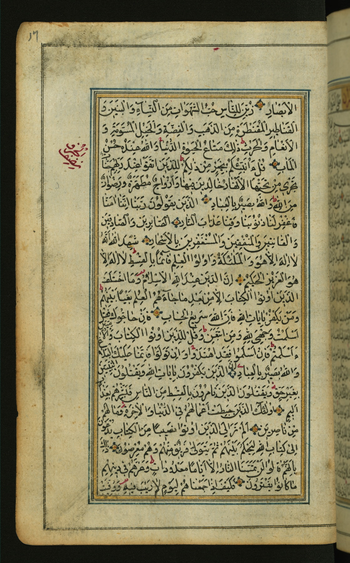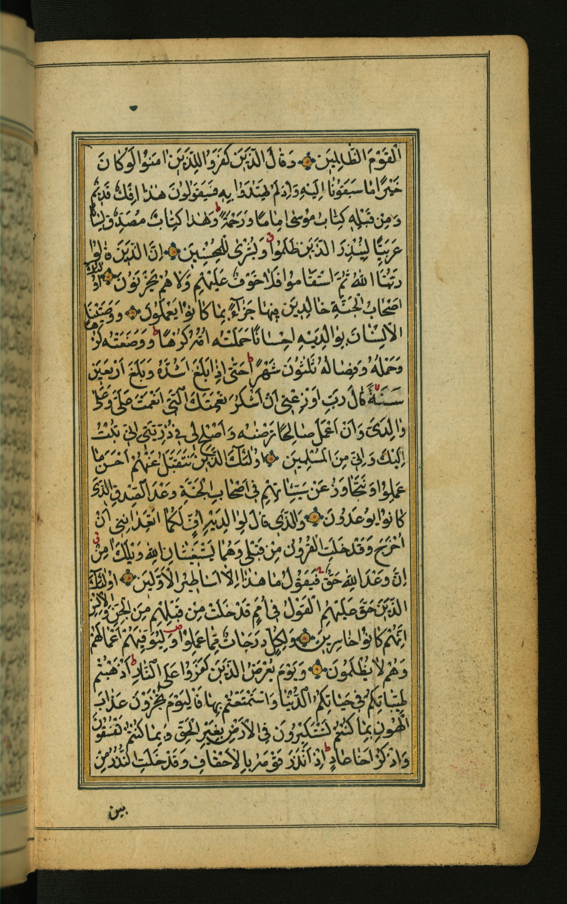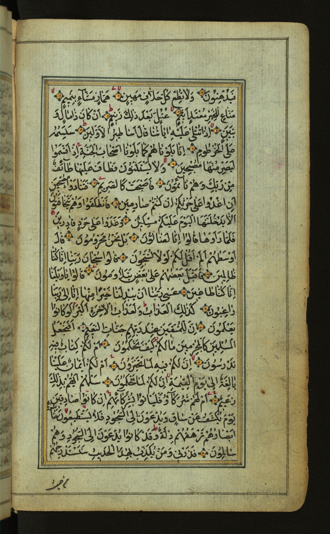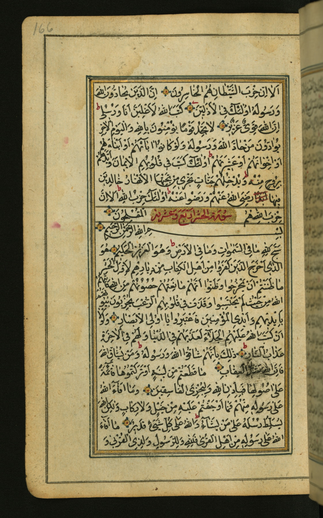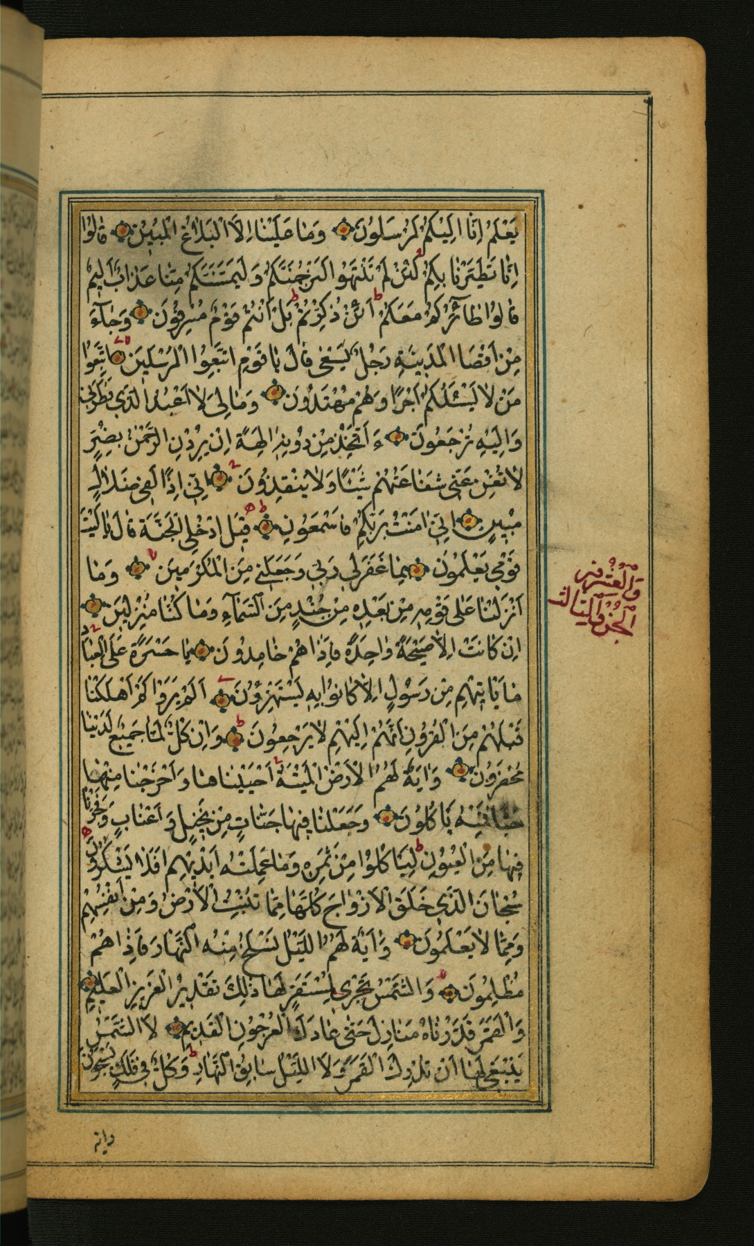This manuscript is a small illuminated single-volume copy of the Qurʾan, likely produced in Iran. A date is inscribed on the final page, which is interpreted as 1230 AH / 1814-5 CE (fol. 186b). The manuscript opens with an illuminated double-page incipit with the verses of chapter 1 (Sūrat al-fātiḥah) and the initial verses of chapter 2 (Sūrat al-baqarah), decorated with interlinear illumination (fols. 1b-2a). The text is in vocalized naskh script in black ink with reading marks in red and text divisions, such as thirty verses (juzʾ) or sixty verses (ḥizb), in the margins. Illuminated discs with colored dots separate the verses. Chapter headings are in riqāʿ script in red ink on a gold ground. The nineteenth-century lacquer binding with a floral composition on a gold field on the upper and lower boards seems to be contemporary with the manuscript. The insides of both boards are painted with a lobed yellow central medallion and pendants on an orange field.