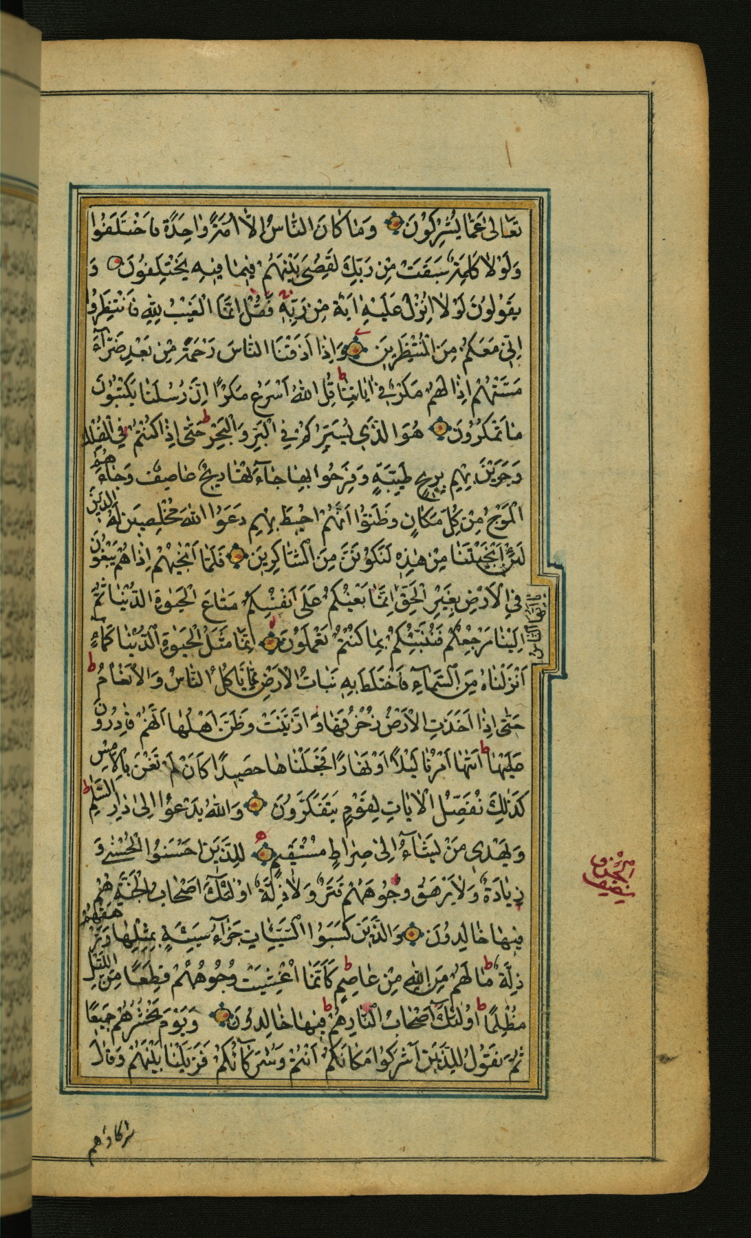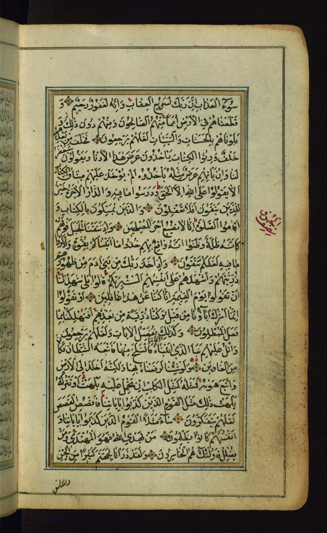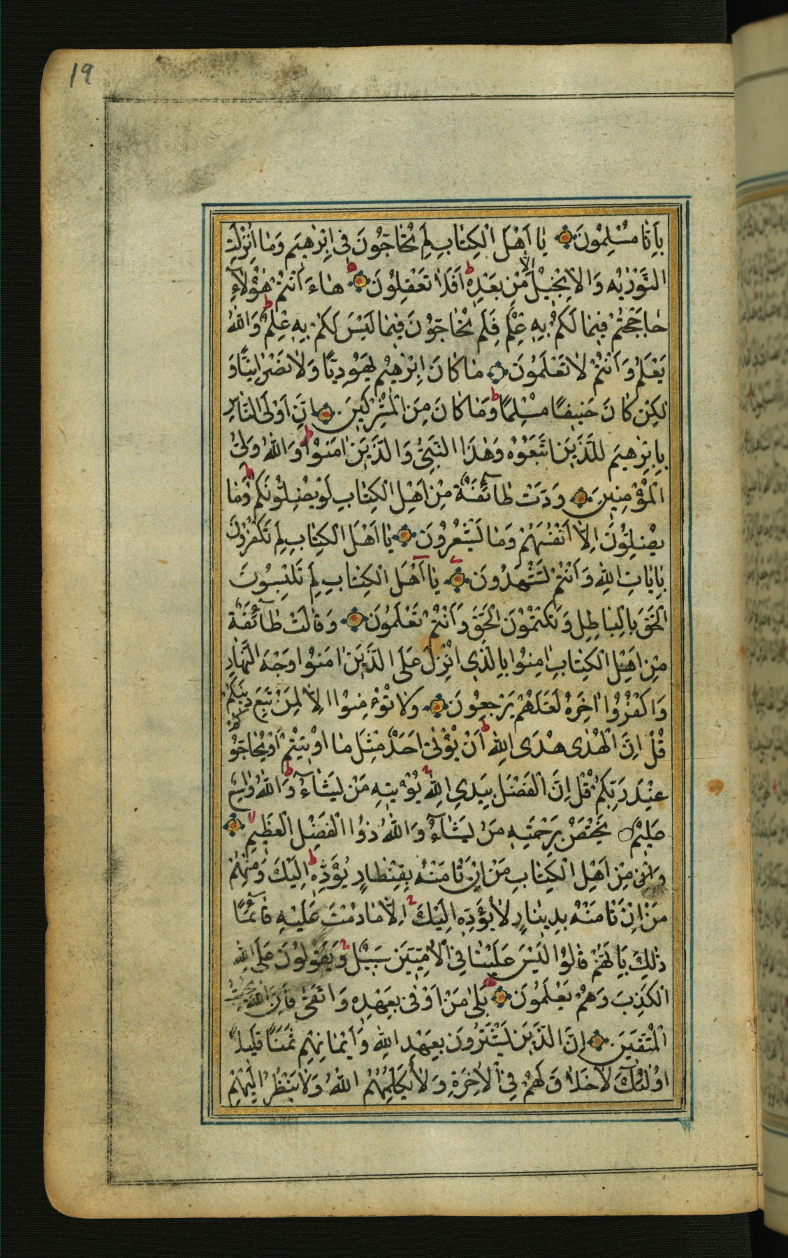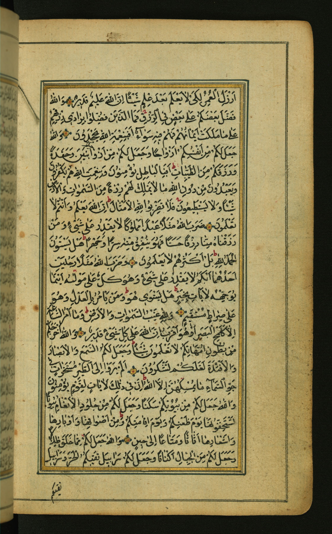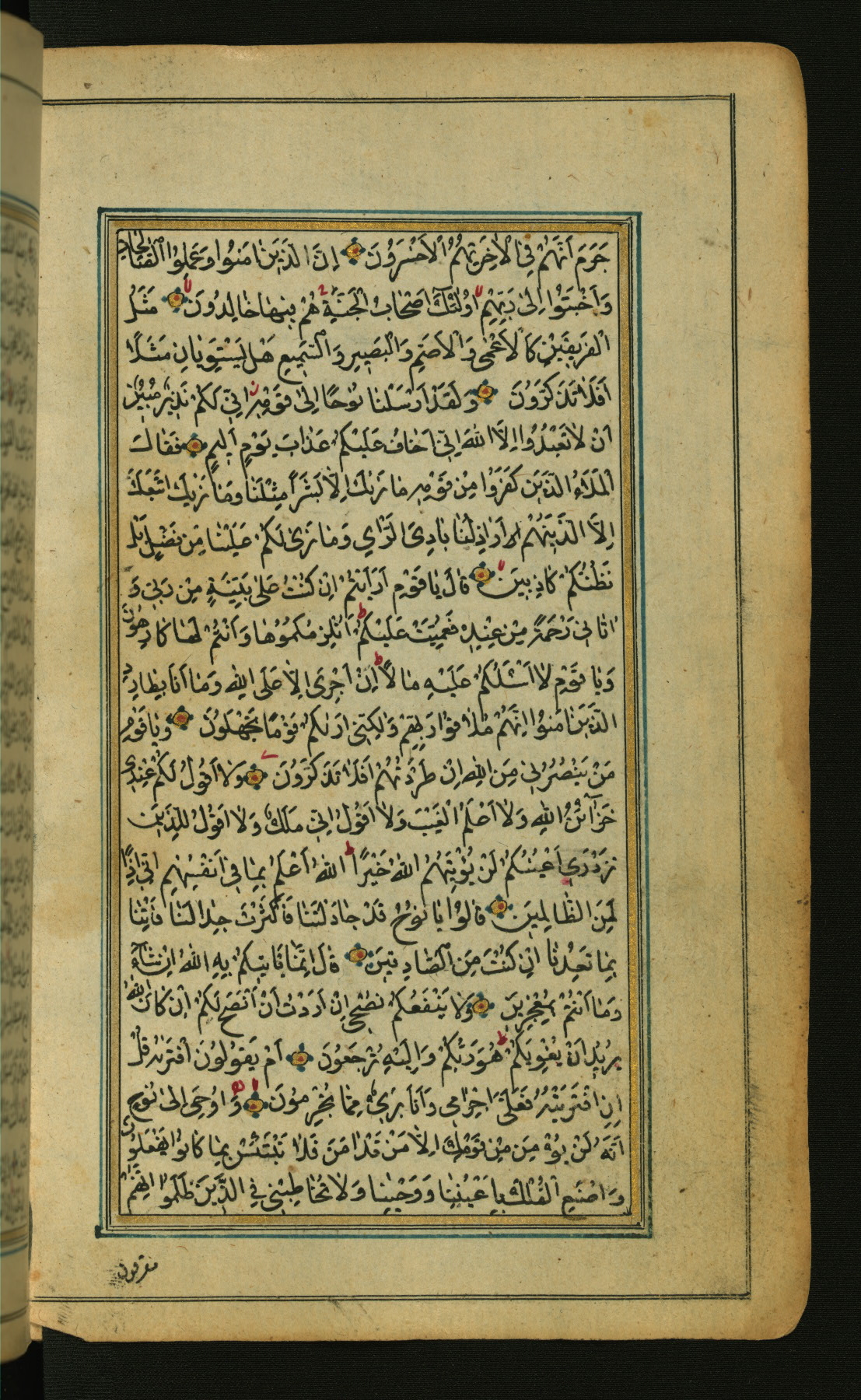 This manuscript is a small illuminated single-volume copy of the Qurʾan, likely produced in Iran. A date is inscribed on the final page, which is interpreted as 1230 AH / 1814-5 CE (fol. 186b). The manuscript opens with an illuminated double-page incipit with the verses of chapter 1 (Sūrat al-fātiḥah) and the initial verses of chapter 2 (Sūrat al-baqarah), decorated with interlinear illumination (fols. 1b-2a). The text is in vocalized naskh script in black ink with reading marks in red and text divisions, such as thirty verses (juzʾ) or sixty verses (ḥizb), in the margins. Illuminated discs with colored dots separate the verses. Chapter headings are in riqāʿ script in red ink on a gold ground. The nineteenth-century lacquer binding with a floral composition on a gold field on the upper and lower boards seems to be contemporary with the manuscript. The insides of both boards are painted with a lobed yellow central medallion and pendants on an orange field.