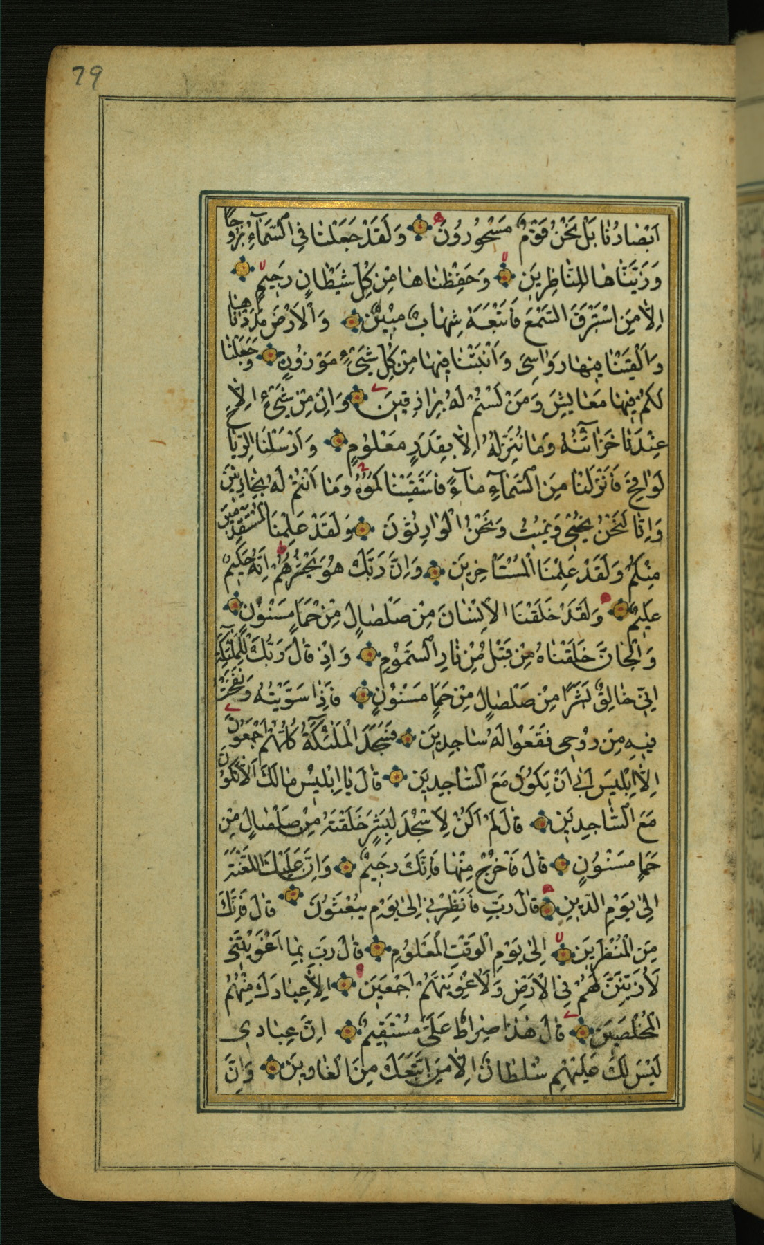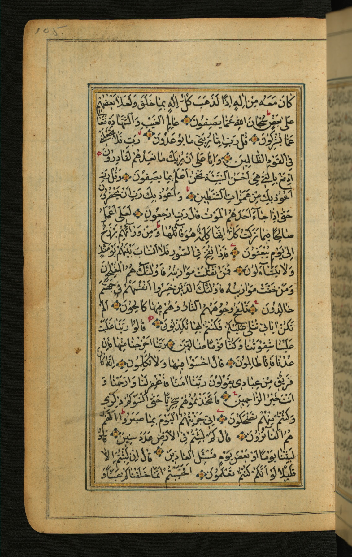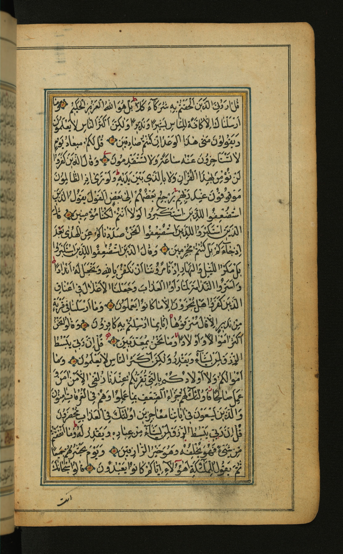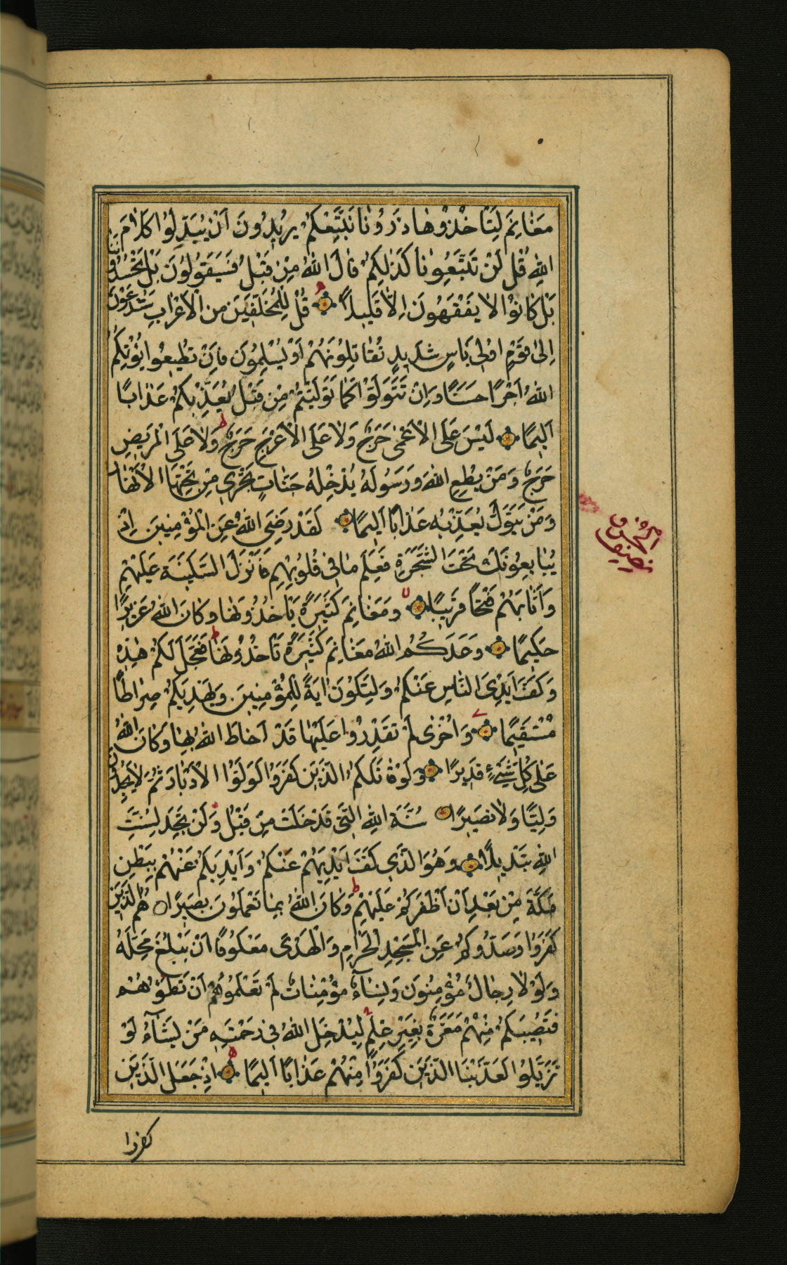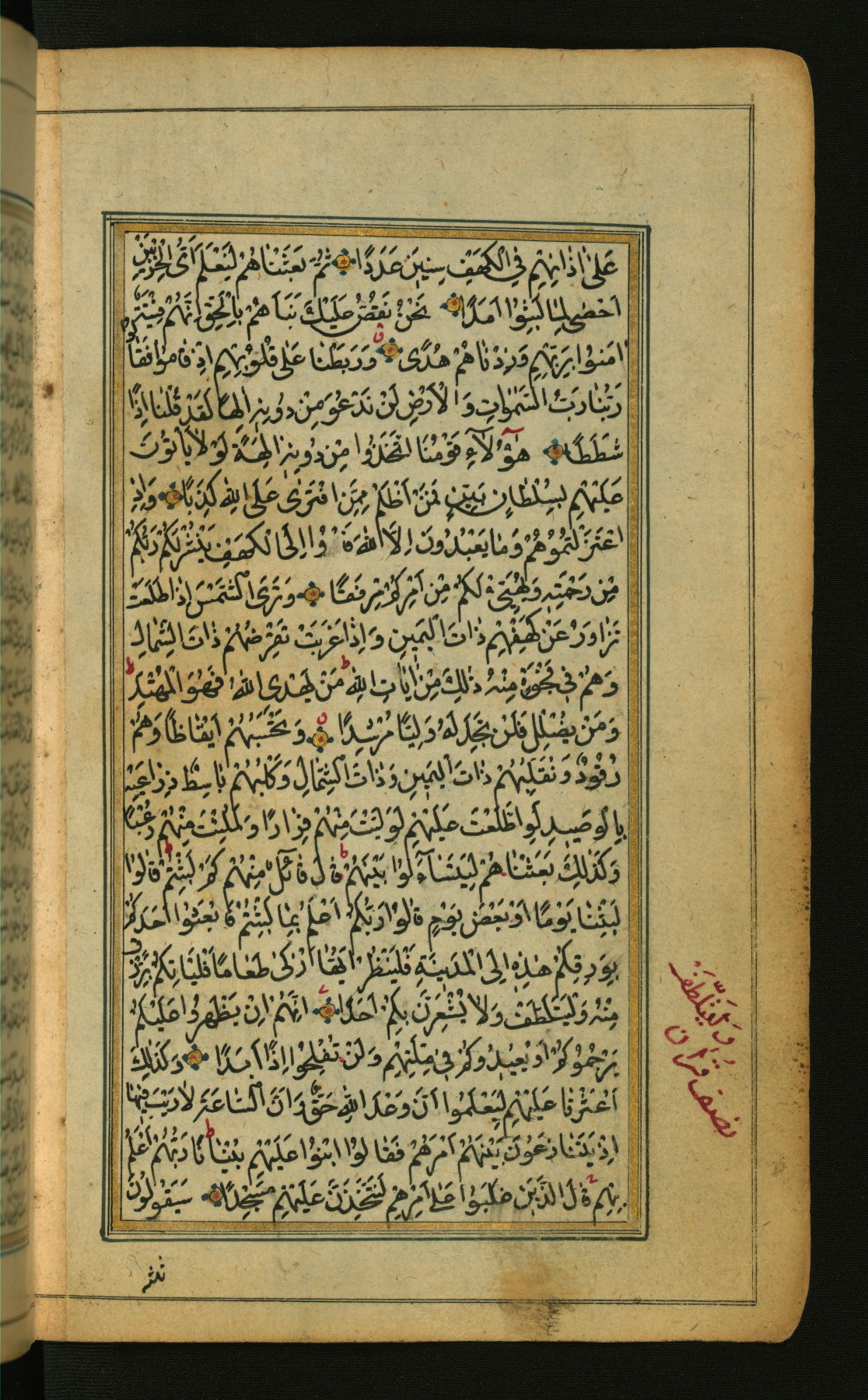 This manuscript is a small illuminated single-volume copy of the Qurʾan, likely produced in Iran. A date is inscribed on the final page, which is interpreted as 1230 AH / 1814-5 CE (fol. 186b). The manuscript opens with an illuminated double-page incipit with the verses of chapter 1 (Sūrat al-fātiḥah) and the initial verses of chapter 2 (Sūrat al-baqarah), decorated with interlinear illumination (fols. 1b-2a). The text is in vocalized naskh script in black ink with reading marks in red and text divisions, such as thirty verses (juzʾ) or sixty verses (ḥizb), in the margins. Illuminated discs with colored dots separate the verses. Chapter headings are in riqāʿ script in red ink on a gold ground. The nineteenth-century lacquer binding with a floral composition on a gold field on the upper and lower boards seems to be contemporary with the manuscript. The insides of both boards are painted with a lobed yellow central medallion and pendants on an orange field.