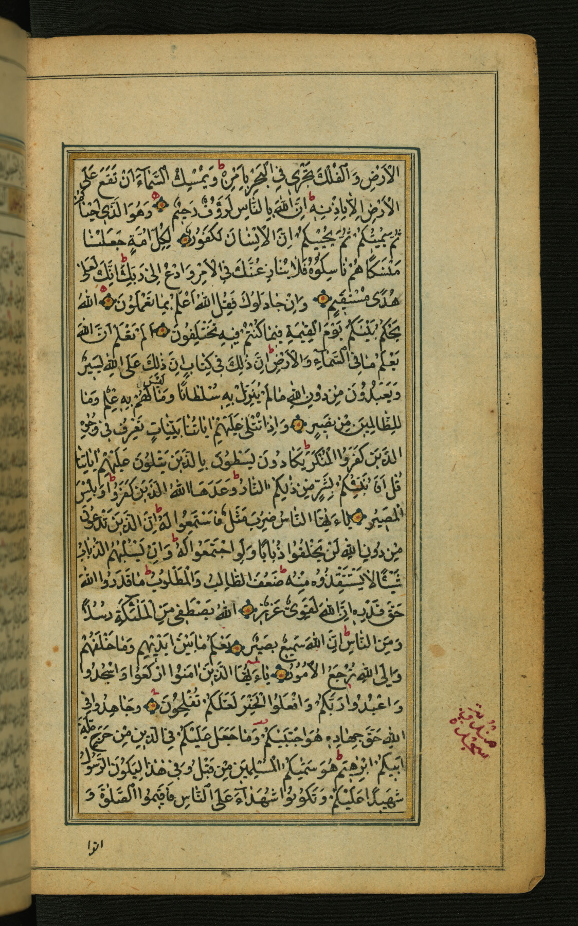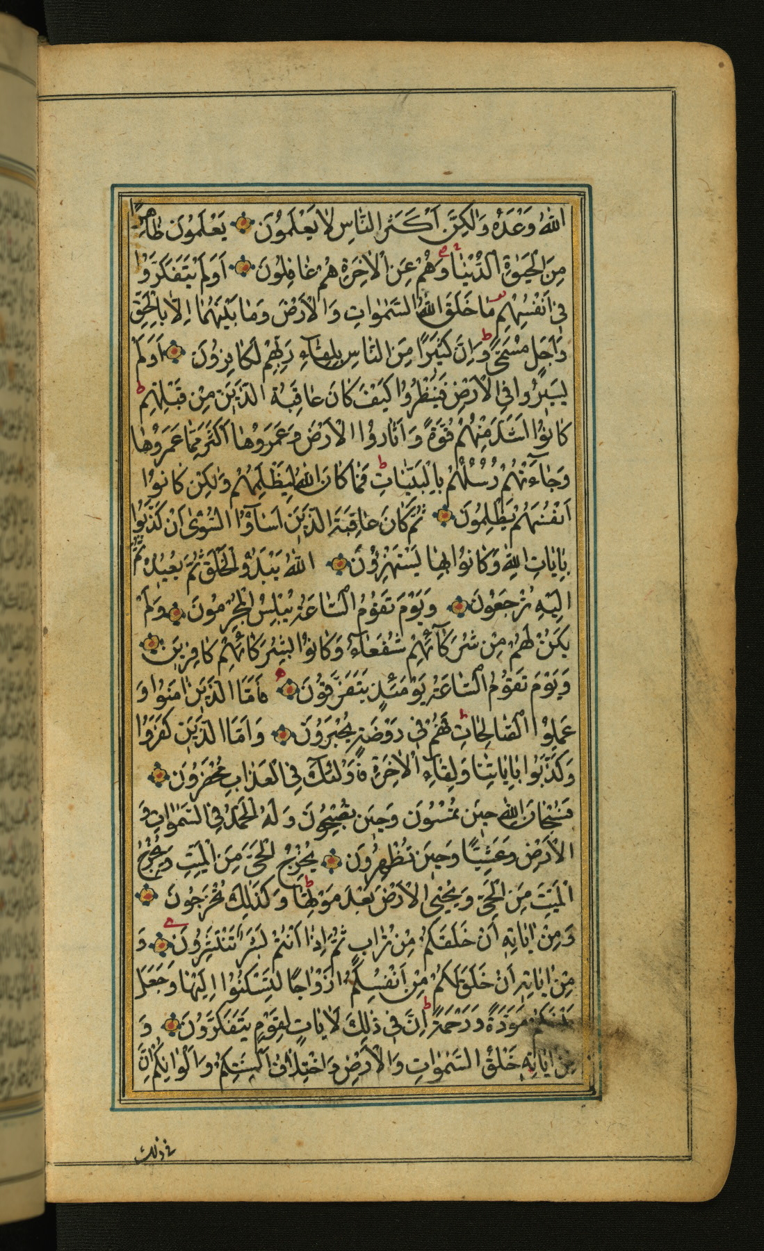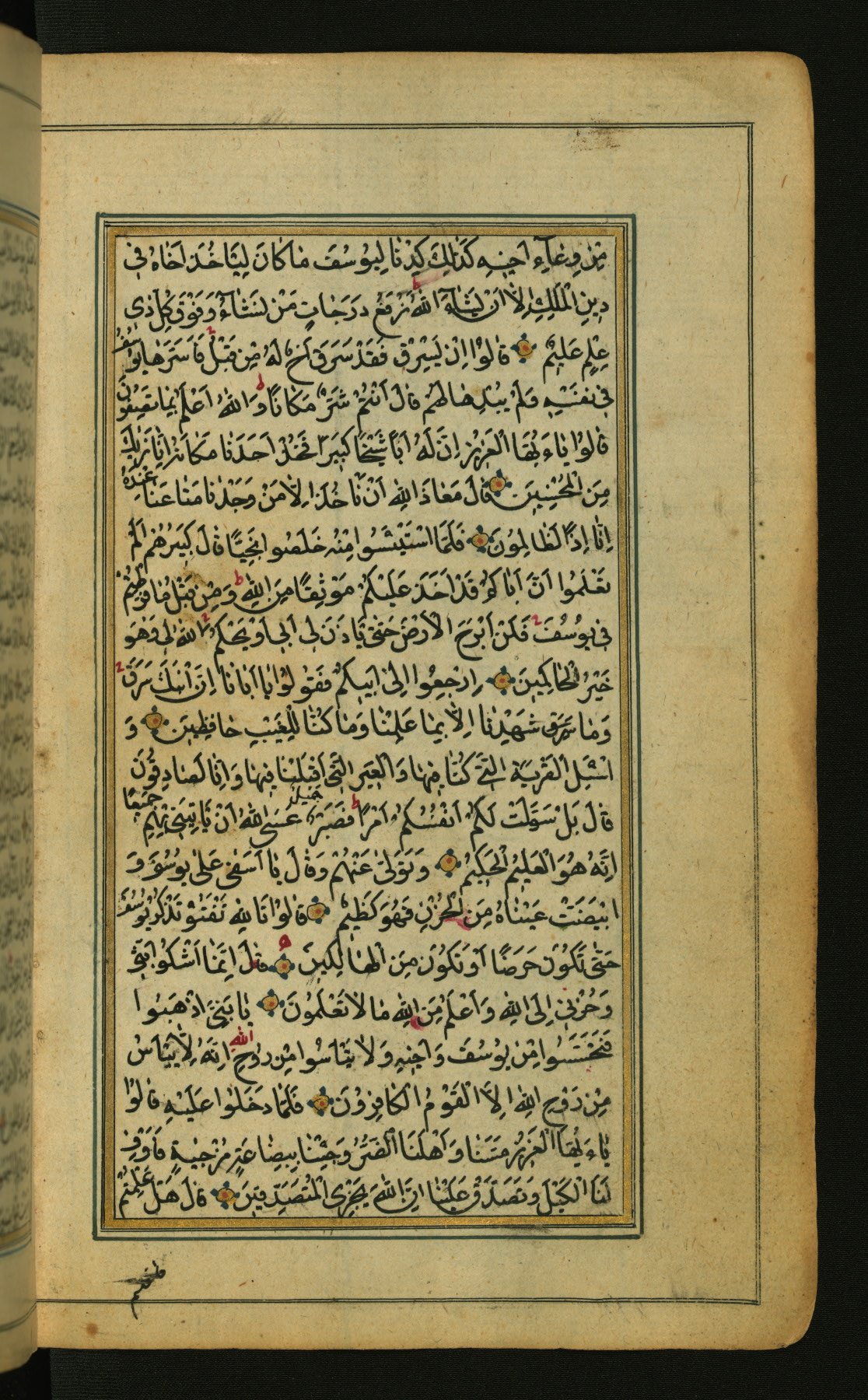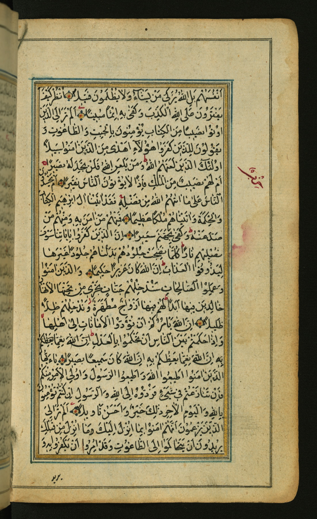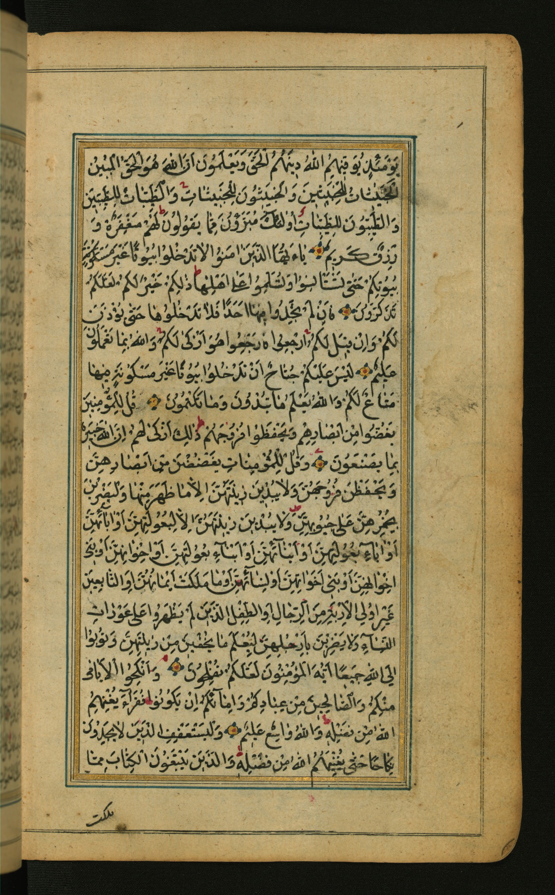 This manuscript is a small illuminated single-volume copy of the Qurʾan, likely produced in Iran. A date is inscribed on the final page, which is interpreted as 1230 AH / 1814-5 CE (fol. 186b). The manuscript opens with an illuminated double-page incipit with the verses of chapter 1 (Sūrat al-fātiḥah) and the initial verses of chapter 2 (Sūrat al-baqarah), decorated with interlinear illumination (fols. 1b-2a). The text is in vocalized naskh script in black ink with reading marks in red and text divisions, such as thirty verses (juzʾ) or sixty verses (ḥizb), in the margins. Illuminated discs with colored dots separate the verses. Chapter headings are in riqāʿ script in red ink on a gold ground. The nineteenth-century lacquer binding with a floral composition on a gold field on the upper and lower boards seems to be contemporary with the manuscript. The insides of both boards are painted with a lobed yellow central medallion and pendants on an orange field.
