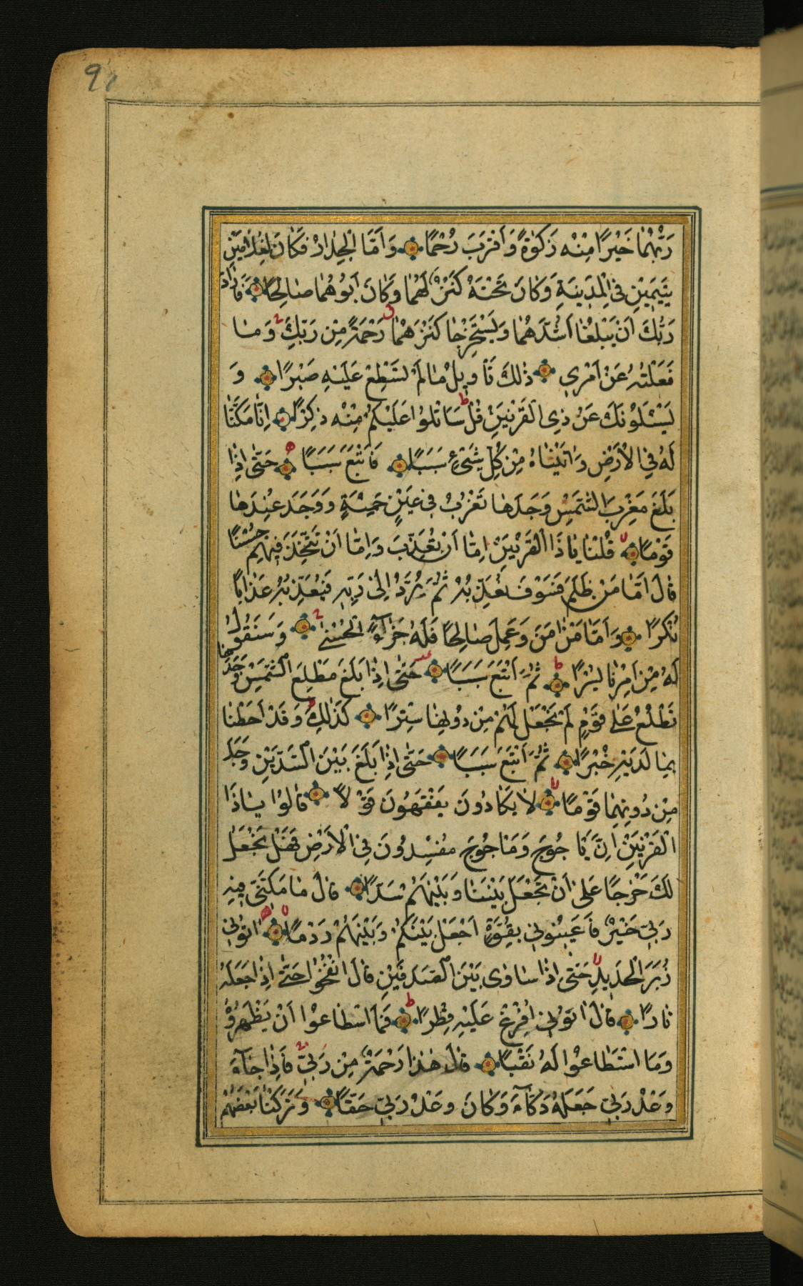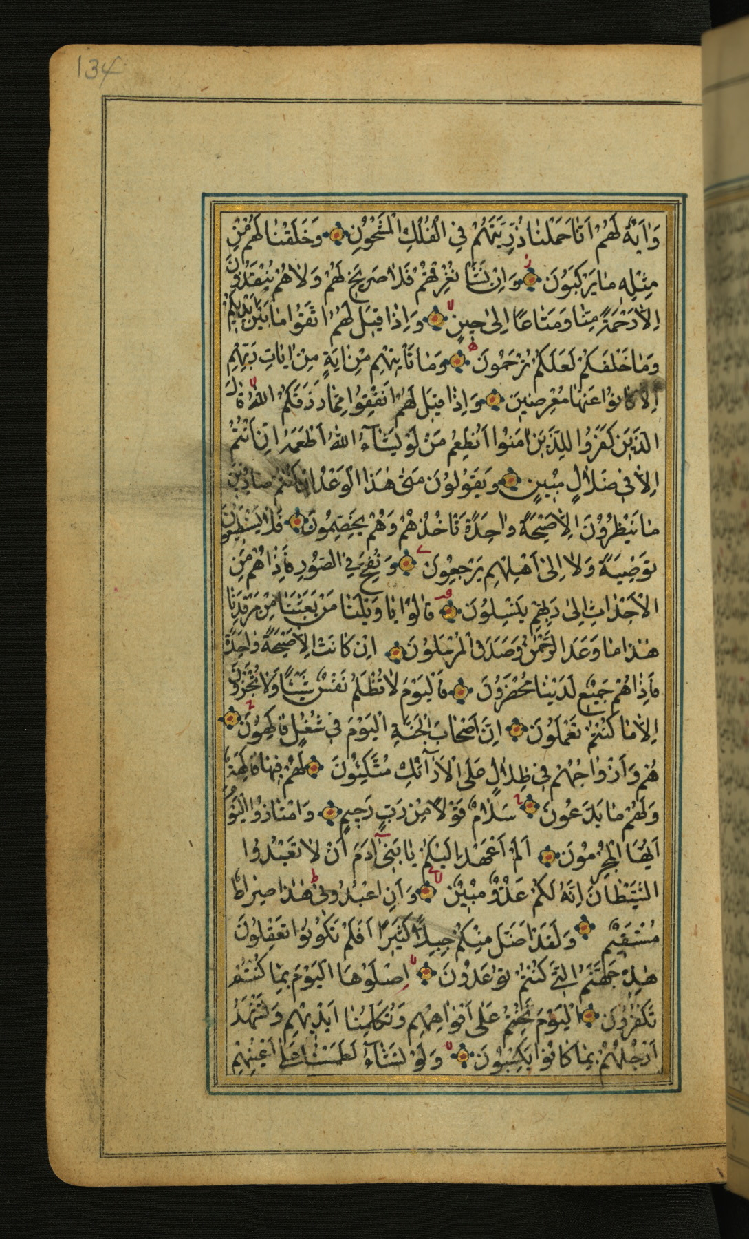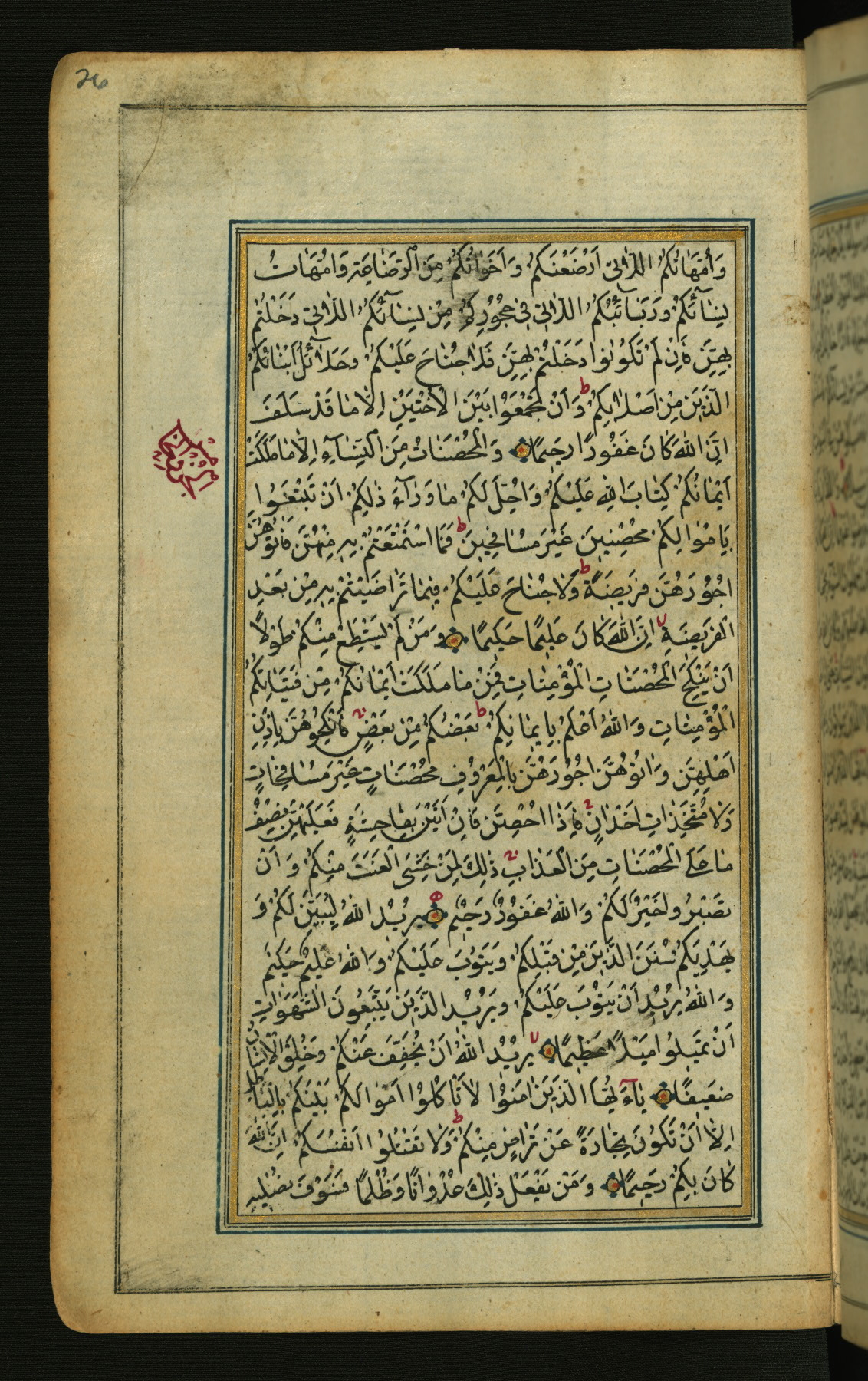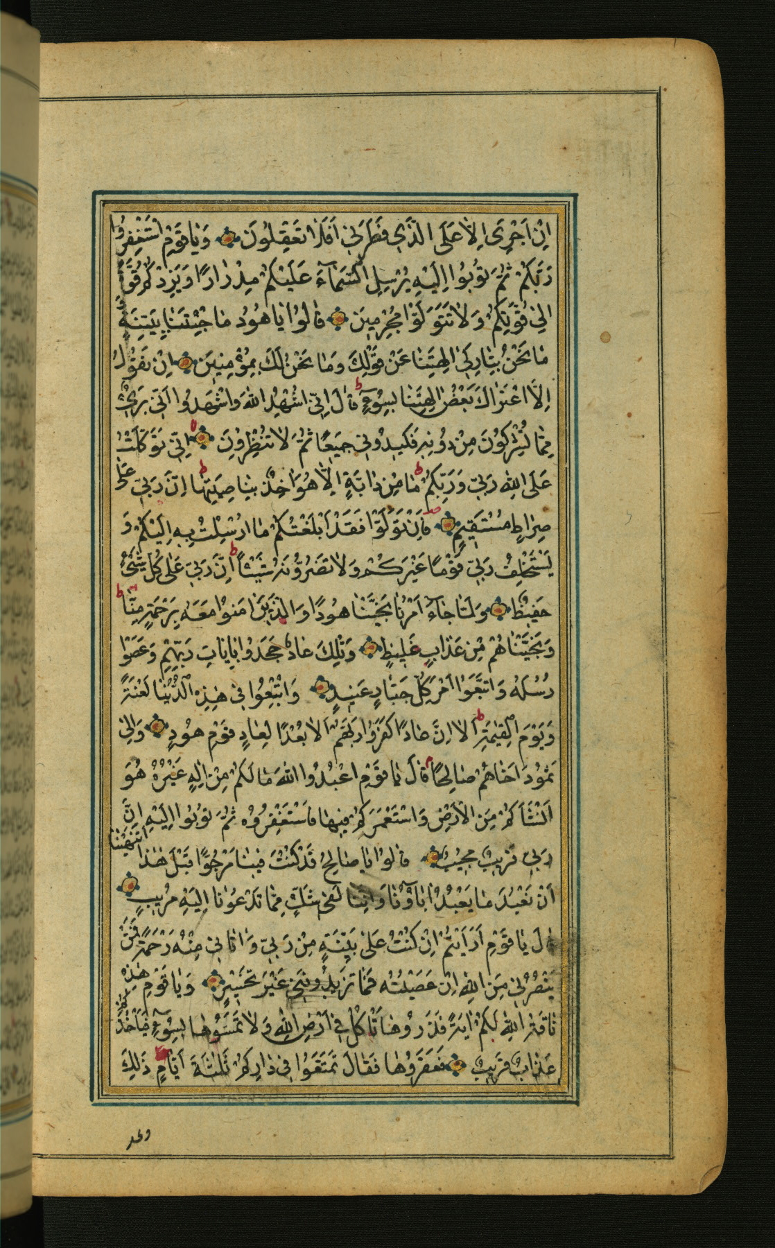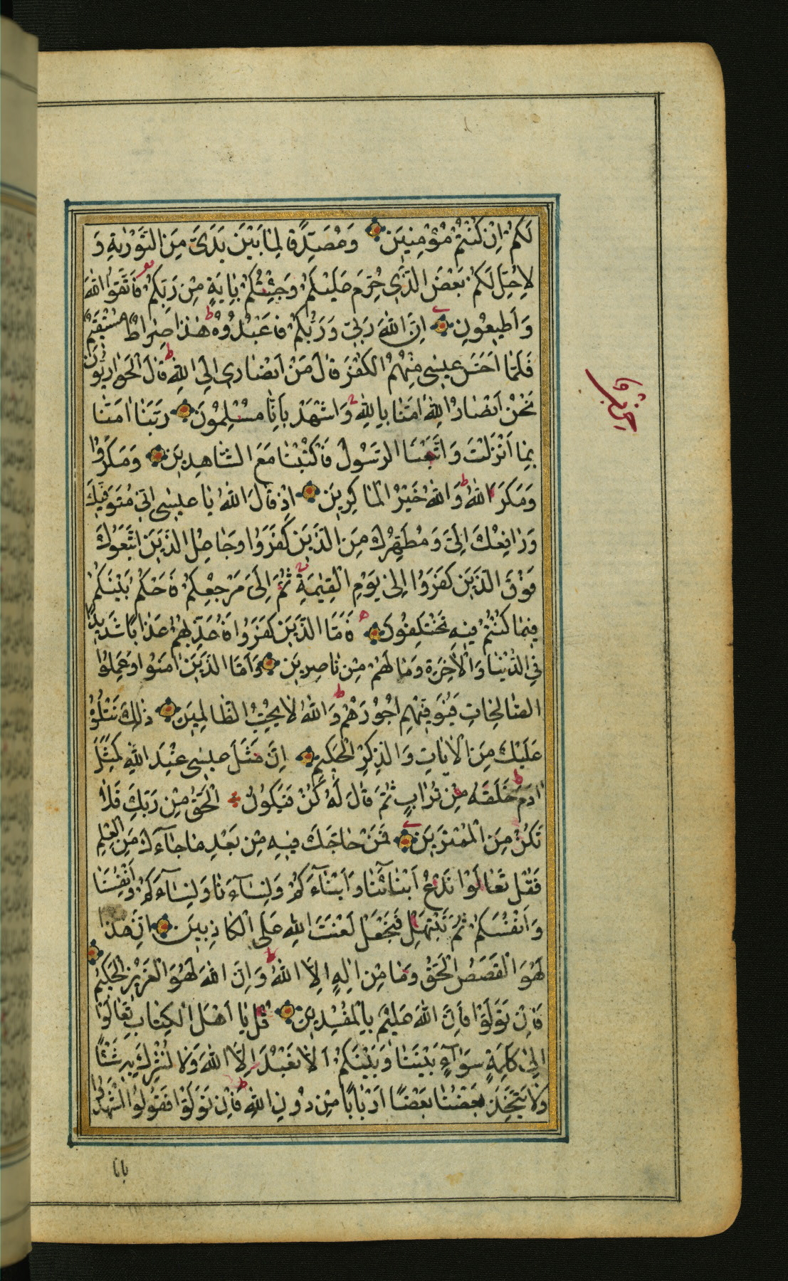 This manuscript is a small illuminated single-volume copy of the Qurʾan, likely produced in Iran. A date is inscribed on the final page, which is interpreted as 1230 AH / 1814-5 CE (fol. 186b). The manuscript opens with an illuminated double-page incipit with the verses of chapter 1 (Sūrat al-fātiḥah) and the initial verses of chapter 2 (Sūrat al-baqarah), decorated with interlinear illumination (fols. 1b-2a). The text is in vocalized naskh script in black ink with reading marks in red and text divisions, such as thirty verses (juzʾ) or sixty verses (ḥizb), in the margins. Illuminated discs with colored dots separate the verses. Chapter headings are in riqāʿ script in red ink on a gold ground. The nineteenth-century lacquer binding with a floral composition on a gold field on the upper and lower boards seems to be contemporary with the manuscript. The insides of both boards are painted with a lobed yellow central medallion and pendants on an orange field.