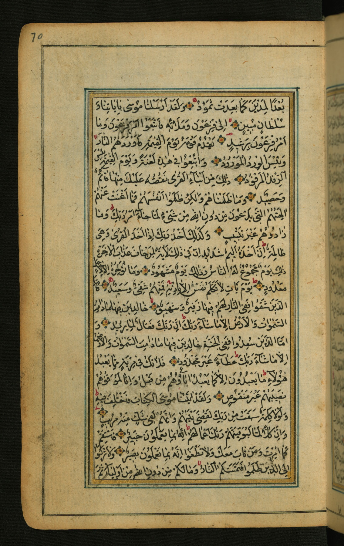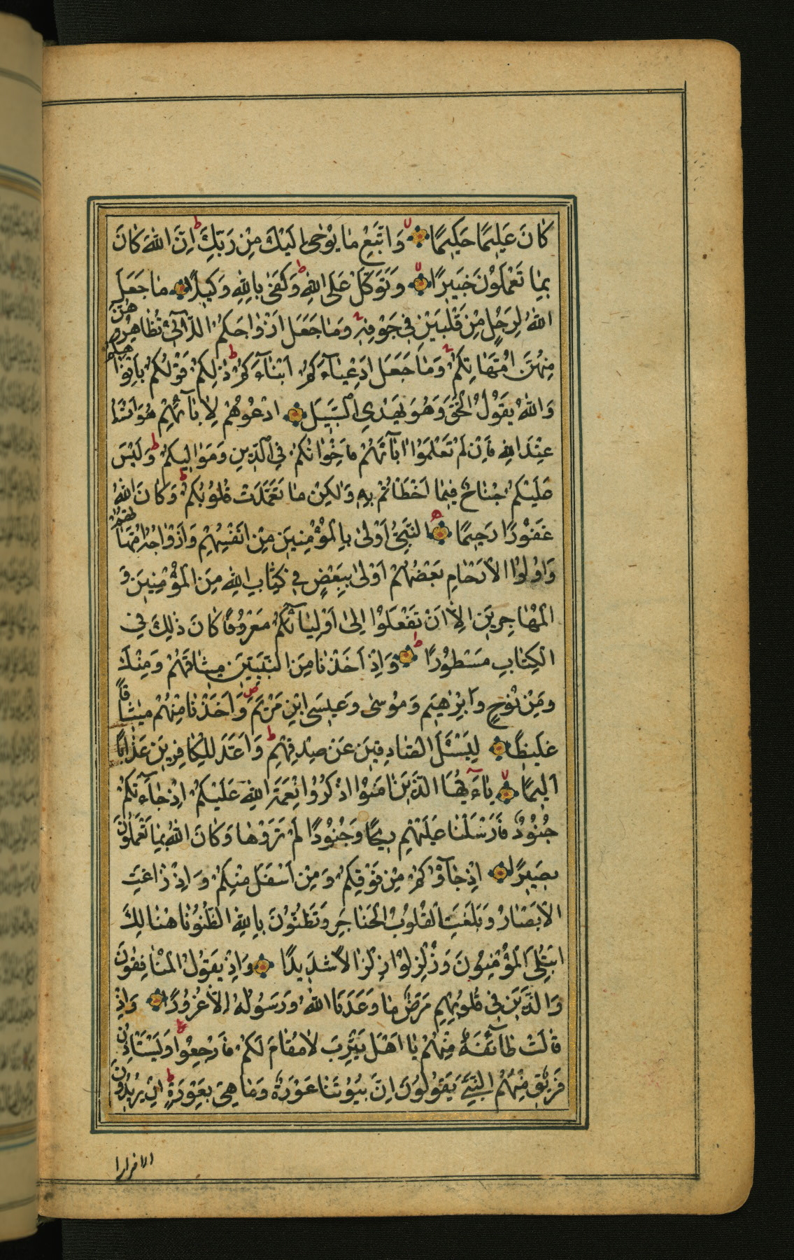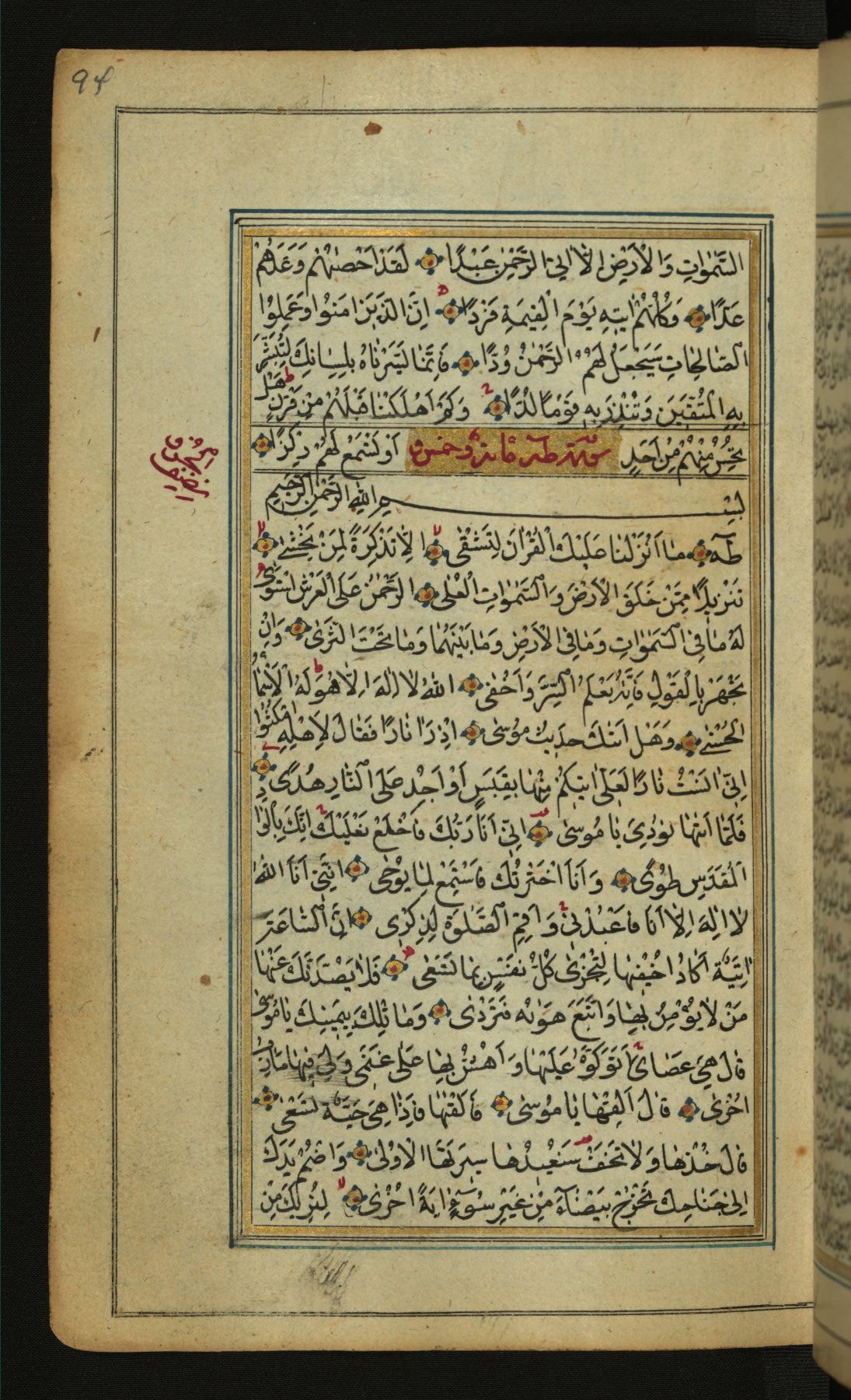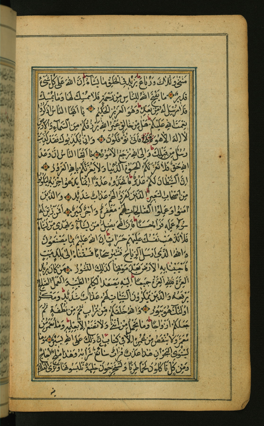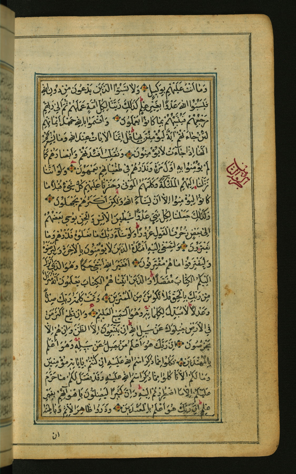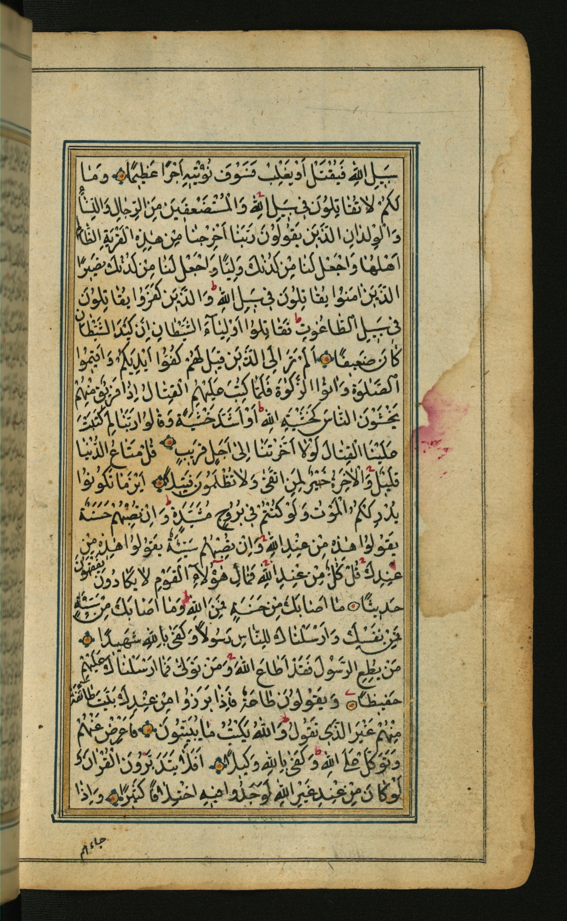 This manuscript is a small illuminated single-volume copy of the Qurʾan, likely produced in Iran. A date is inscribed on the final page, which is interpreted as 1230 AH / 1814-5 CE (fol. 186b). The manuscript opens with an illuminated double-page incipit with the verses of chapter 1 (Sūrat al-fātiḥah) and the initial verses of chapter 2 (Sūrat al-baqarah), decorated with interlinear illumination (fols. 1b-2a). The text is in vocalized naskh script in black ink with reading marks in red and text divisions, such as thirty verses (juzʾ) or sixty verses (ḥizb), in the margins. Illuminated discs with colored dots separate the verses. Chapter headings are in riqāʿ script in red ink on a gold ground. The nineteenth-century lacquer binding with a floral composition on a gold field on the upper and lower boards seems to be contemporary with the manuscript. The insides of both boards are painted with a lobed yellow central medallion and pendants on an orange field.