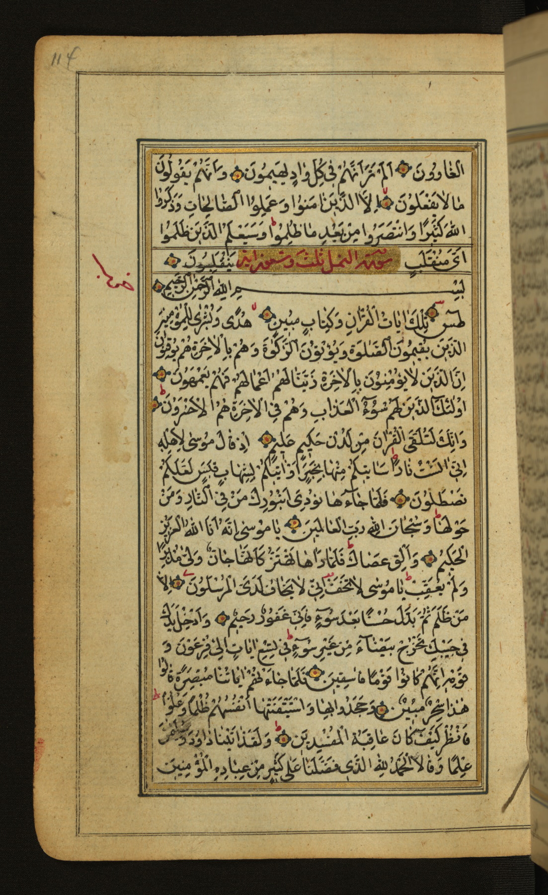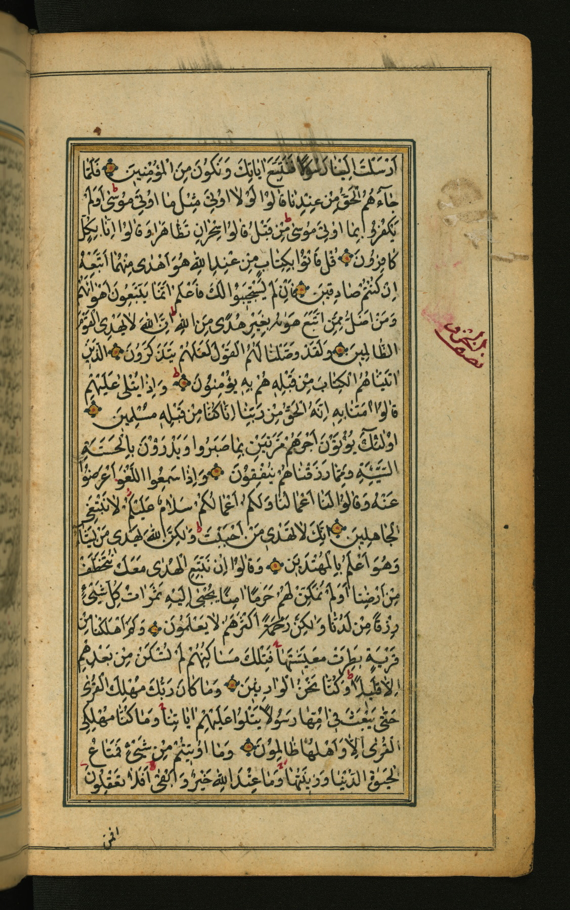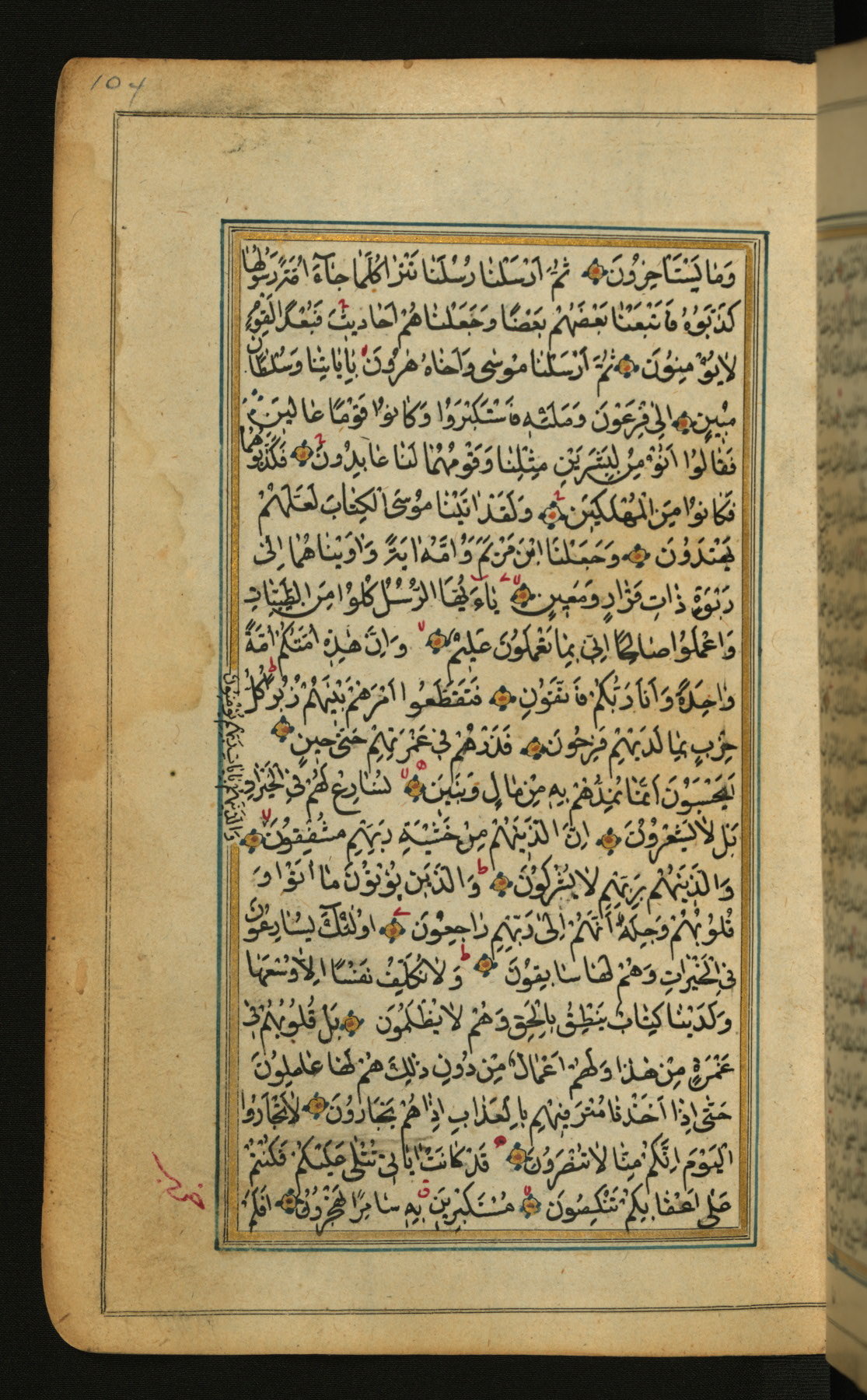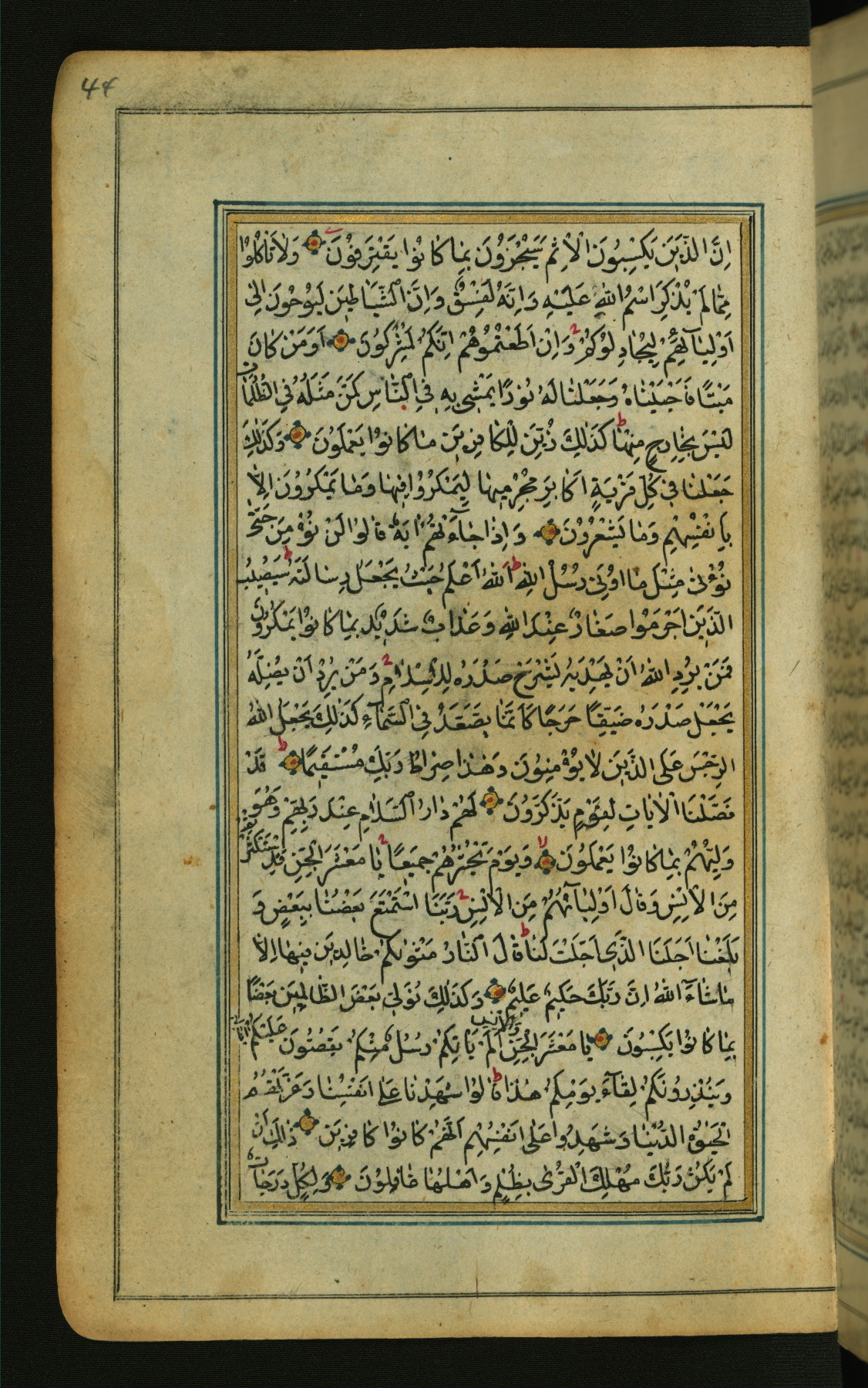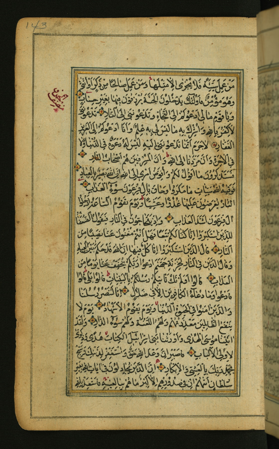 This manuscript is a small illuminated single-volume copy of the Qurʾan, likely produced in Iran. A date is inscribed on the final page, which is interpreted as 1230 AH / 1814-5 CE (fol. 186b). The manuscript opens with an illuminated double-page incipit with the verses of chapter 1 (Sūrat al-fātiḥah) and the initial verses of chapter 2 (Sūrat al-baqarah), decorated with interlinear illumination (fols. 1b-2a). The text is in vocalized naskh script in black ink with reading marks in red and text divisions, such as thirty verses (juzʾ) or sixty verses (ḥizb), in the margins. Illuminated discs with colored dots separate the verses. Chapter headings are in riqāʿ script in red ink on a gold ground. The nineteenth-century lacquer binding with a floral composition on a gold field on the upper and lower boards seems to be contemporary with the manuscript. The insides of both boards are painted with a lobed yellow central medallion and pendants on an orange field.