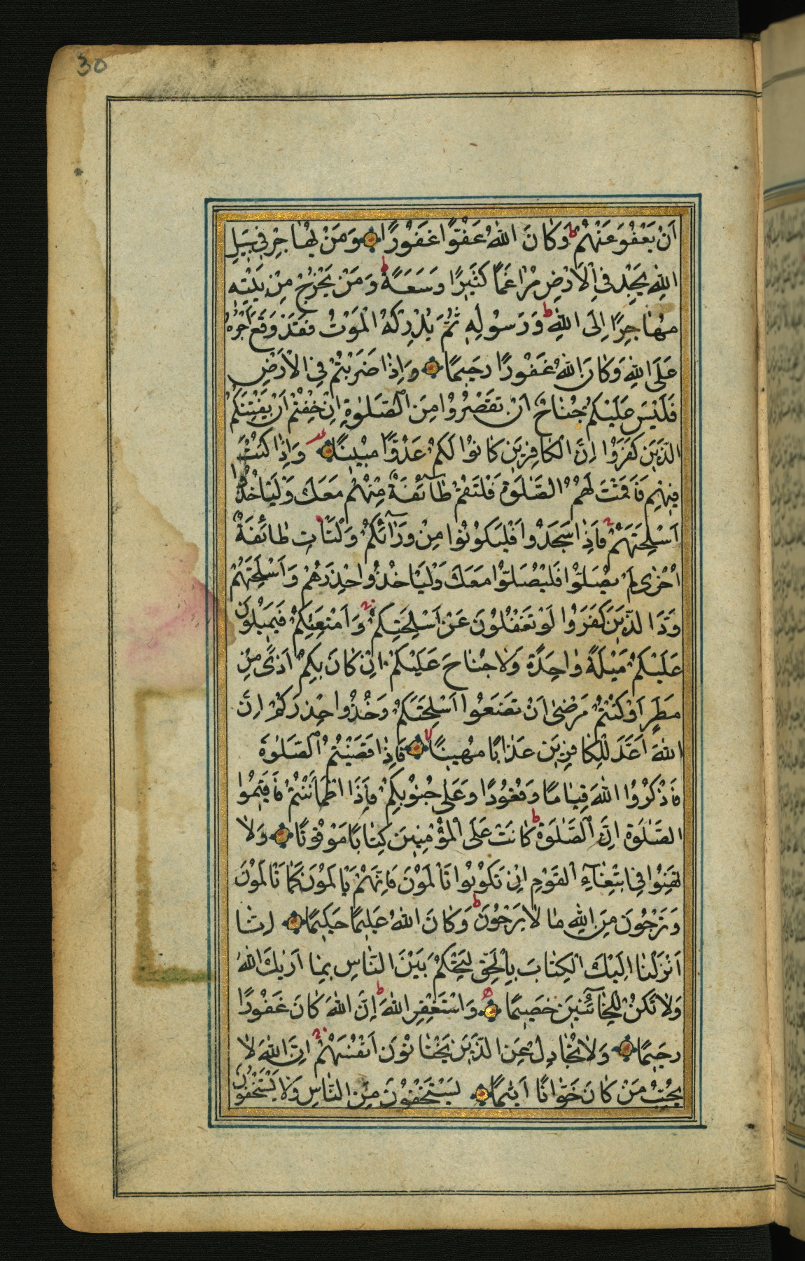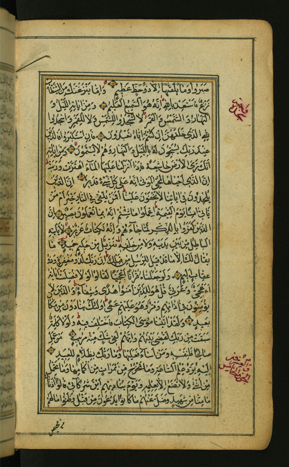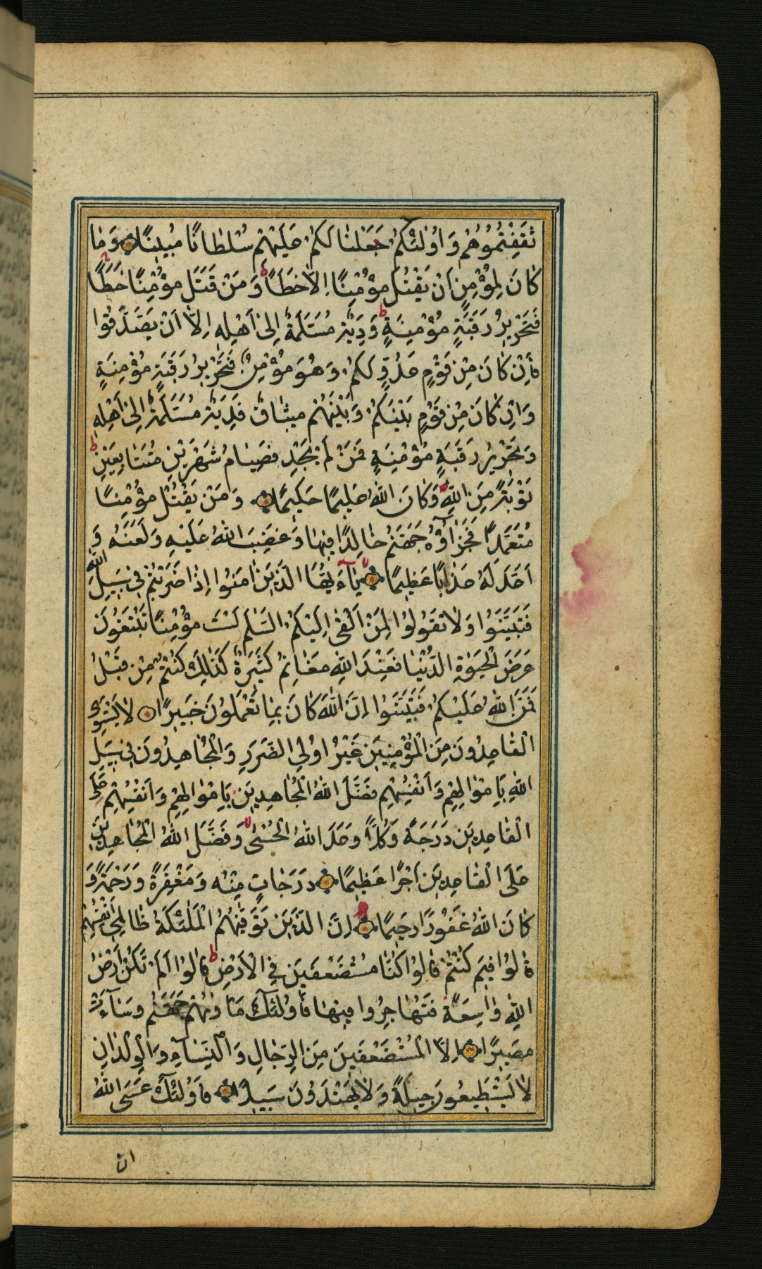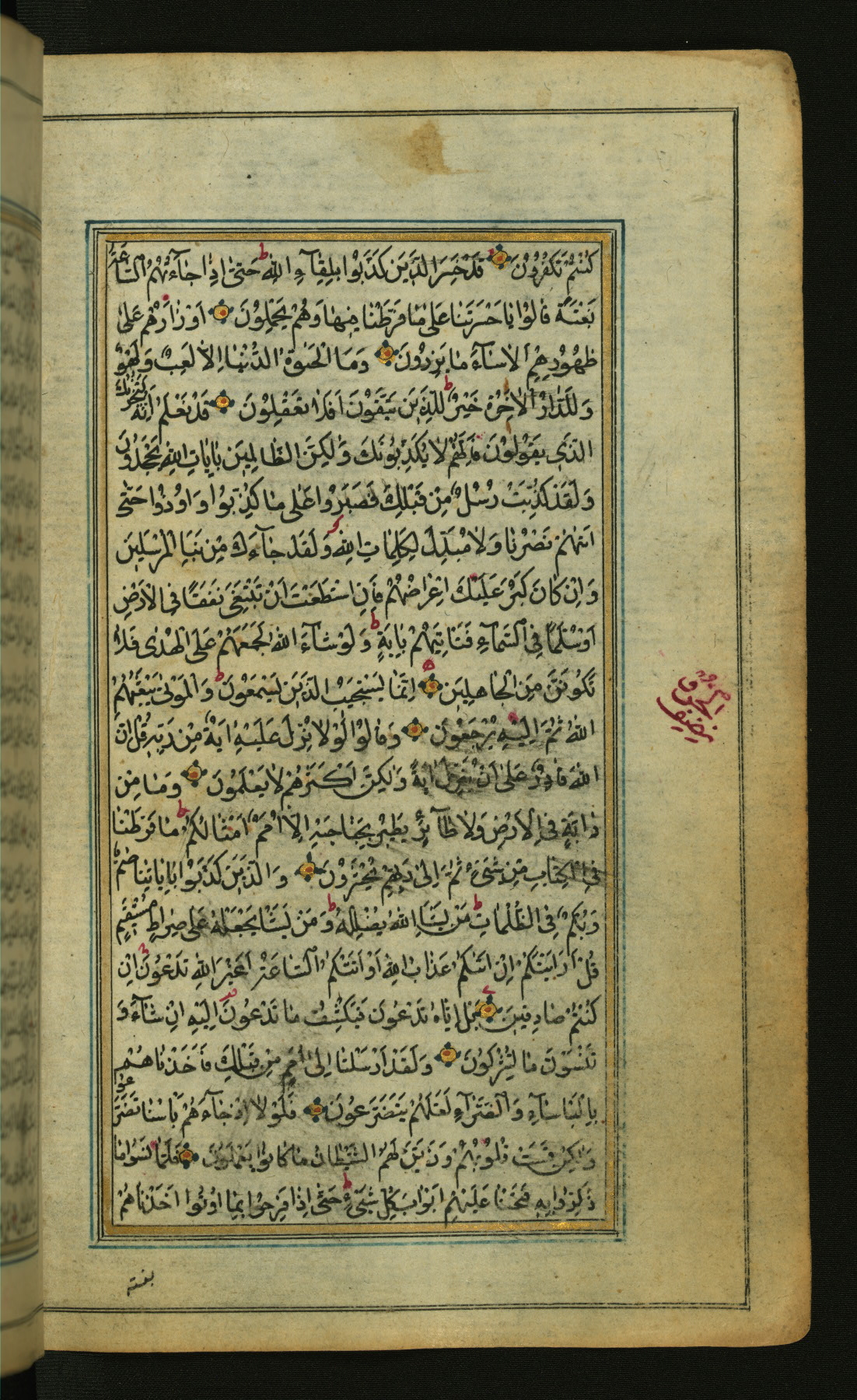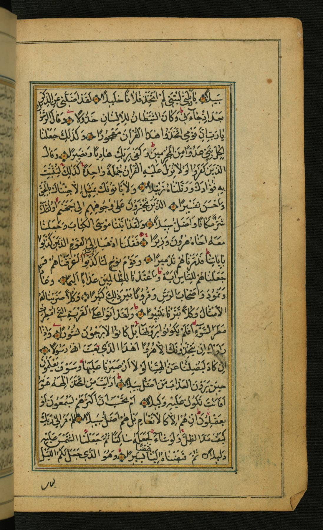 This manuscript is a small illuminated single-volume copy of the Qurʾan, likely produced in Iran. A date is inscribed on the final page, which is interpreted as 1230 AH / 1814-5 CE (fol. 186b). The manuscript opens with an illuminated double-page incipit with the verses of chapter 1 (Sūrat al-fātiḥah) and the initial verses of chapter 2 (Sūrat al-baqarah), decorated with interlinear illumination (fols. 1b-2a). The text is in vocalized naskh script in black ink with reading marks in red and text divisions, such as thirty verses (juzʾ) or sixty verses (ḥizb), in the margins. Illuminated discs with colored dots separate the verses. Chapter headings are in riqāʿ script in red ink on a gold ground. The nineteenth-century lacquer binding with a floral composition on a gold field on the upper and lower boards seems to be contemporary with the manuscript. The insides of both boards are painted with a lobed yellow central medallion and pendants on an orange field.